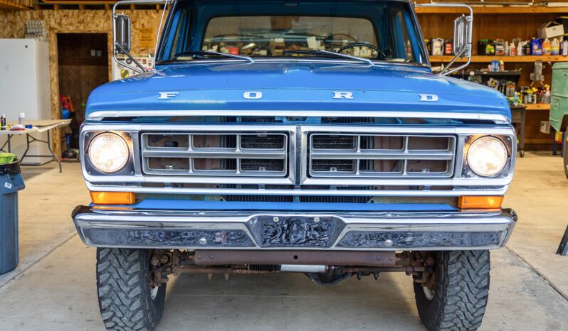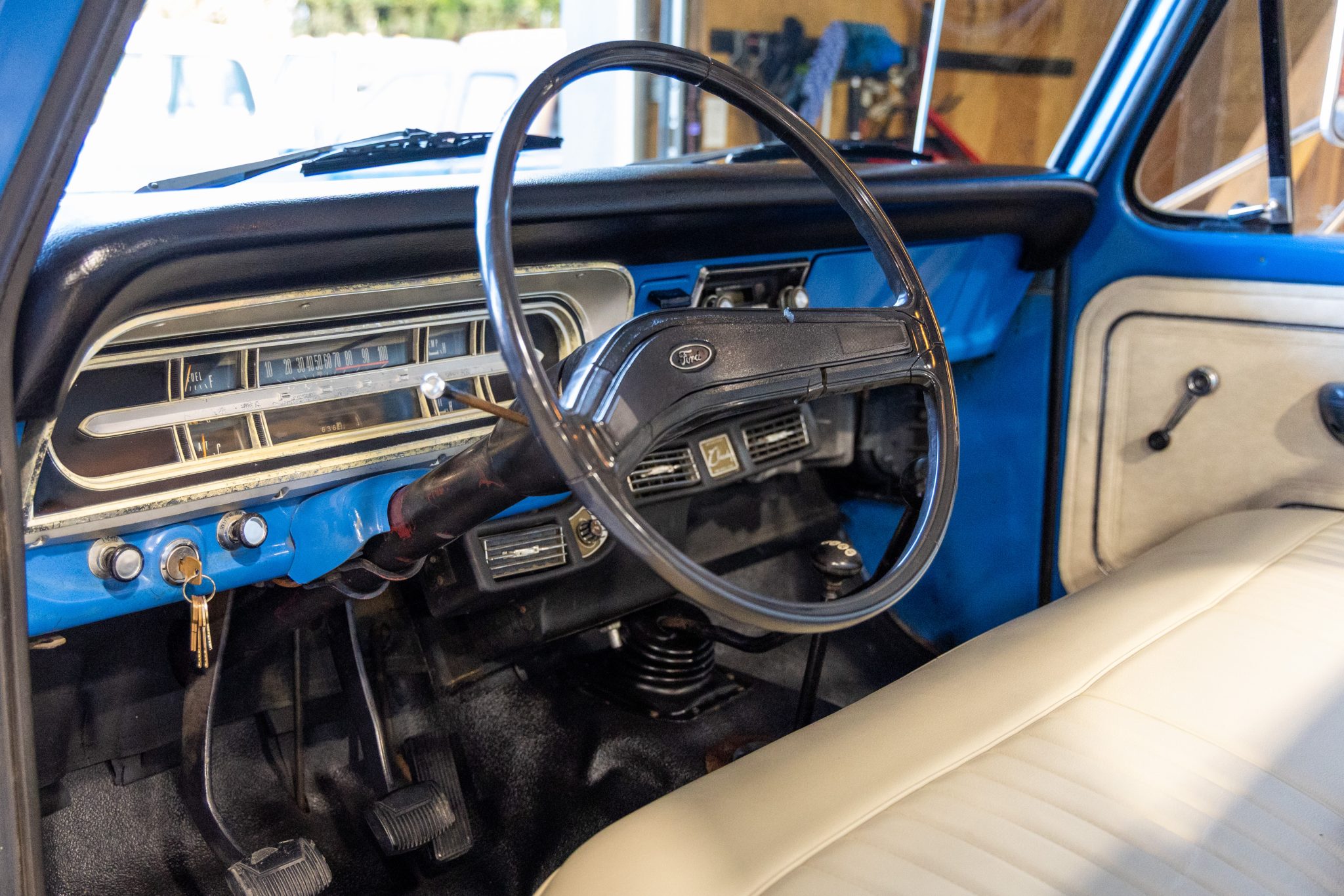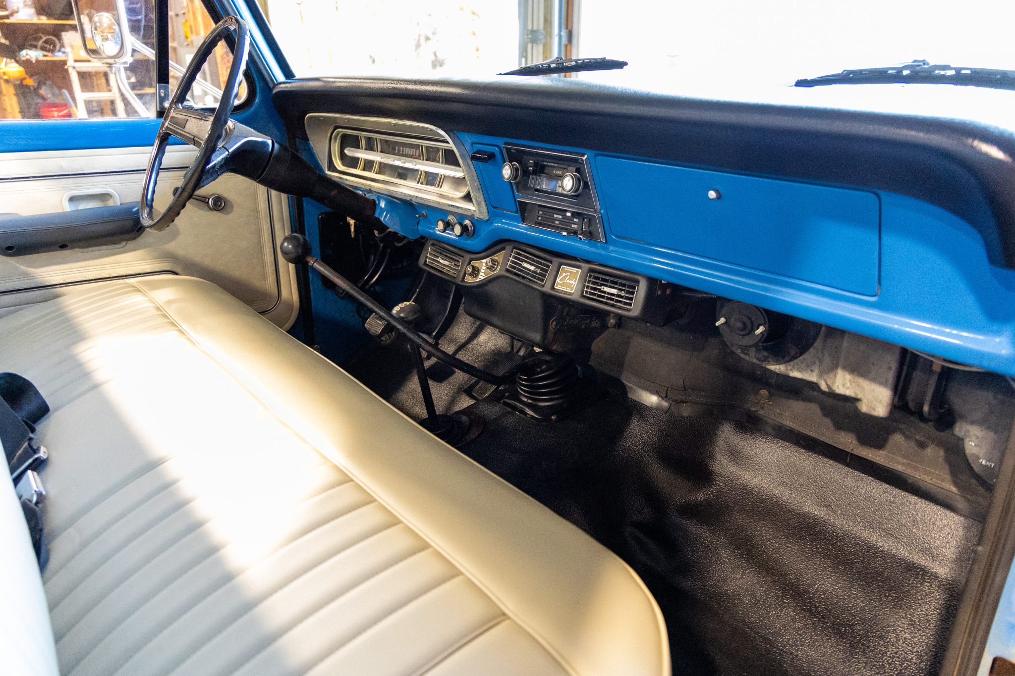 This 1971 Ford F-250 Sport Custom 4×4 pickup is reported to be the only example produced for the model year in this paint and trim configuration. It is finished in Bahama Blue over tan vinyl, and power is from a 360ci V8 linked to a four-speed manual transmission and a dual-range transfer case. Equipment includes 16″ steel wheels, a receiver hitch, air conditioning, and a cassette stereo.