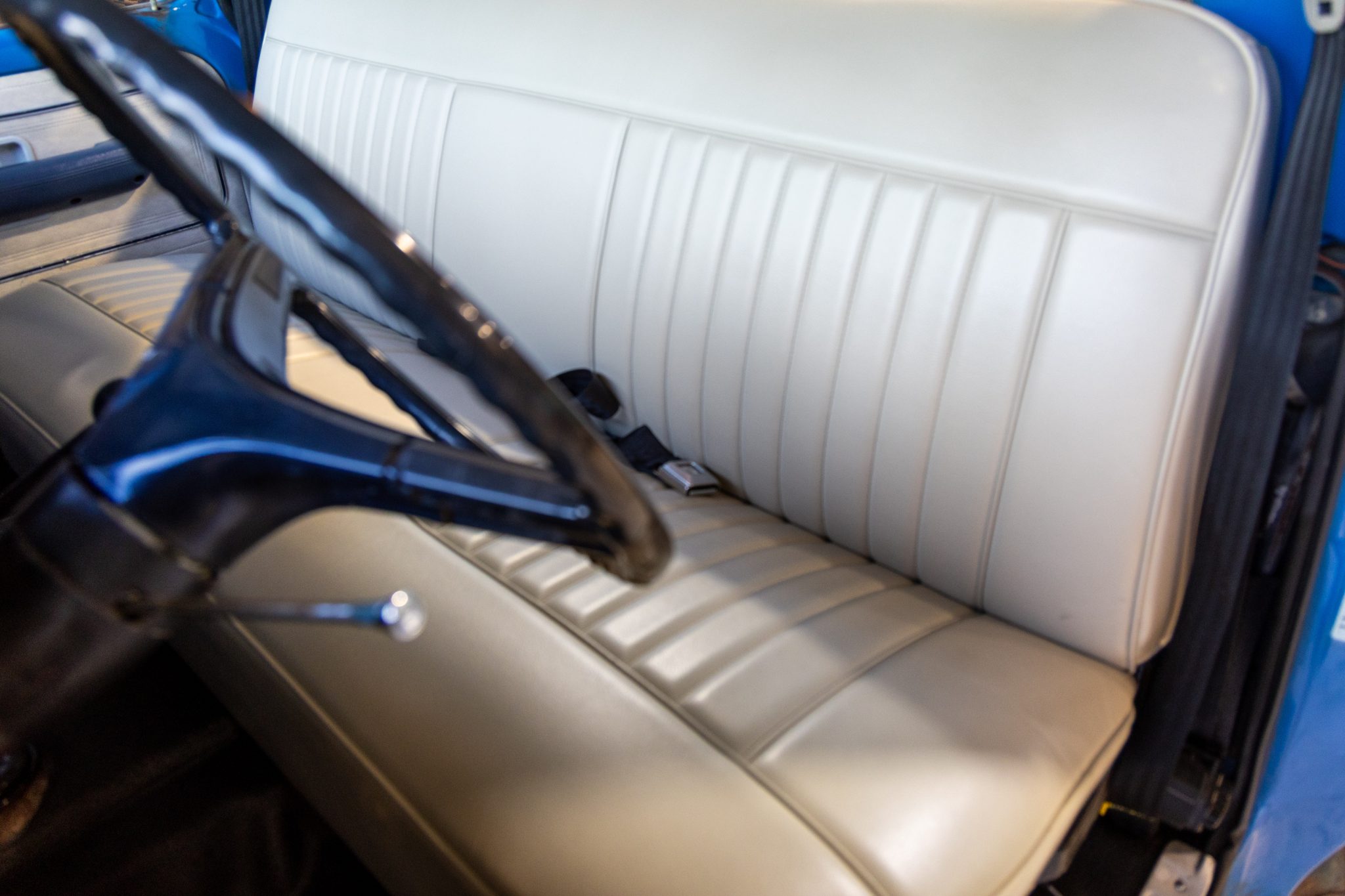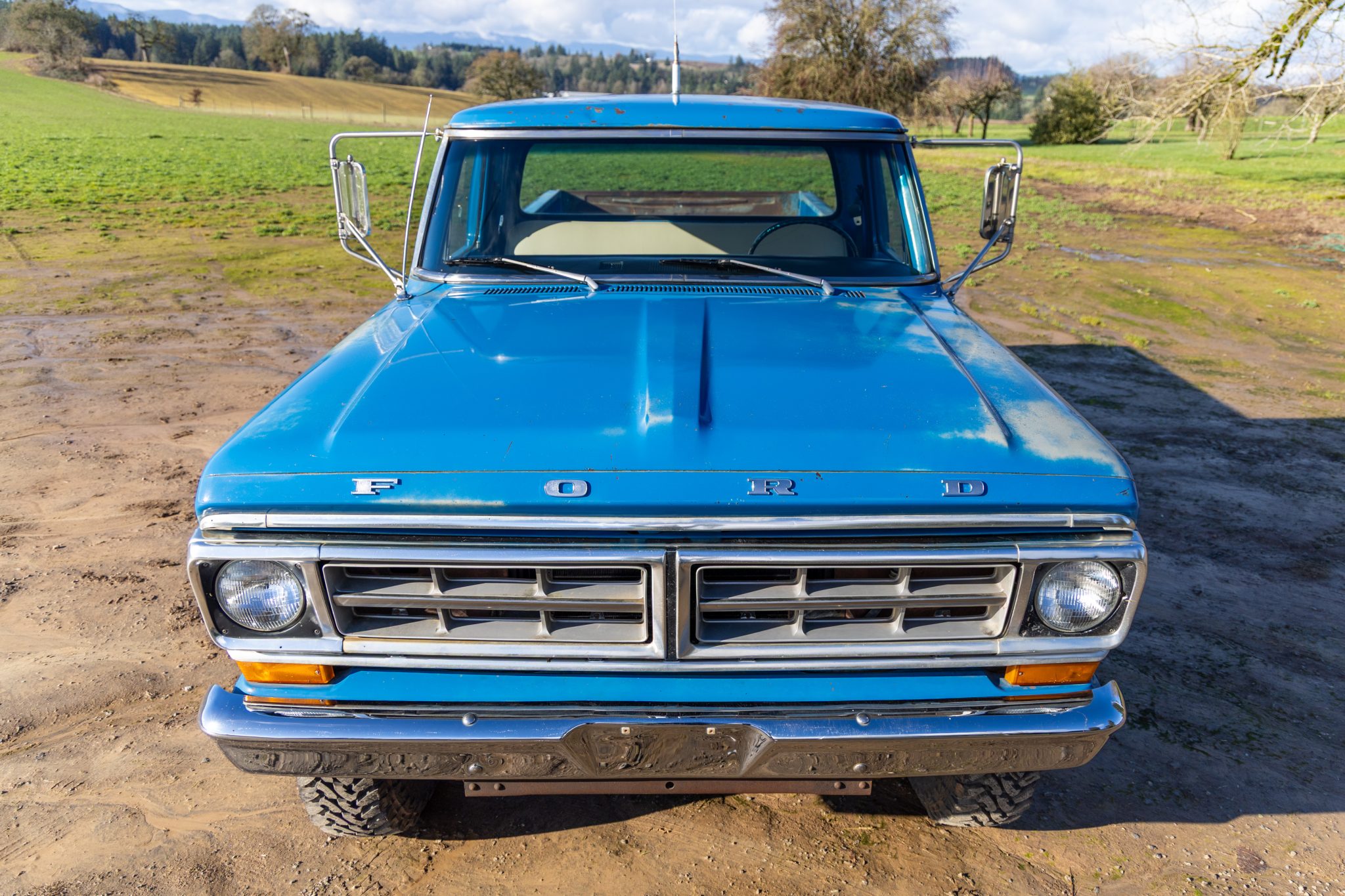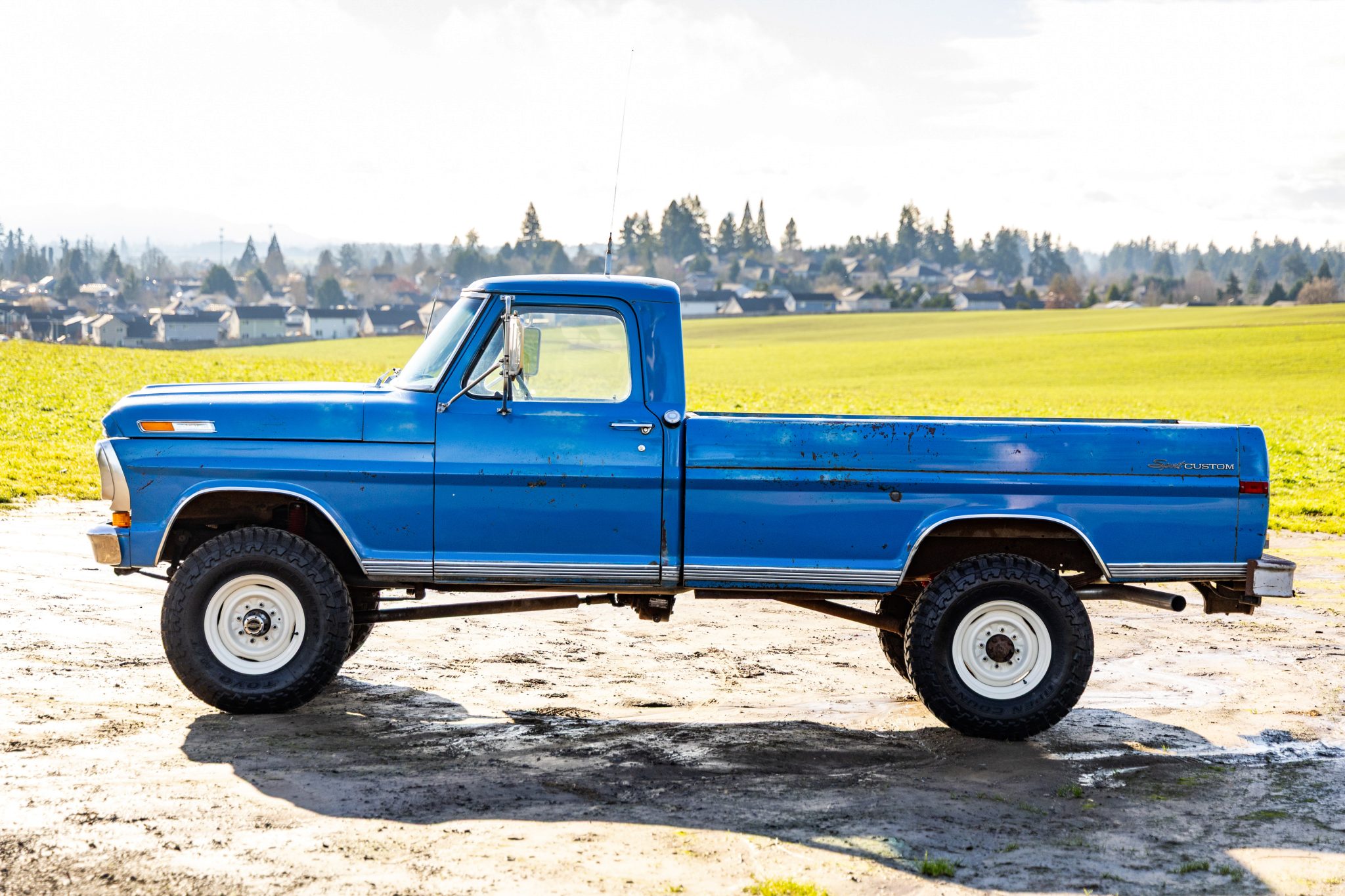 This 1971 Ford F-250 Sport Custom 4×4 pickup is reported to be the only example produced for the model year in this paint and trim configuration. It is finished in Bahama Blue over tan vinyl, and power is from a 360ci V8 linked to a four-speed manual transmission and a dual-range transfer case. Equipment includes 16″ steel wheels, a receiver hitch, air conditioning, and a cassette stereo.