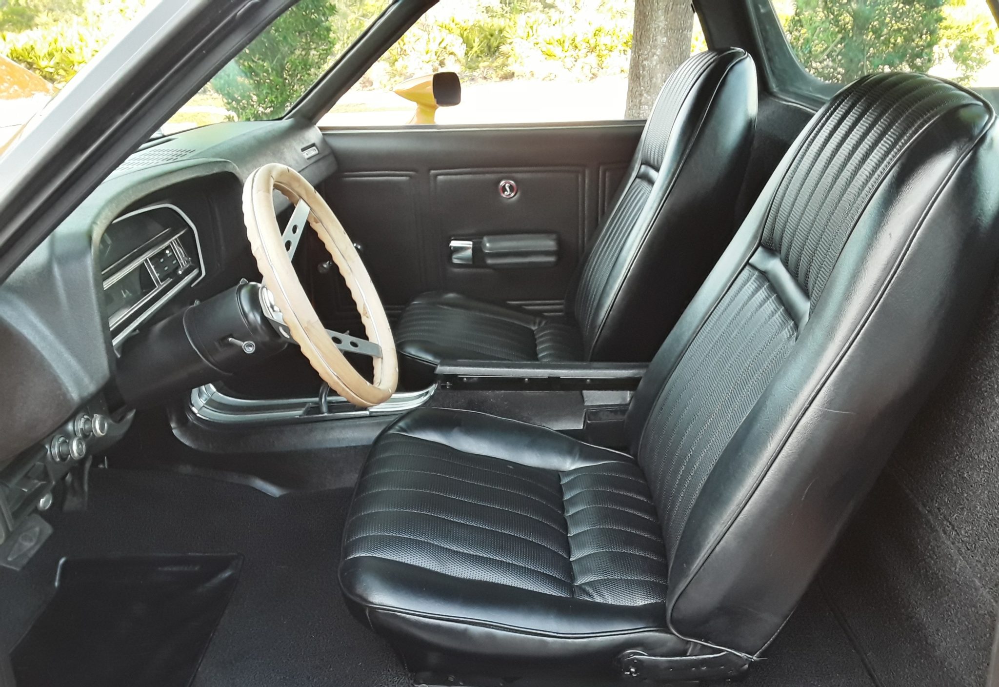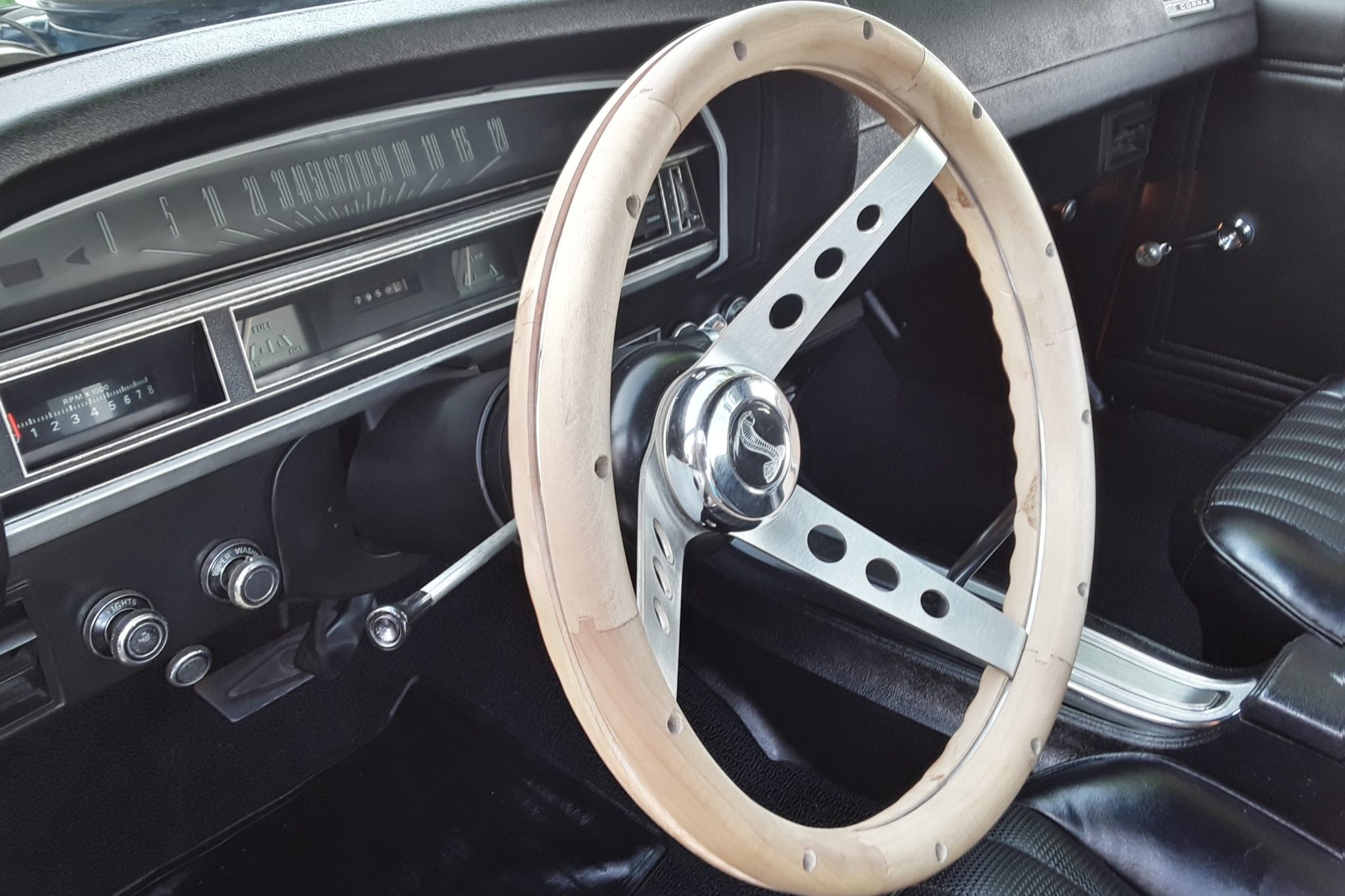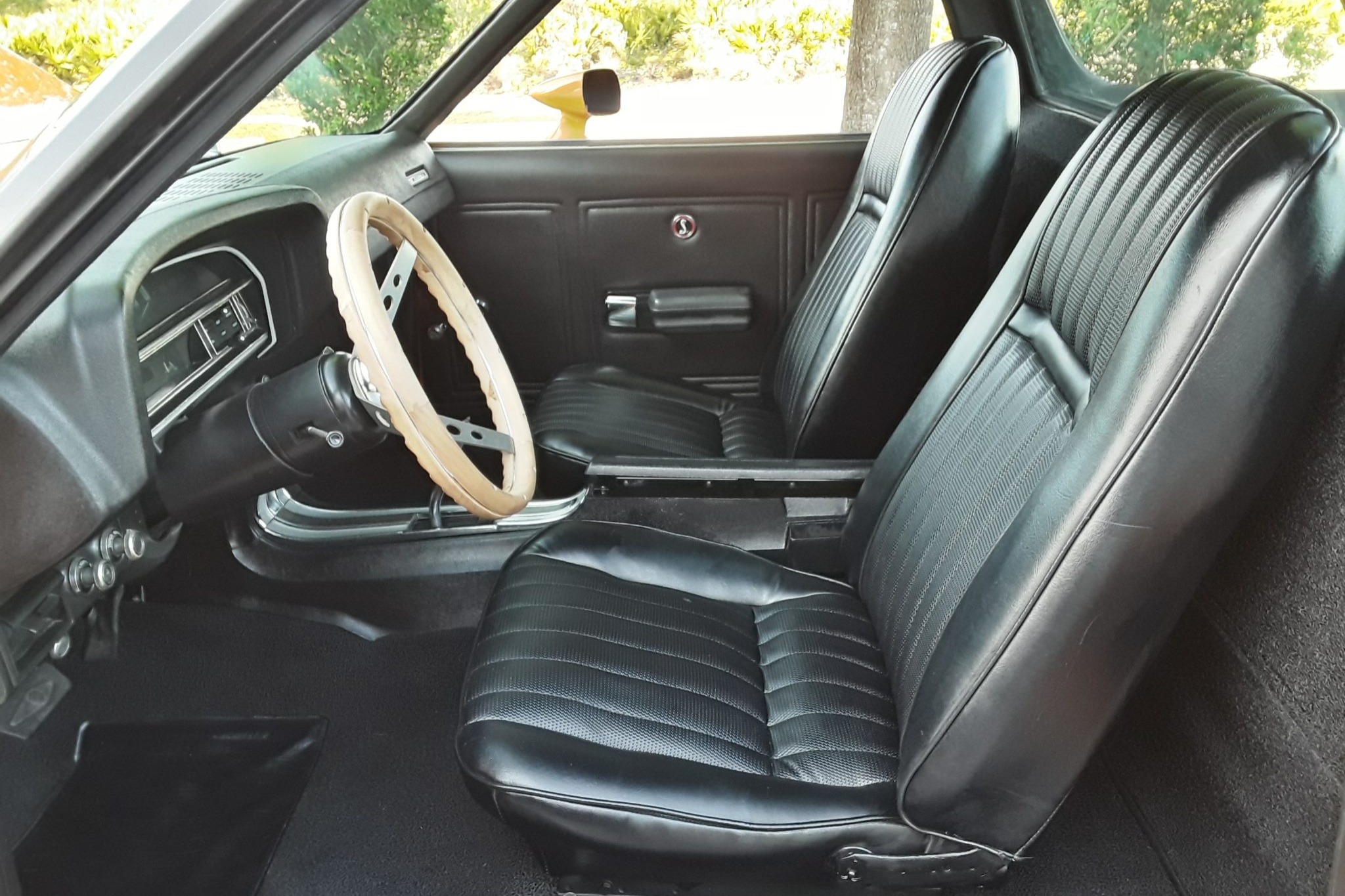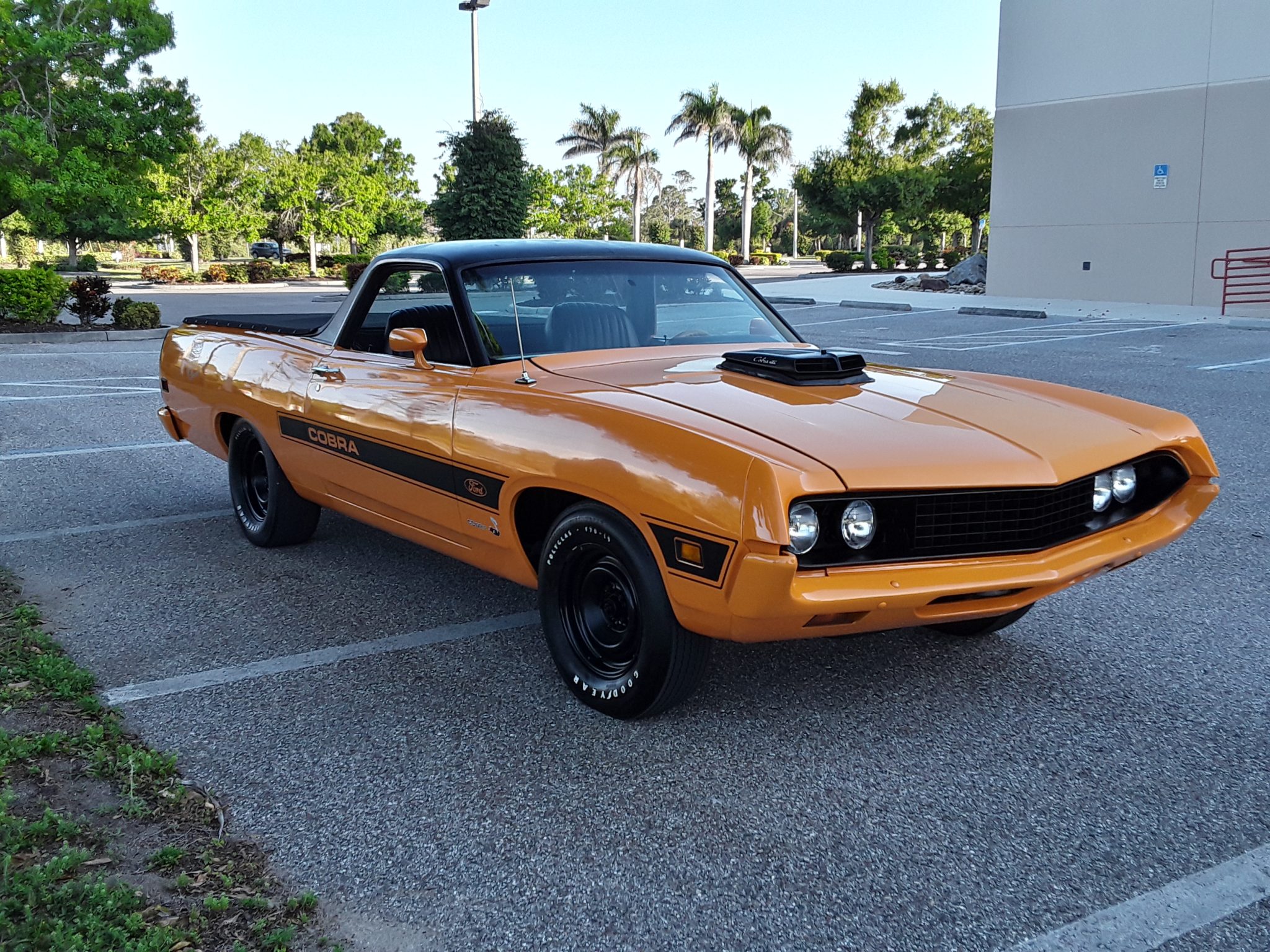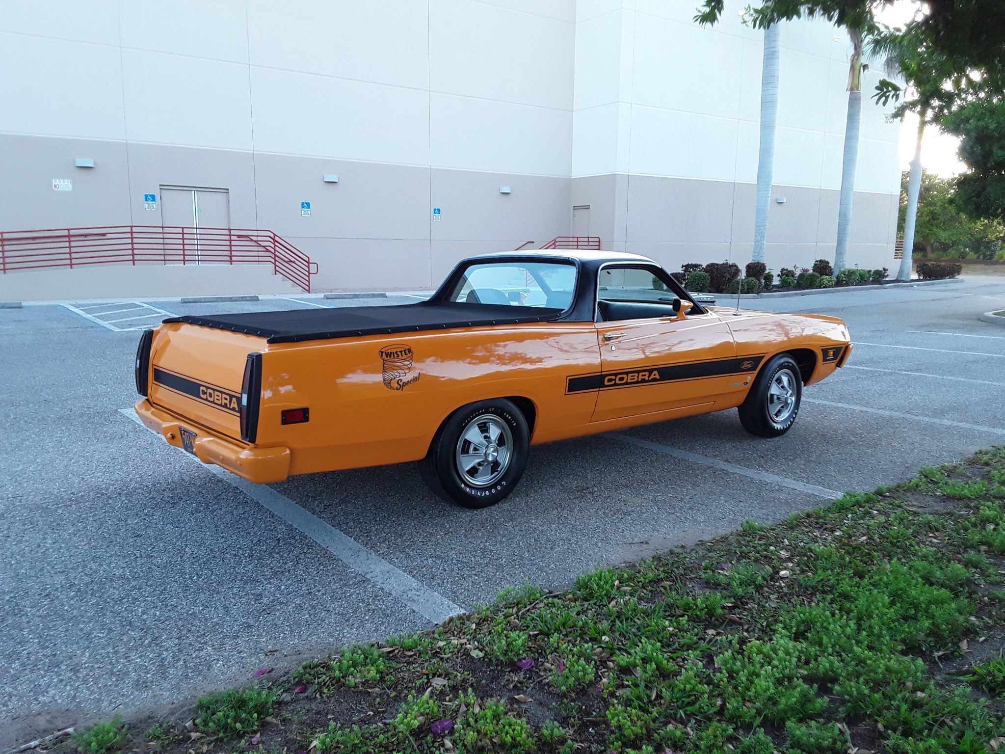 The truck was refinished in Grabber Orange and matte black with black side and tailgate graphics over black vinyl upholstery. Power comes from a 351ci Cleveland V8 equipped with a Holley Sniper fuel injection system and paired with a three-speed automatic transmission. Features include a shaker-style hood scoop, a high-pressure electronic fuel pump, a wood-rimmed steering wheel, a dual exhaust system, a Sunbrella Canvas tonneau cover, bucket seats, body-color bumpers, and front disc brakes.
