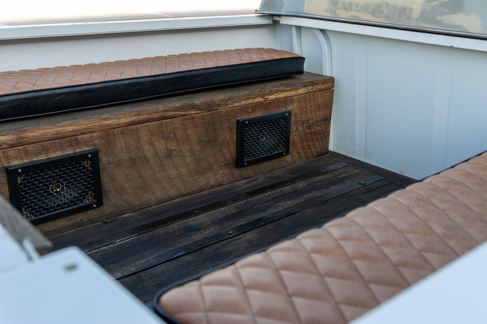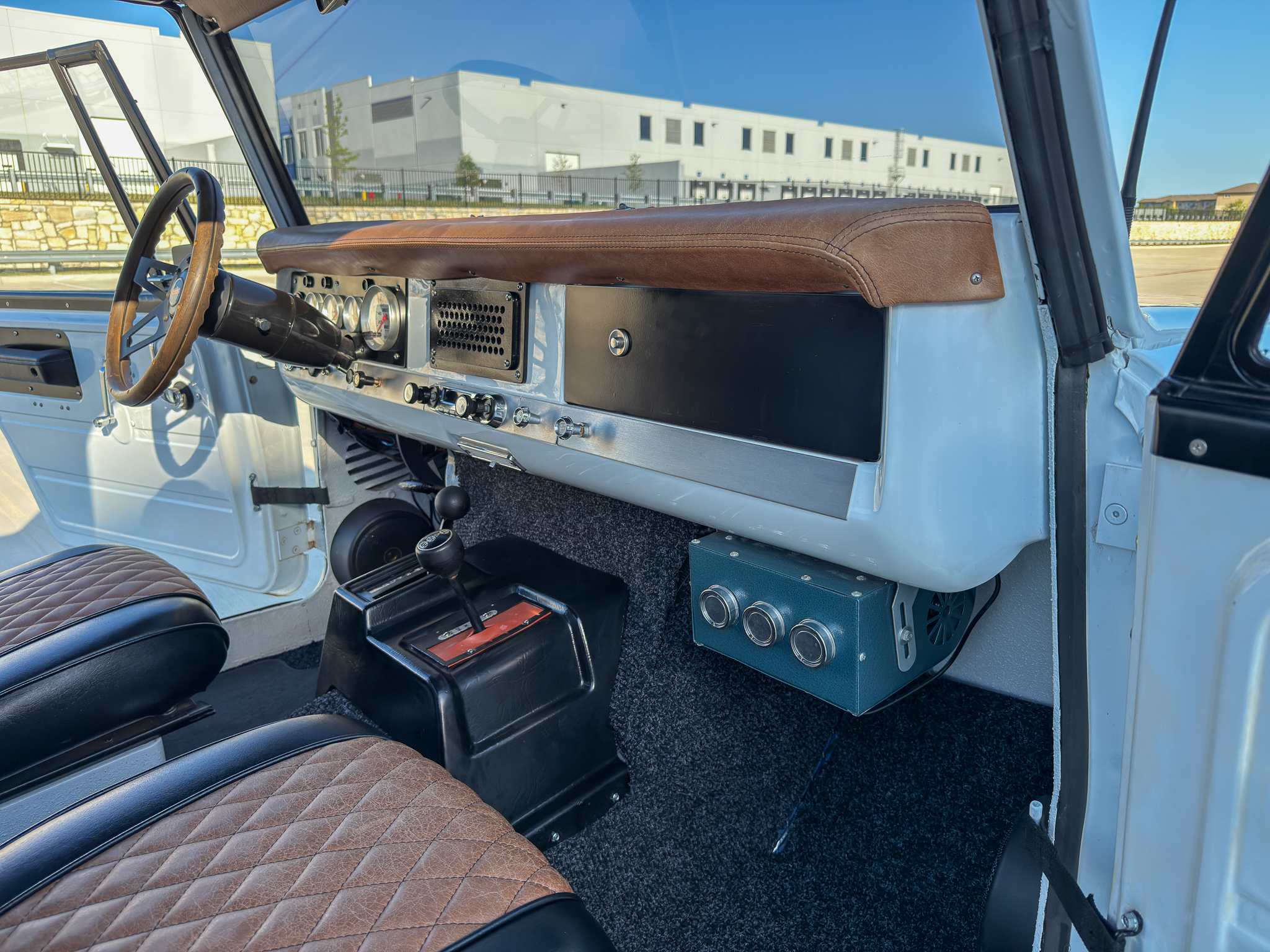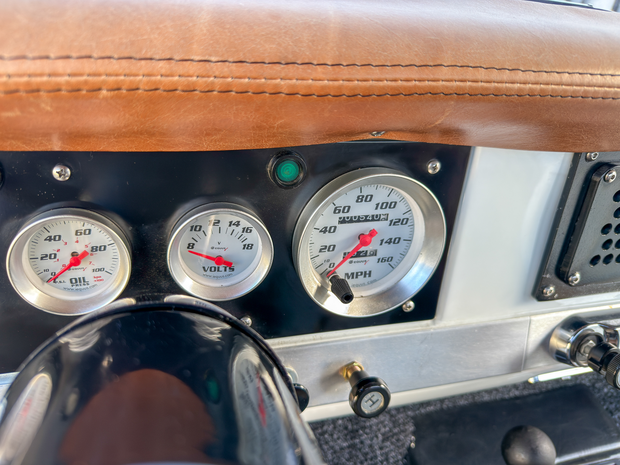 The truck is finished in white with a silver cab top over a custom black and tan interior, and it has an oak wood plank bed floor, a three-speed automatic transmission, dual fuel tanks, 15″ Mickey Thompson wheels, LED headlights, electric windshield wipers, front disc brakes, power steering, and a dual exhaust system with an X-pipe. The 304ci V8 is said to have been bored over .030″ during a 2019 rebuild Power is sent to the rear or all four wheels through a three-speed automatic transmission and a dual-range transfer case. A transmission cooler was installed under current ownership, as well, and differentials with 3.73:1 gearing are said to complete the drivetrain.