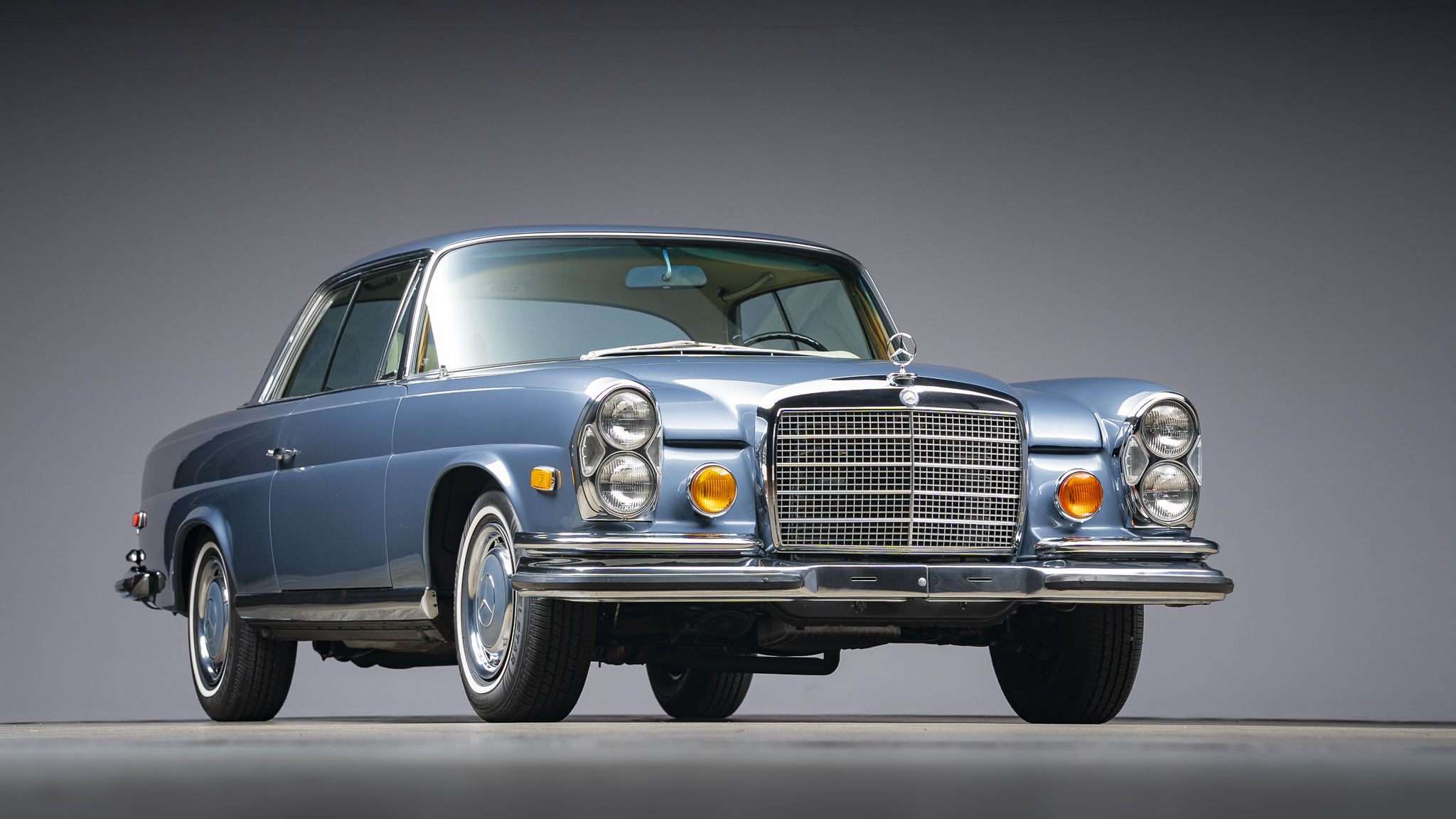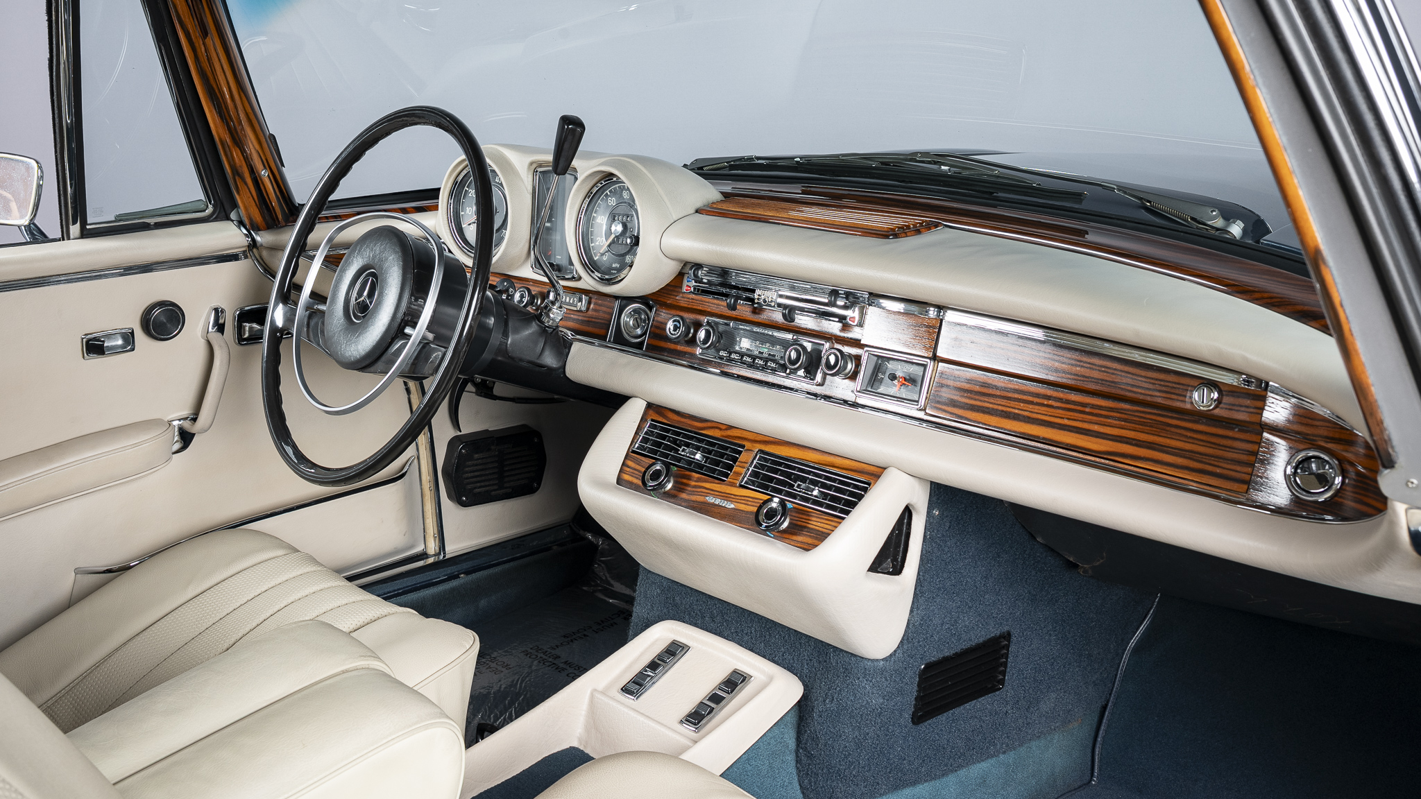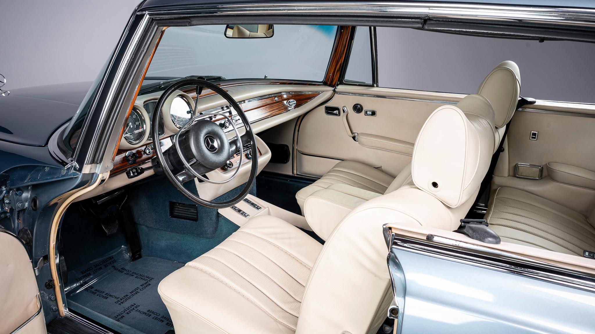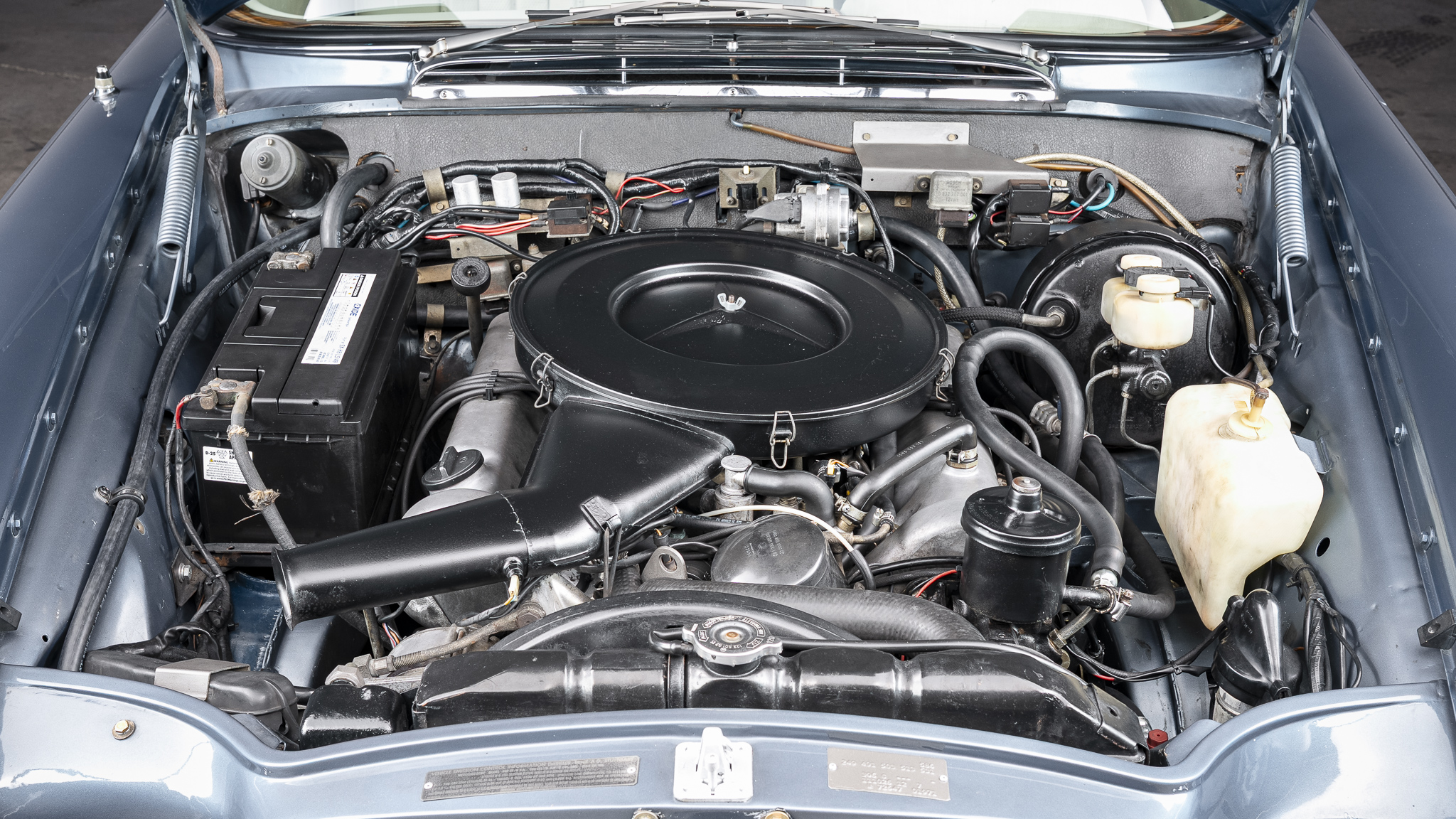 This 1971 Mercedes-Benz 280SE 3.5 coupe is one of approximately 3,270 examples produced between 1969 and 1971 The car is finished in Blue Metallic over parchment leather and is powered by a 3.5-liter V8 paired with a four-speed automatic transmission. Equipment includes 14″ steel wheels with covers, disc brakes, US-specification headlights, three-point seat belts, power windows, an AM/FM stereo, and air conditioning. It was acquired by the current owner in 2025, and subsequent work involved replacing the seat covers, tires, valve cover gaskets, and air conditioning components.