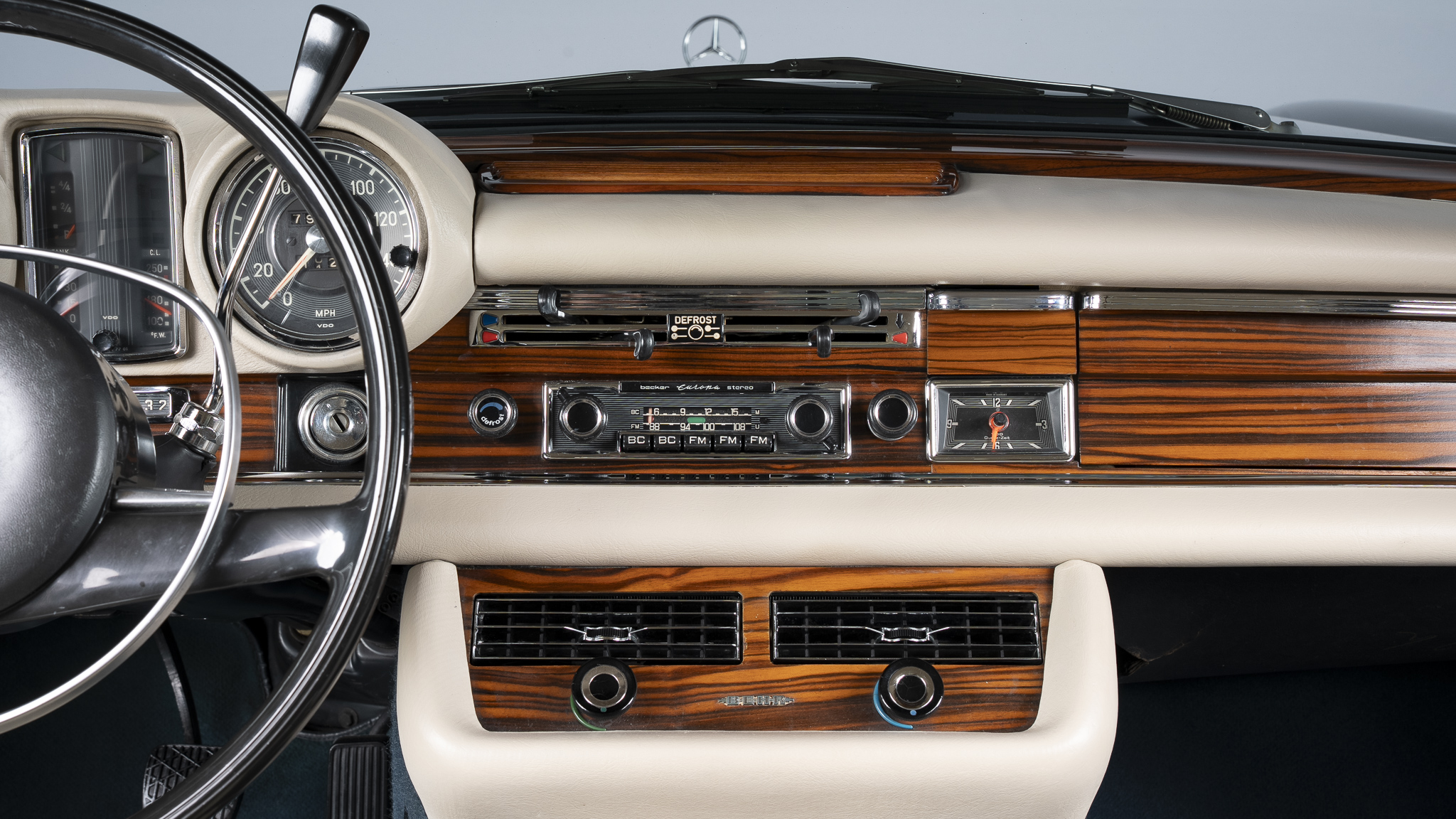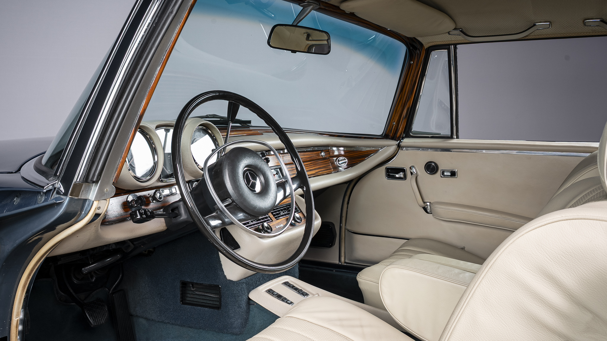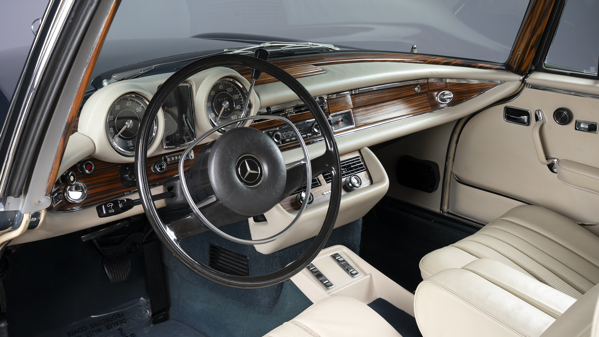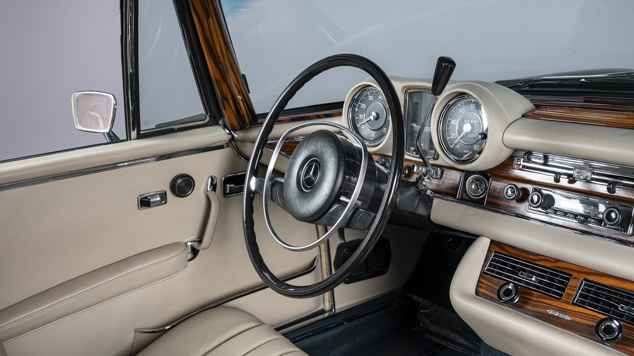 This 1971 Mercedes-Benz 280SE 3.5 coupe is one of approximately 3,270 examples produced between 1969 and 1971 The car is finished in Blue Metallic over parchment leather and is powered by a 3.5-liter V8 paired with a four-speed automatic transmission. Equipment includes 14″ steel wheels with covers, disc brakes, US-specification headlights, three-point seat belts, power windows, an AM/FM stereo, and air conditioning. It was acquired by the current owner in 2025, and subsequent work involved replacing the seat covers, tires, valve cover gaskets, and air conditioning components.