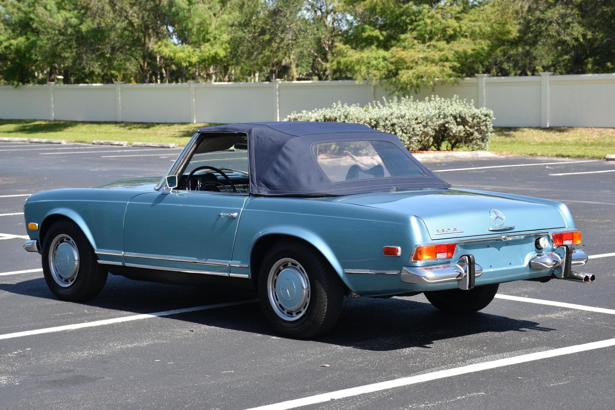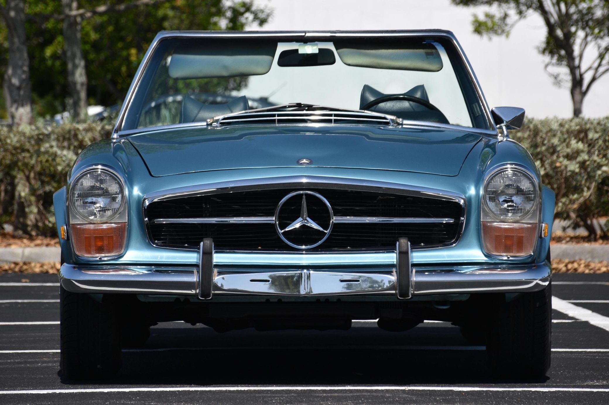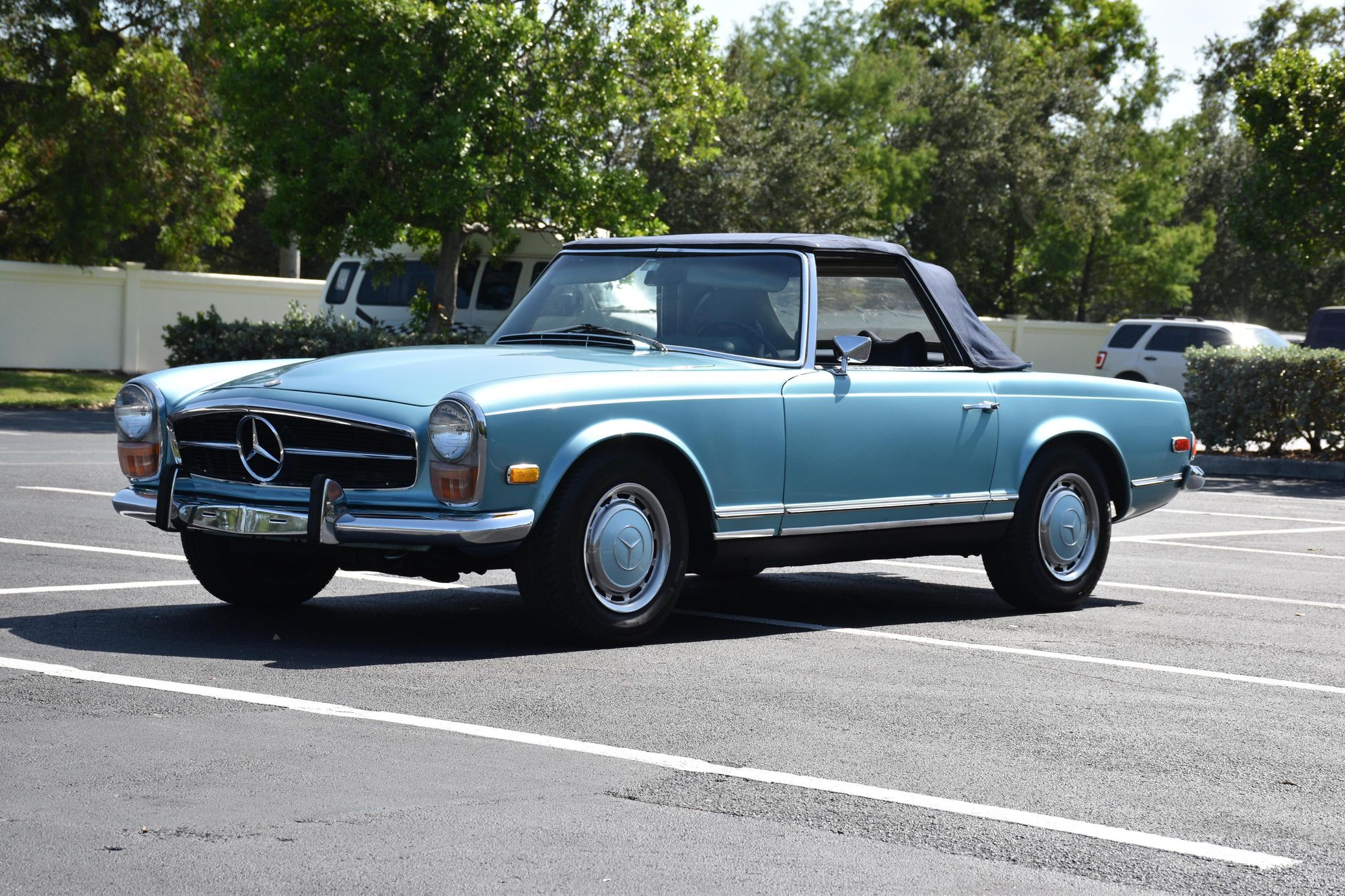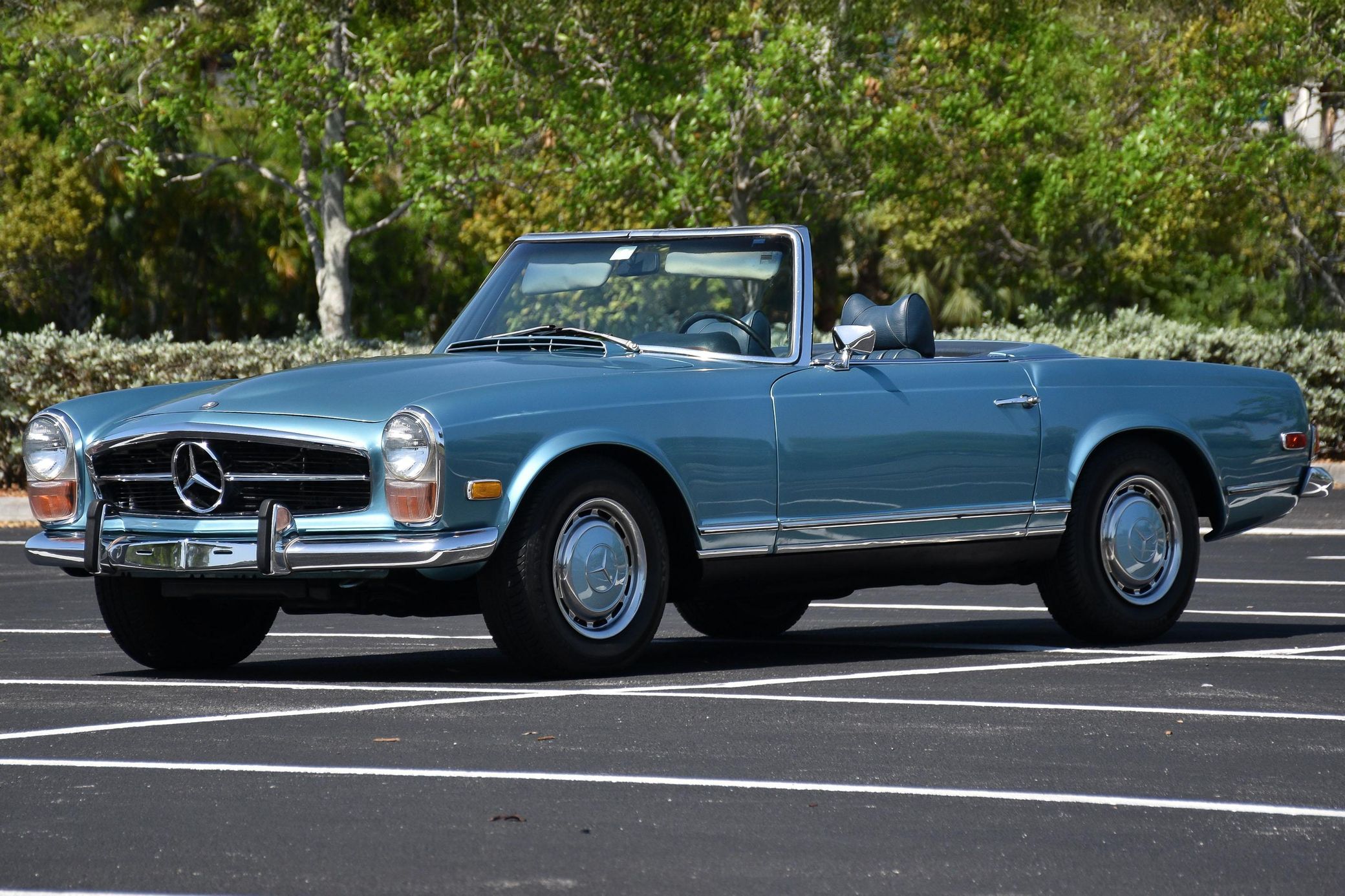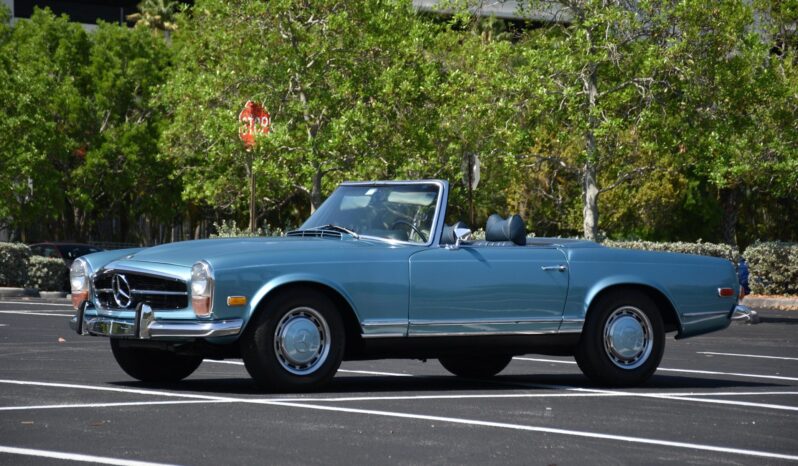 the "Pagoda" Mercedes-Benz SL should be near the top of your list – it boasts impressive build quality, a smooth and potent 6-cylinder engine, and handsome styling that has aged well. This particular 280SL is finished in a gorgeous Horizon Blue over blue color combination, and it comes with a body-colored factory hardtop. Power comes from a 2.8-liter straight-6, rated at about 180 horsepower and 193 lb-ft of torque. Output is sent to the rear wheels via a 4-speed automatic transmission.