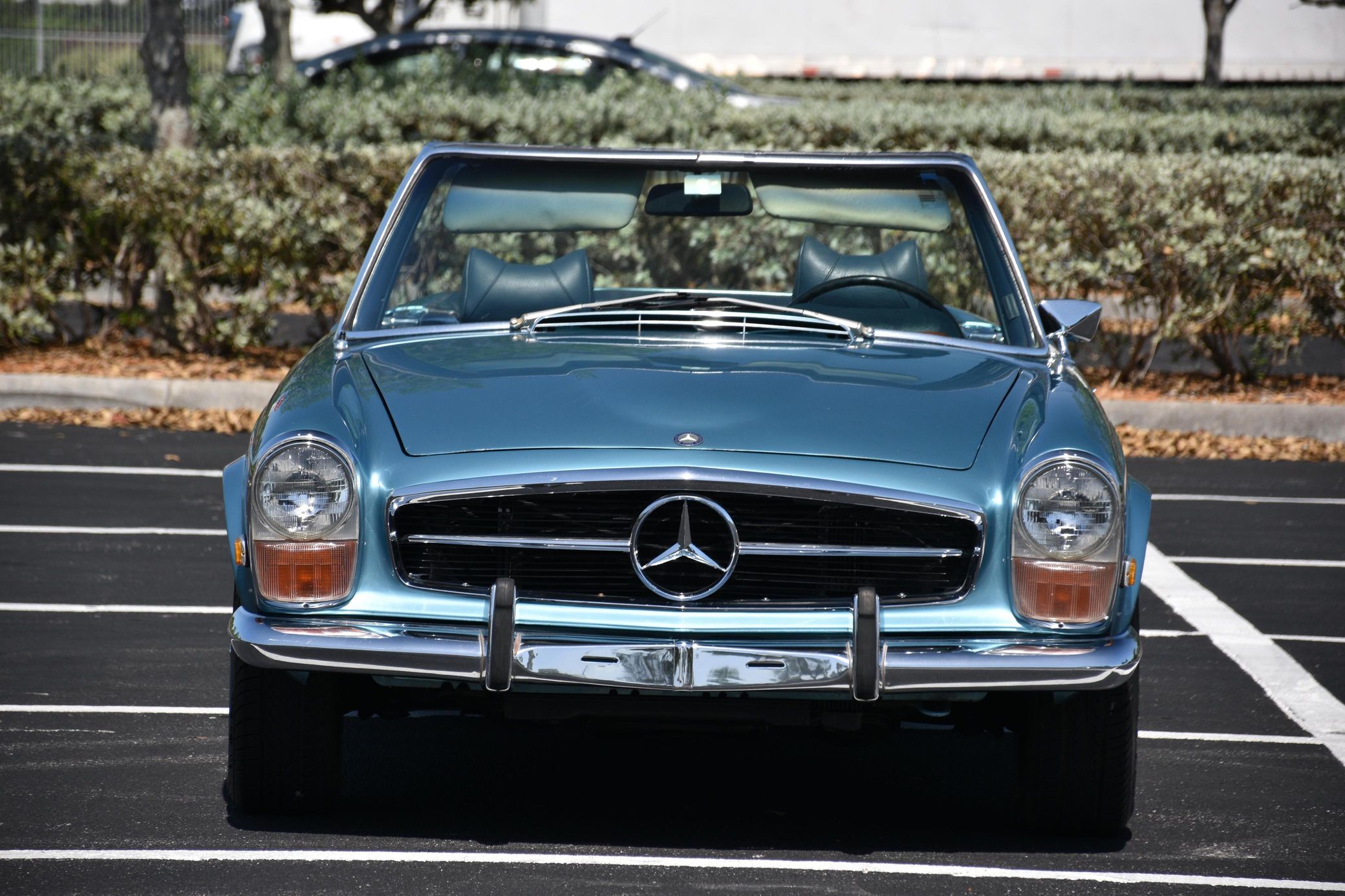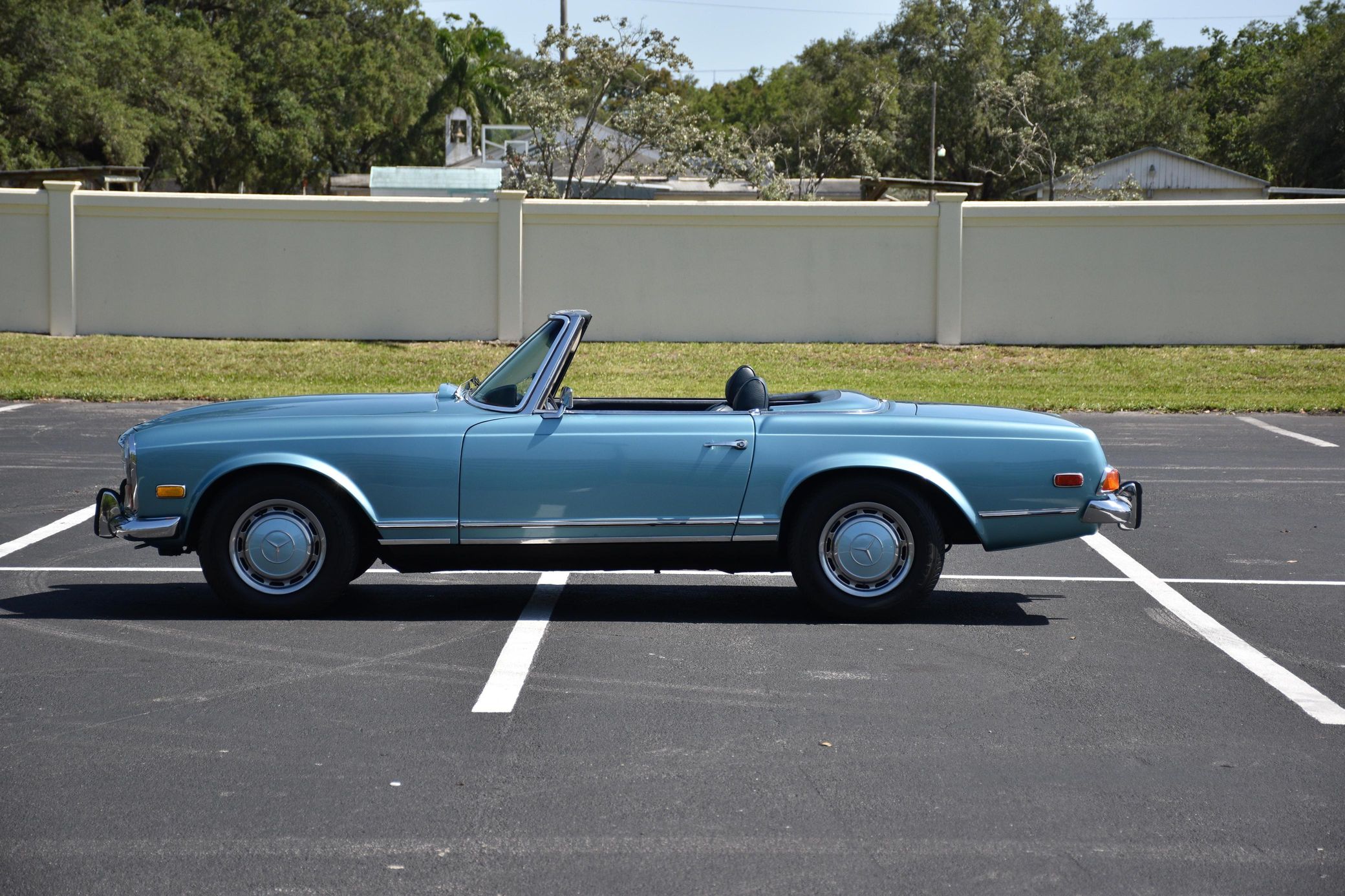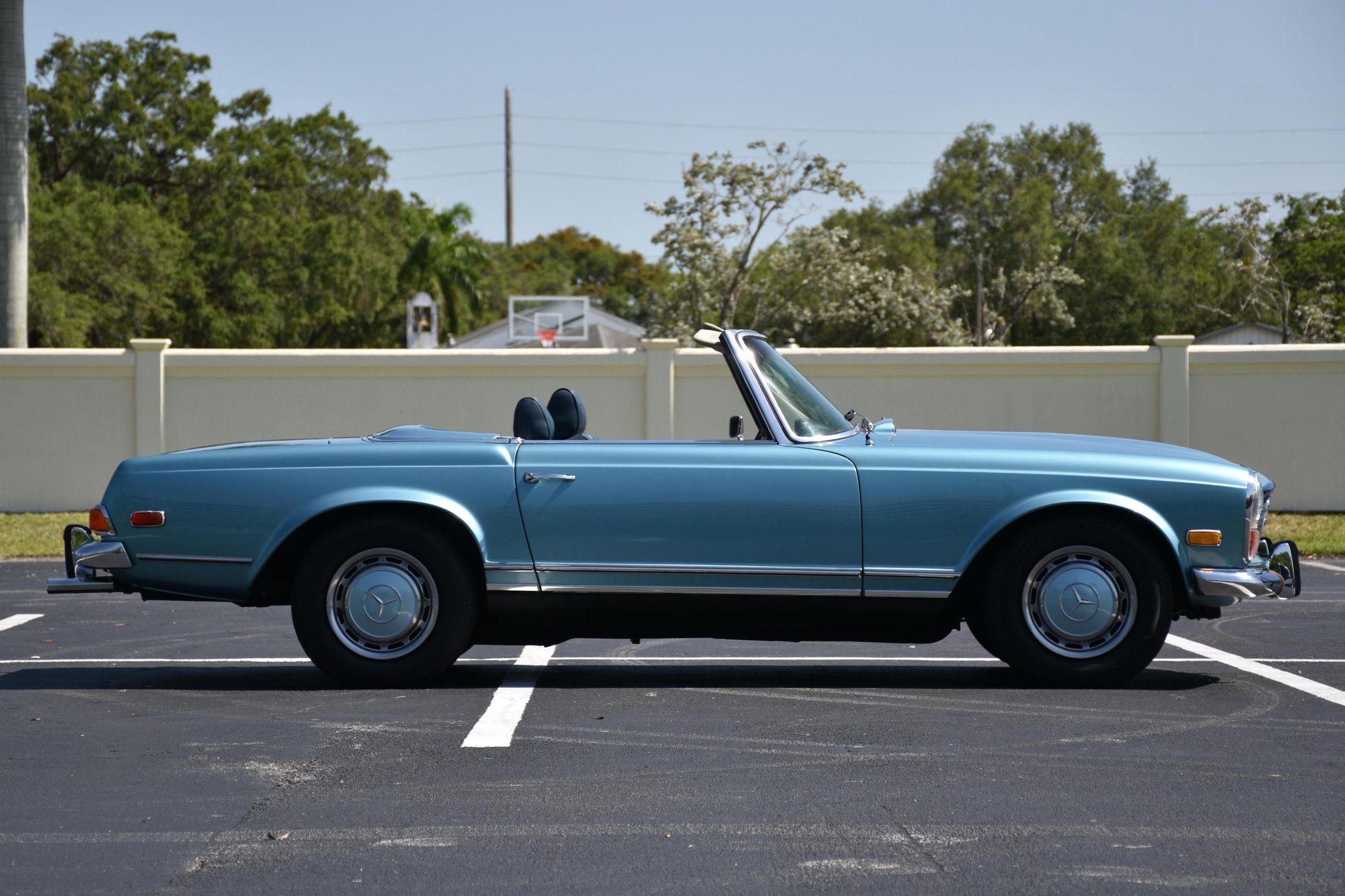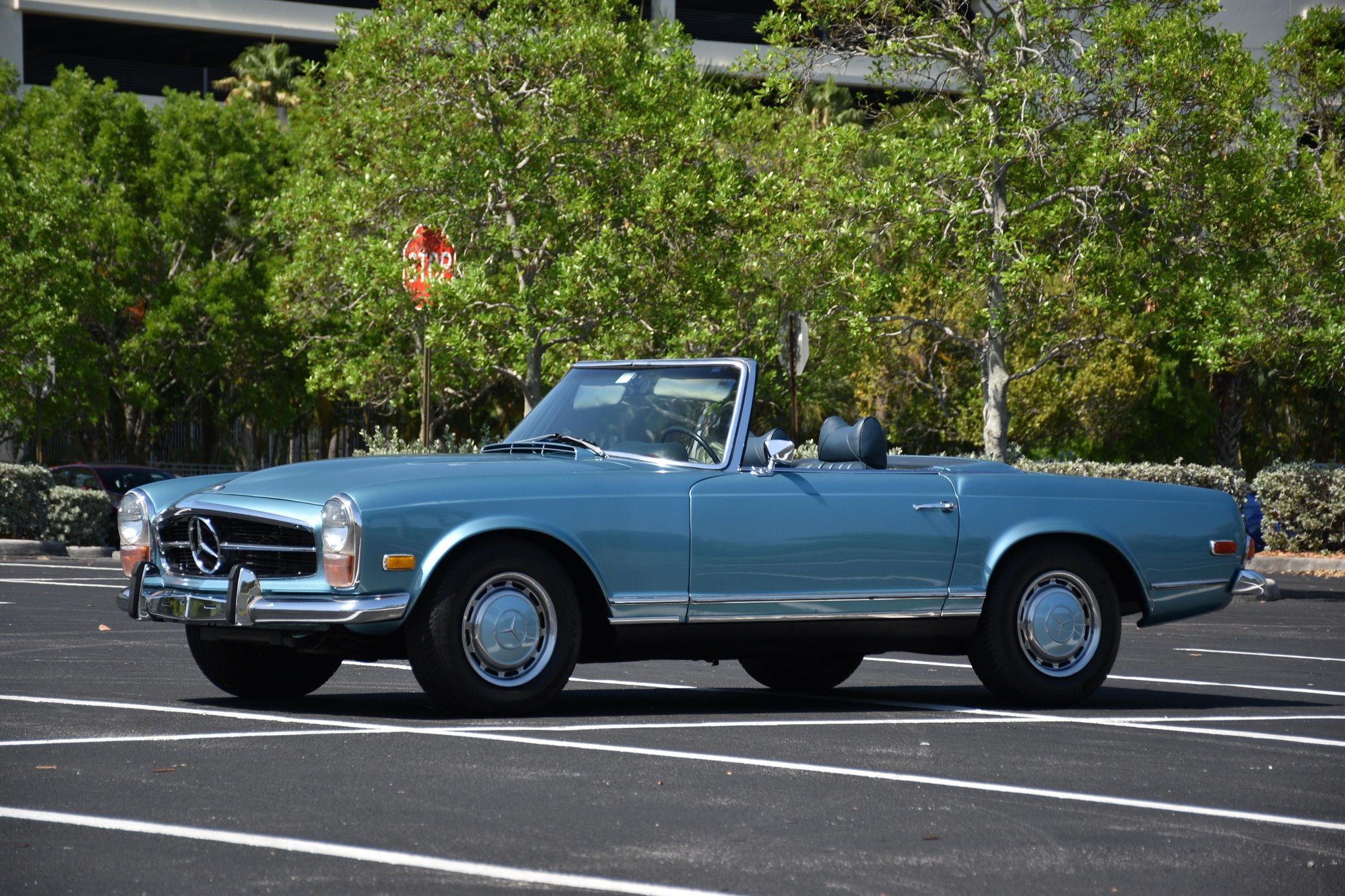 the "Pagoda" Mercedes-Benz SL should be near the top of your list – it boasts impressive build quality, a smooth and potent 6-cylinder engine, and handsome styling that has aged well. This particular 280SL is finished in a gorgeous Horizon Blue over blue color combination, and it comes with a body-colored factory hardtop. Power comes from a 2.8-liter straight-6, rated at about 180 horsepower and 193 lb-ft of torque. Output is sent to the rear wheels via a 4-speed automatic transmission.