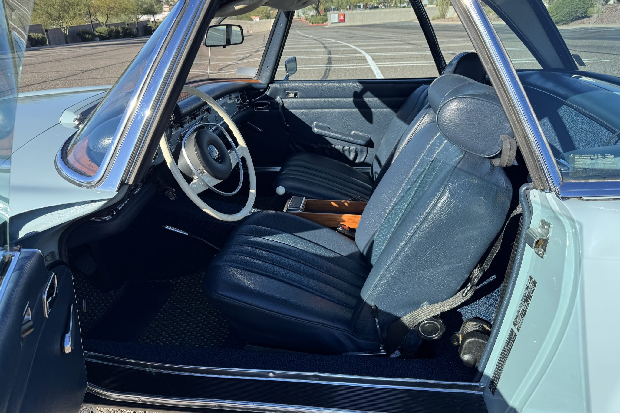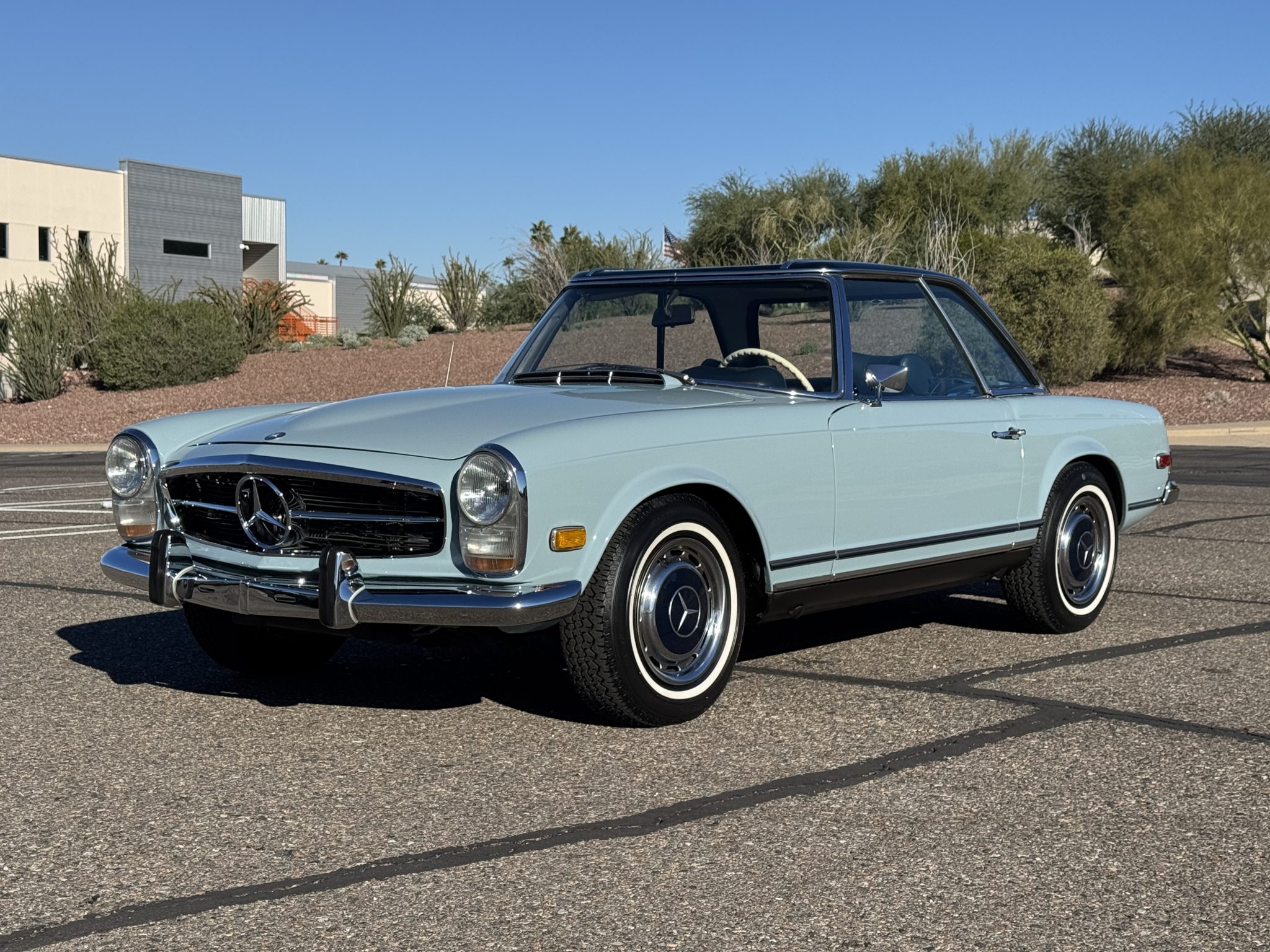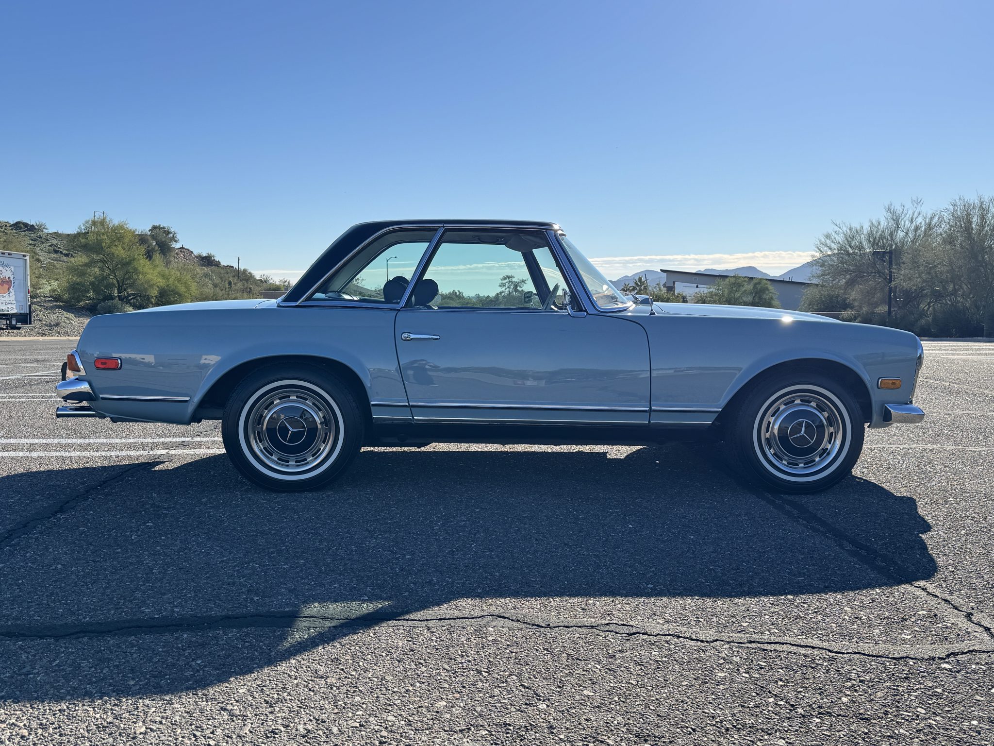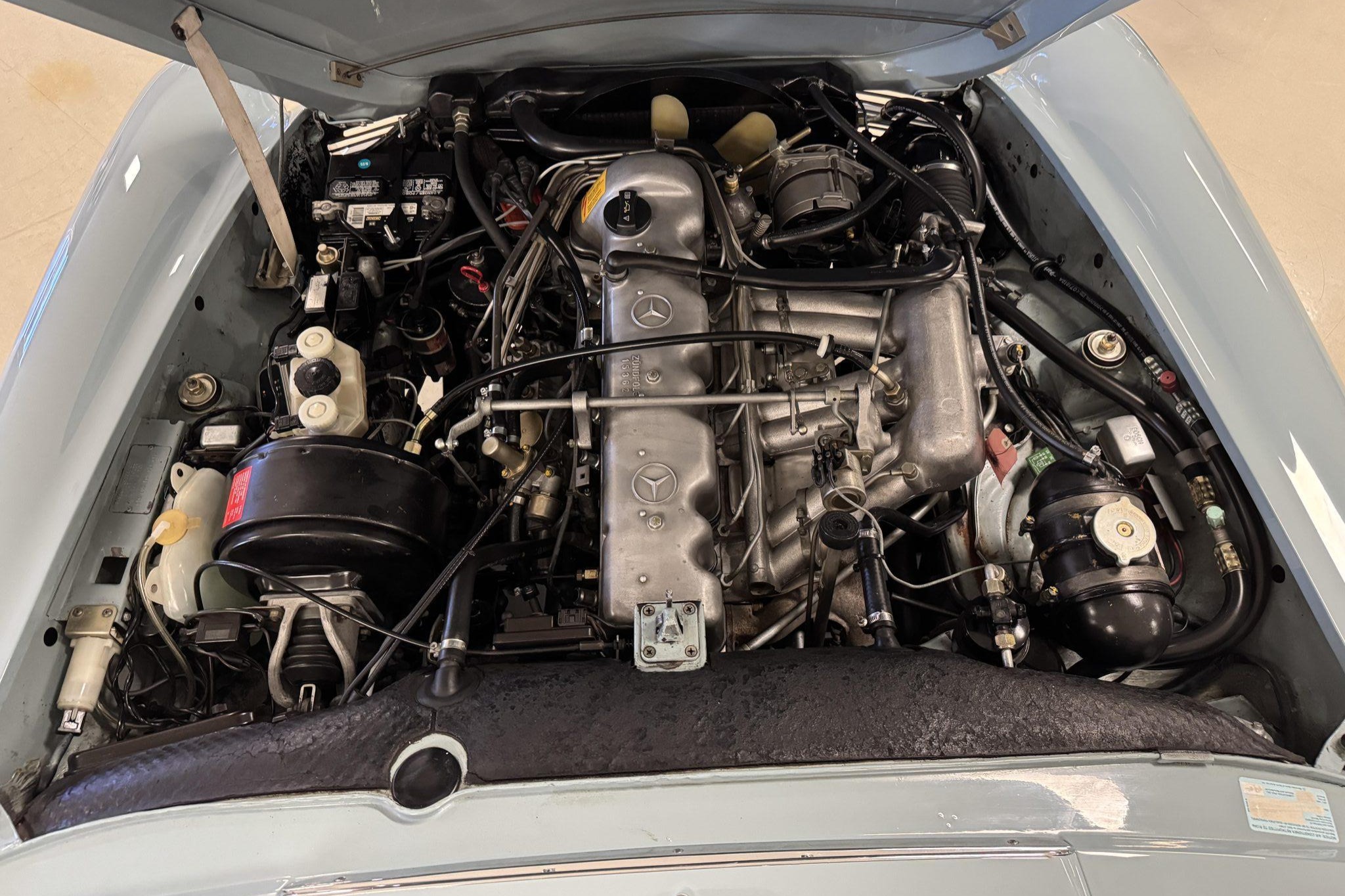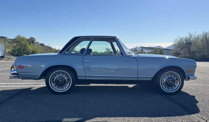 The car underwent a refurbishment in the 2010s, and it is finished in Horizon Blue with a dark blue removable hardtop over blue MB-Tex upholstery. Power comes from a replacement 2.8-liter inline-six paired with a four-speed automatic transmission, and equipment includes Bosch mechanical fuel injection, four-wheel disc brakes, 14″ steel wheels, a blue soft top, a Becker Europa II AM/FM stereo with an auxiliary input, and air conditioning. Work performed in preparation for the sale included replacing the valve cover gasket, suspension bushings, tires, fuel lines, and fluids.