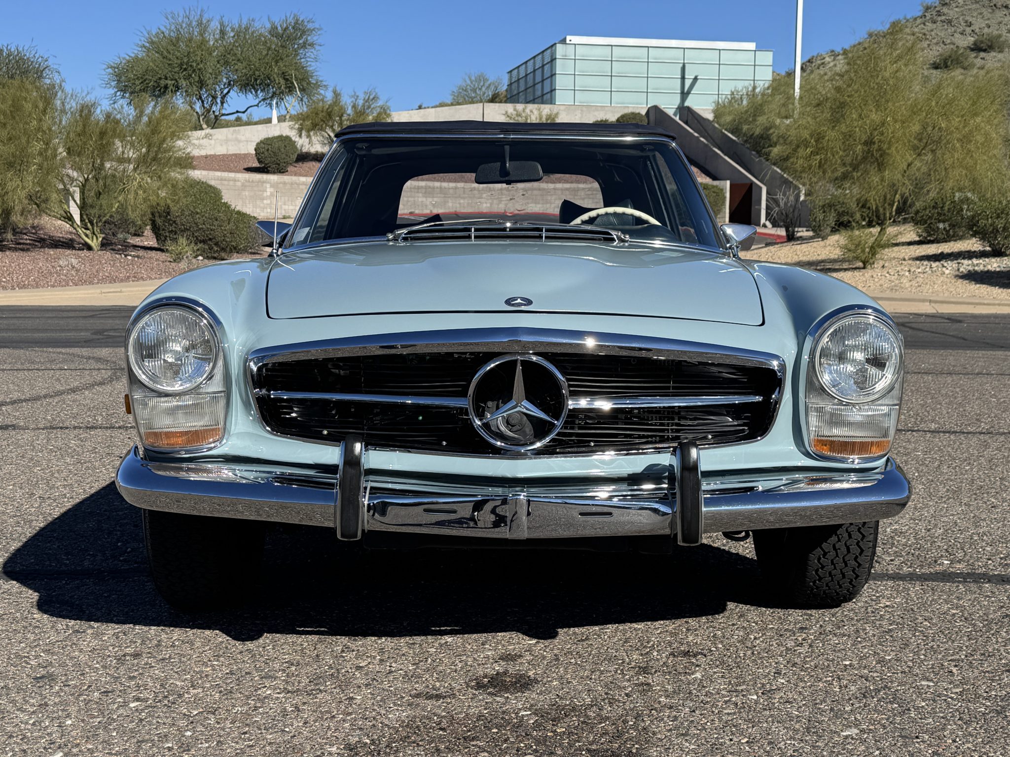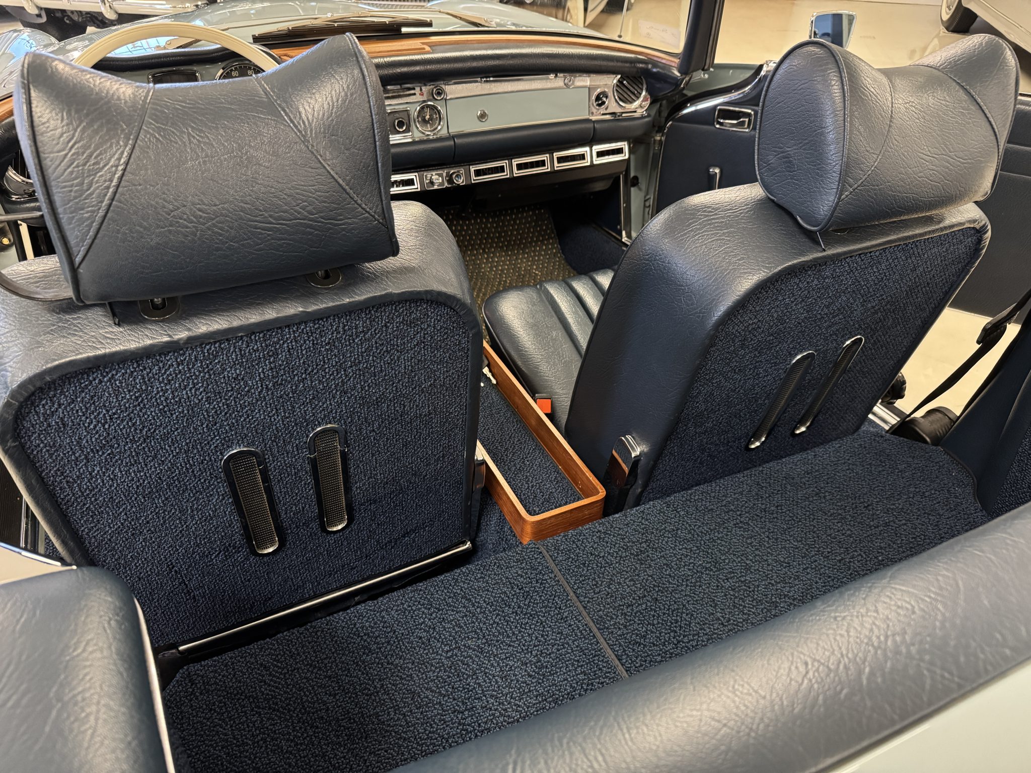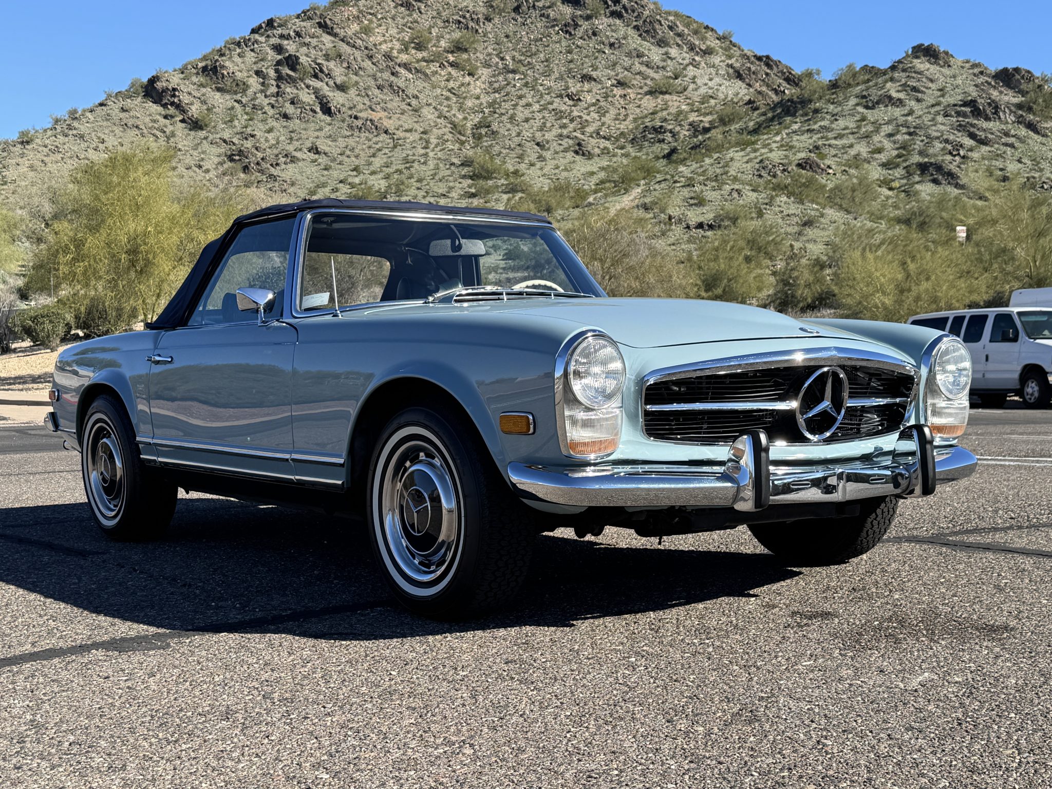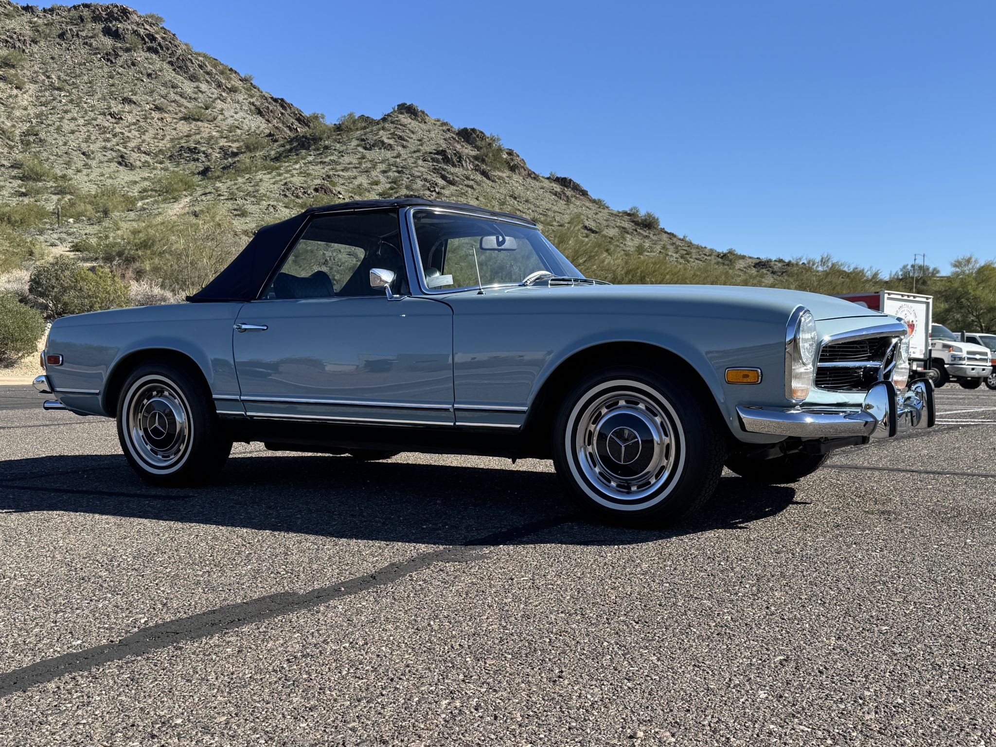 The car underwent a refurbishment in the 2010s, and it is finished in Horizon Blue with a dark blue removable hardtop over blue MB-Tex upholstery. Power comes from a replacement 2.8-liter inline-six paired with a four-speed automatic transmission, and equipment includes Bosch mechanical fuel injection, four-wheel disc brakes, 14″ steel wheels, a blue soft top, a Becker Europa II AM/FM stereo with an auxiliary input, and air conditioning. Work performed in preparation for the sale included replacing the valve cover gasket, suspension bushings, tires, fuel lines, and fluids.