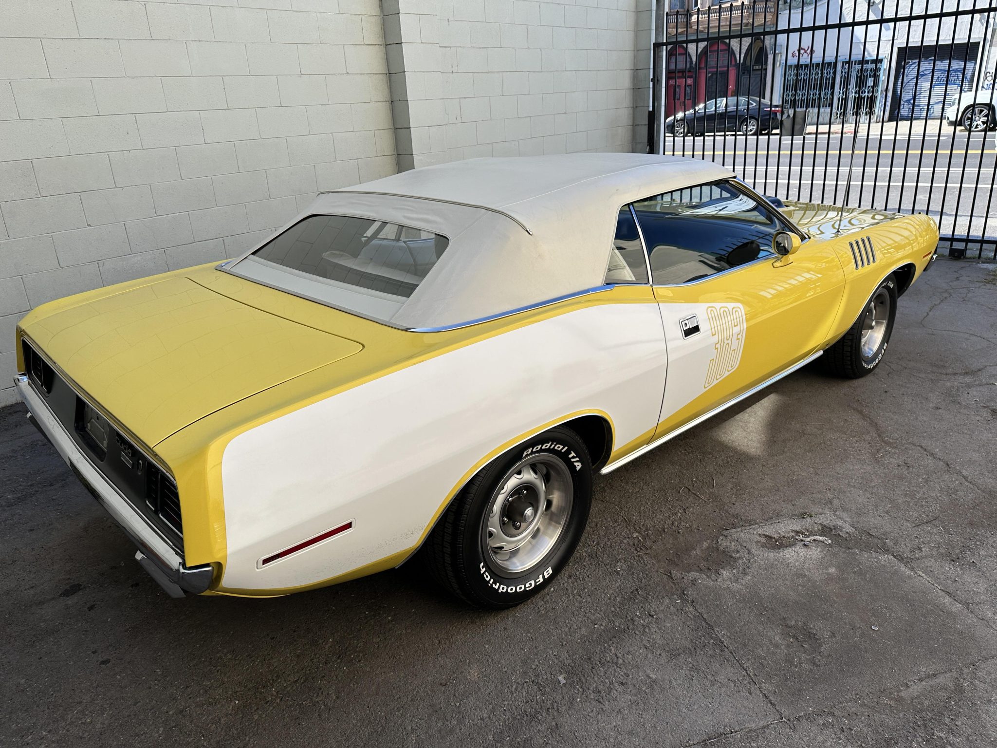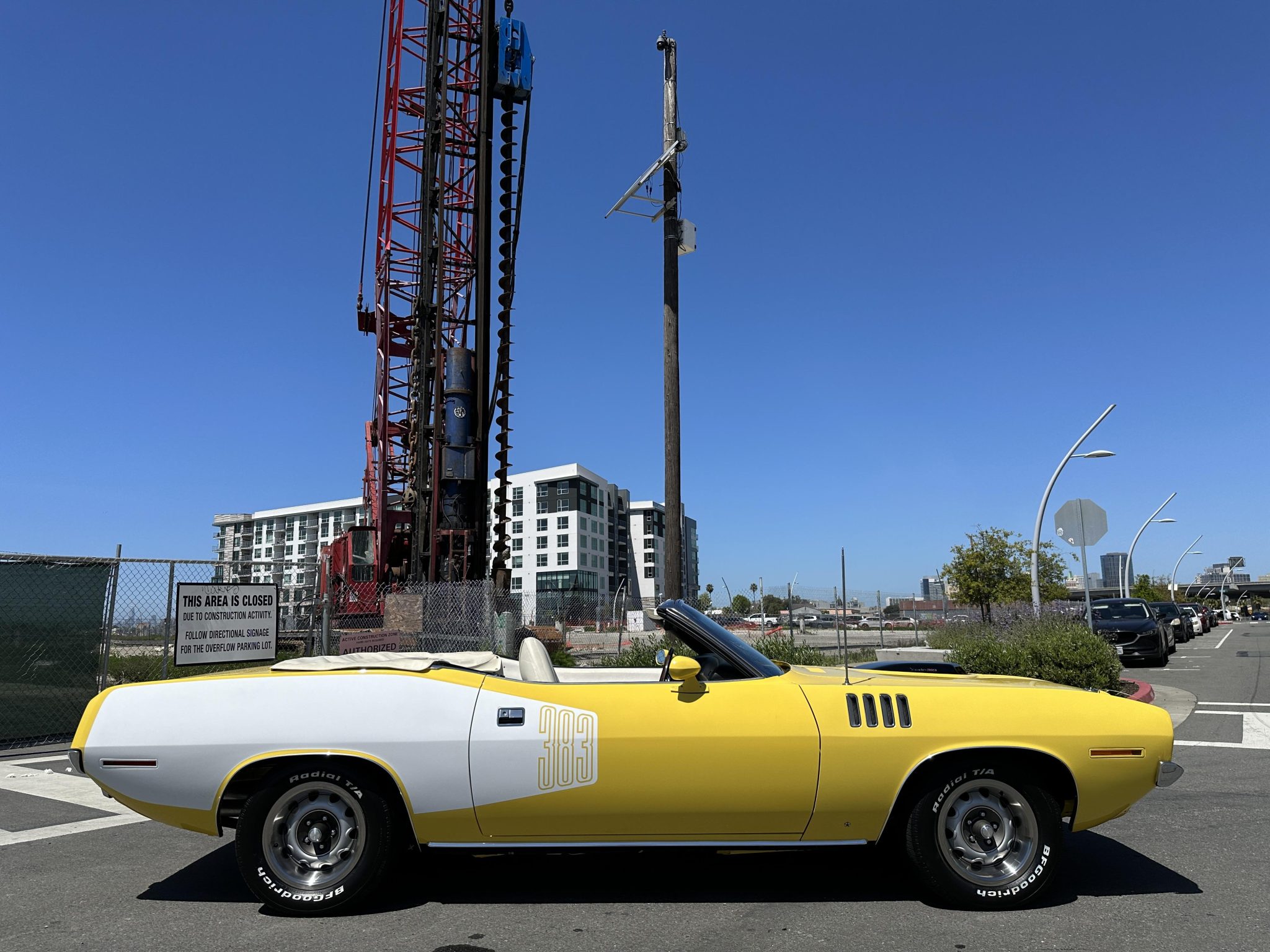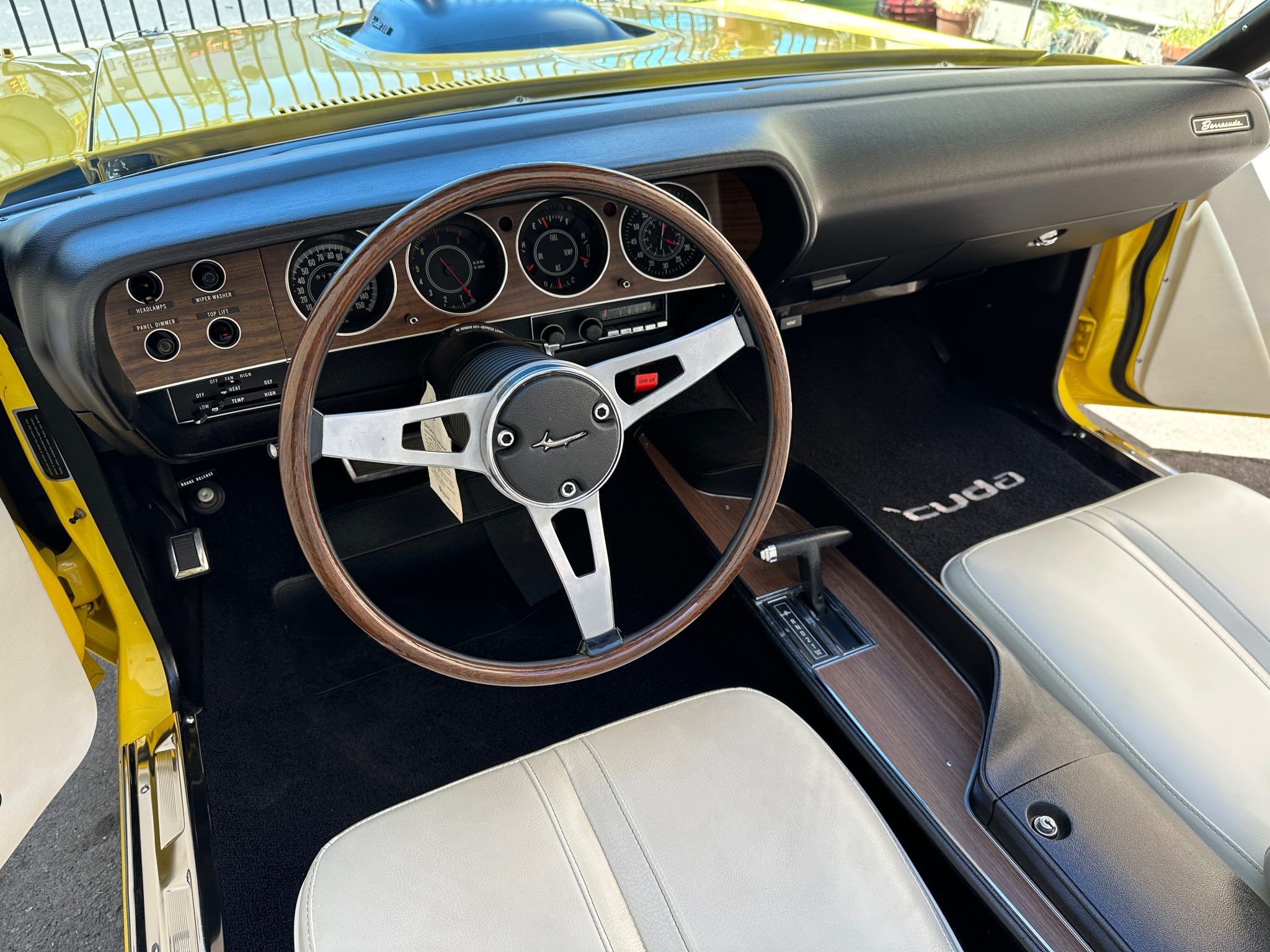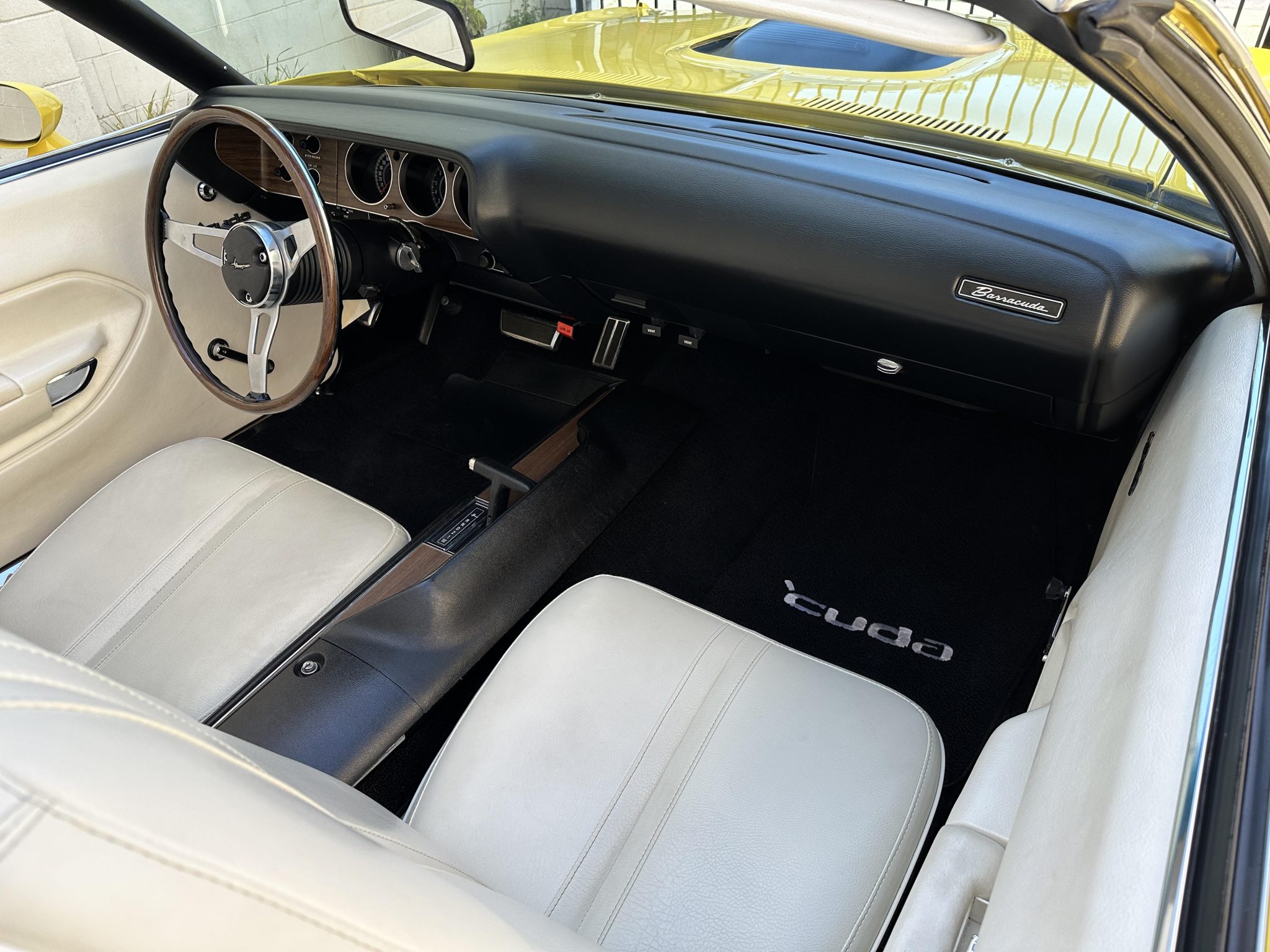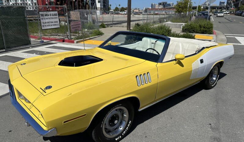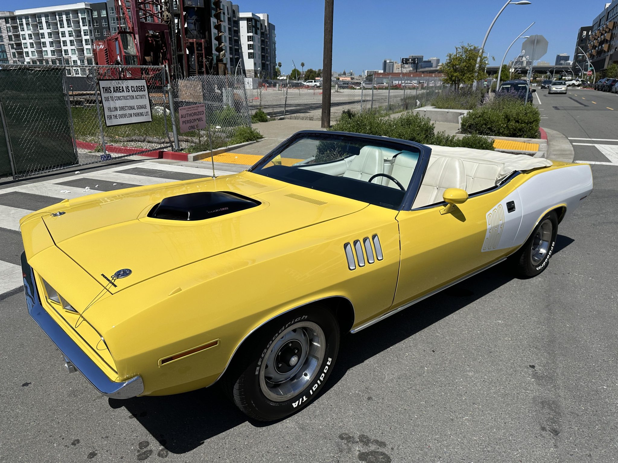 This 1971 Plymouth ’Cuda convertible is one of approximately 87 examples produced for the model year with a 383ci V8, a four-barrel carburetor, and a three-speed automatic transmission. It is further equipped with a Shaker hood, a white convertible soft top, 14″ Rallye wheels, power-assisted steering and brakes, ’Cuda graphics, dual side mirrors, a center console, an AM/FM radio, a Rallye gauge cluster, and a cabin heater.