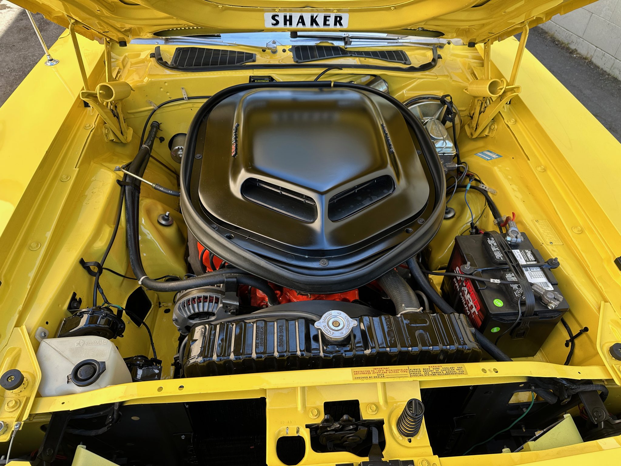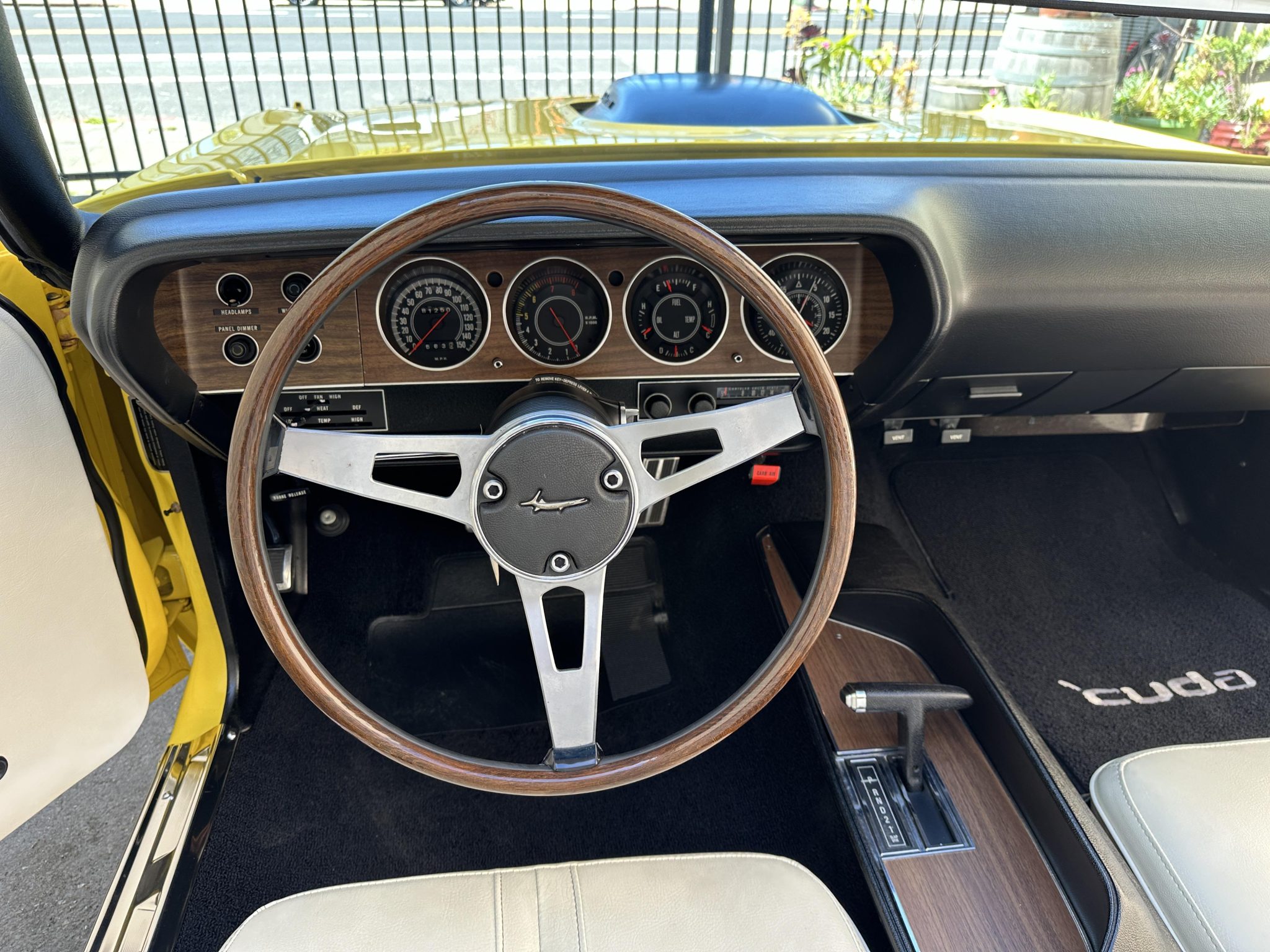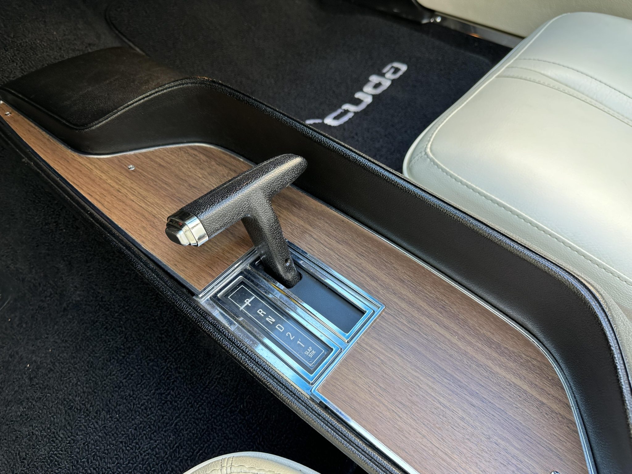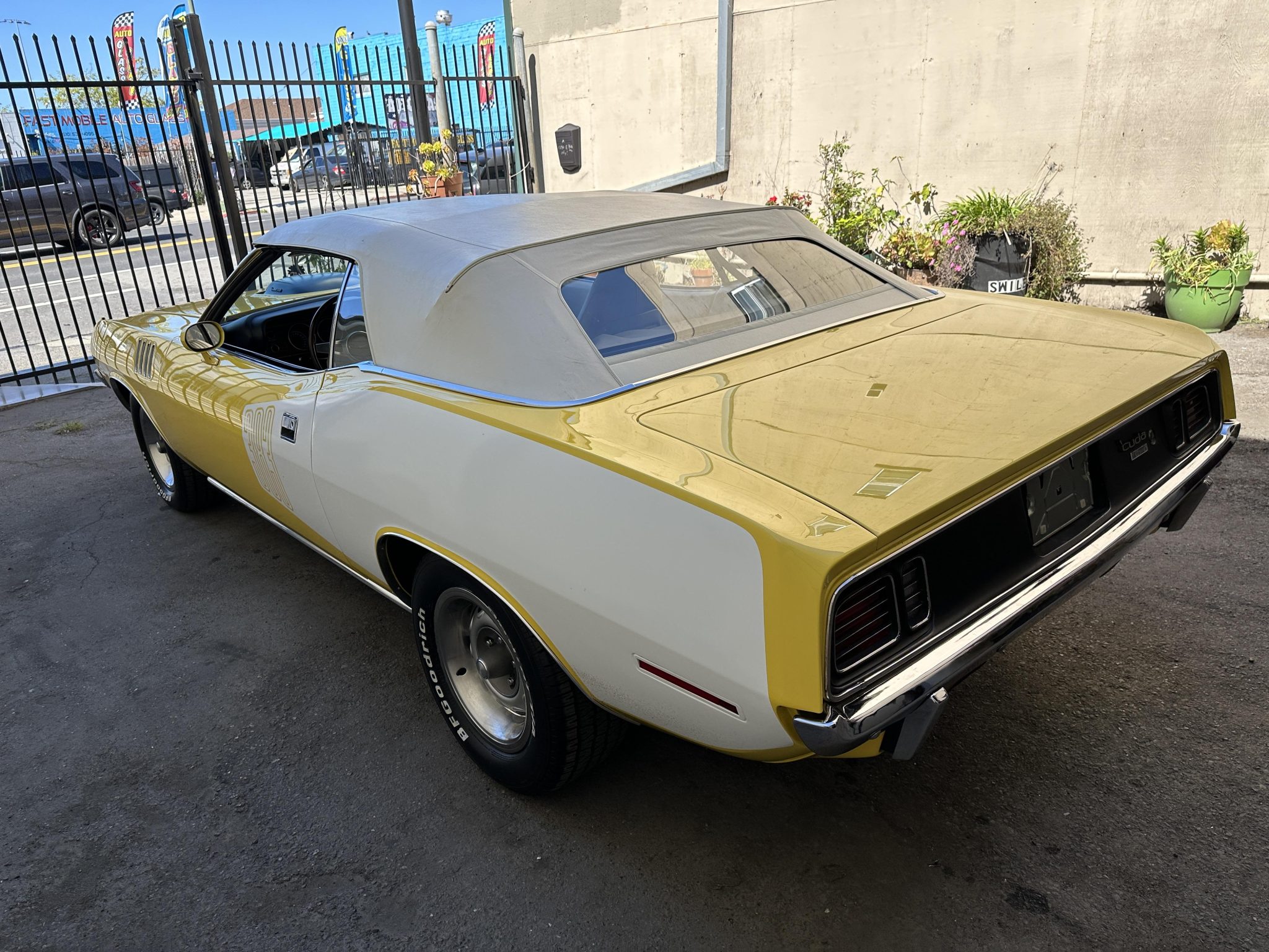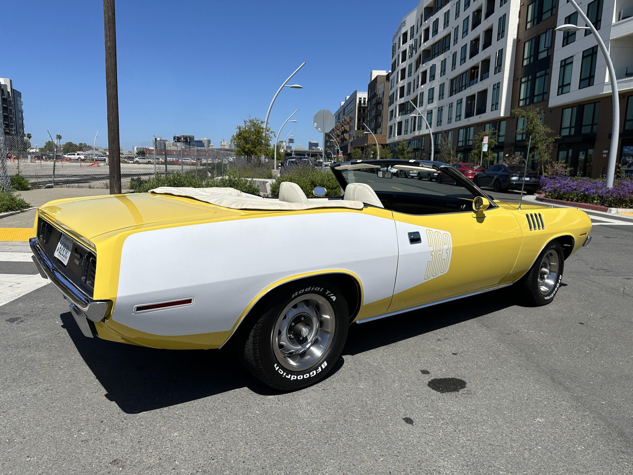 This 1971 Plymouth ’Cuda convertible is one of approximately 87 examples produced for the model year with a 383ci V8, a four-barrel carburetor, and a three-speed automatic transmission. It is further equipped with a Shaker hood, a white convertible soft top, 14″ Rallye wheels, power-assisted steering and brakes, ’Cuda graphics, dual side mirrors, a center console, an AM/FM radio, a Rallye gauge cluster, and a cabin heater.