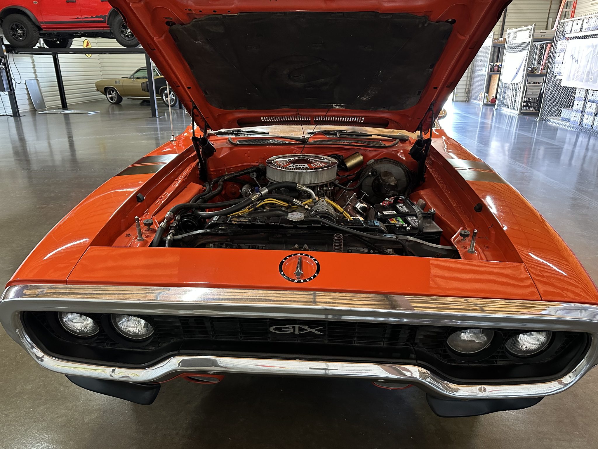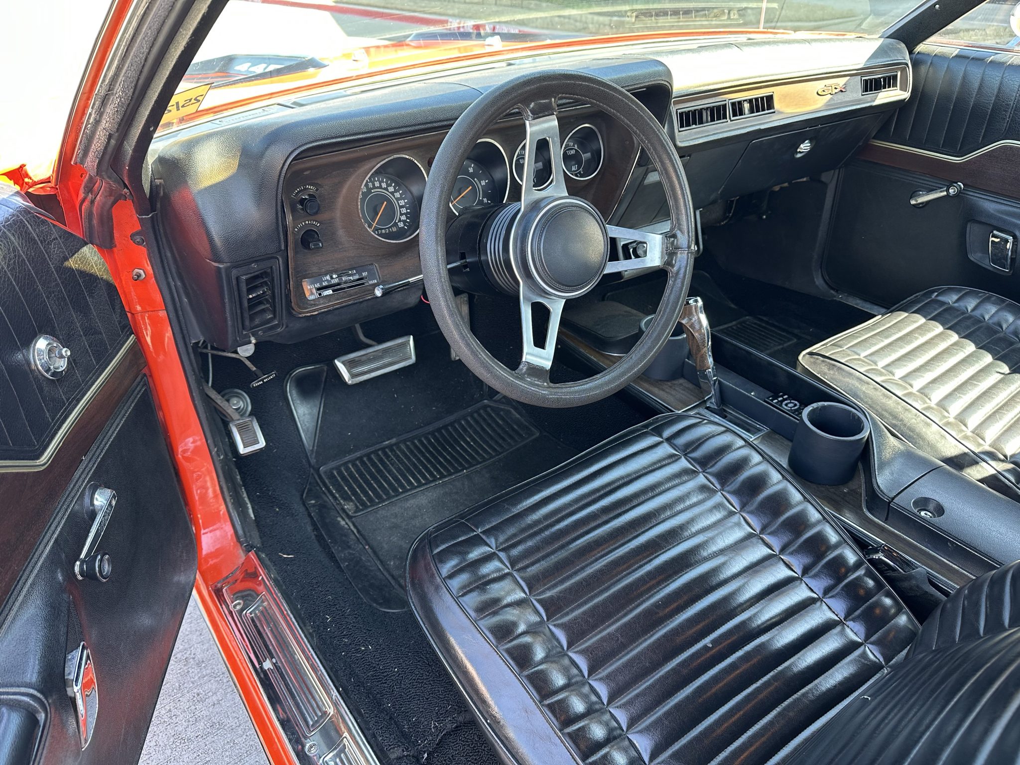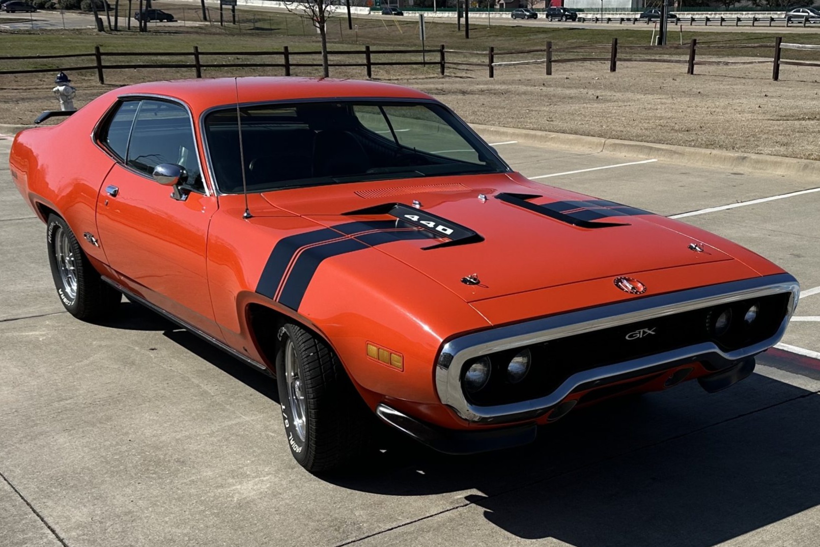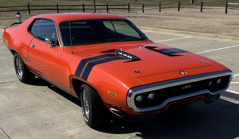 This 1971 Plymouth GTX is powered by a 440ci V8 paired with a three-speed automatic transmission and a limited-slip differential. It is finished in orange over a black interior and is equipped with black hood accents, hood pins, rear window louvers, and a rear wing. The car rides on 15″ Cragar Keystone Klassic wheels and has front disc brakes, power steering, and a dual exhaust system with Flowmaster mufflers. Inside, the seats are trimmed in black vinyl and accompanied by an aftermarket radio, air conditioning, a pistol-grip gear selector, and woodgrain trim.