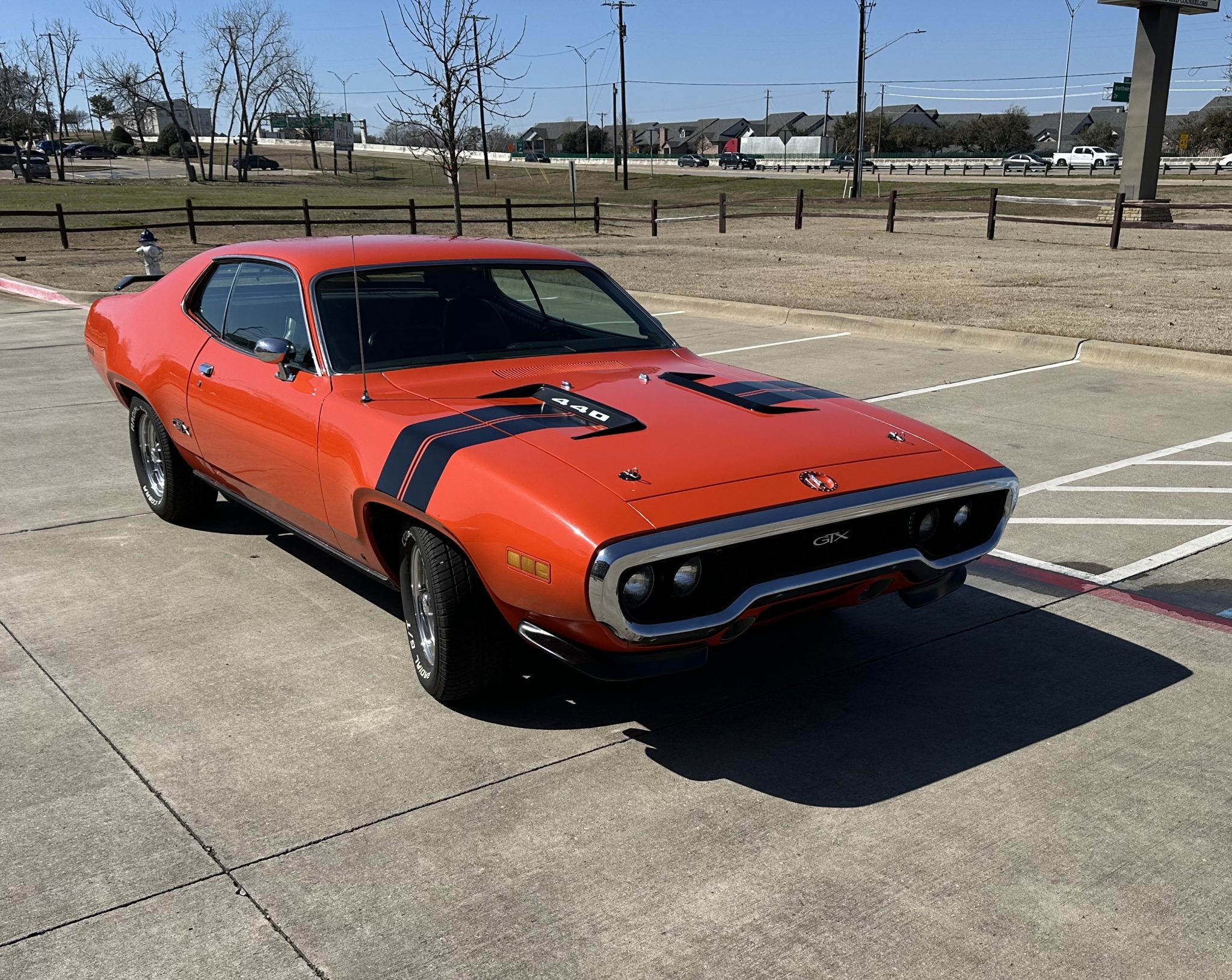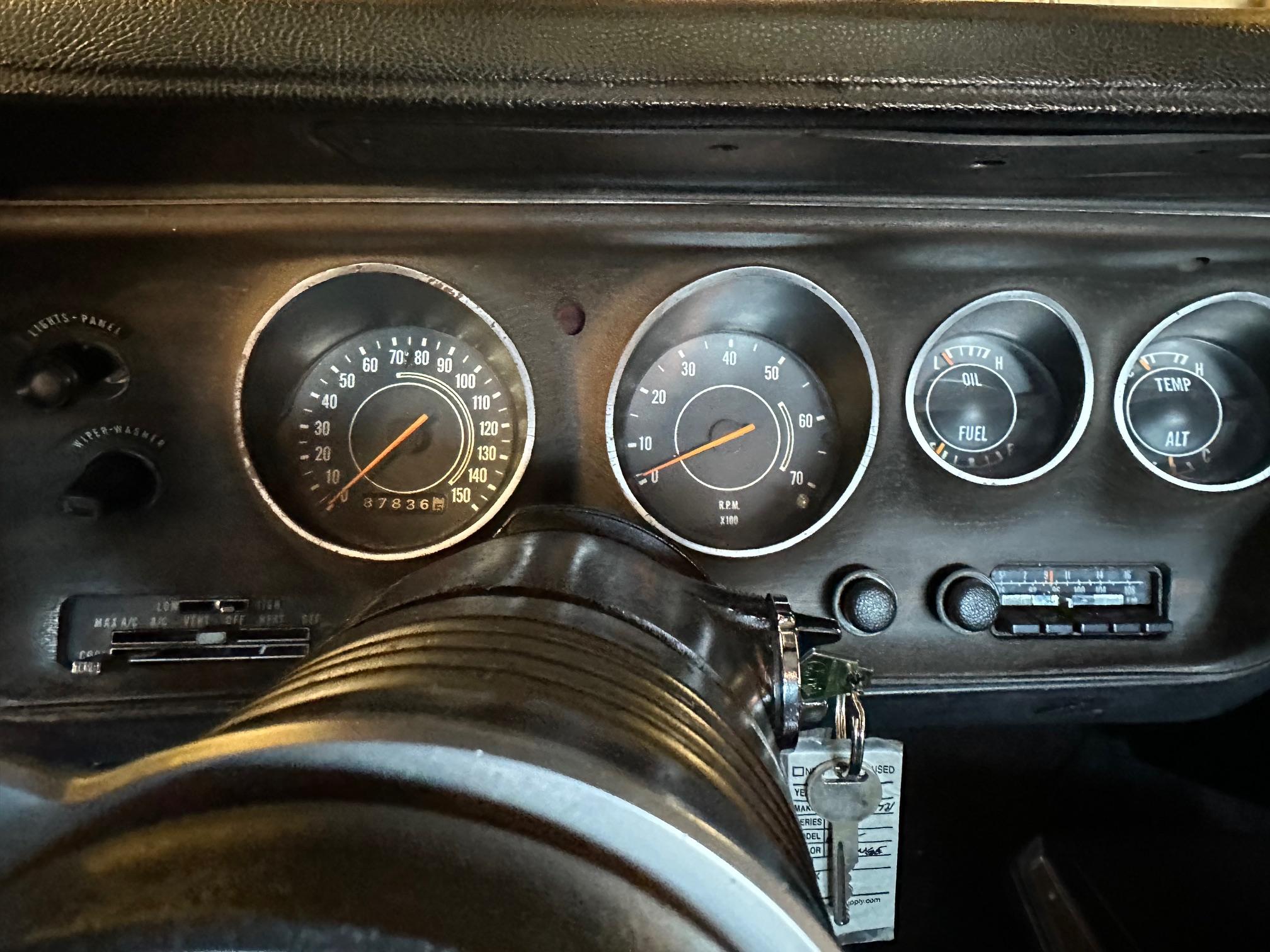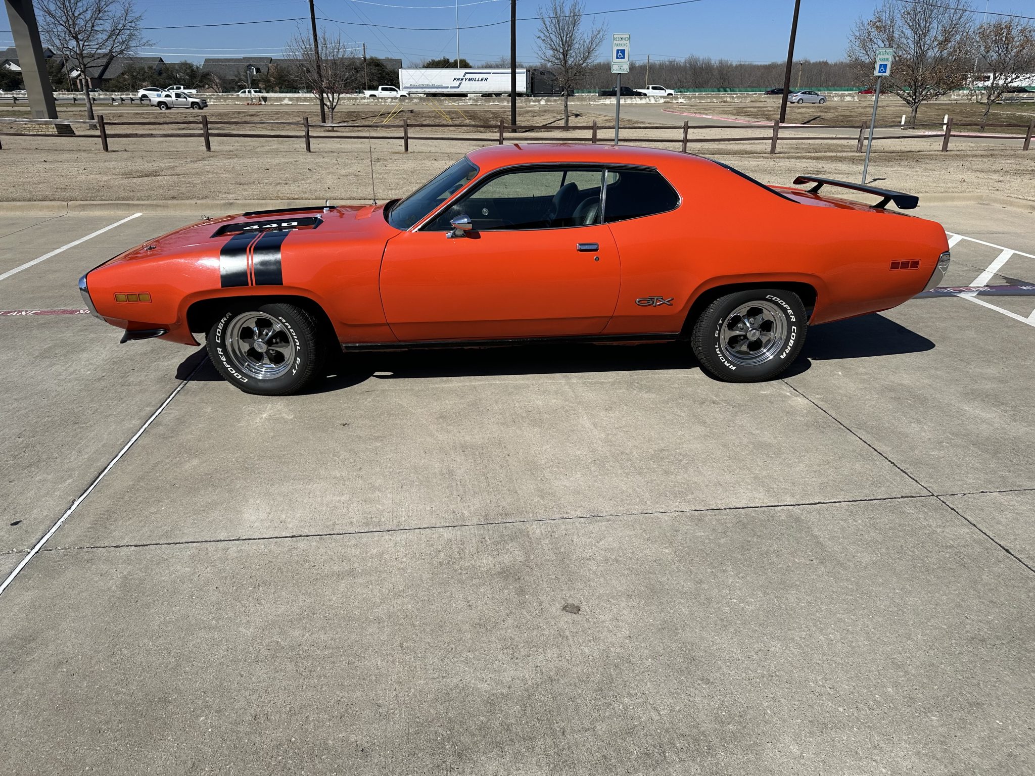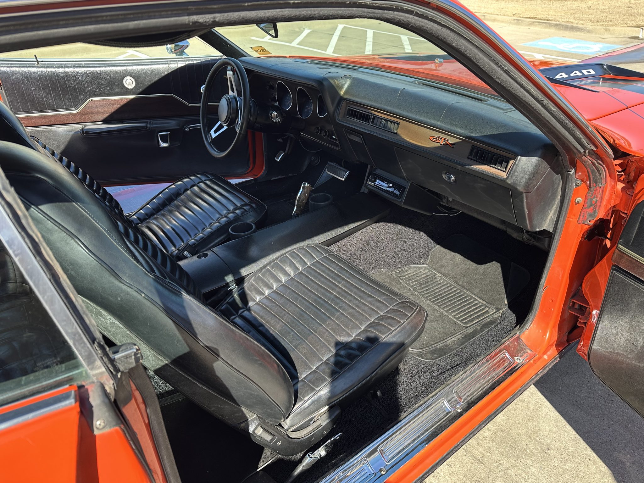 This 1971 Plymouth GTX is powered by a 440ci V8 paired with a three-speed automatic transmission and a limited-slip differential. It is finished in orange over a black interior and is equipped with black hood accents, hood pins, rear window louvers, and a rear wing. The car rides on 15″ Cragar Keystone Klassic wheels and has front disc brakes, power steering, and a dual exhaust system with Flowmaster mufflers. Inside, the seats are trimmed in black vinyl and accompanied by an aftermarket radio, air conditioning, a pistol-grip gear selector, and woodgrain trim.