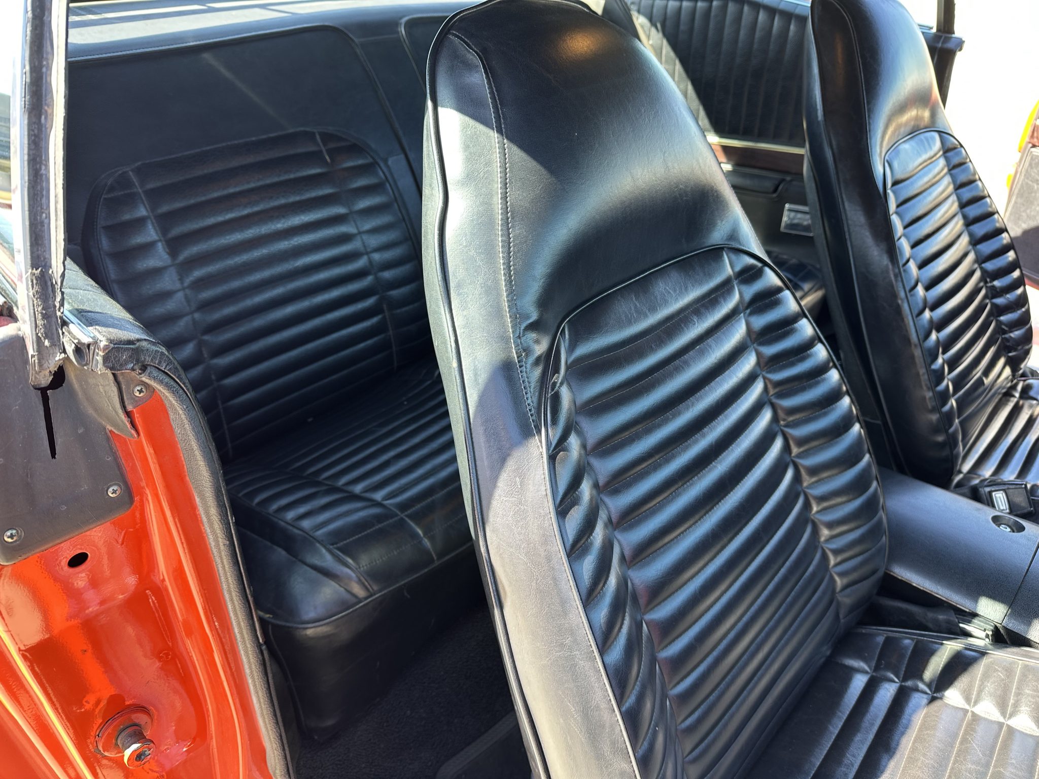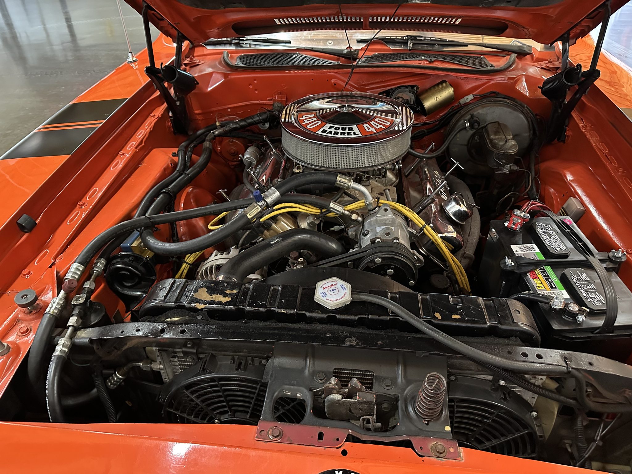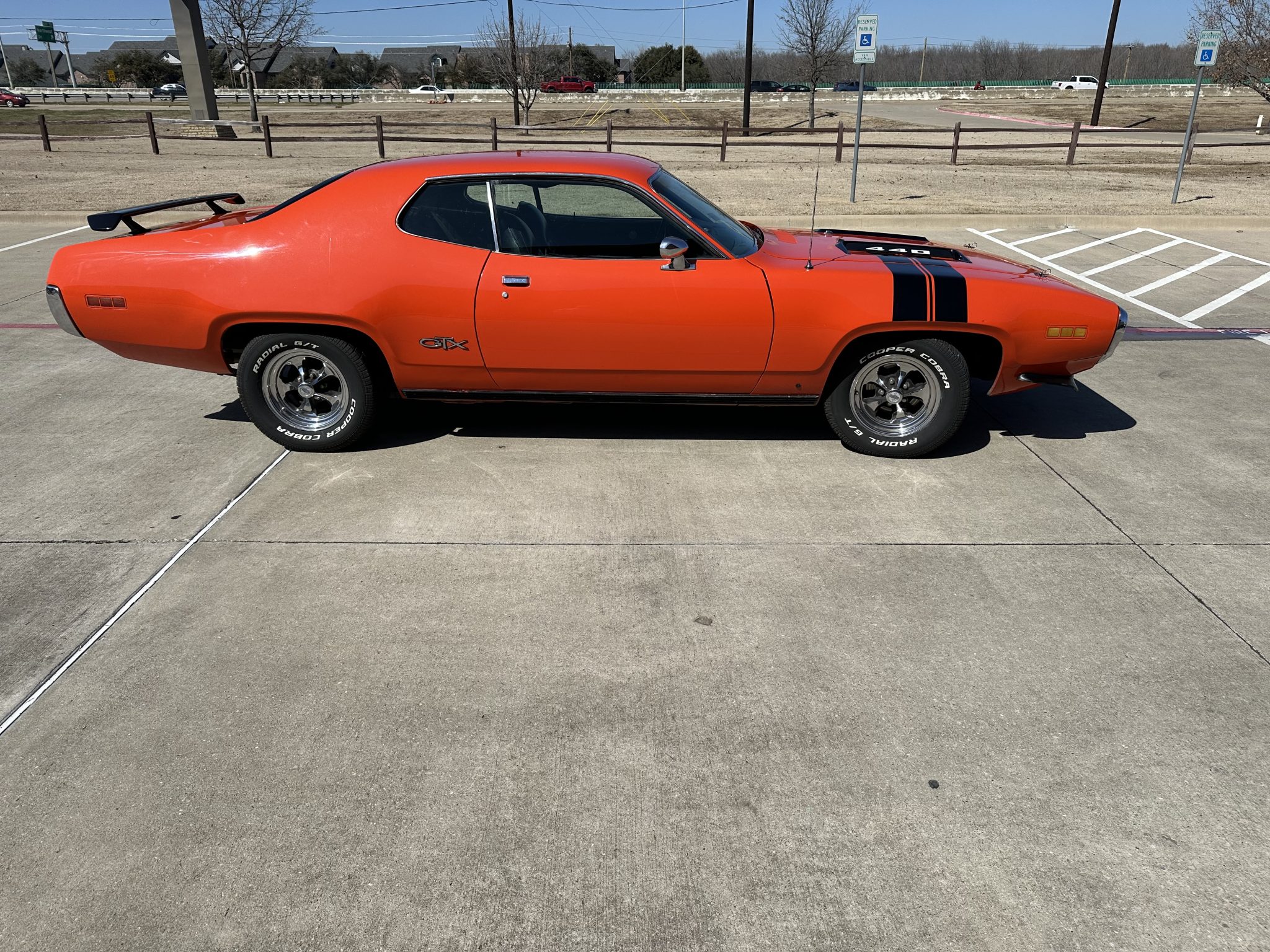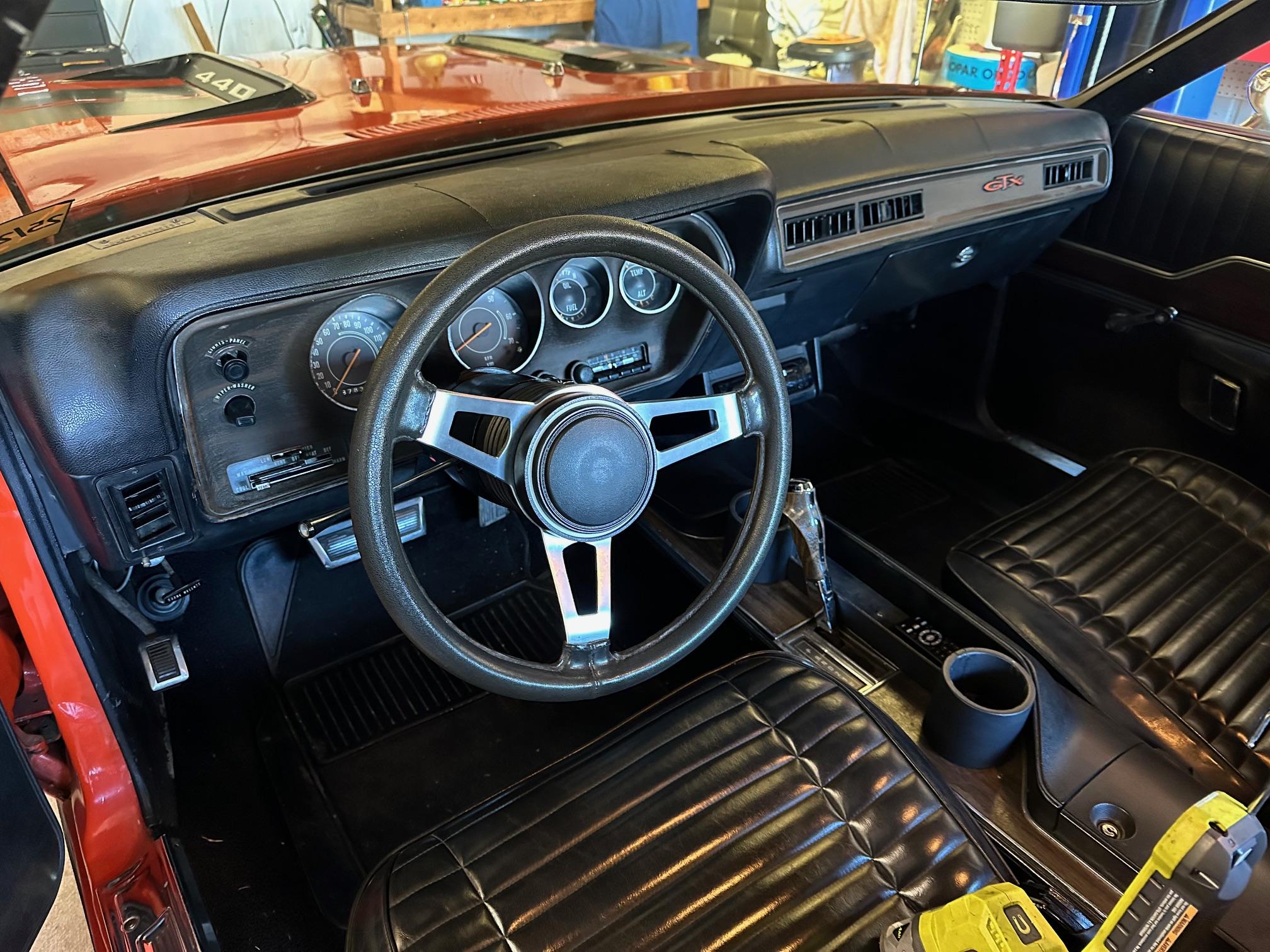 This 1971 Plymouth GTX is powered by a 440ci V8 paired with a three-speed automatic transmission and a limited-slip differential. It is finished in orange over a black interior and is equipped with black hood accents, hood pins, rear window louvers, and a rear wing. The car rides on 15″ Cragar Keystone Klassic wheels and has front disc brakes, power steering, and a dual exhaust system with Flowmaster mufflers. Inside, the seats are trimmed in black vinyl and accompanied by an aftermarket radio, air conditioning, a pistol-grip gear selector, and woodgrain trim.