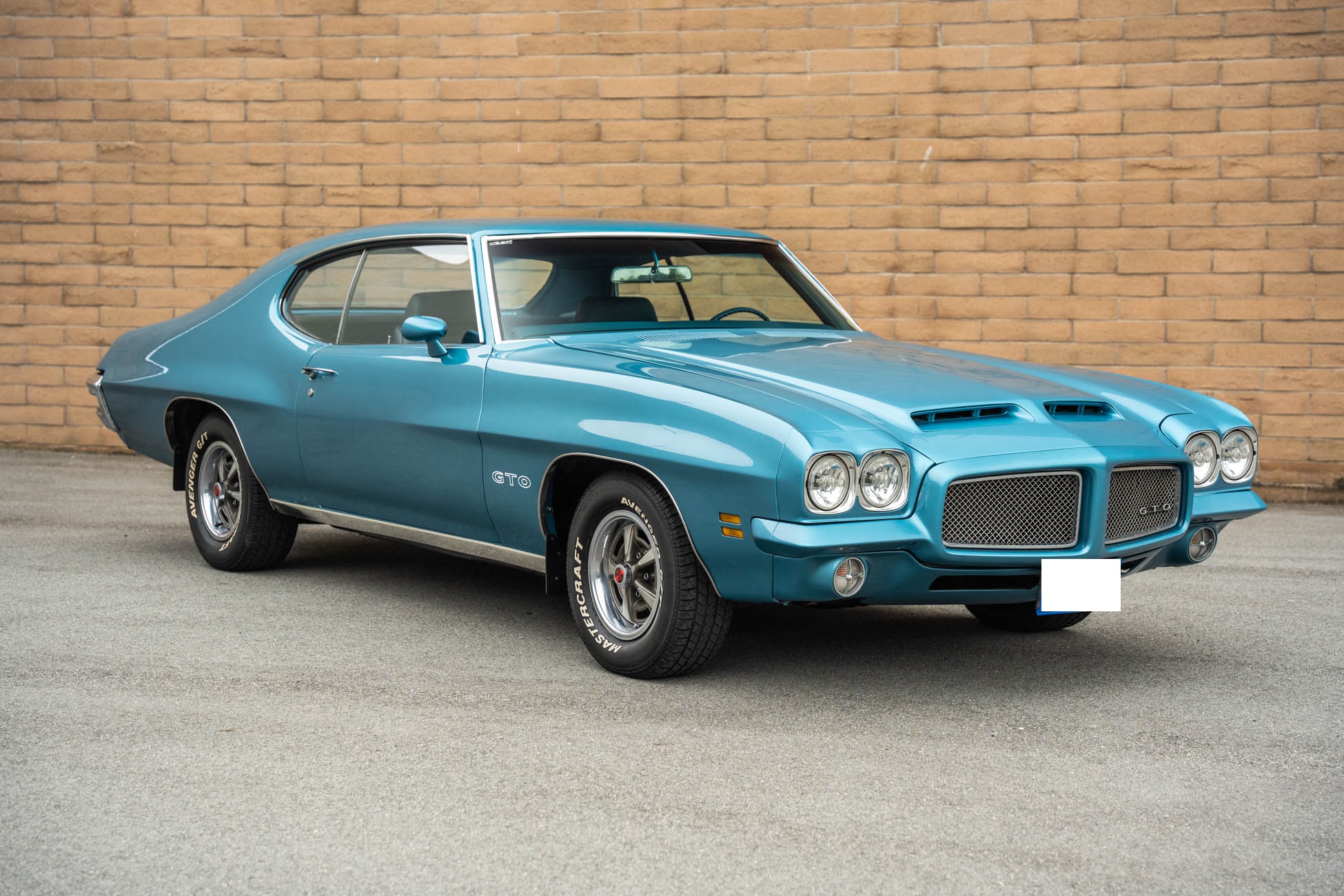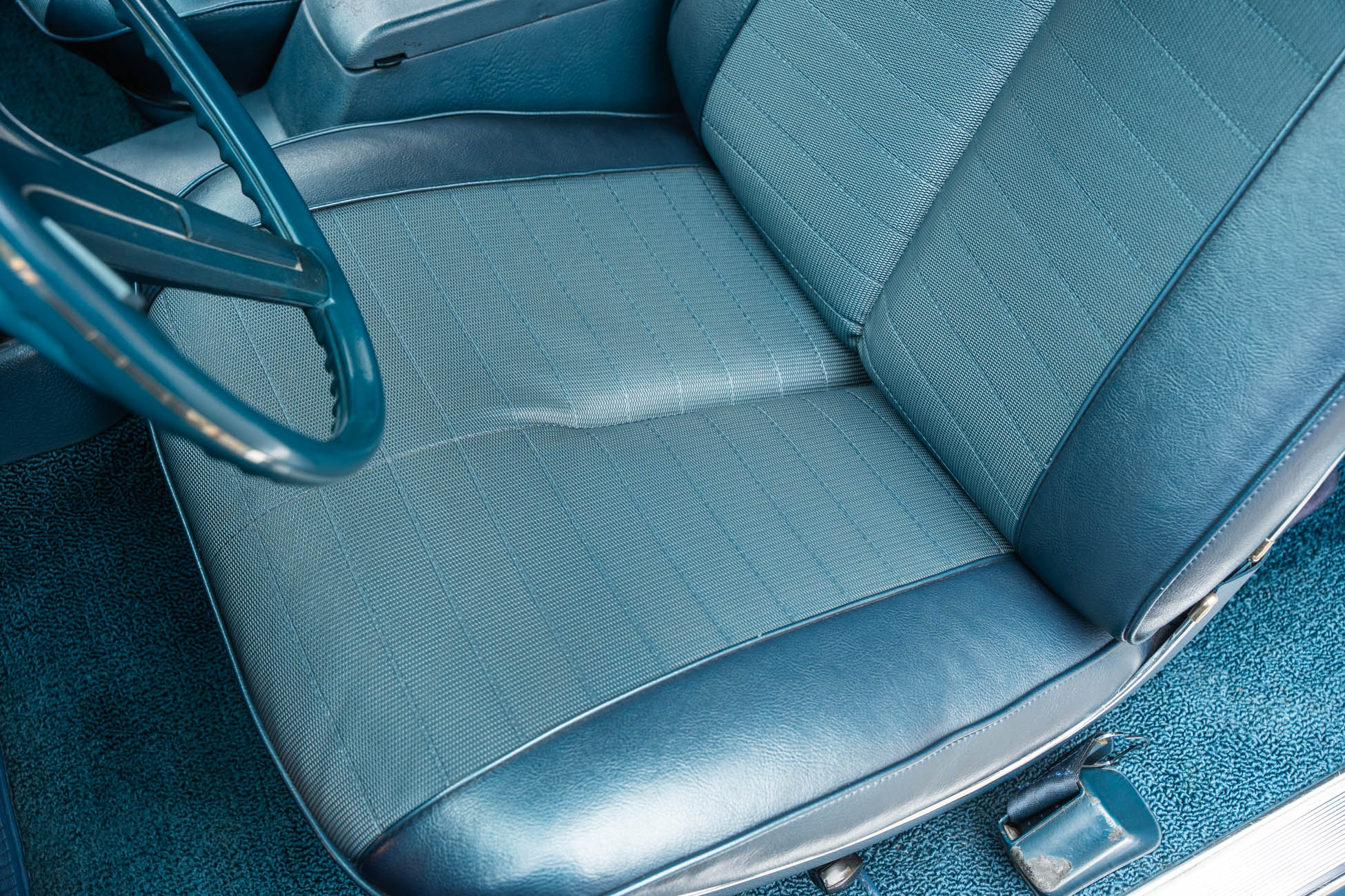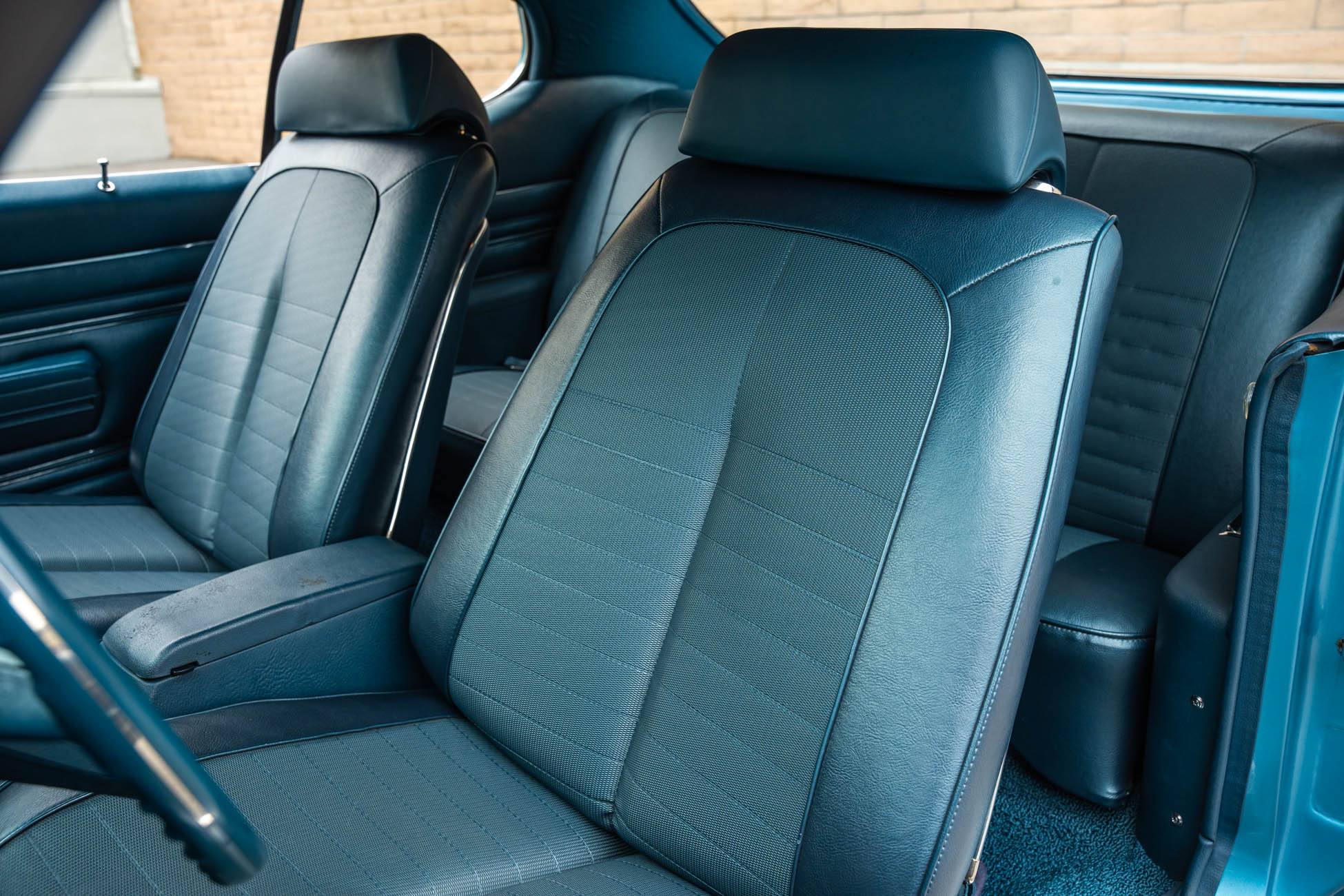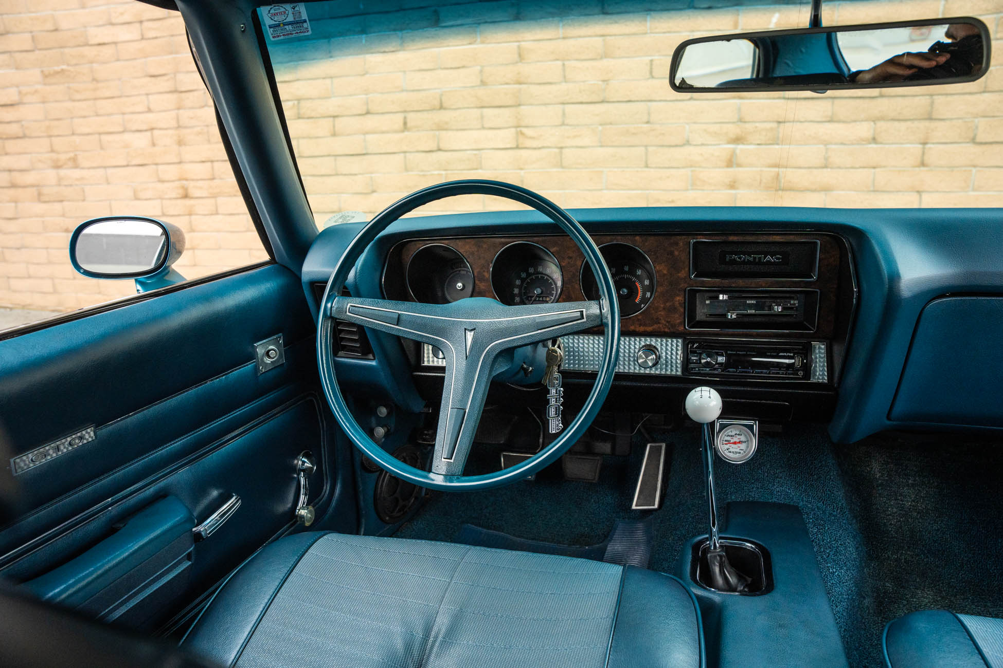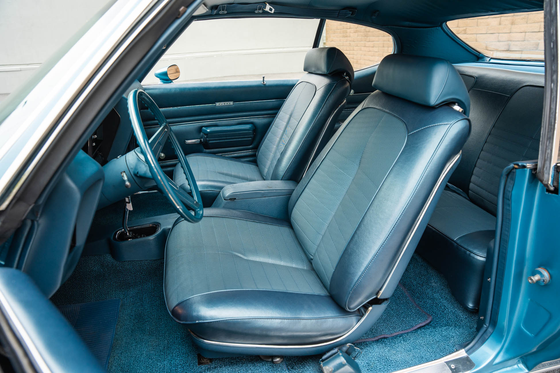 It is powered by a 400ci V8 mated to a Muncie four-speed manual transmission, both of which were overhauled during the refurbishment, and the exterior was repainted in Adriatic Blue. Equipment includes a body-color Endura front bumper, aftermarket headlights, a twin-scoop hood, an H-pipe exhaust system, 14″ Rally II wheels, power-assisted front disc brakes, power steering, a limited-slip differential, and a center console with a Hurst shifter. A high-performance audio system with an Alpine receiver, an amplifier, and a 10″ subwoofer was installed in 2020.