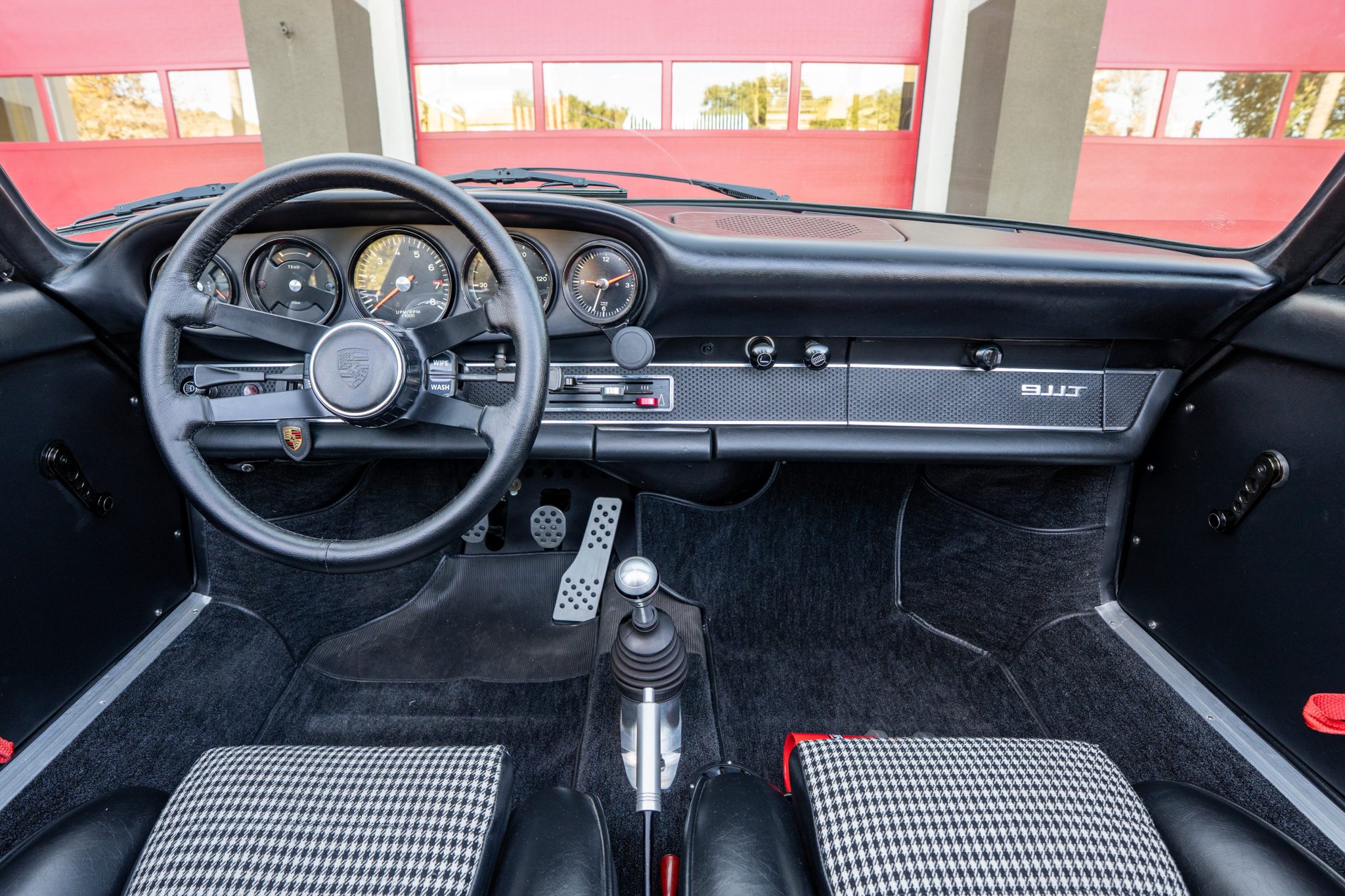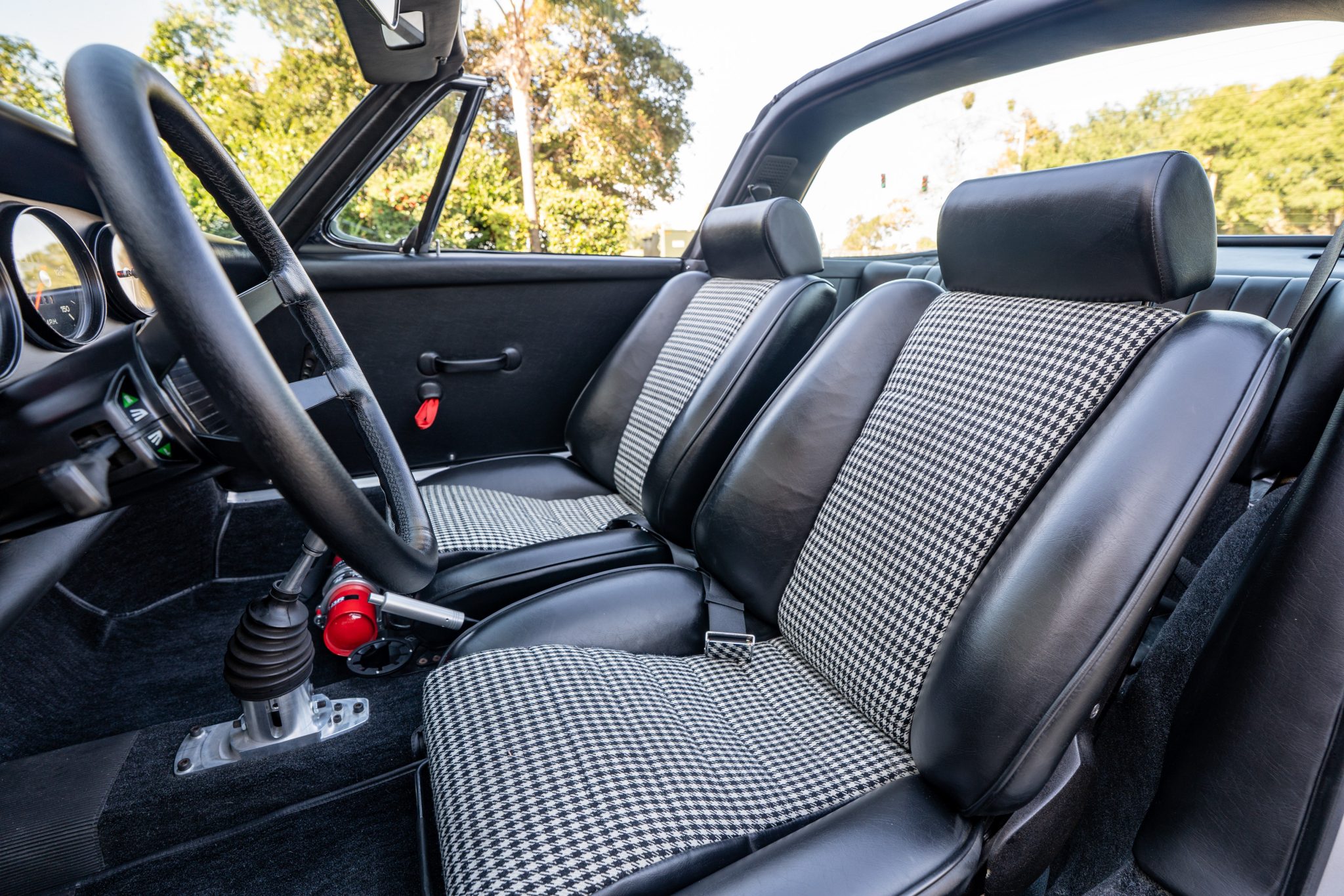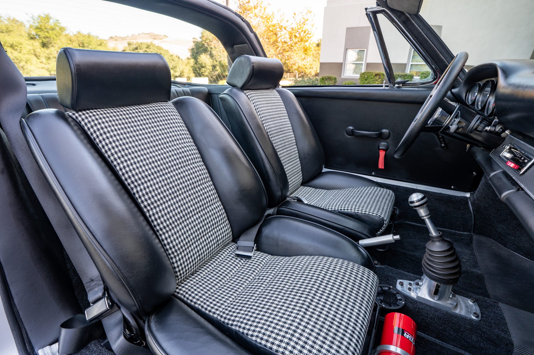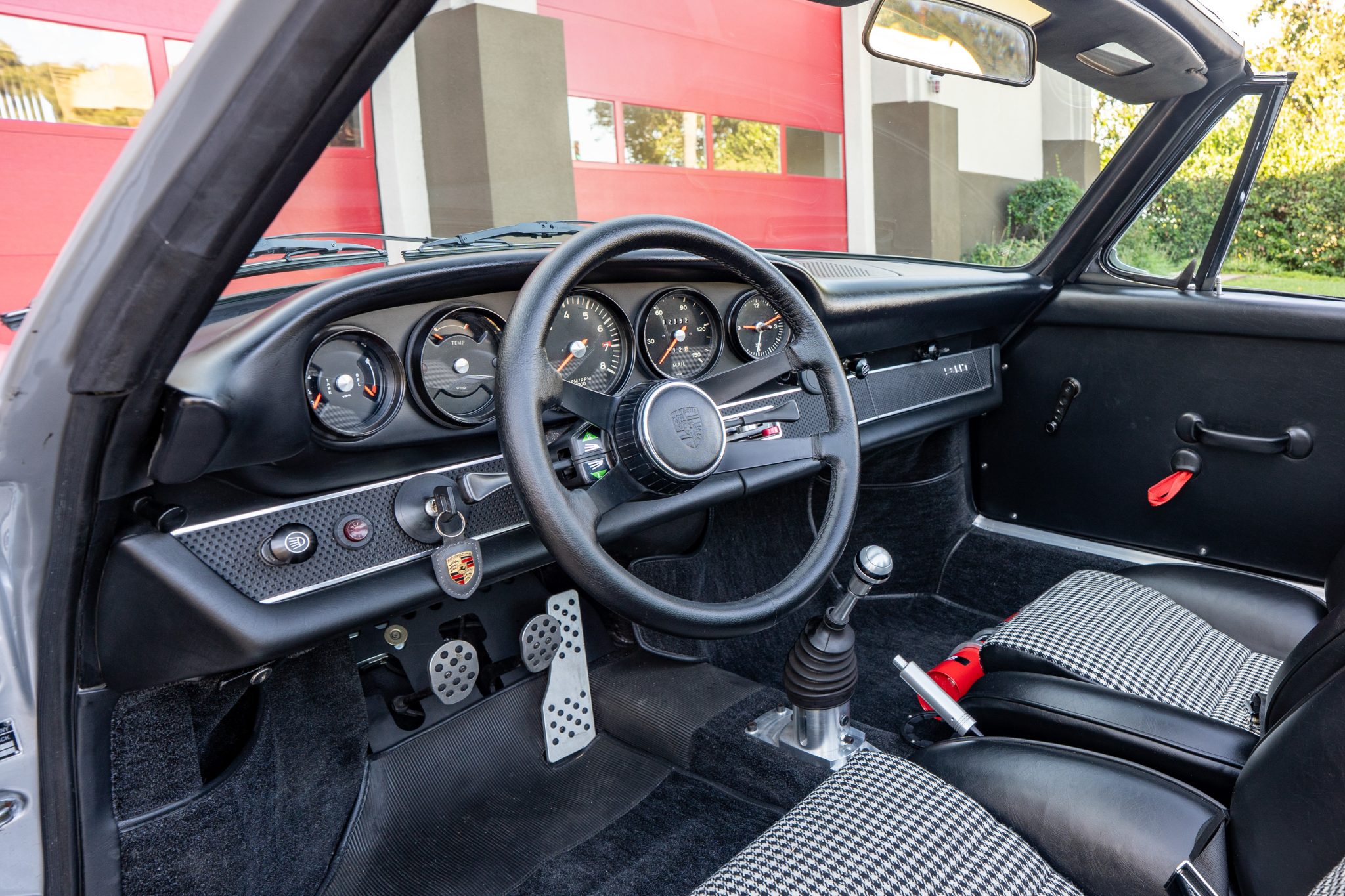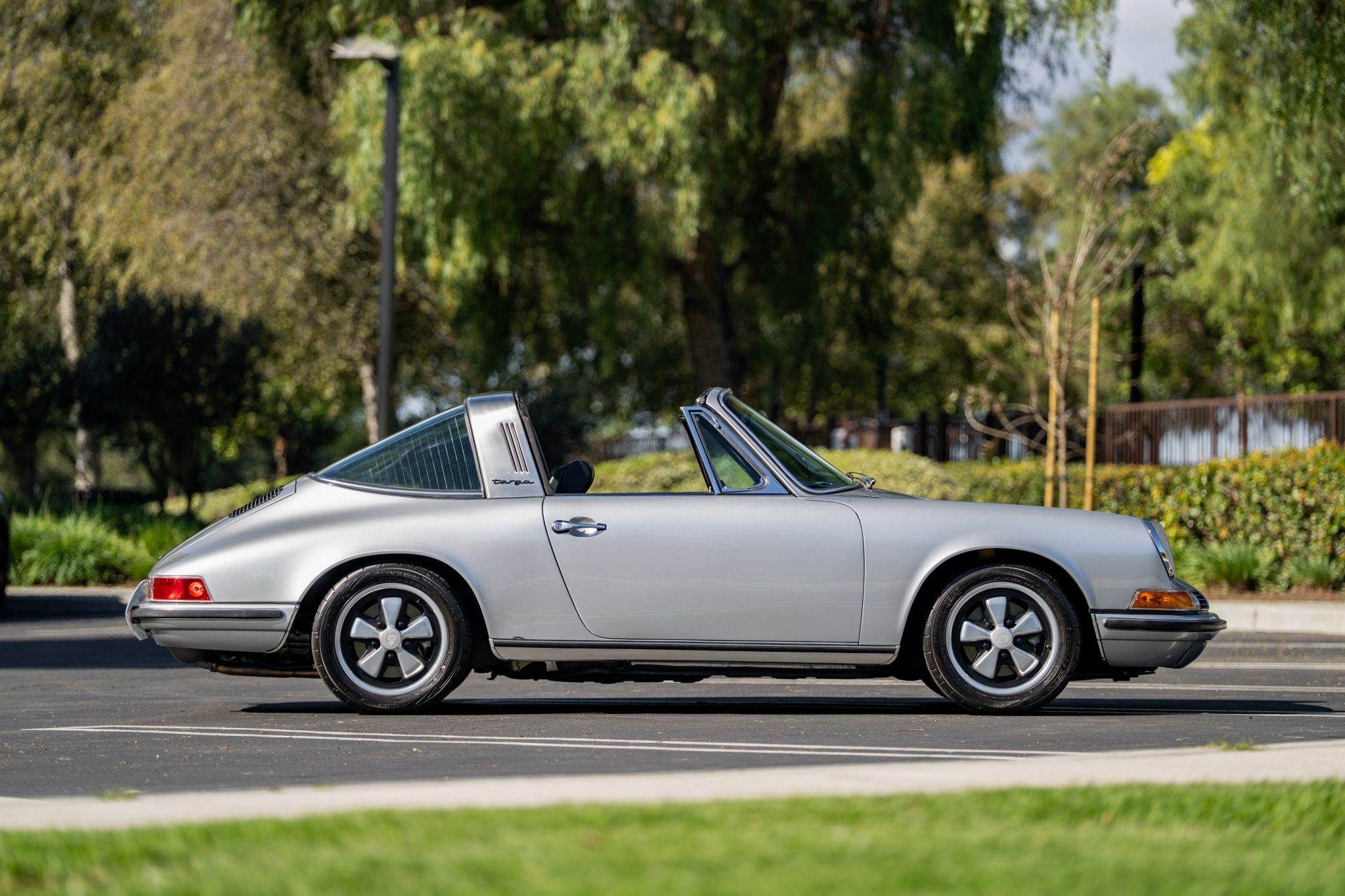 This 1971 Porsche 911T Targa was subsequently refurbished over the next eight years, including a repaint, a reupholstered interior, and the installation of a rebuilt five-speed manual transaxle. The flat-six was also overhauled and increased in displacement to 2.4-liters, and the car has been refinished in Silver Metallic over black leather and houndstooth cloth upholstery. Equipment includes a removable roof panel, a stainless-steel Targa bar, European-style headlights, 15″ Fuchs alloy wheels, RS-style door panels, a JWest Engineering shifter, and GTS Classics front bucket seats.