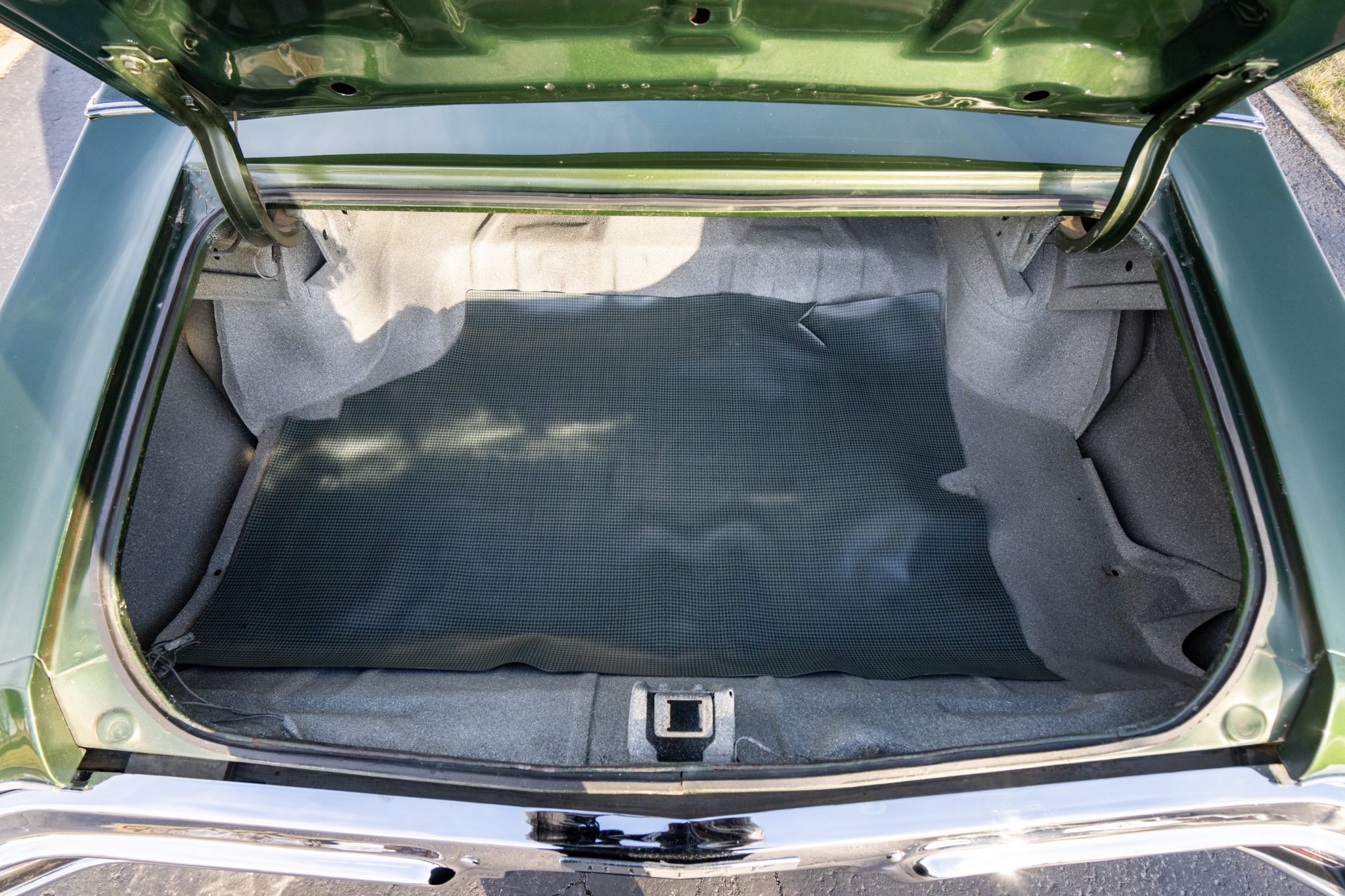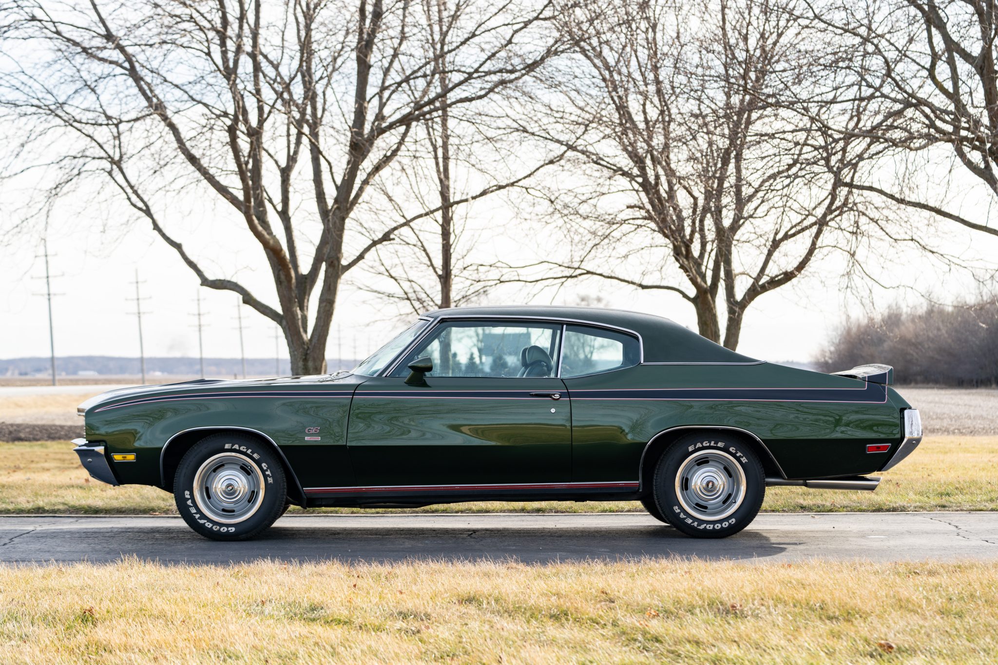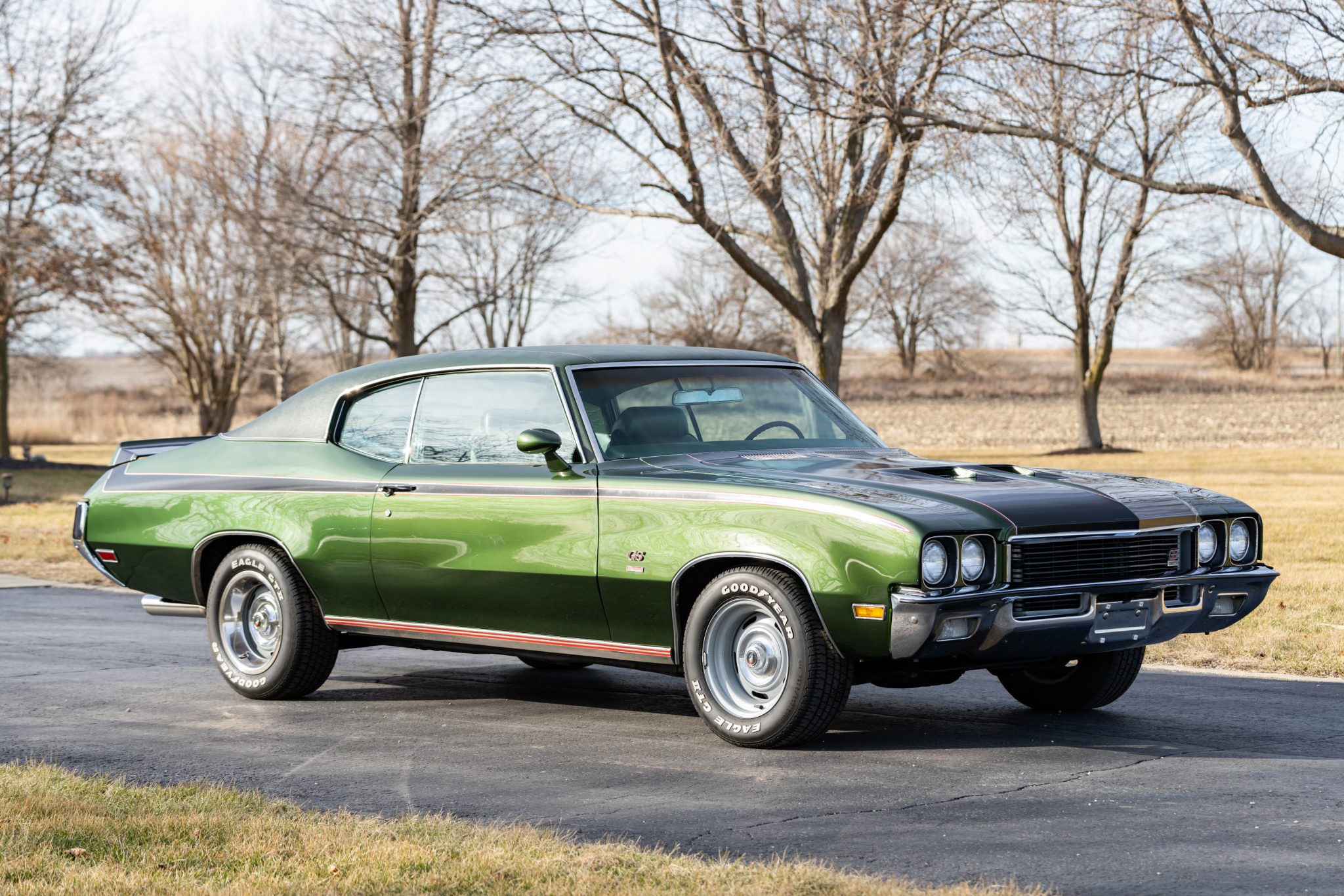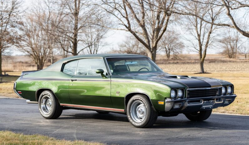 This 1972 Buick Skylark Custom coupe underwent a refurbishment that included refinishing the exterior in green with black stripes. Exterior details include a green vinyl roof cover, a rear spoiler, GS badging, and a twin-scoop hood, while the car rides on 15″ rally-style wheels that are mounted over power front disc and rear drum brakes. Power is provided by a replacement 455ci V8 mated to a three-speed automatic transmission, and the engine breathes through a four-barrel carburetor and an Edelbrock intake manifold.