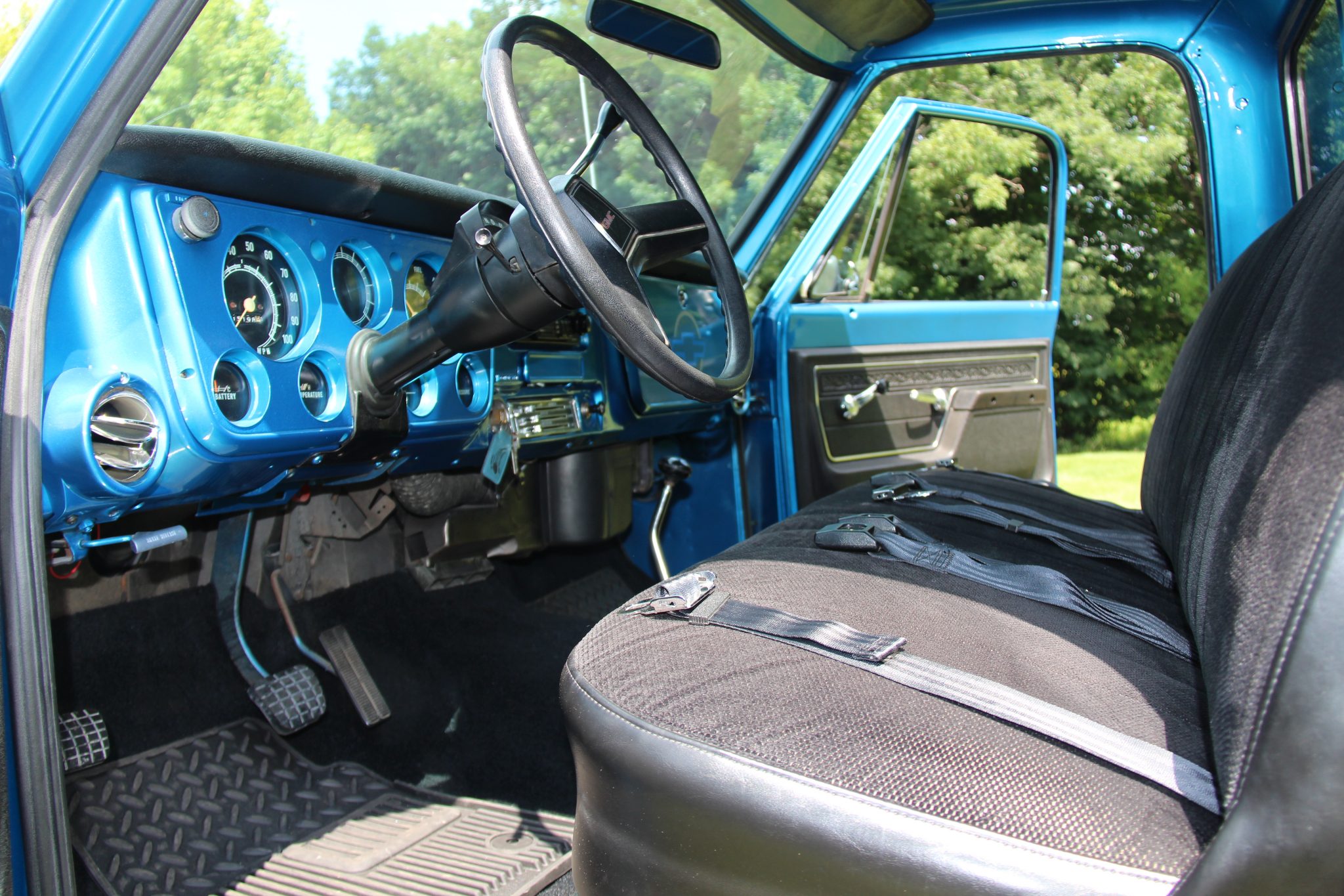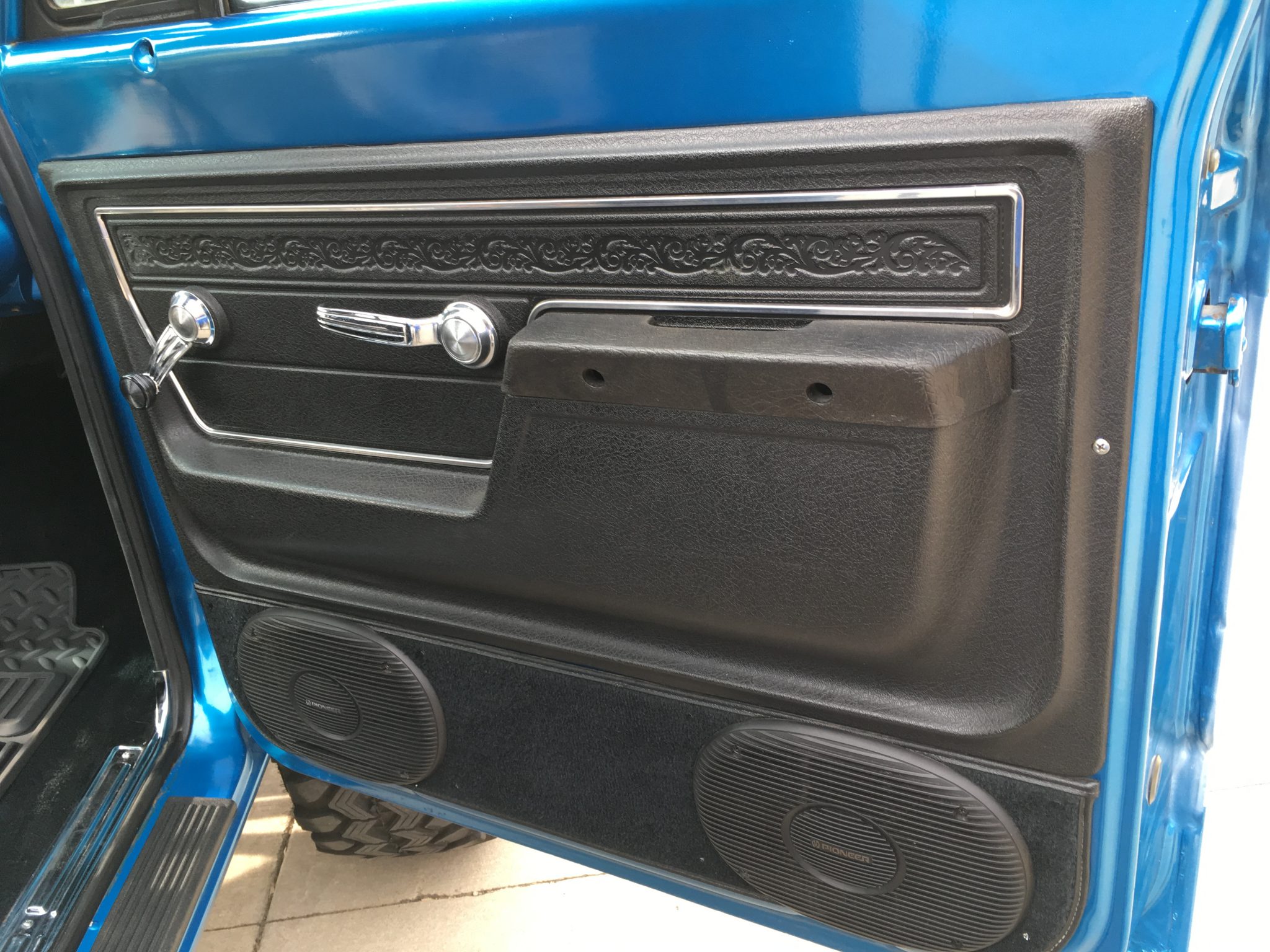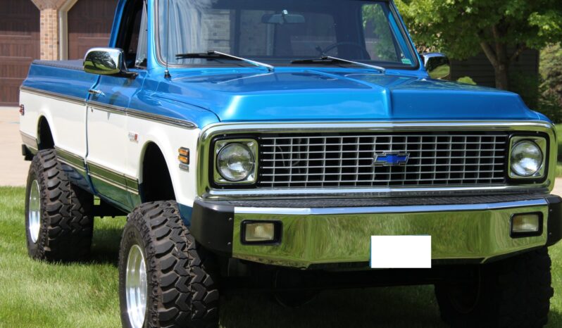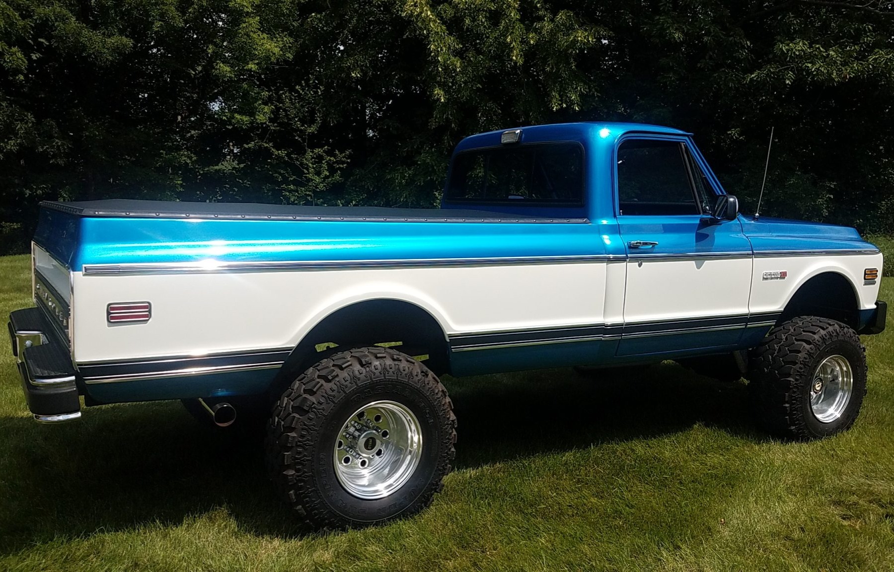 The truck is finished in metallic blue and white over black upholstery, and power is from a 350ci V8 linked to a TH350 automatic transmission and a dual-range transfer case. Additional equipment includes 16″ aluminum wheels with 35″ tires, four-wheel disc brakes, a suspension lift, a bed cover, an Edelbrock carburetor, a dual exhaust system, aftermarket bumpers, and a sliding rear window.