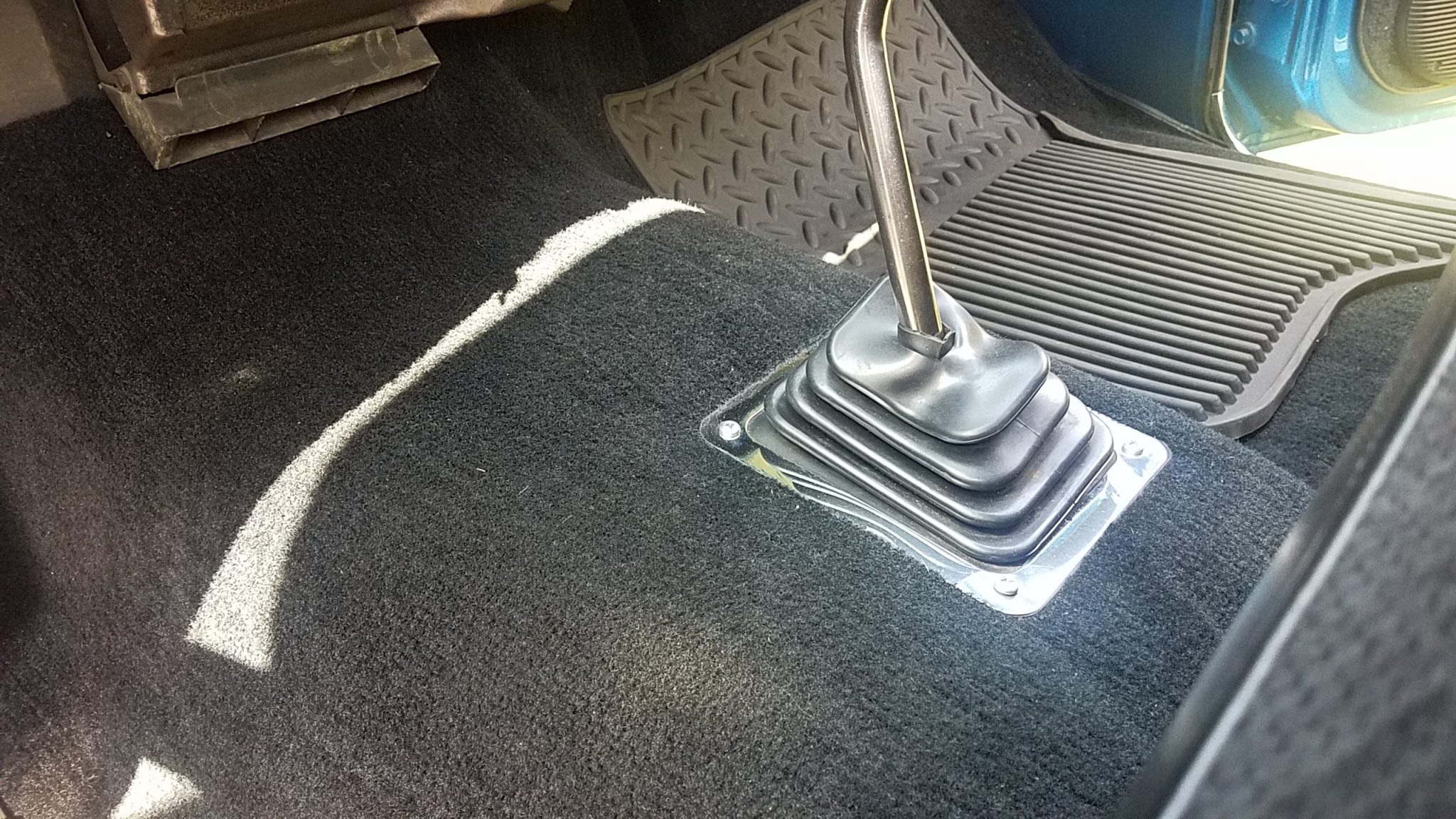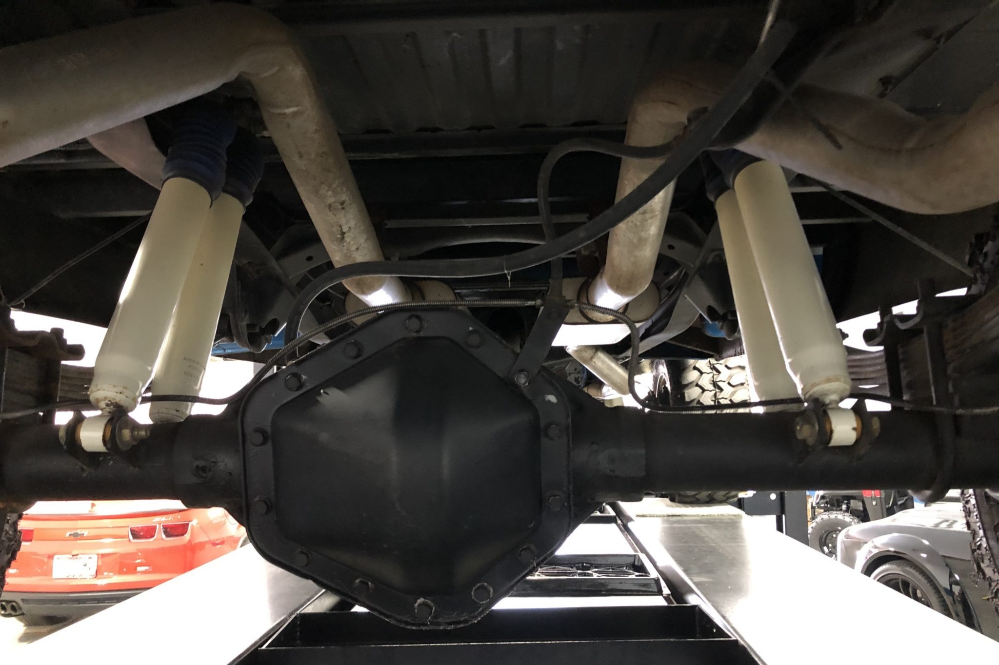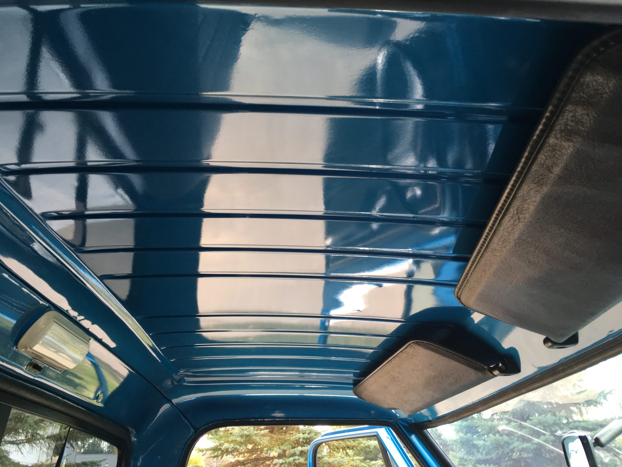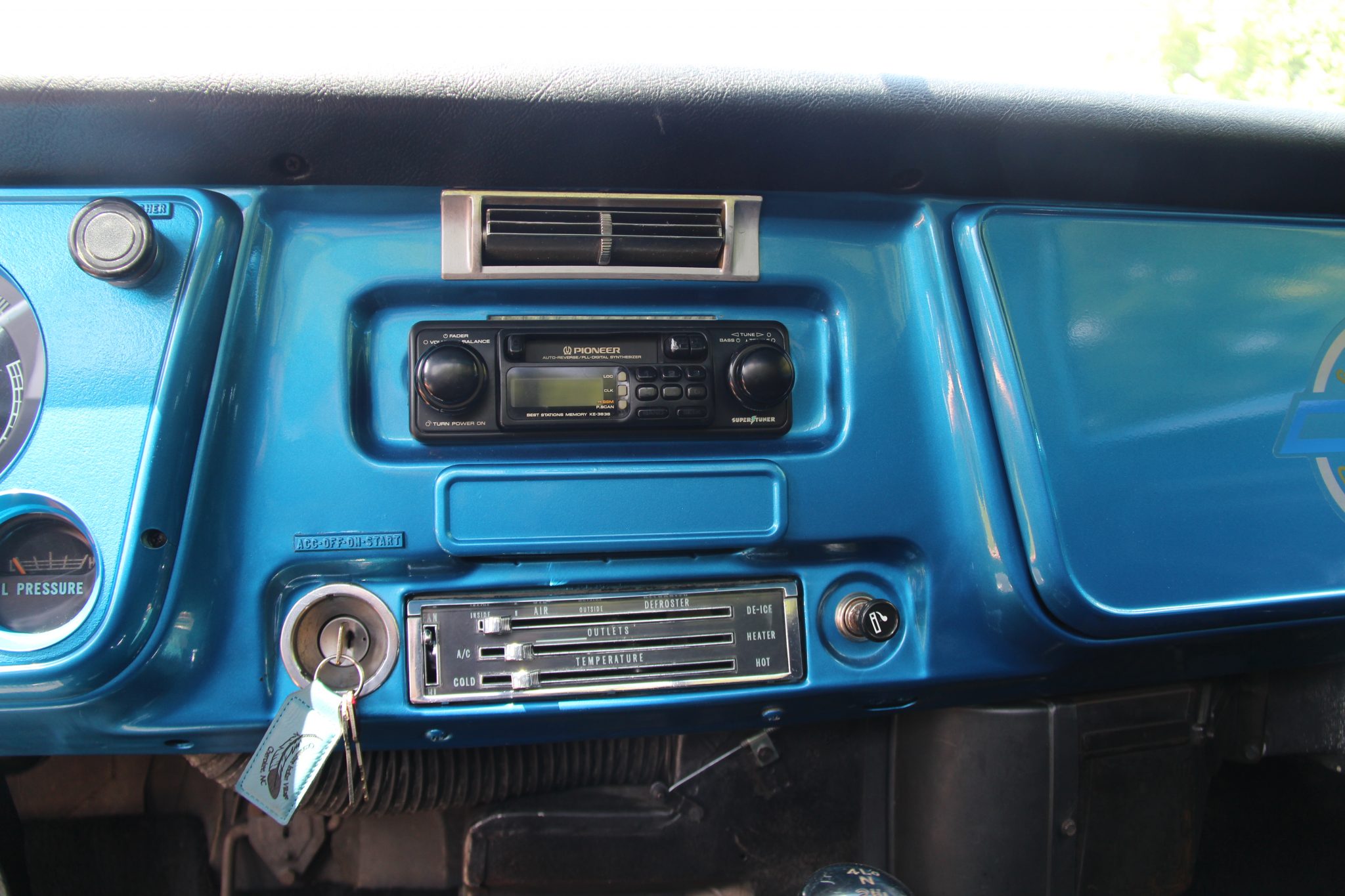 The truck is finished in metallic blue and white over black upholstery, and power is from a 350ci V8 linked to a TH350 automatic transmission and a dual-range transfer case. Additional equipment includes 16″ aluminum wheels with 35″ tires, four-wheel disc brakes, a suspension lift, a bed cover, an Edelbrock carburetor, a dual exhaust system, aftermarket bumpers, and a sliding rear window.