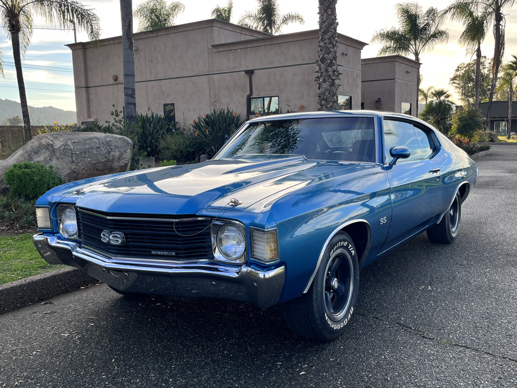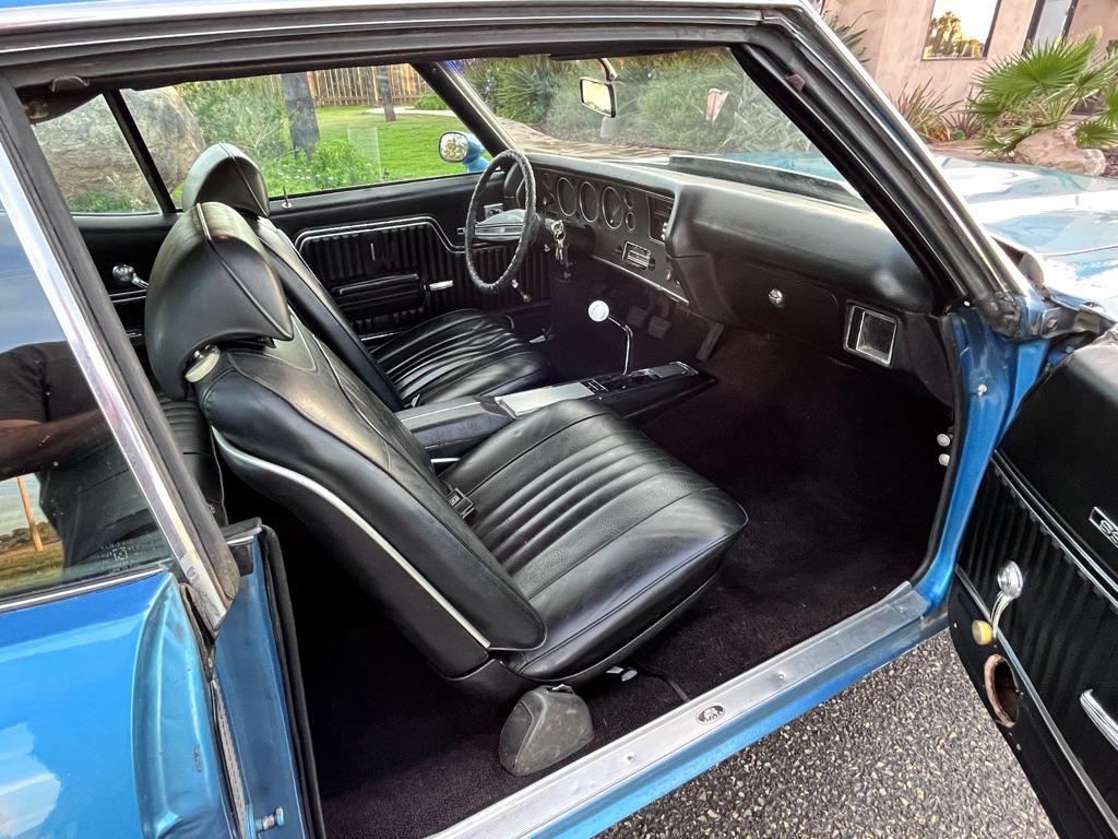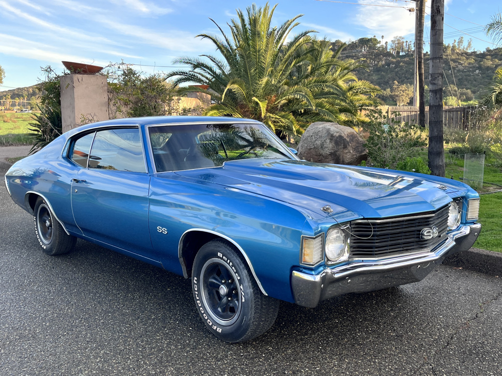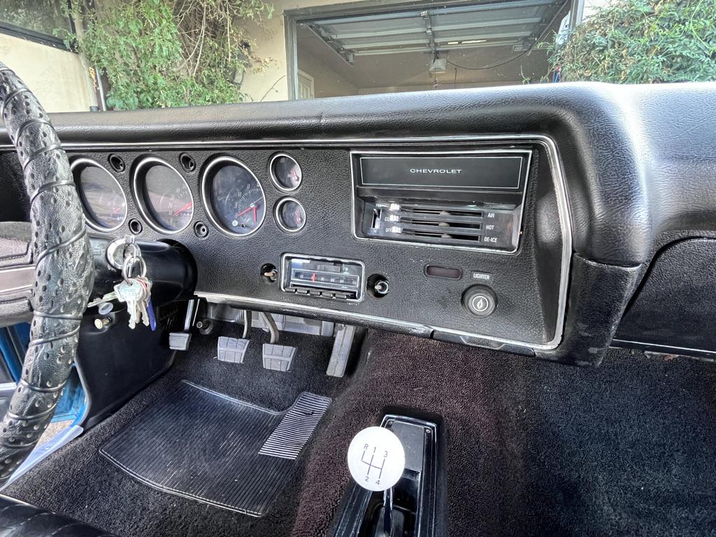 Powered by a 350ci V8 paired with a four-speed manual transmission 2025 involved rebuilding the transmission, overhauling the fuel and braking systems, servicing the cooling and ignition systems, repairing various switches, and replacing the accessory belts, starter, battery, and driveshaft U-joints. The blue-over-black vehicle is equipped with a Positraction rear differential, SS 15″ wheels, power-assisted front disc brakes, a domed hood, front bucket seats, a center console, a Hurst shifter, and an AM/FM radio. This Chevelle Super Sport is now offered with a build sheet, recent service records
