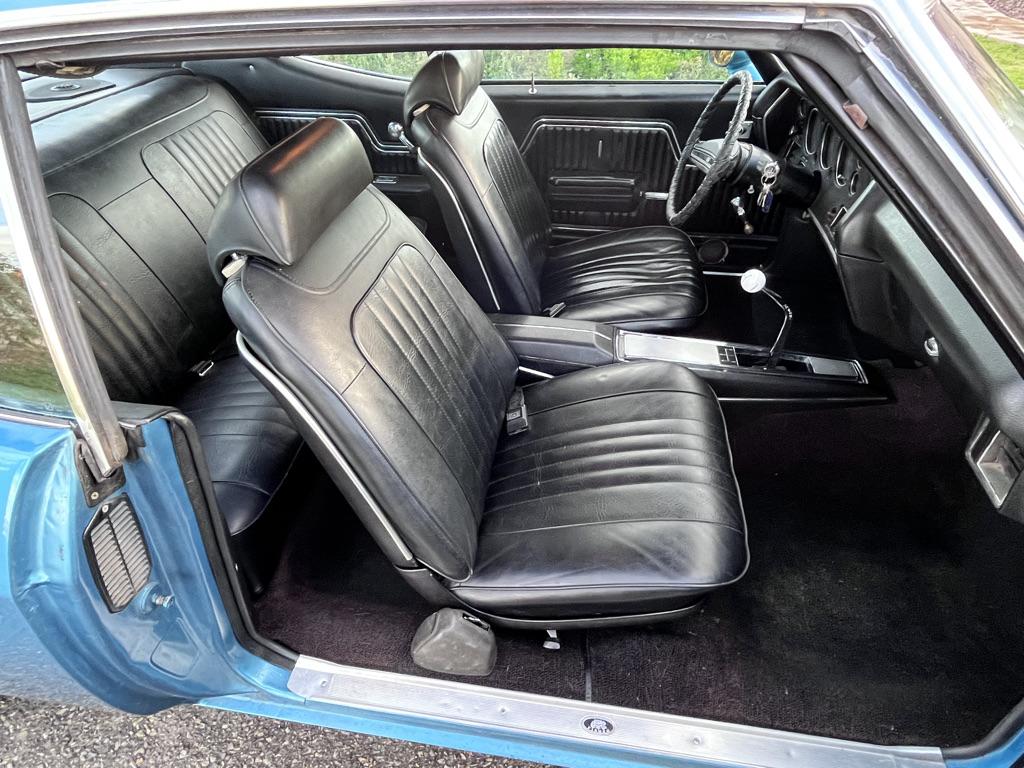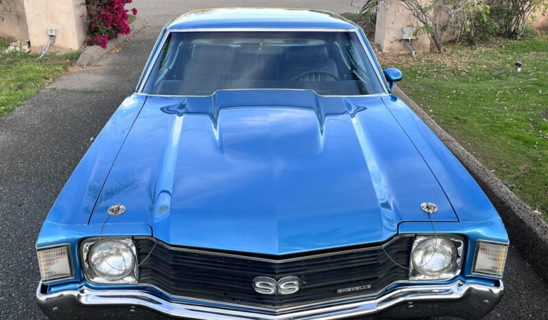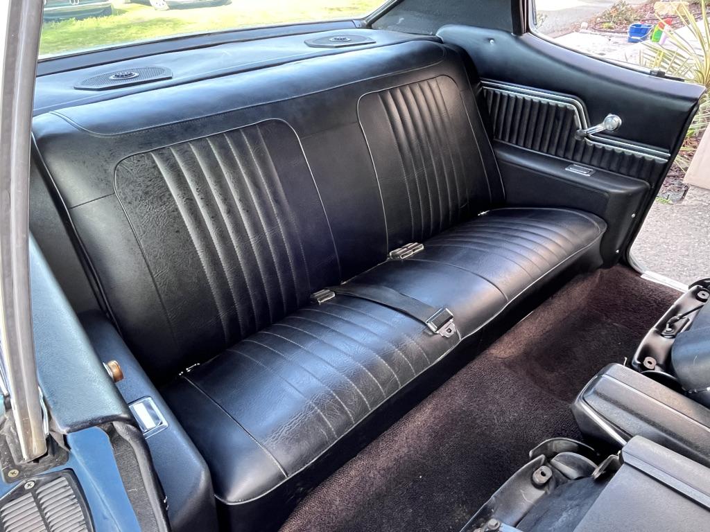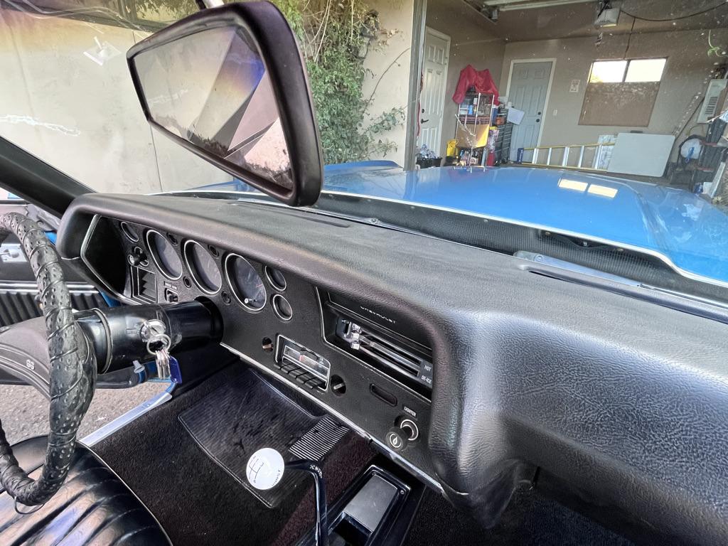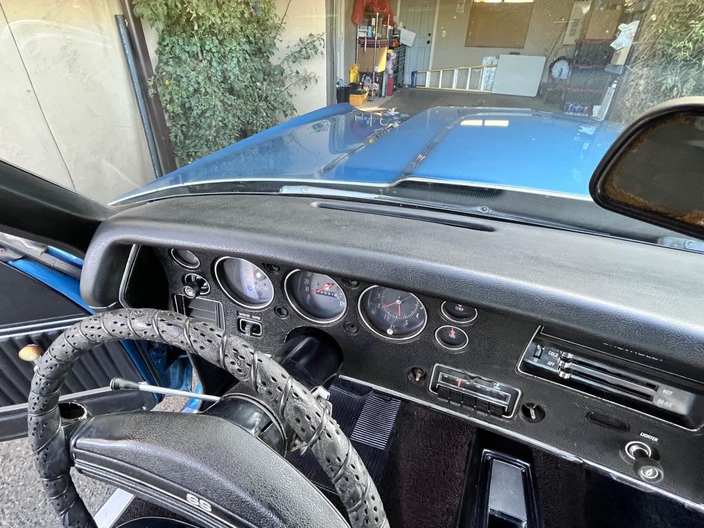 Powered by a 350ci V8 paired with a four-speed manual transmission 2025 involved rebuilding the transmission, overhauling the fuel and braking systems, servicing the cooling and ignition systems, repairing various switches, and replacing the accessory belts, starter, battery, and driveshaft U-joints. The blue-over-black vehicle is equipped with a Positraction rear differential, SS 15″ wheels, power-assisted front disc brakes, a domed hood, front bucket seats, a center console, a Hurst shifter, and an AM/FM radio. This Chevelle Super Sport is now offered with a build sheet, recent service records
