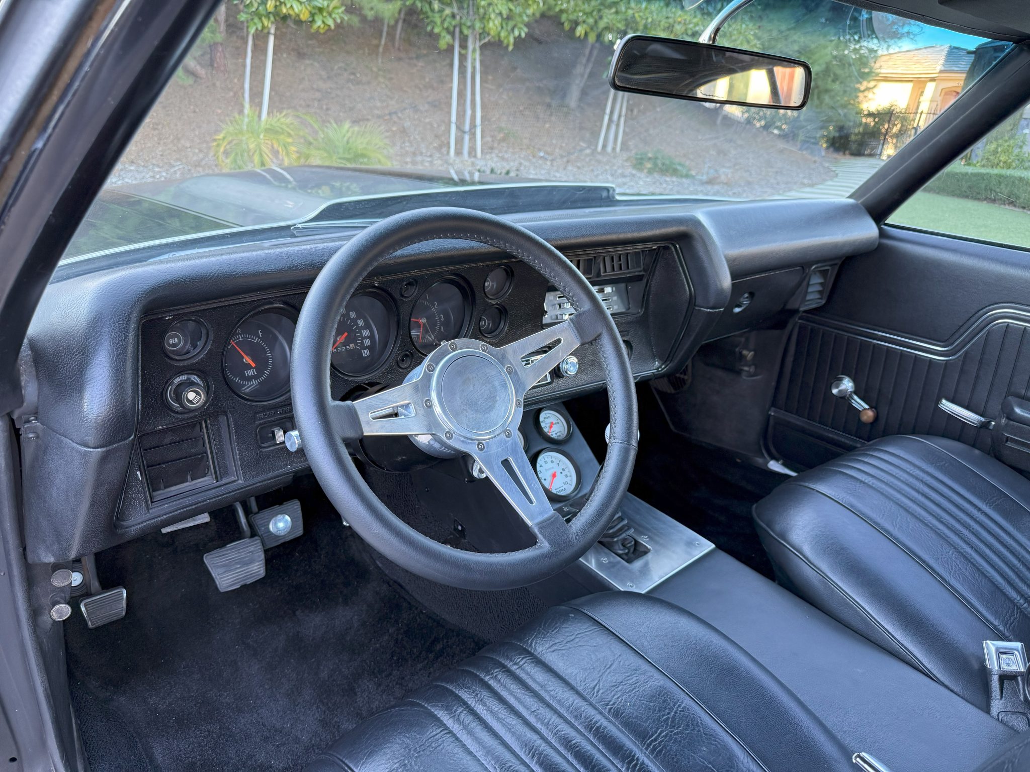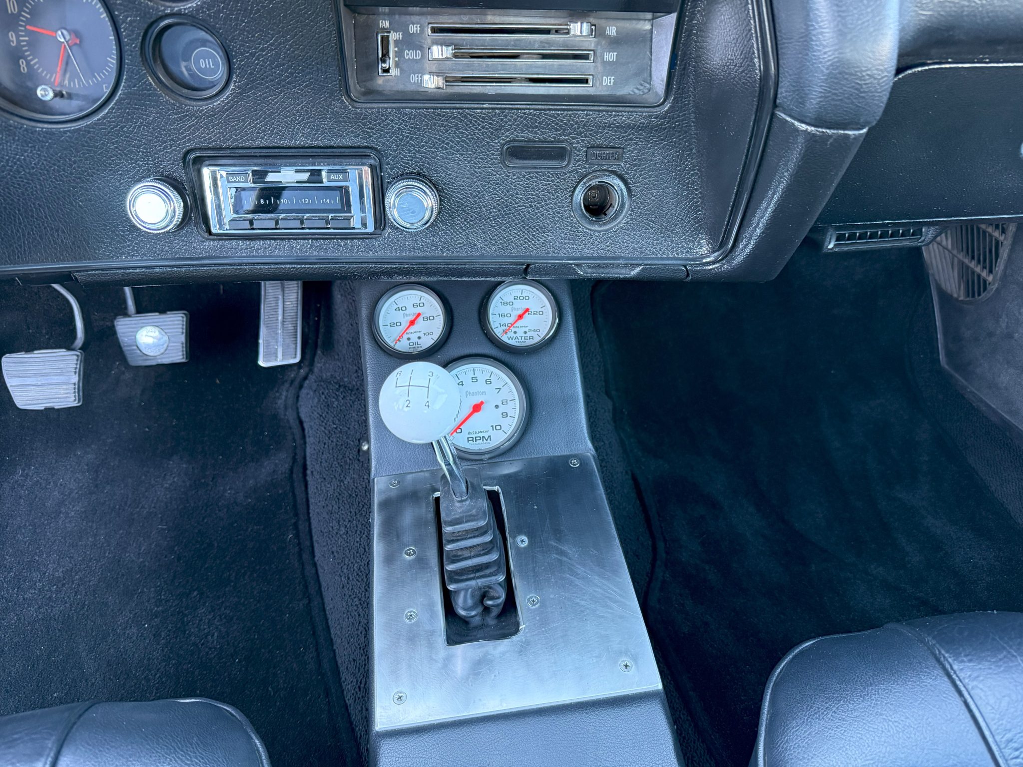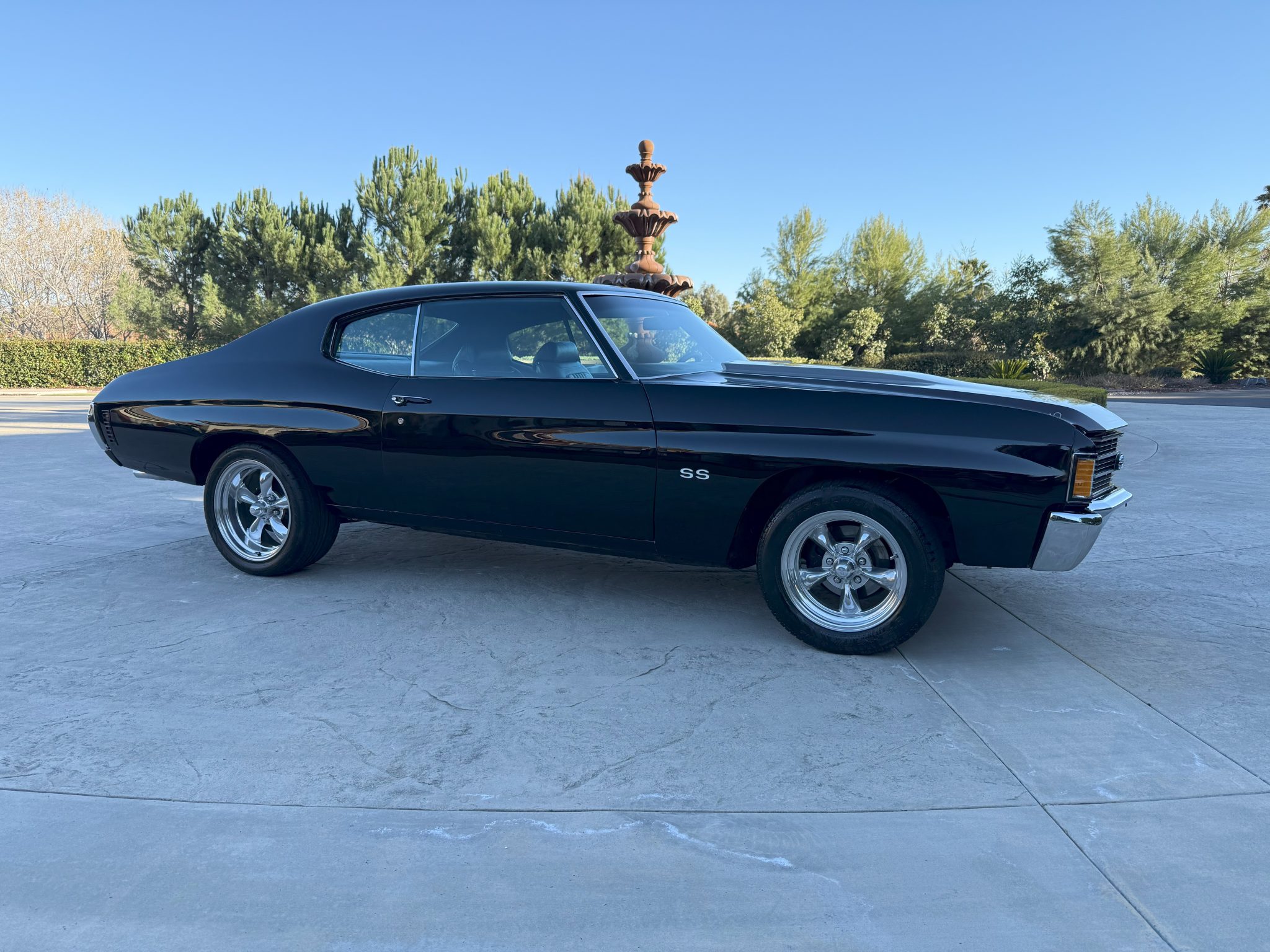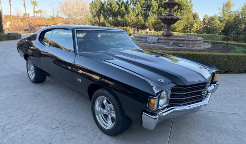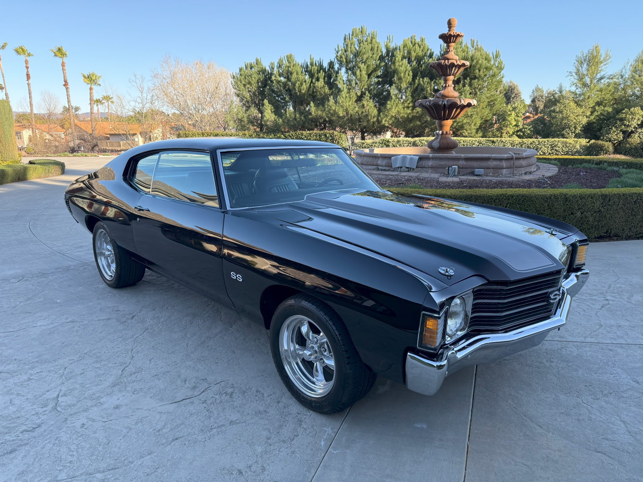 This 1972 Chevrolet Chevelle sport coupe was refurbished  with work that included repainting the body in black with metallic gray stripes as well as re-trimming the interior in black vinyl. Power is provided by a replacement 350ci V8 equipped with an Edelbrock intake manifold, a Holley four-barrel carburetor, an HEI distributor, and coated exhaust headers connected to Flowmaster mufflers. A four-speed manual transmission is linked to a 10-bolt rear end with a 3.73:1 limited-slip differential.