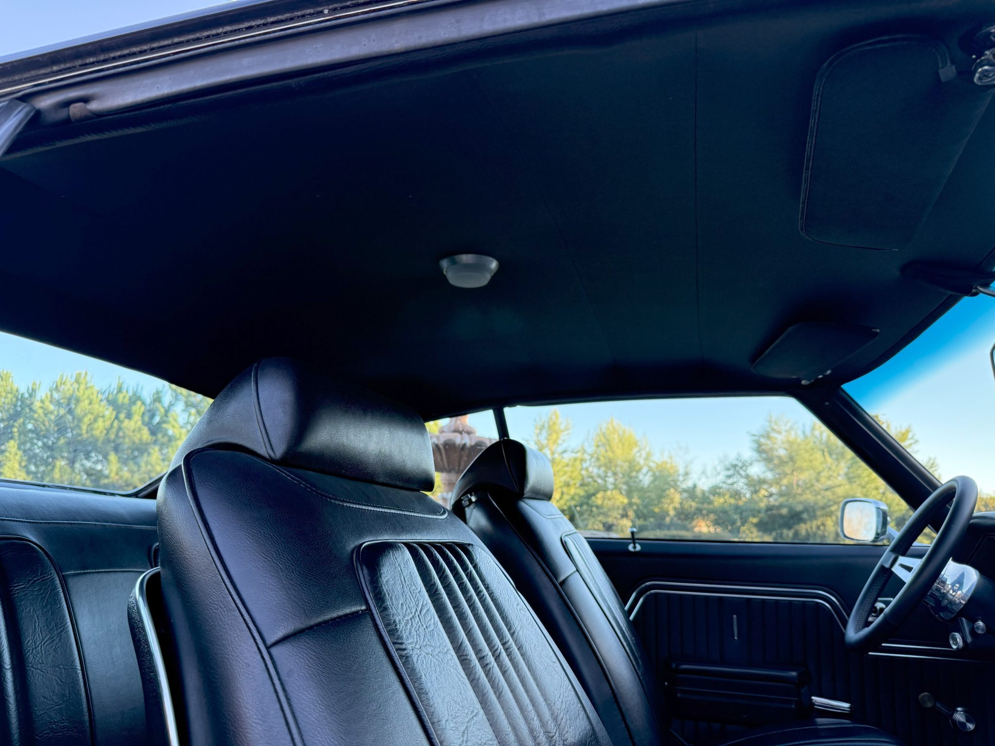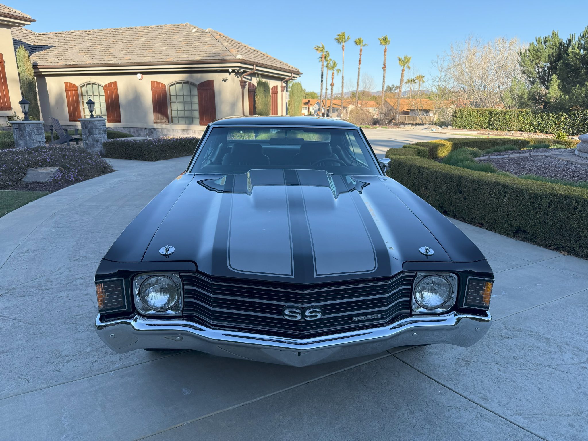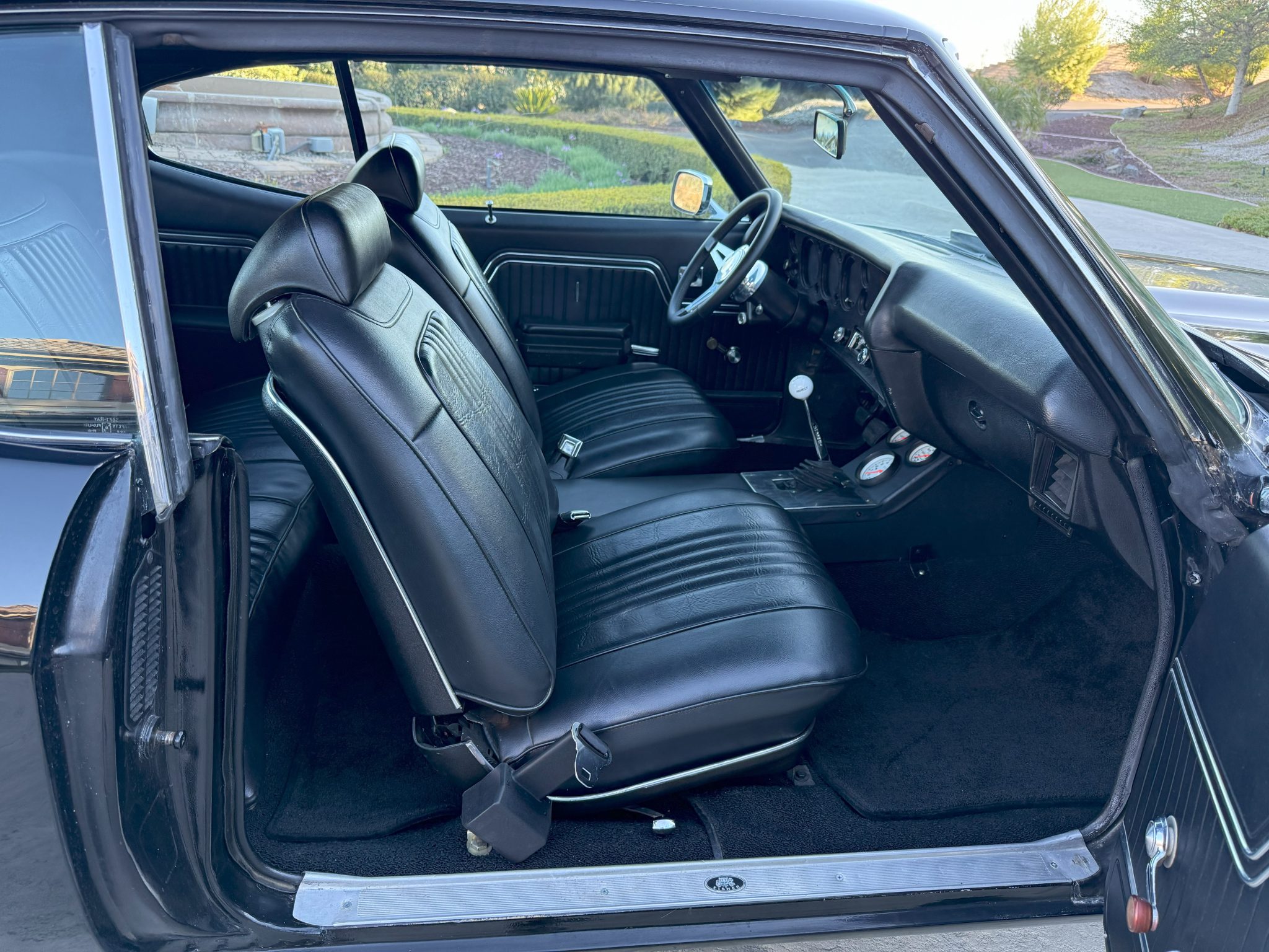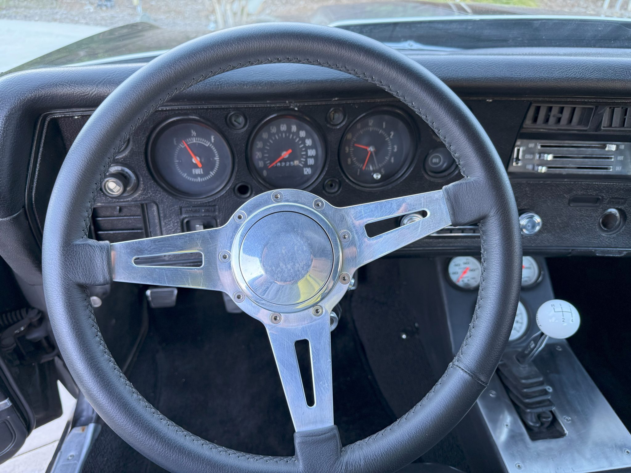 This 1972 Chevrolet Chevelle sport coupe was refurbished  with work that included repainting the body in black with metallic gray stripes as well as re-trimming the interior in black vinyl. Power is provided by a replacement 350ci V8 equipped with an Edelbrock intake manifold, a Holley four-barrel carburetor, an HEI distributor, and coated exhaust headers connected to Flowmaster mufflers. A four-speed manual transmission is linked to a 10-bolt rear end with a 3.73:1 limited-slip differential.