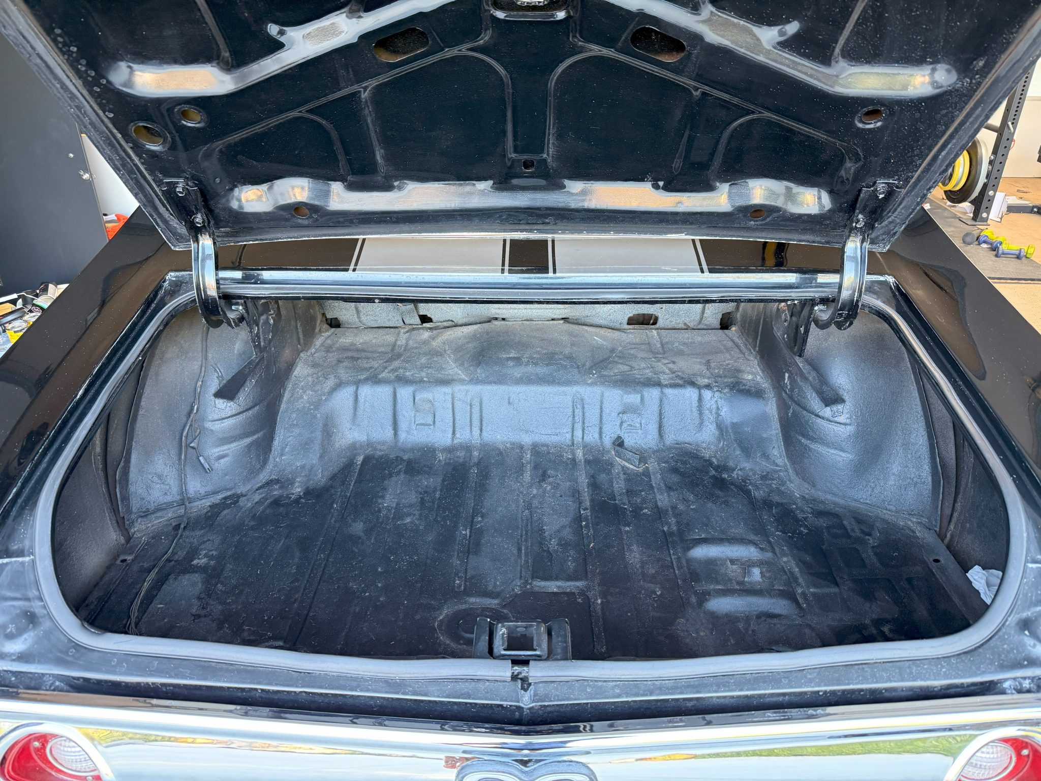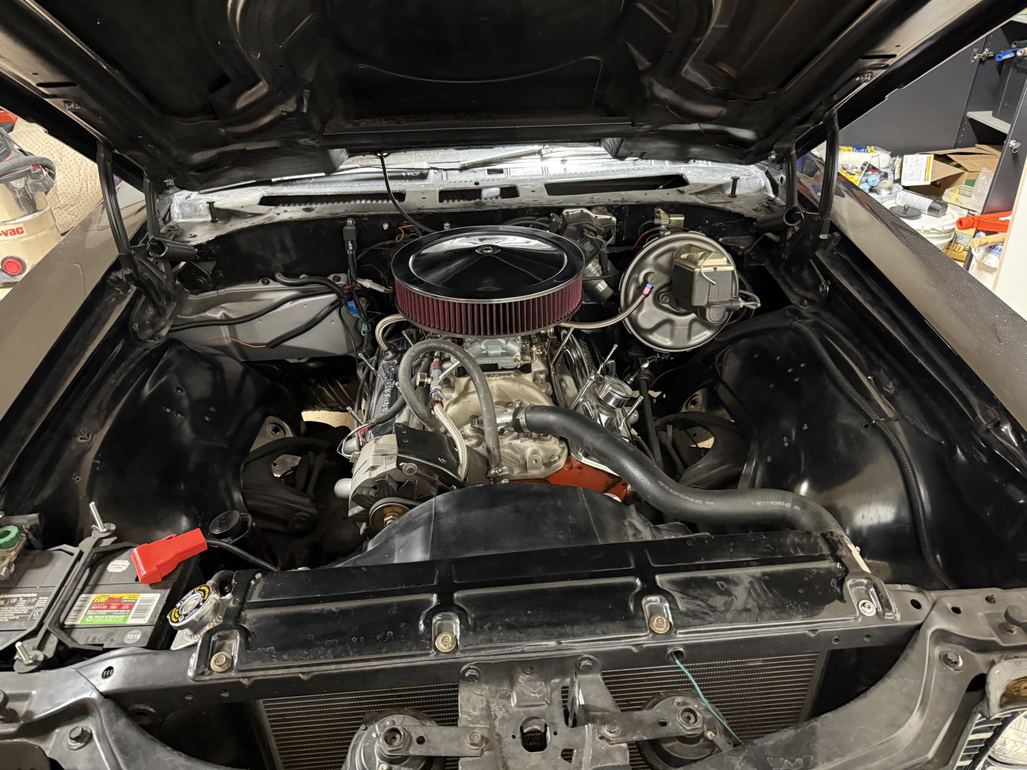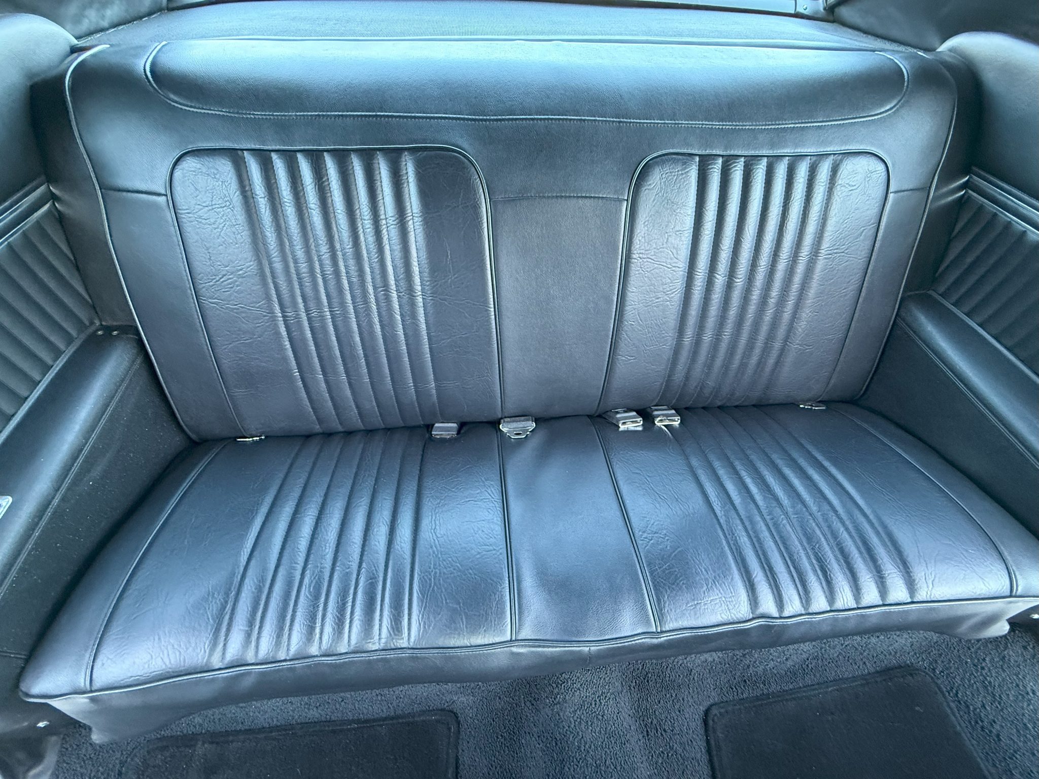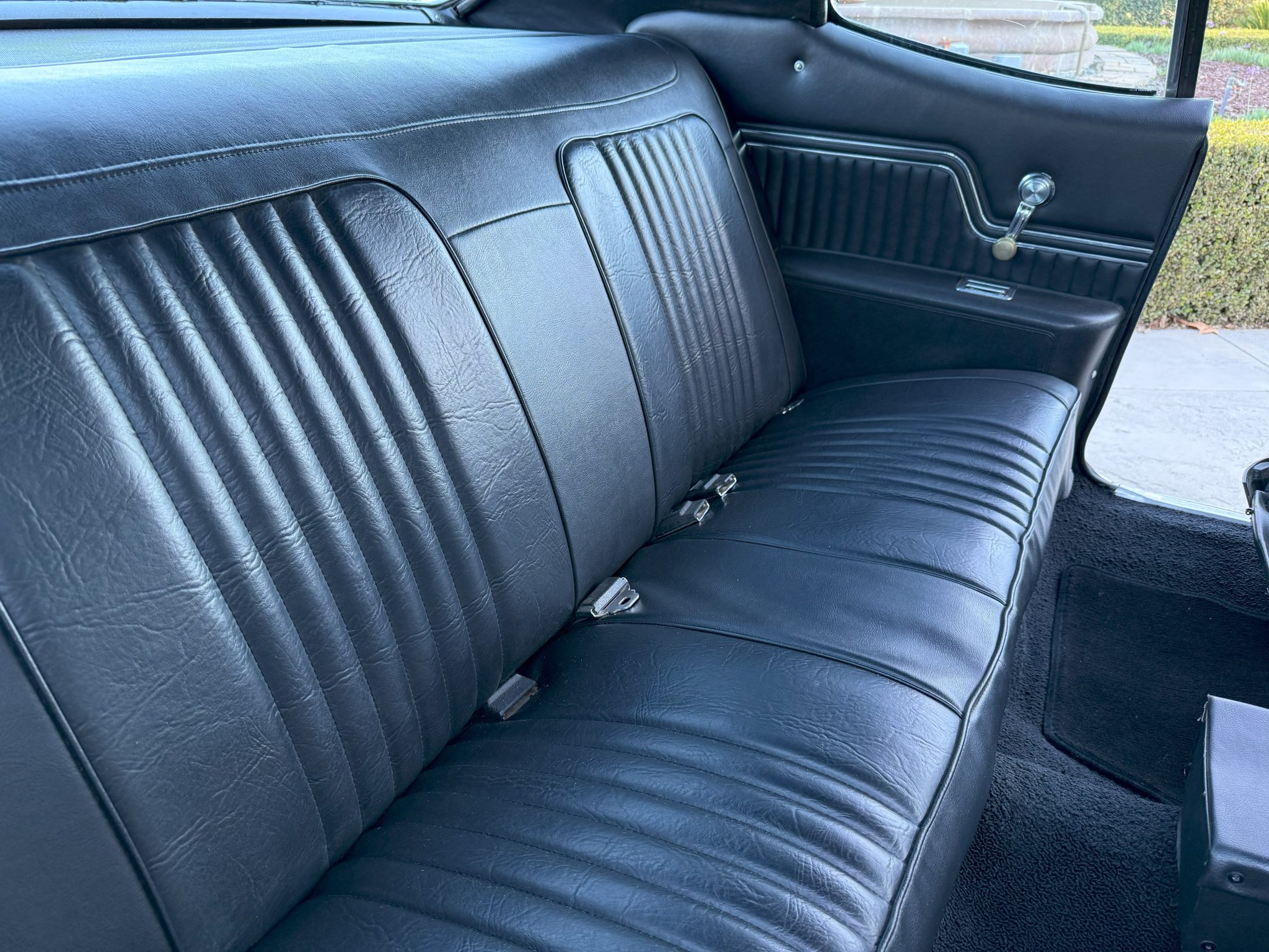 This 1972 Chevrolet Chevelle sport coupe was refurbished  with work that included repainting the body in black with metallic gray stripes as well as re-trimming the interior in black vinyl. Power is provided by a replacement 350ci V8 equipped with an Edelbrock intake manifold, a Holley four-barrel carburetor, an HEI distributor, and coated exhaust headers connected to Flowmaster mufflers. A four-speed manual transmission is linked to a 10-bolt rear end with a 3.73:1 limited-slip differential.