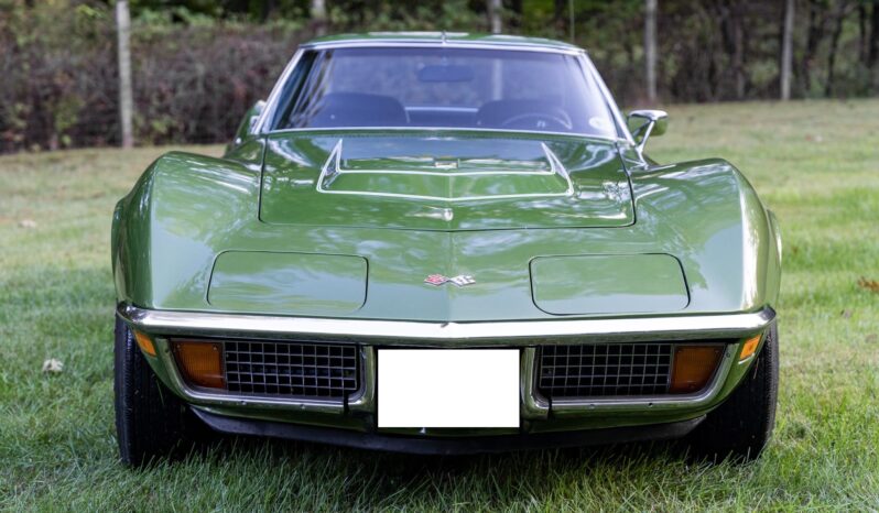 Work during the refurbishment involved removing the body from the frame and repainting the frame, overhauling the 350ci LT-1 V8, reupholstering the interior in black vinyl, and repainting and refurbishing various components. The car is finished in Elkhart Green, and equipment includes a Positraction limited-slip differential, a four-speed manual transmission, 4.11:1 gears, removable roof panels, 15″ Rally wheels, disc brakes, retractable headlights, a cabin heater, and an AM/FM stereo