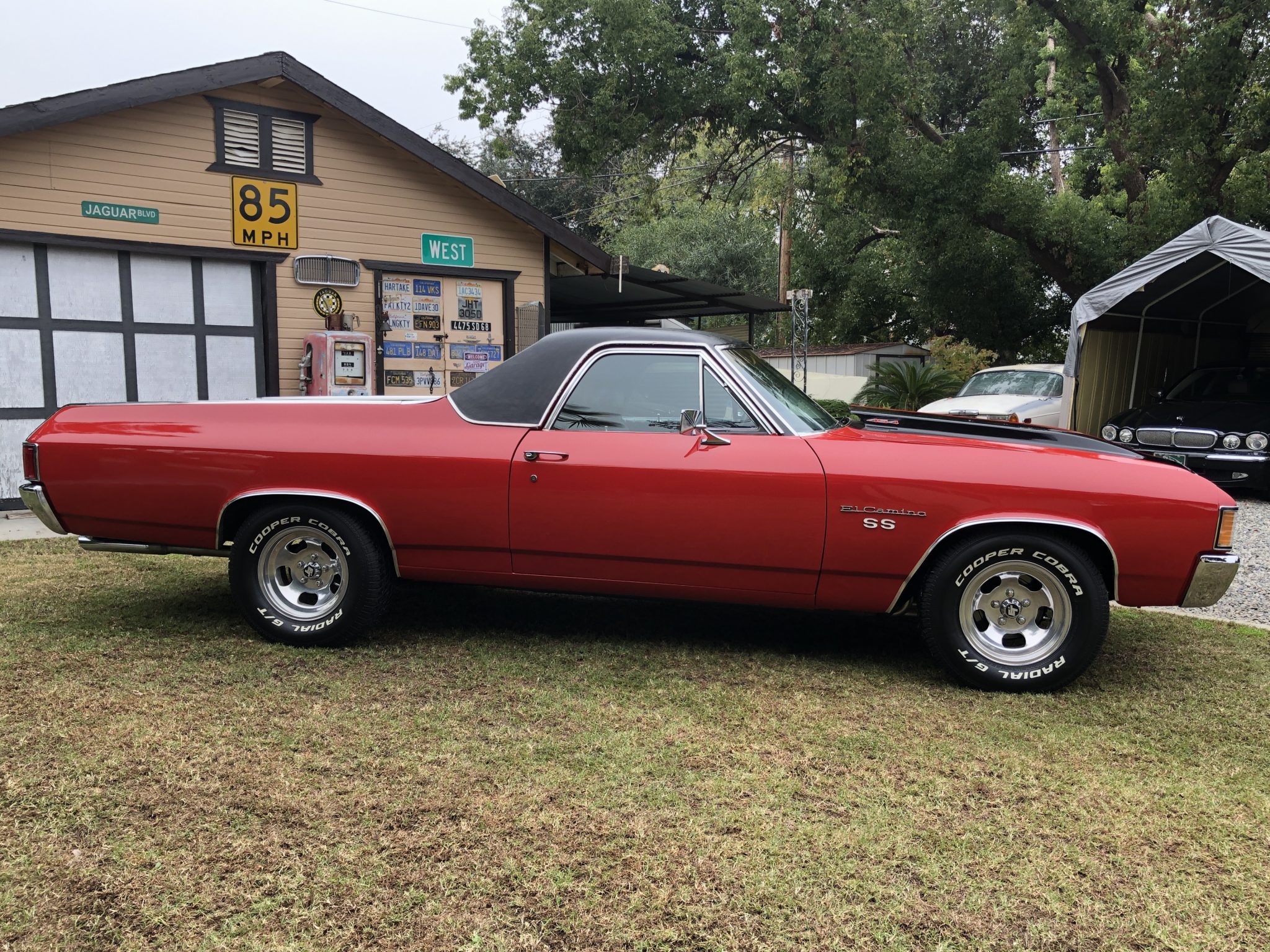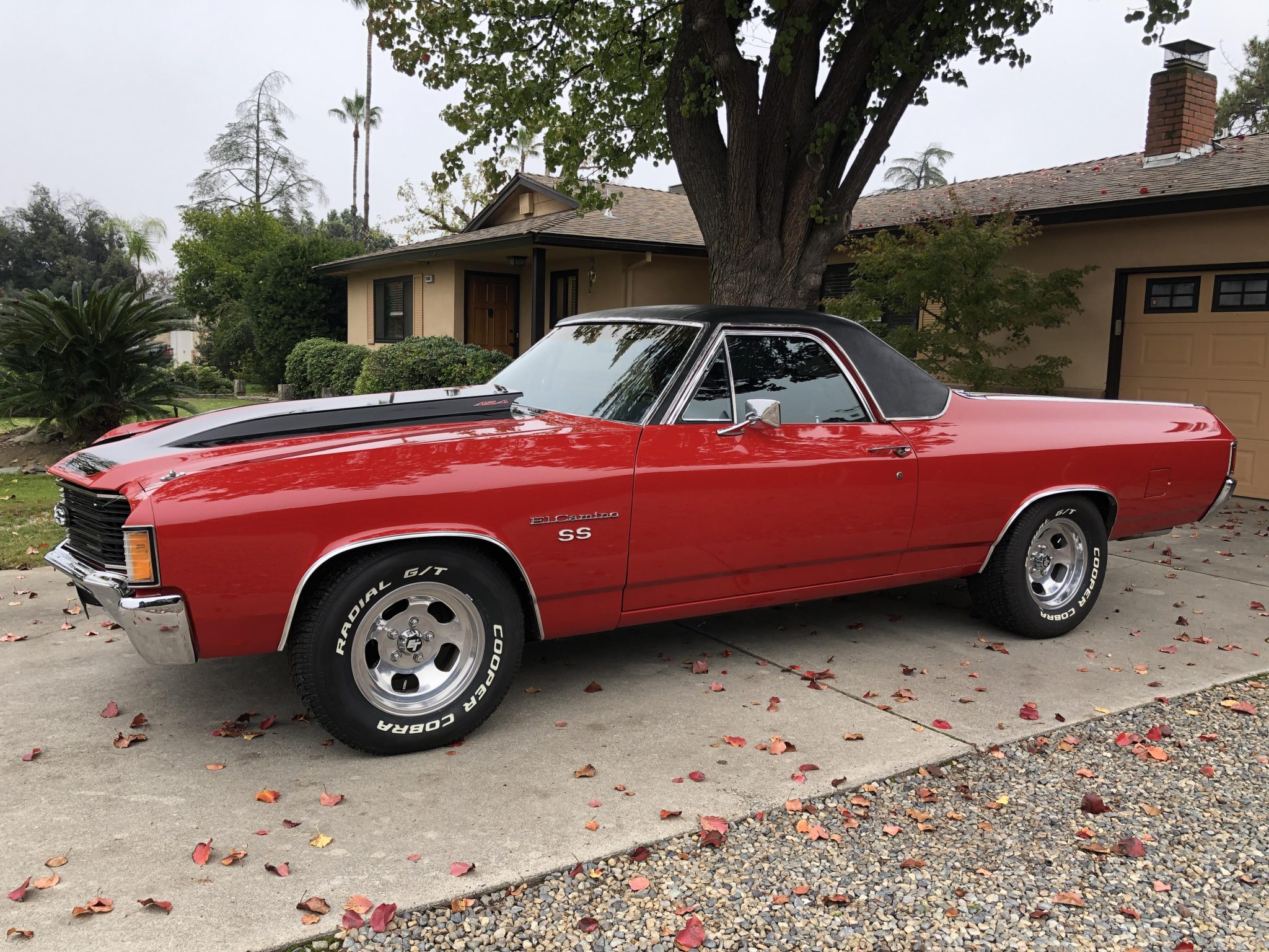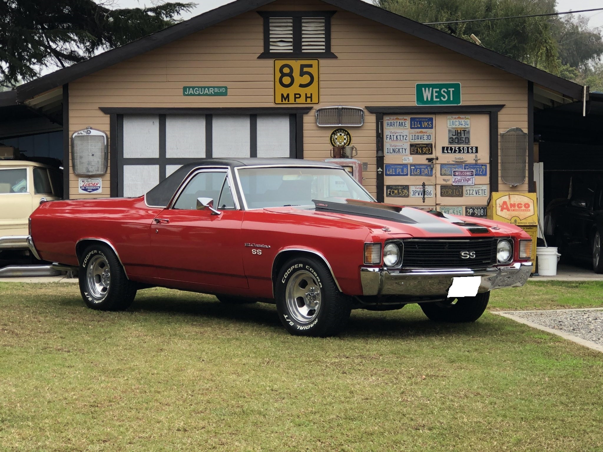 This 1972 Chevrolet El Camino Custom was refinishing the car in red, reupholstering the interior in black, and installing a 454ci V8 and a Transmission Specialties three-speed automatic transmission. Additional equipment includes an Edelbrock four-barrel carburetor and intake manifold, aluminum cylinder heads, ceramic-coated exhaust headers, an electric cooling fan, 15″ alloy wheels, rear air shocks, boxed lower trailing arms, and urethane suspension bushings.