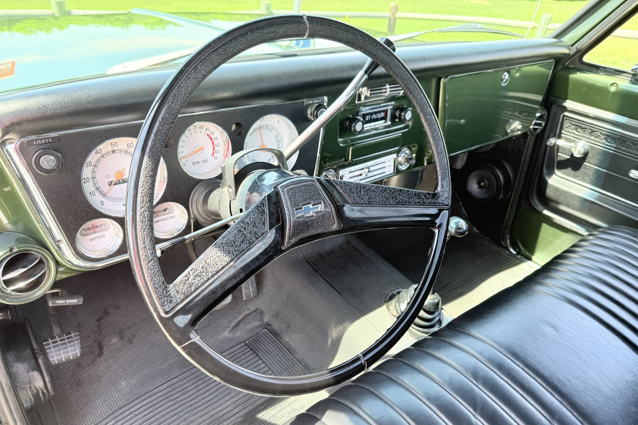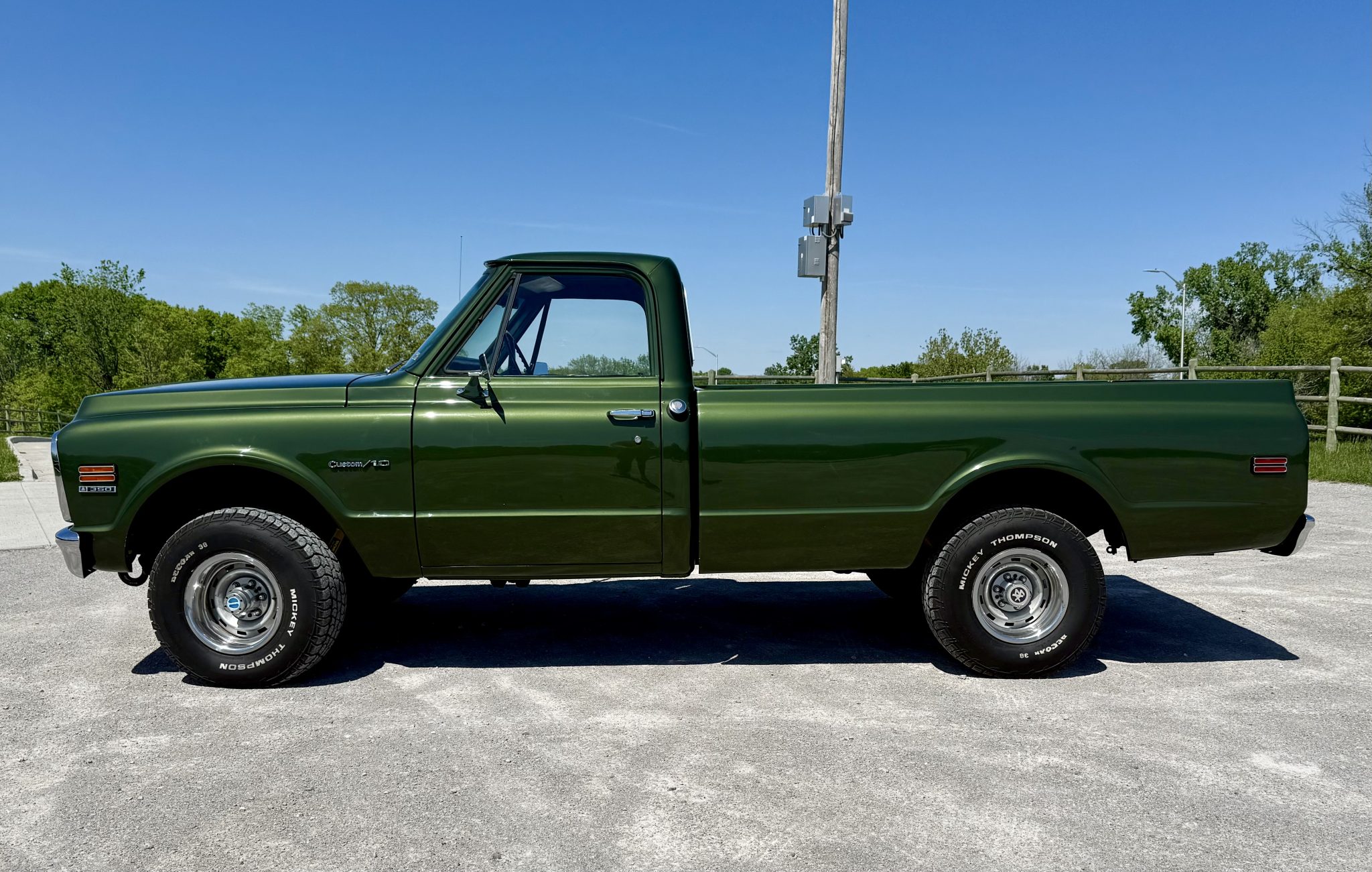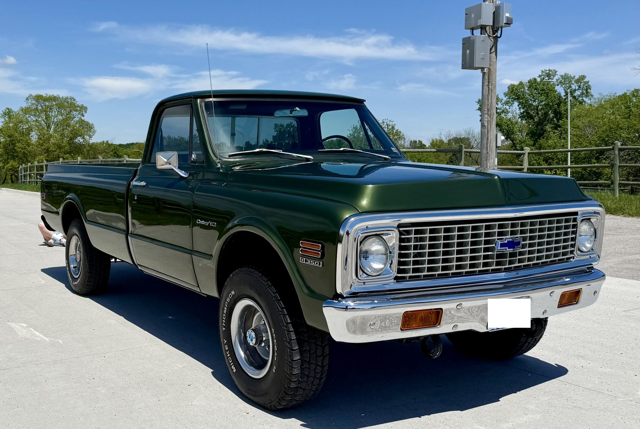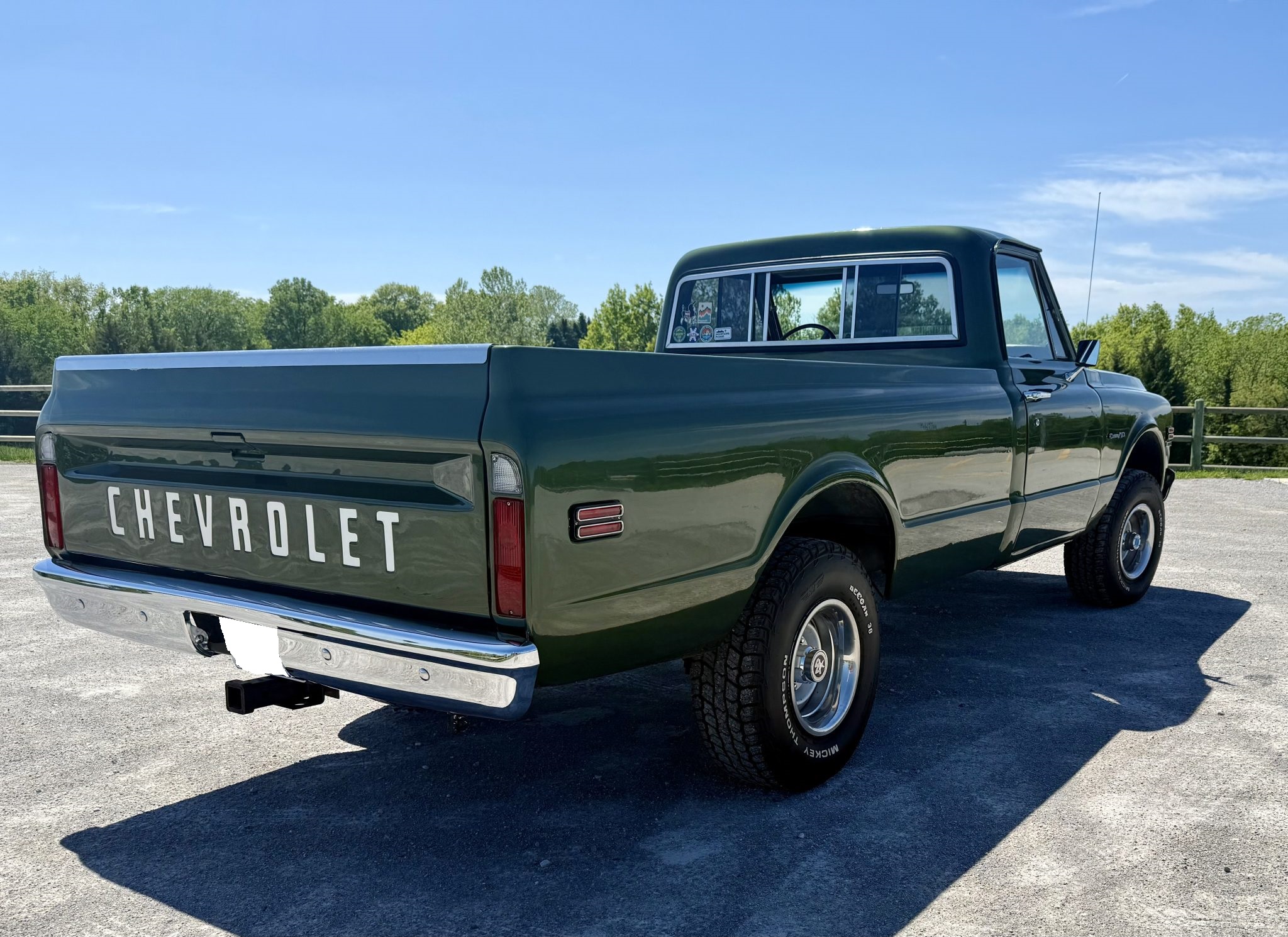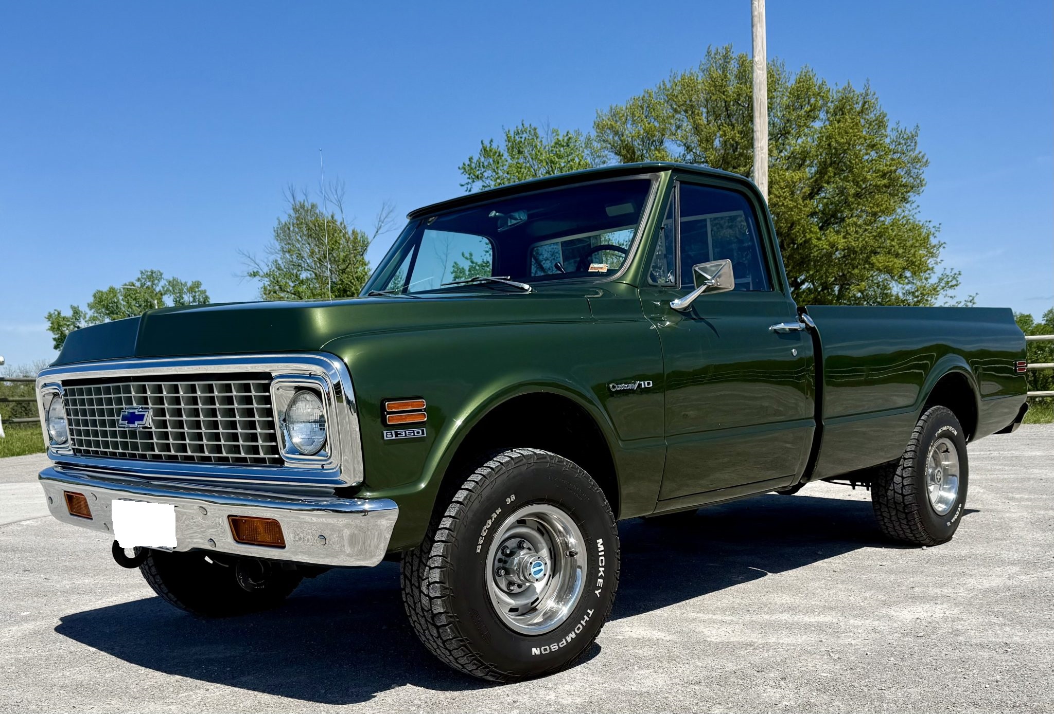 This 1972 Chevrolet K10 Custom 4×4 pickup was refurbished and subsequent work is noted to have involved fitting the 350ci V8 with a COMP Cams camshaft and valve lifters, a Holley Avenger carburetor, an Edelbrock intake manifold, and Vortec-style heads. Additional equipment includes 15″ Rally wheels, power steering, power-assisted front disc brakes, manually locking front hubs, a spray-on bedliner, a sliding rear window, LED taillights and side markers, chrome bumpers, a receiver hitch, and a retro-style stereo.