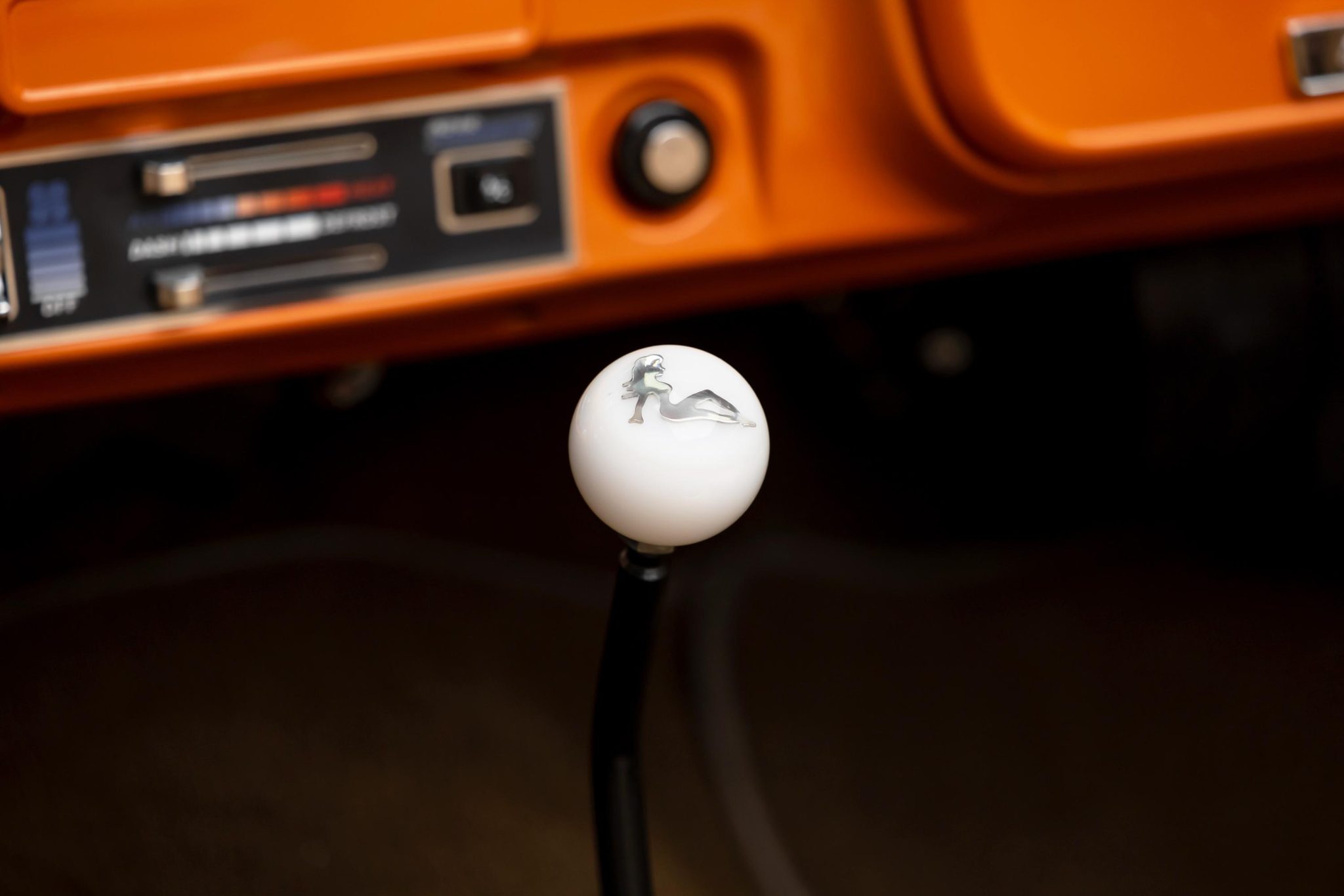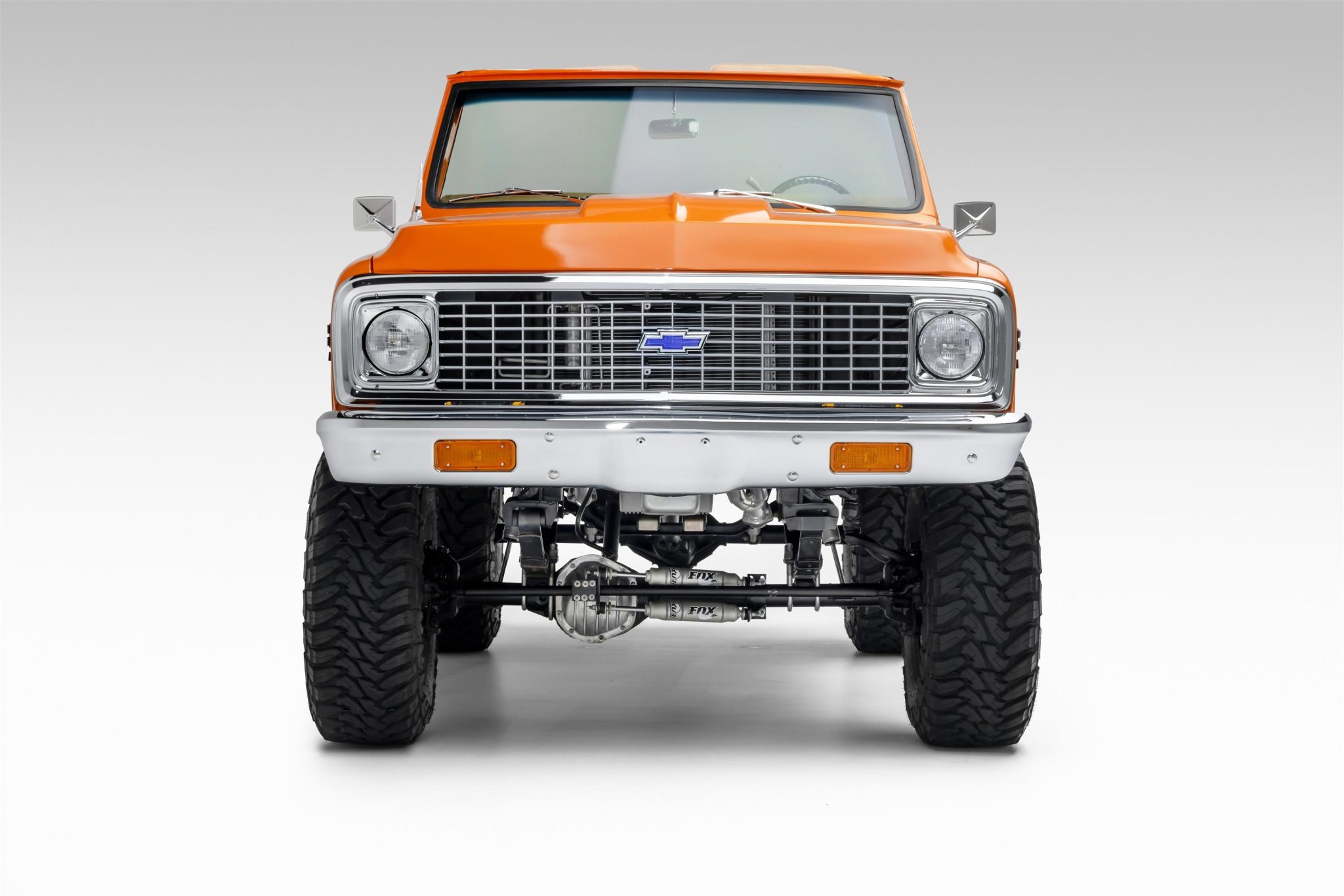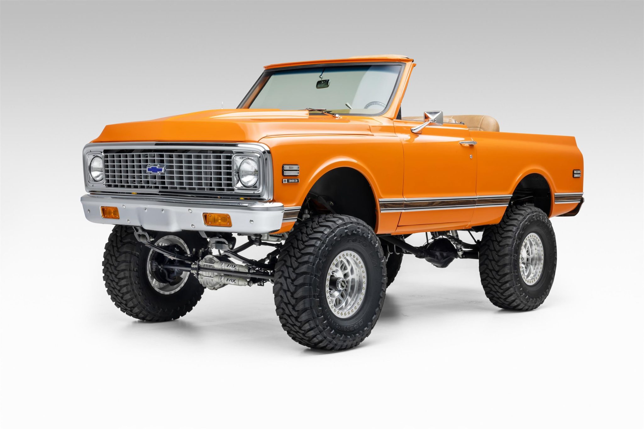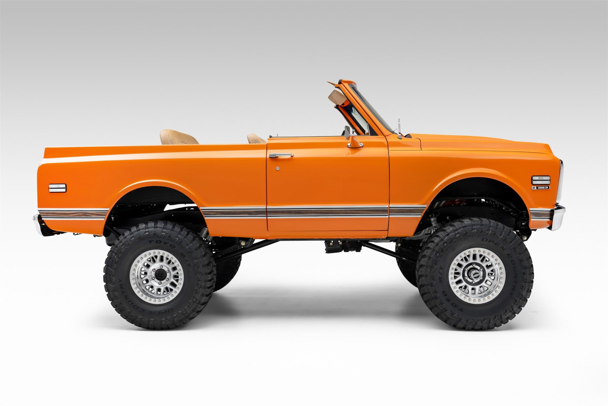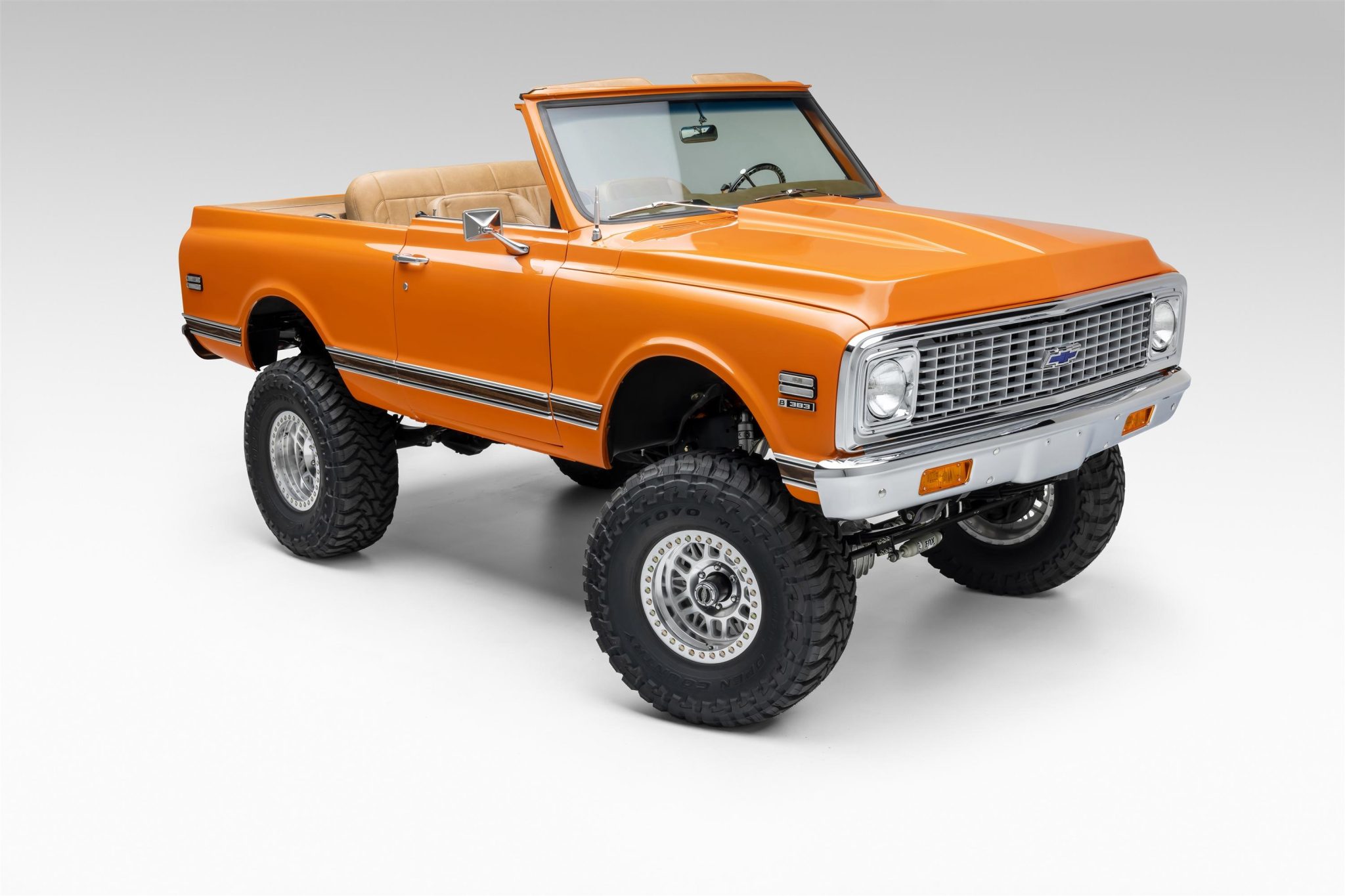 This 1972 Chevrolet K5 Blazer 4×4 was subsequently refinished in orange over Camel tan vinyl and fitted with a 383ci V8 that is linked to a three-speed automatic transmission and a dual-range transfer case. Equipment includes a white removable hardtop, a 2″ body lift, a 6″ suspension lift, Fox shock absorbers, power steering, front disc brakes, and 17″ Raceline Ryno beadlock wheels in addition to a Demon carburetor, Doug Thorley headers, and a dual exhaust system with Flowmaster mufflers. The interior features TMI Products seating, an Old Air Products climate control system, a Sony Bluetooth stereo, and a JL Audio sound system.