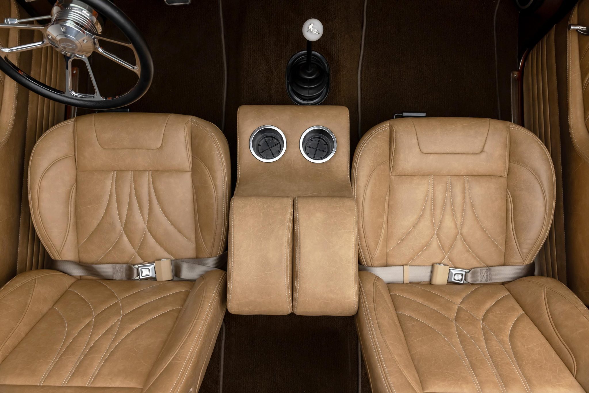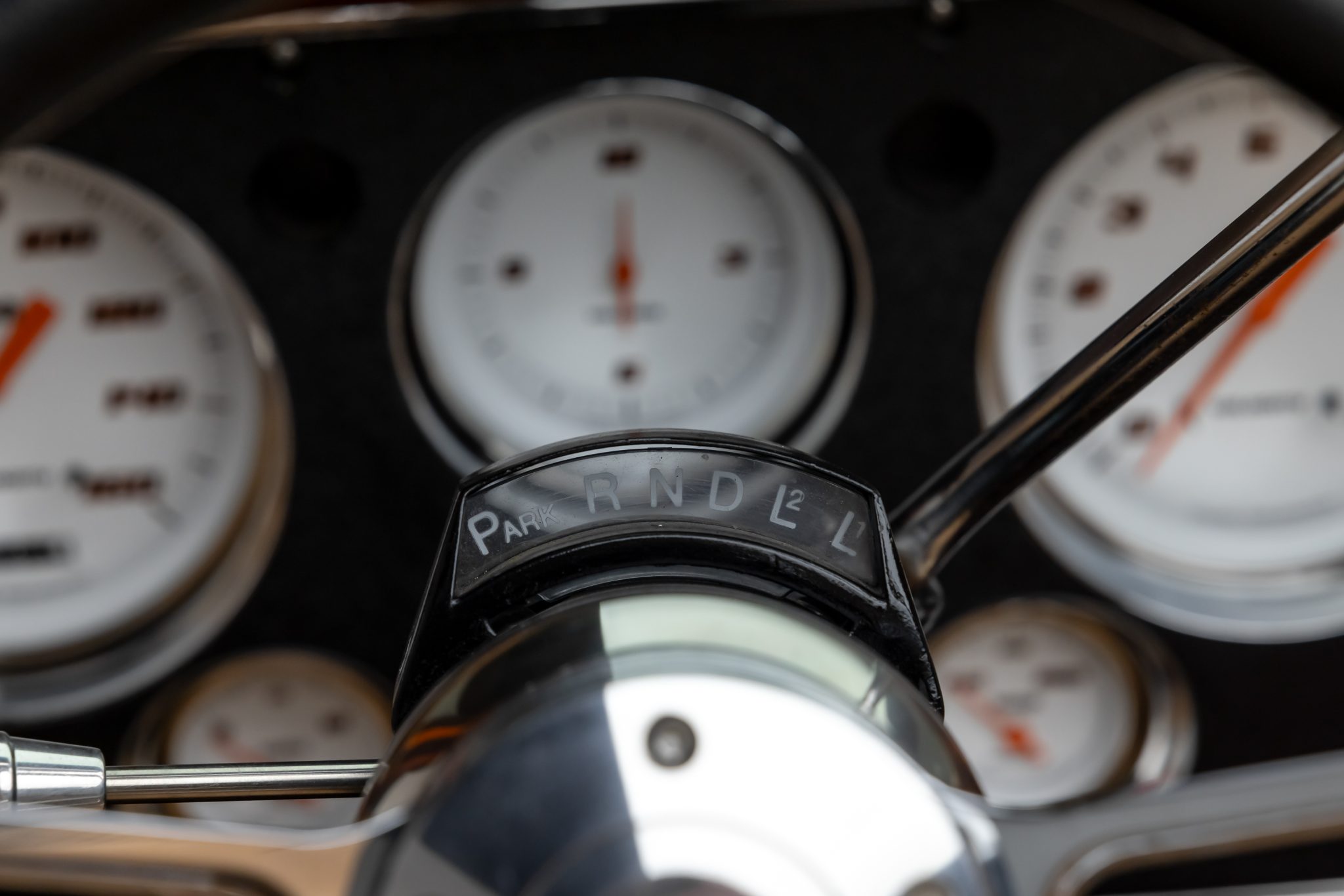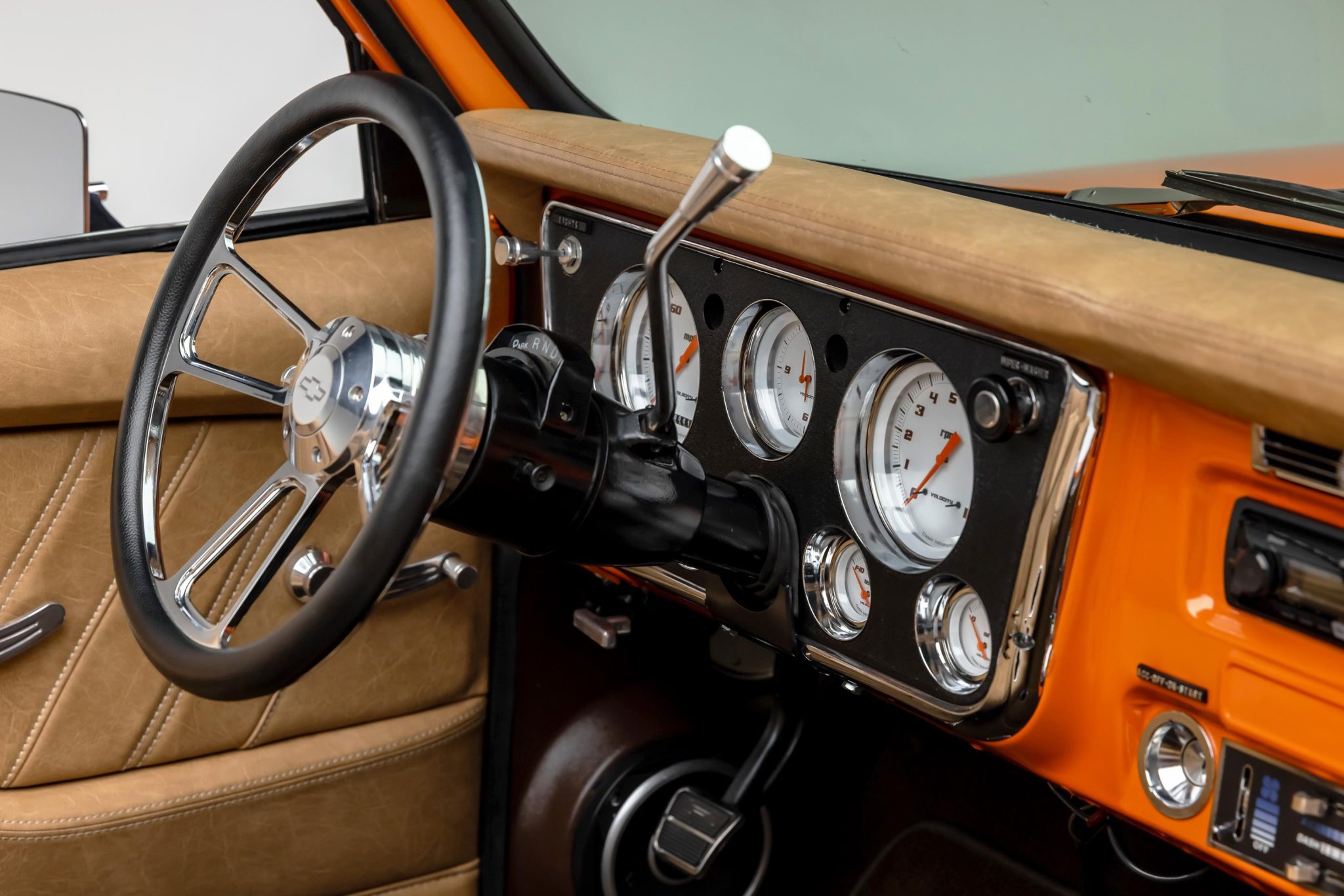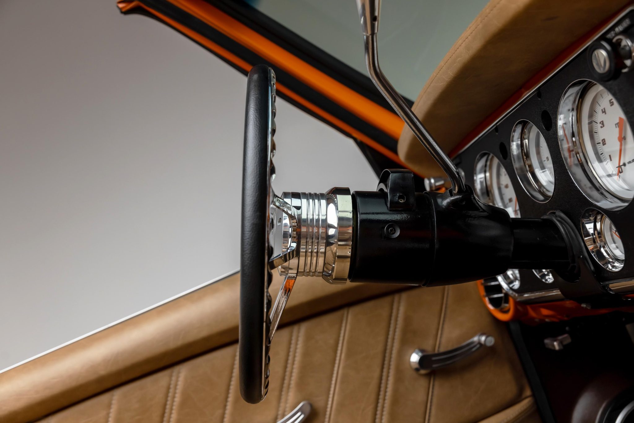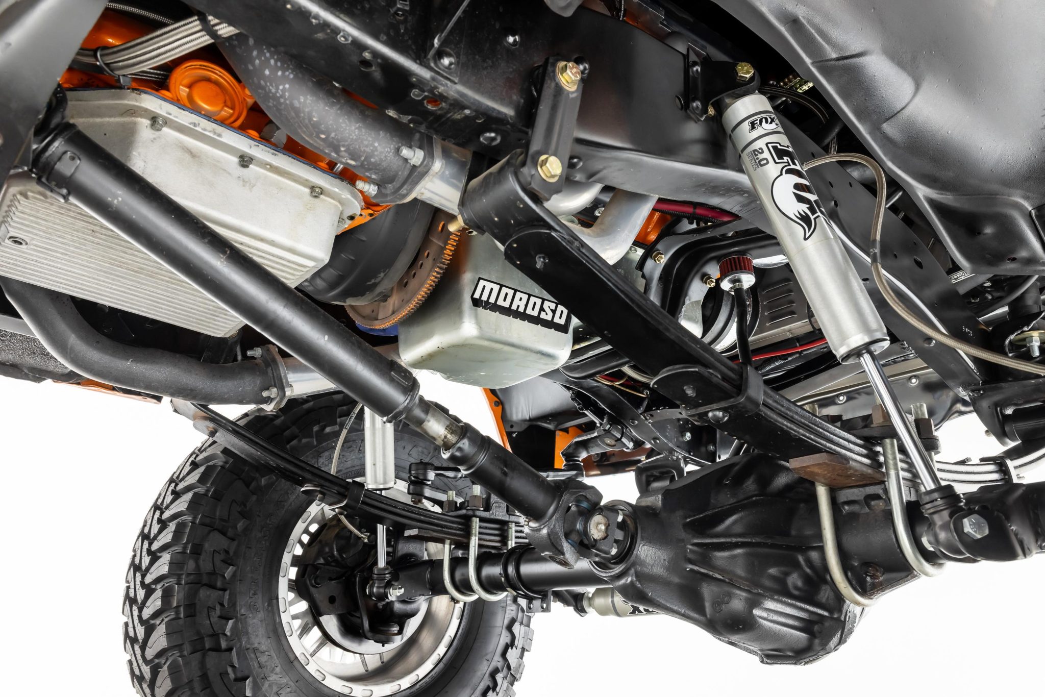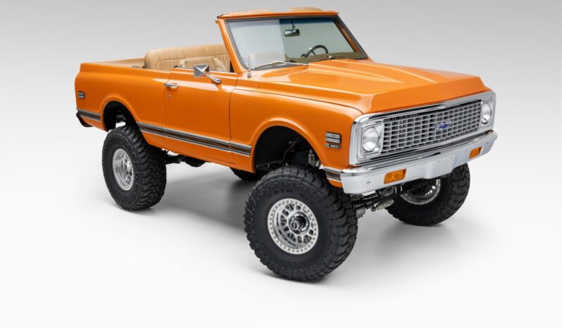 This 1972 Chevrolet K5 Blazer 4×4 was subsequently refinished in orange over Camel tan vinyl and fitted with a 383ci V8 that is linked to a three-speed automatic transmission and a dual-range transfer case. Equipment includes a white removable hardtop, a 2″ body lift, a 6″ suspension lift, Fox shock absorbers, power steering, front disc brakes, and 17″ Raceline Ryno beadlock wheels in addition to a Demon carburetor, Doug Thorley headers, and a dual exhaust system with Flowmaster mufflers. The interior features TMI Products seating, an Old Air Products climate control system, a Sony Bluetooth stereo, and a JL Audio sound system.