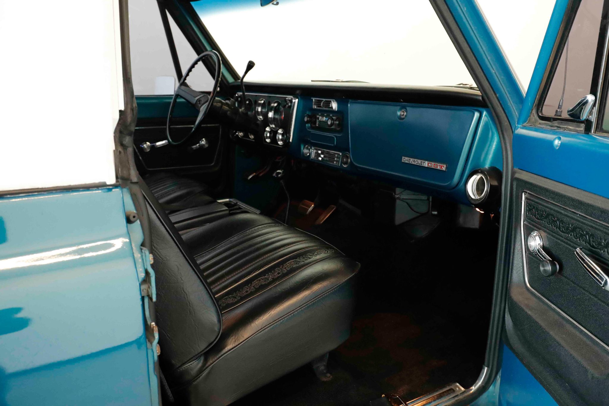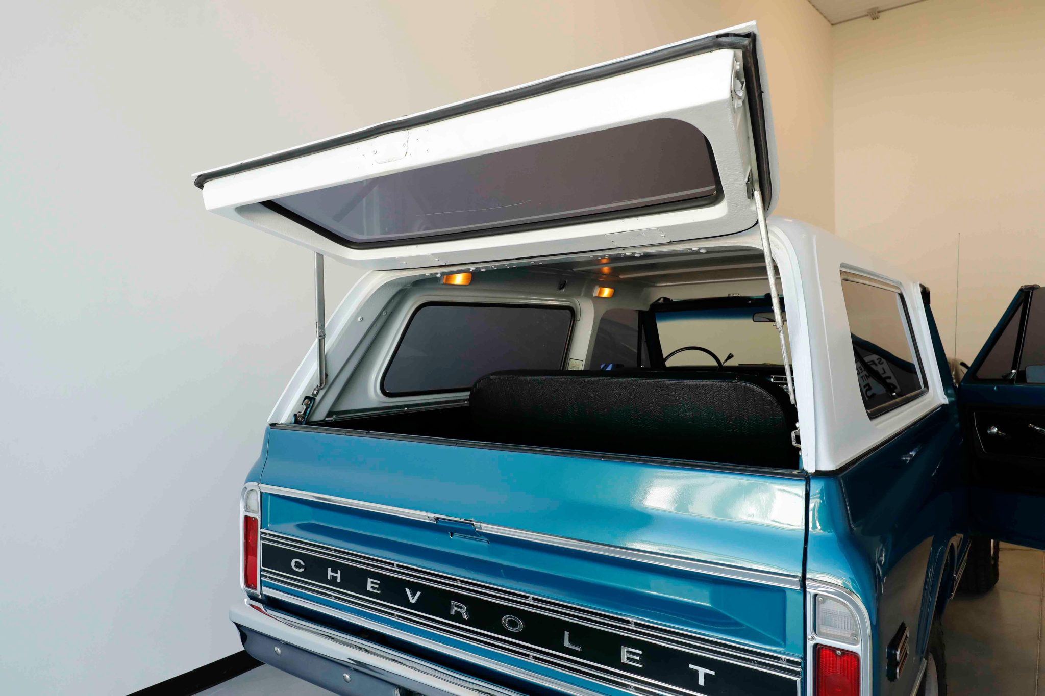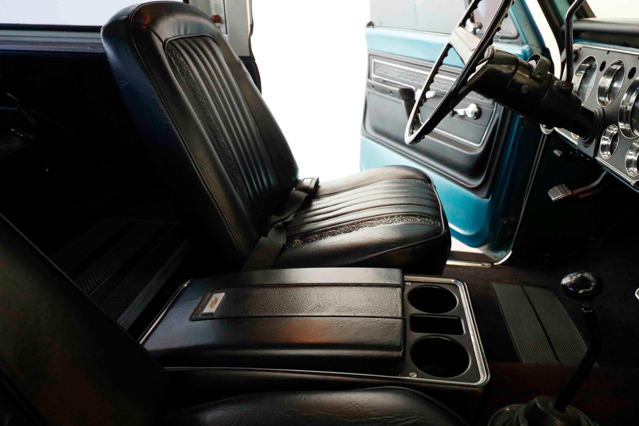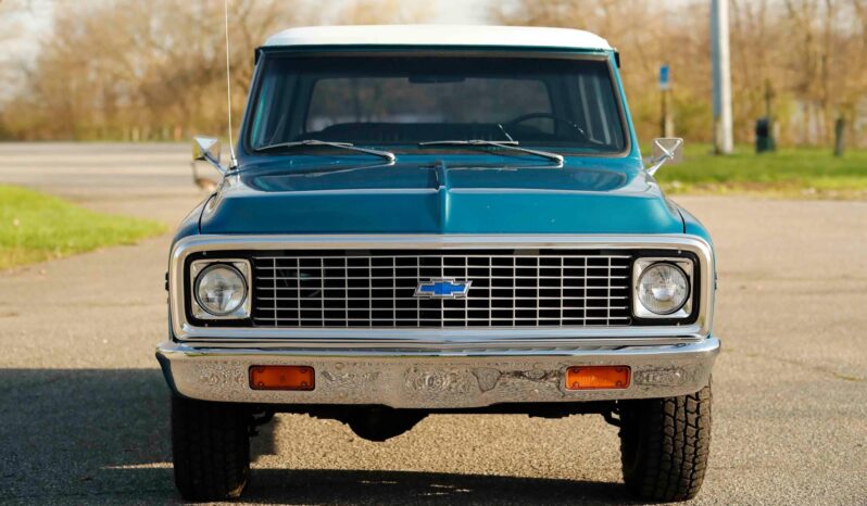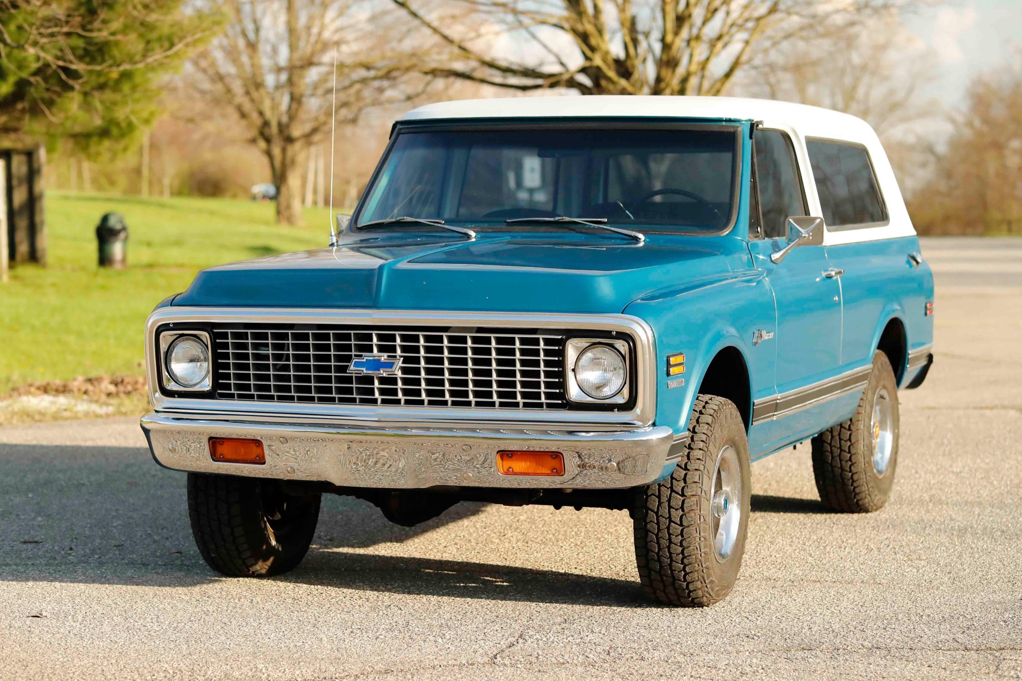 This 1972 Chevrolet K5 Blazer 4×4 underwent a refurbishment in the early 2000s It is powered by a 350ci V8 linked with a three-speed automatic transmission, a dual-range transfer case, and a Positraction limited-slip rear differential. The truck is finished in blue over black vinyl, and features include a white removable hardtop, a drop-down tailgate, rally-style wheels, manually locking front hubs, power-assisted brakes, power steering, front bucket seats, a center console, a rear bench, and air conditioning.