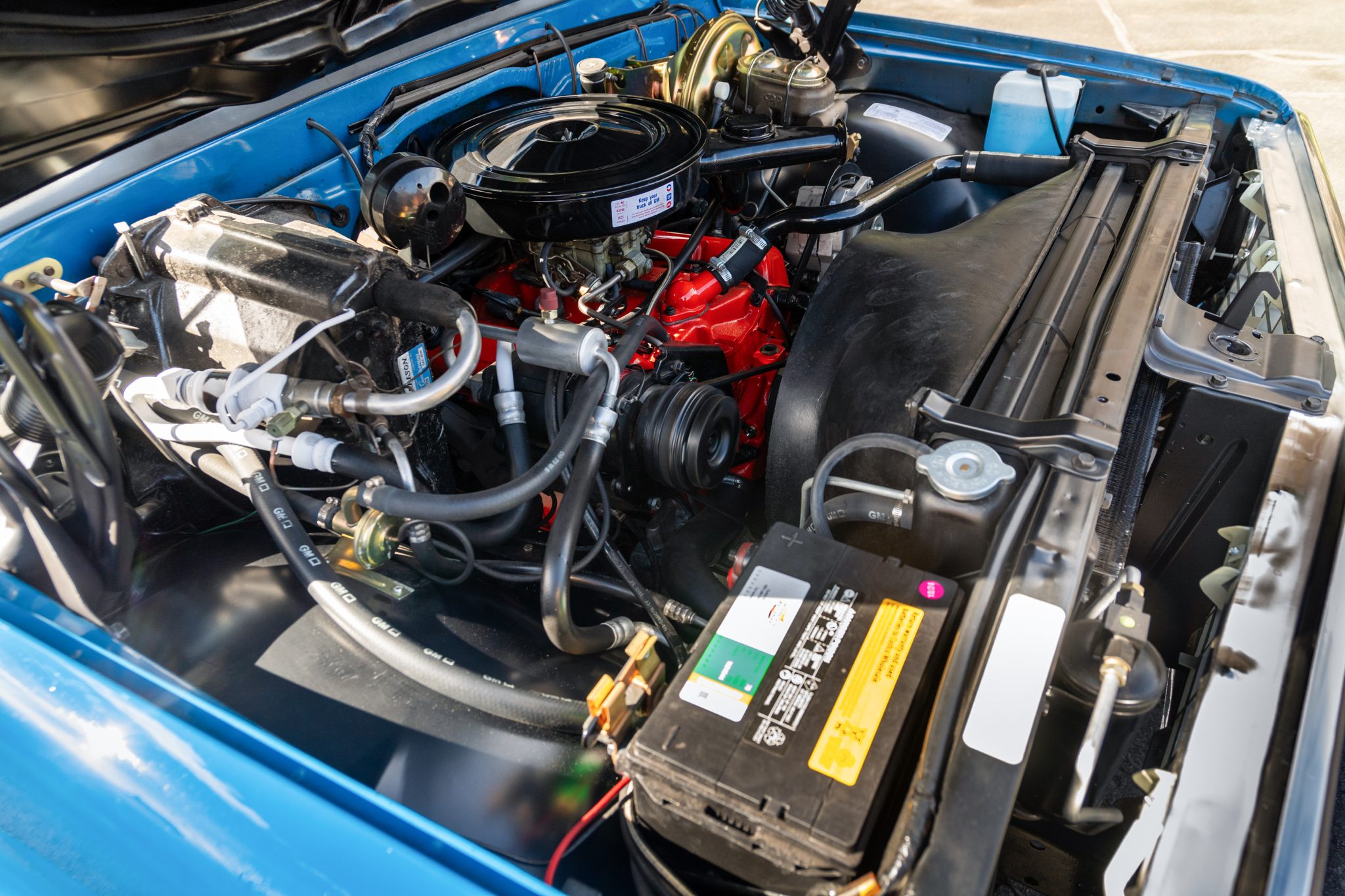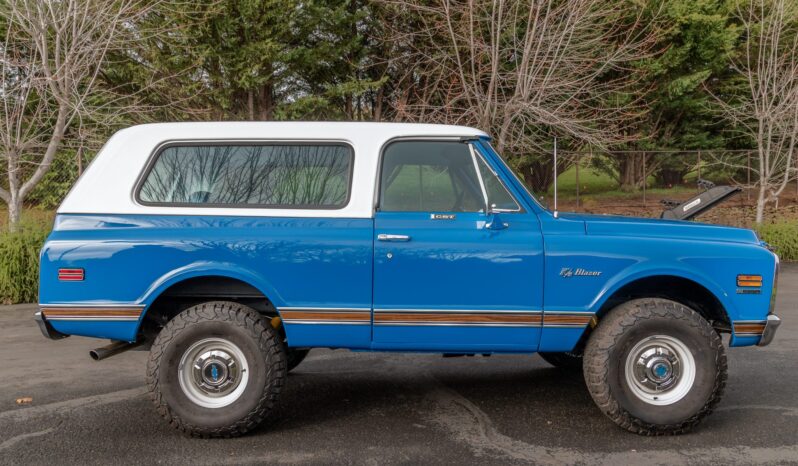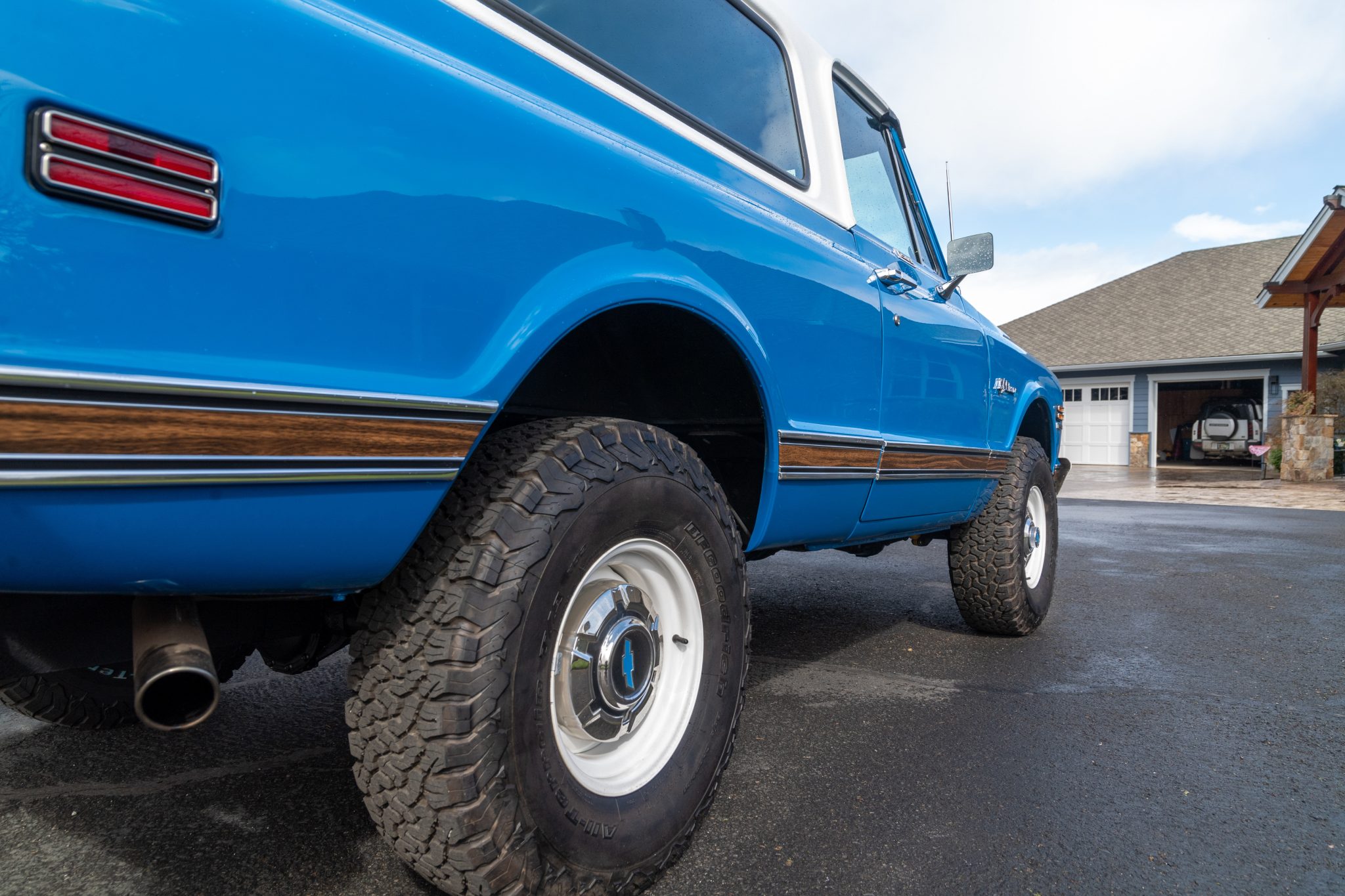 This 1972 Chevrolet K5 Blazer CST 4×4 was refurbished in 2018 and is powered by a 350ci V8 linked with a three-speed automatic transmission and a dual-range transfer case. The truck is finished in Mariner Blue over blue vinyl upholstery, and features include the CST Package, a white removable hardtop, a drop-down tailgate, 15″ white steel wheels with hubcaps, manually locking front hubs, power-assisted brakes, power steering, front bucket seats, a headlight warning buzzer, a tilting steering column, intermittent wipers, and air conditioning.