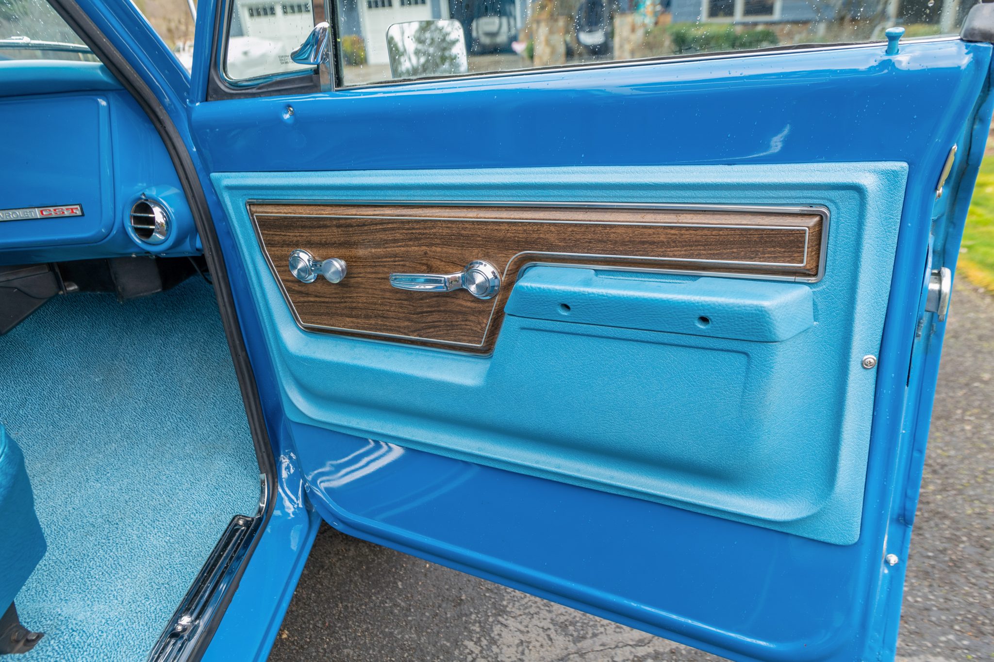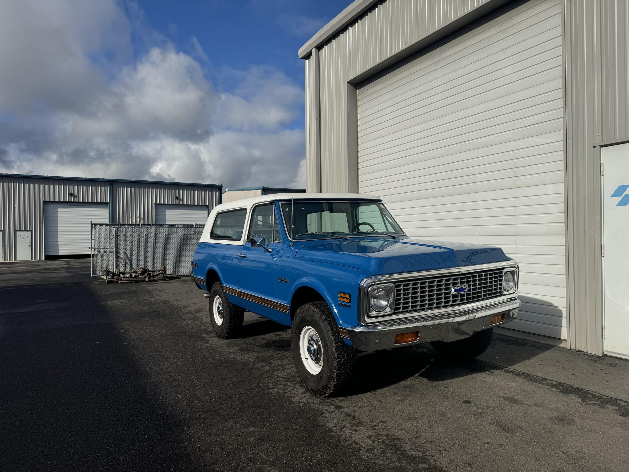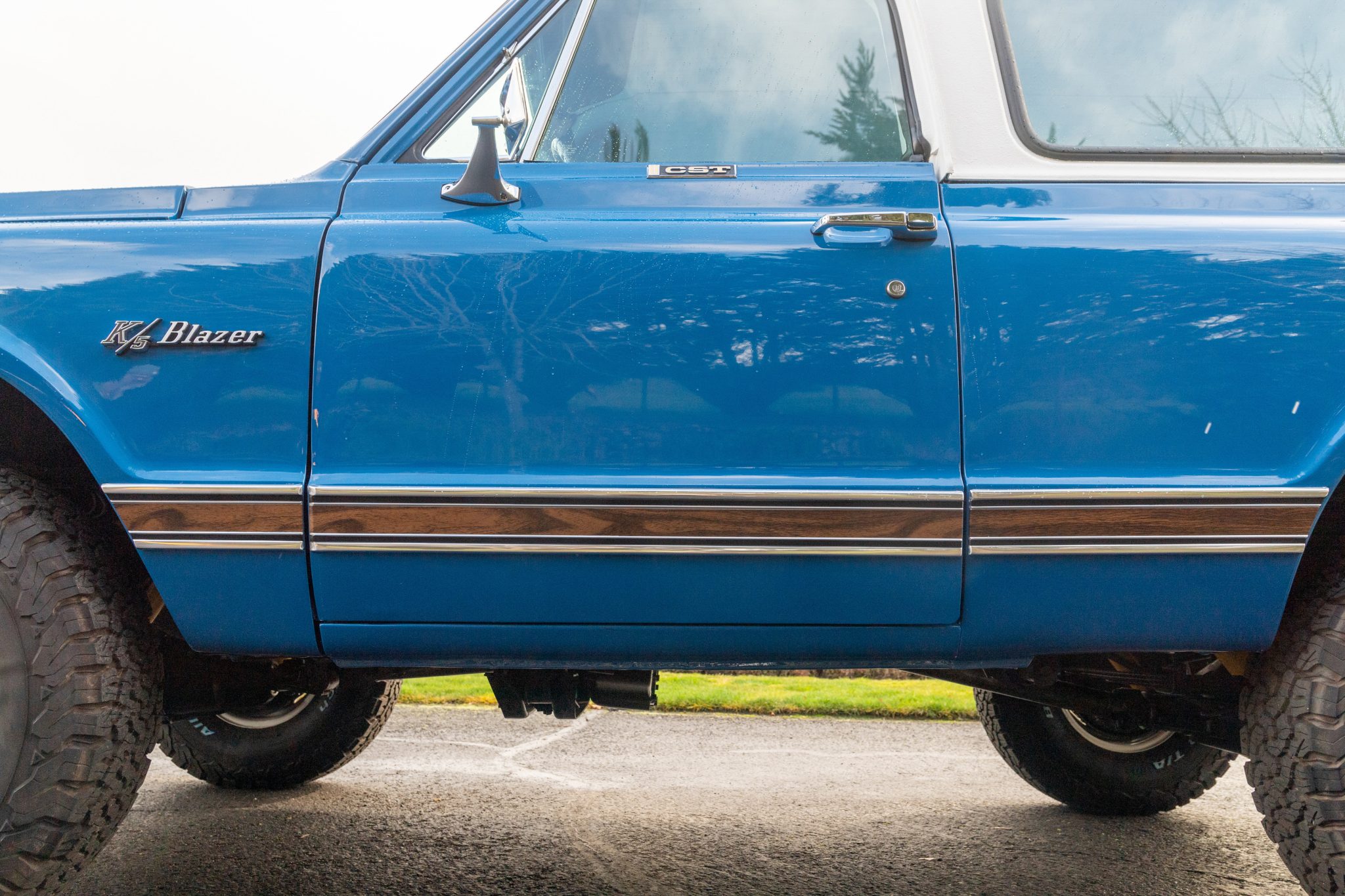 This 1972 Chevrolet K5 Blazer CST 4×4 was refurbished in 2018 and is powered by a 350ci V8 linked with a three-speed automatic transmission and a dual-range transfer case. The truck is finished in Mariner Blue over blue vinyl upholstery, and features include the CST Package, a white removable hardtop, a drop-down tailgate, 15″ white steel wheels with hubcaps, manually locking front hubs, power-assisted brakes, power steering, front bucket seats, a headlight warning buzzer, a tilting steering column, intermittent wipers, and air conditioning.