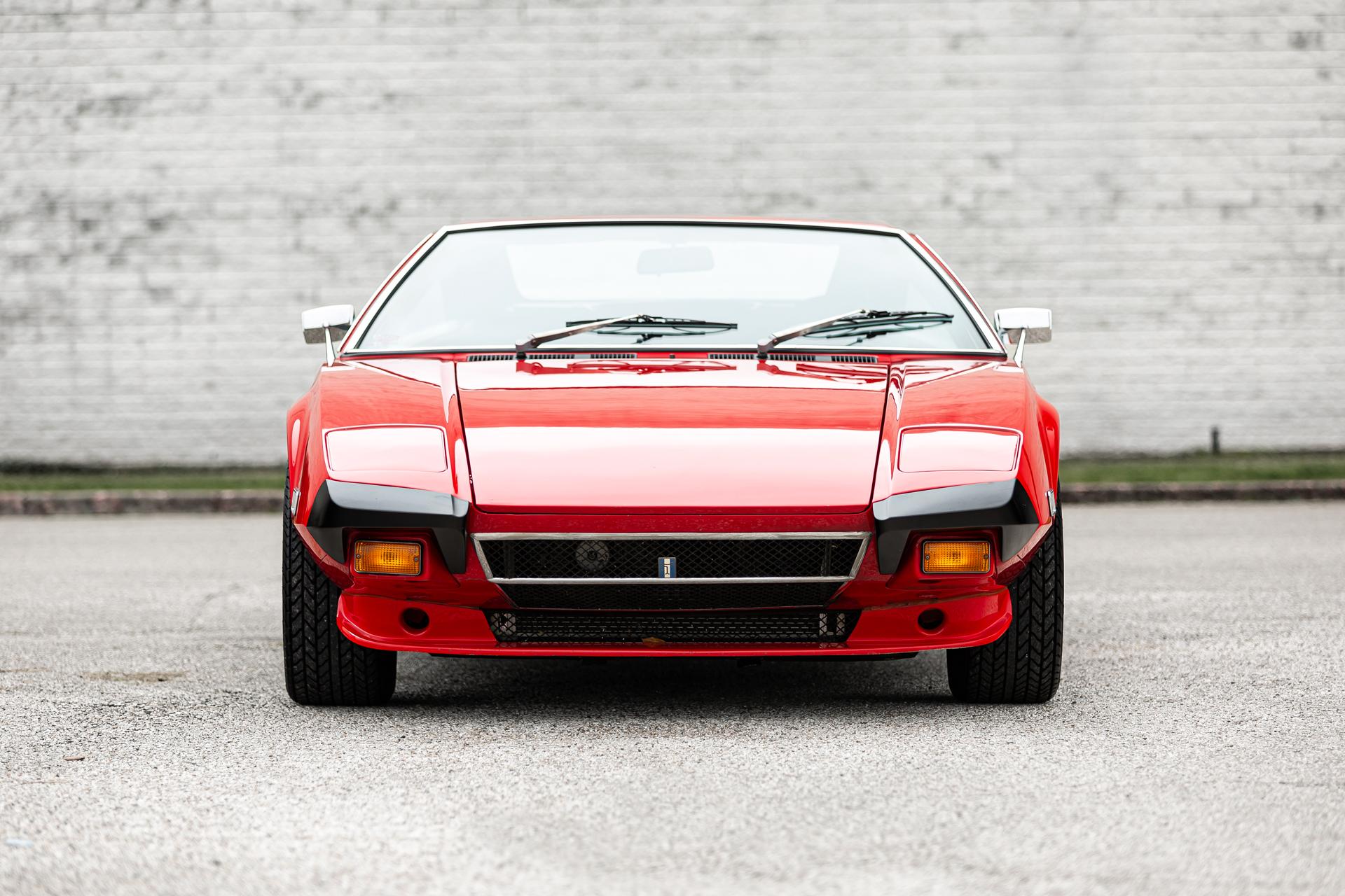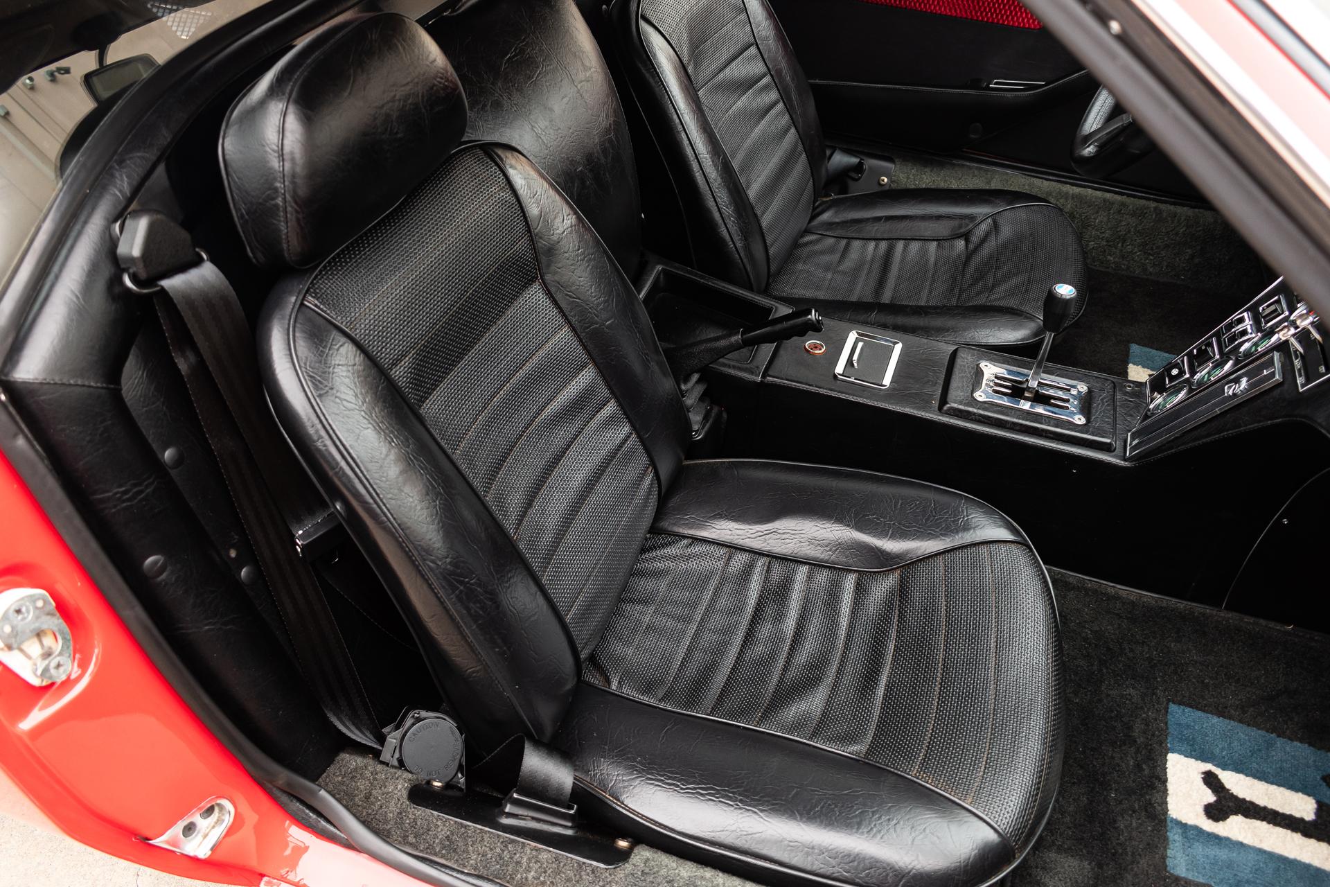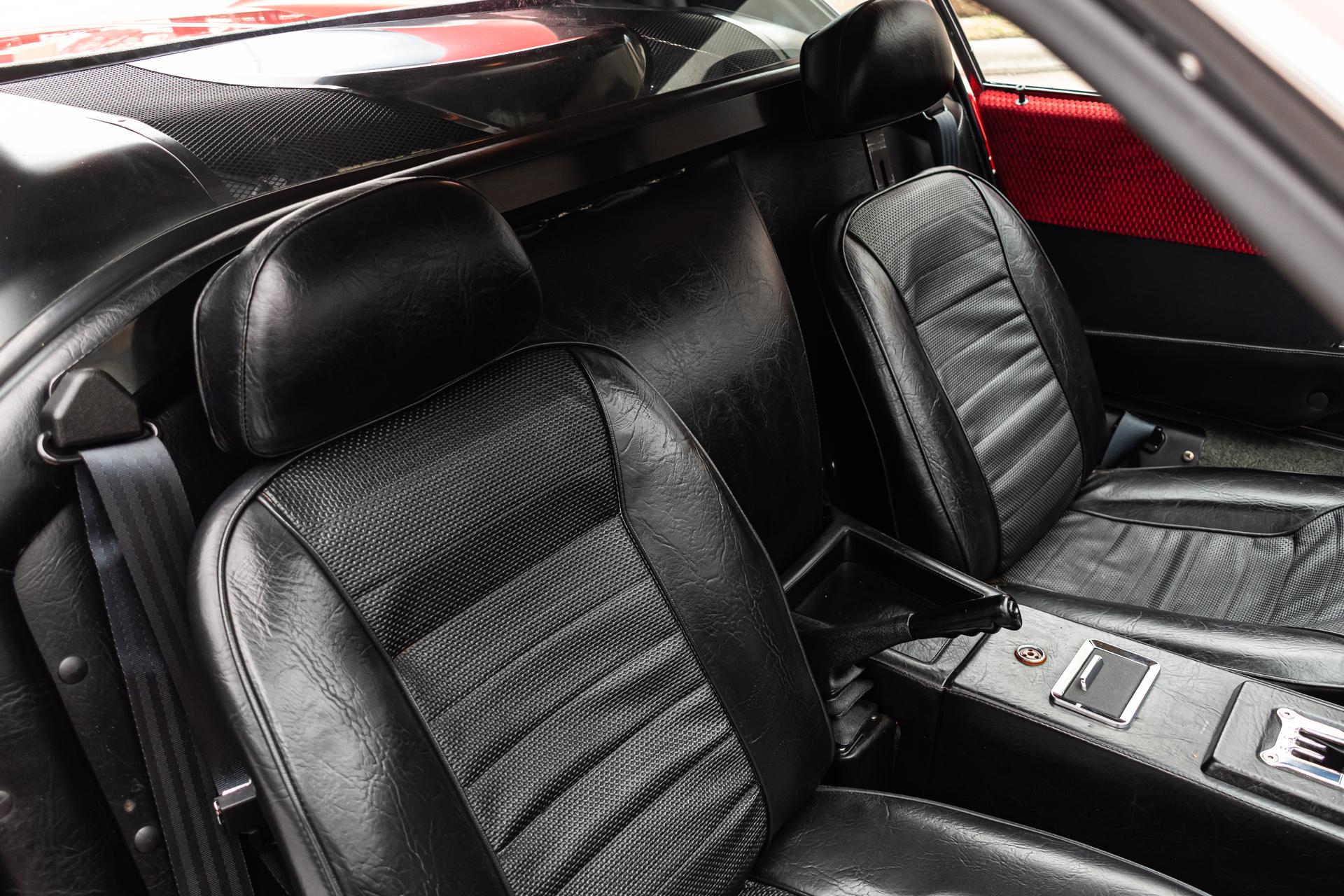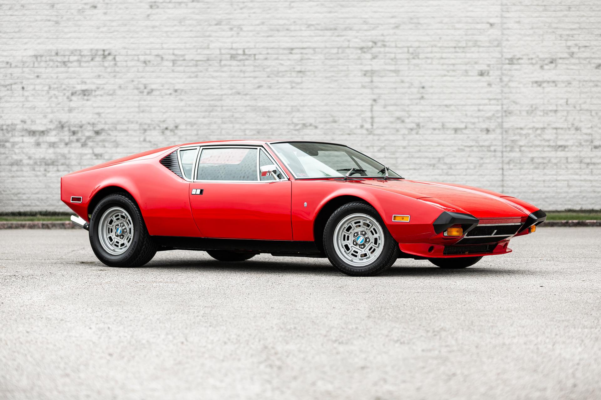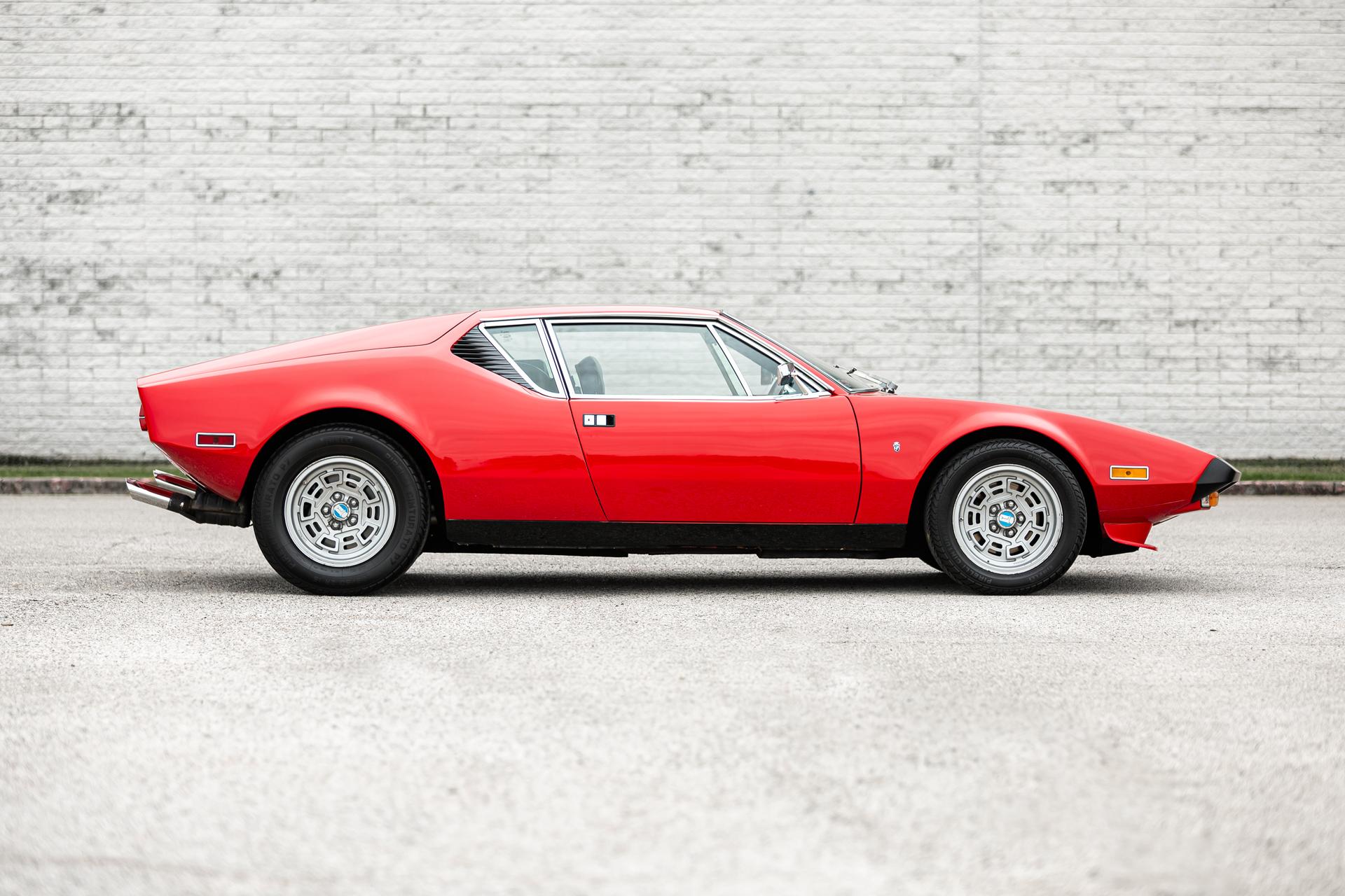 This 1972 DeTomaso Pantera L left the factory in June 1973 and underwent a color change to Viper Red as well as installation of a 351ci Windsor V8 crate engine as part of a refurbishment complete It wears a GTS-style front chin spoiler along with split front bumpers from AmeriSport Industries and rides on 15″ Campagnolo cast magnesium wheels. Inside, black vinyl–trimmed seats are accompanied by a MOMO steering wheel, a gated shifter, and air conditioning. The engine is mated to a five-speed ZF manual transaxle and is further equipped with a Hall Pantera camshaft as well as roller rockers and custom exhaust headers. The car was acquired by the selling dealer in 2024, and recent work has involved rebuilding the power steering rack and servicing the disc brakes as well as adding a Holley double-pumper carburetor, an Edelbrock Performer intake manifold, and an MSD ignition. Now showing 36k miles