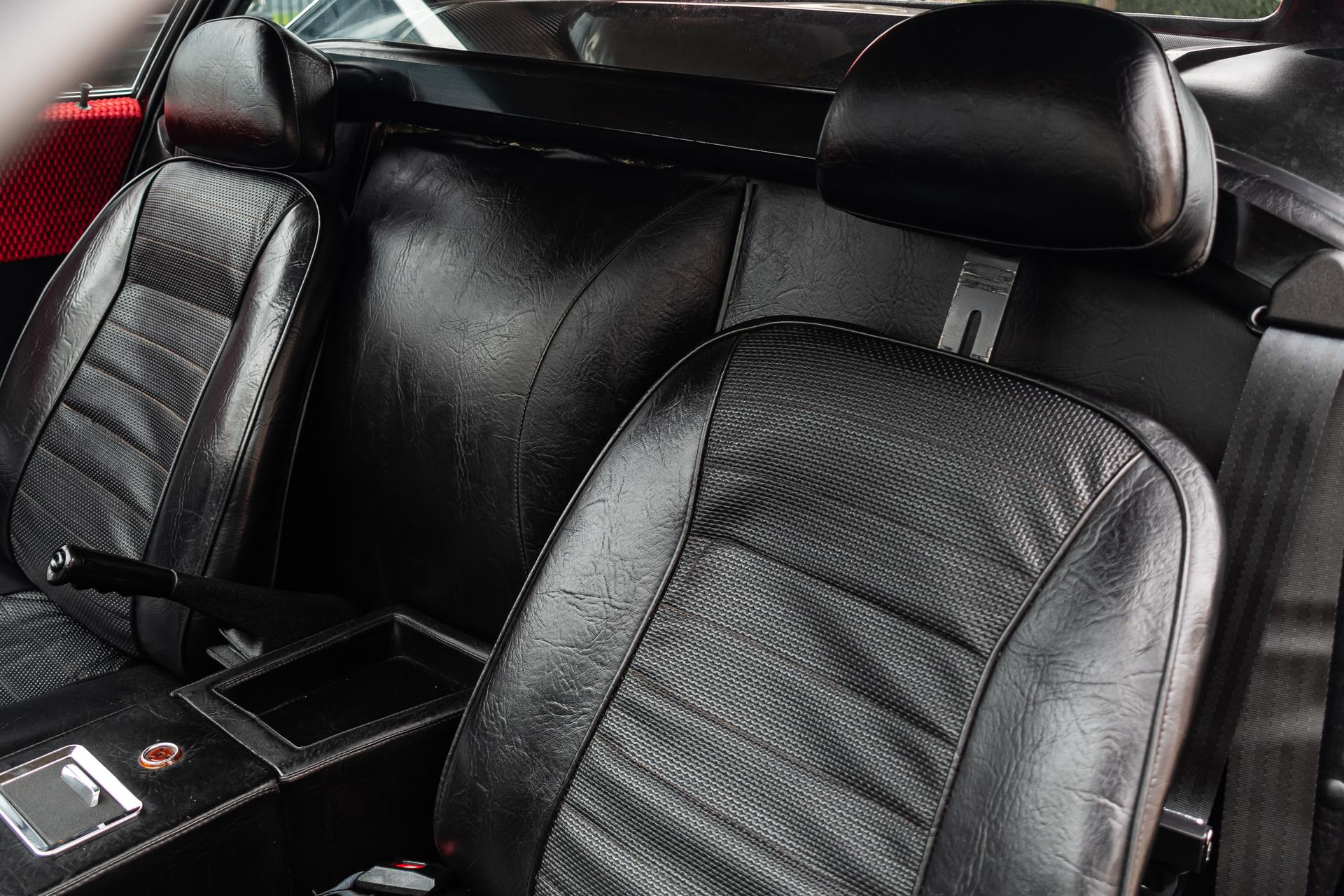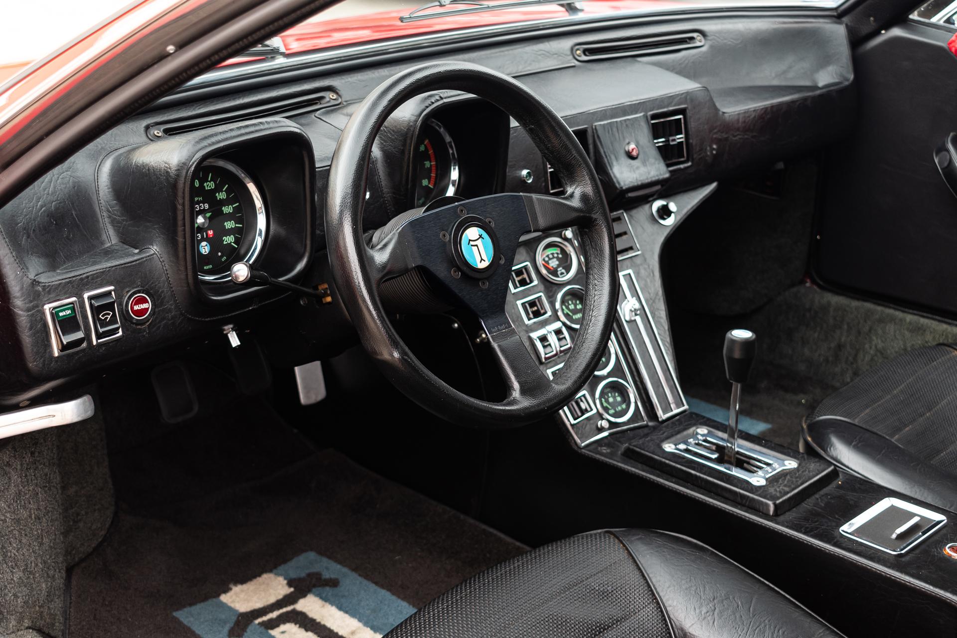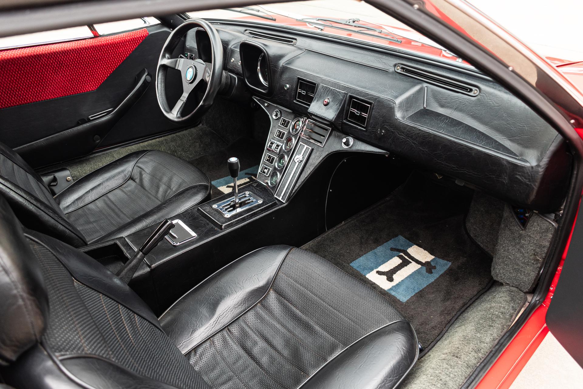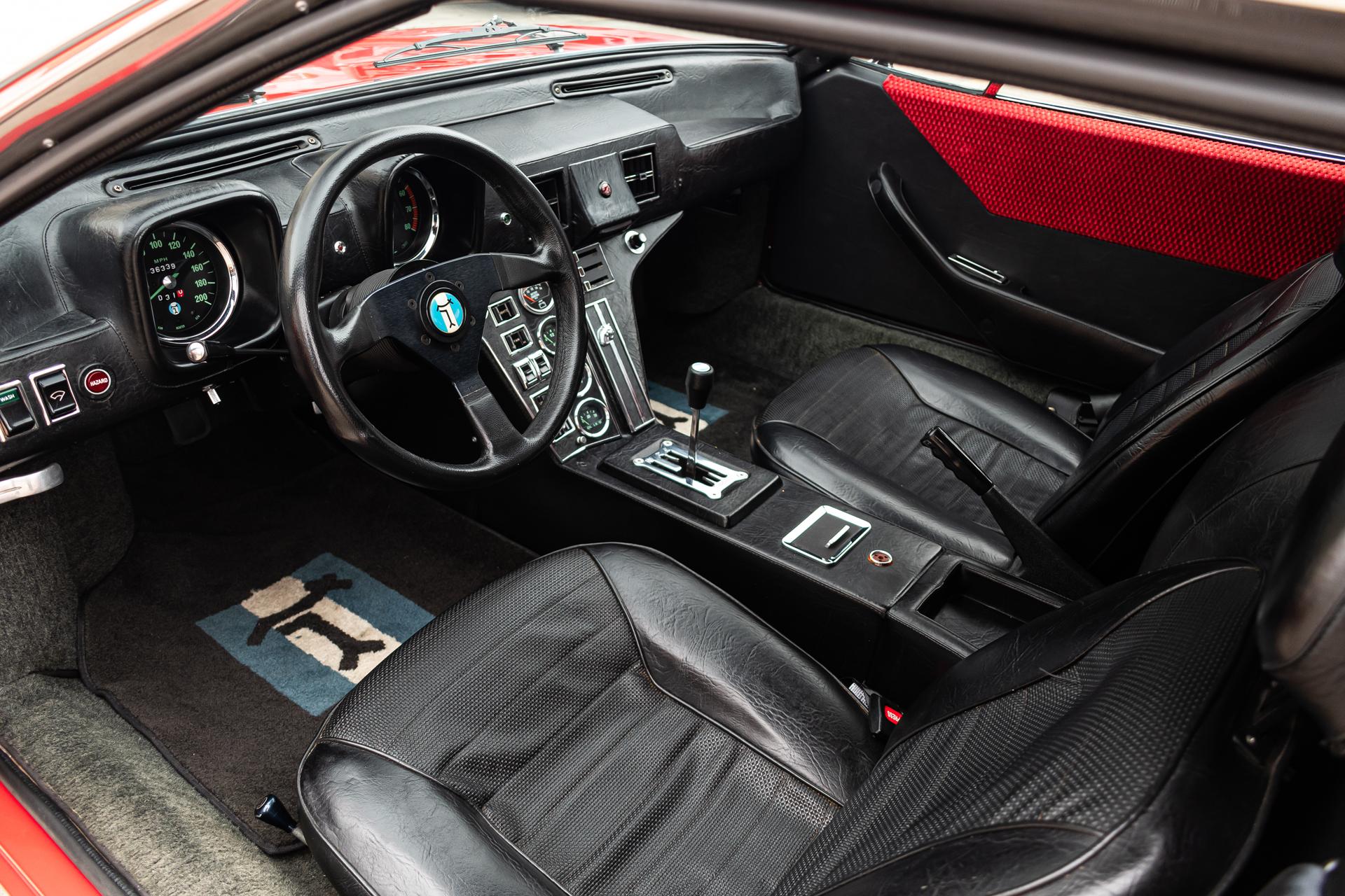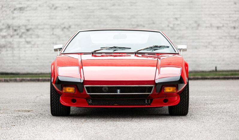 This 1972 DeTomaso Pantera L left the factory in June 1973 and underwent a color change to Viper Red as well as installation of a 351ci Windsor V8 crate engine as part of a refurbishment complete It wears a GTS-style front chin spoiler along with split front bumpers from AmeriSport Industries and rides on 15″ Campagnolo cast magnesium wheels. Inside, black vinyl–trimmed seats are accompanied by a MOMO steering wheel, a gated shifter, and air conditioning. The engine is mated to a five-speed ZF manual transaxle and is further equipped with a Hall Pantera camshaft as well as roller rockers and custom exhaust headers. The car was acquired by the selling dealer in 2024, and recent work has involved rebuilding the power steering rack and servicing the disc brakes as well as adding a Holley double-pumper carburetor, an Edelbrock Performer intake manifold, and an MSD ignition. Now showing 36k miles