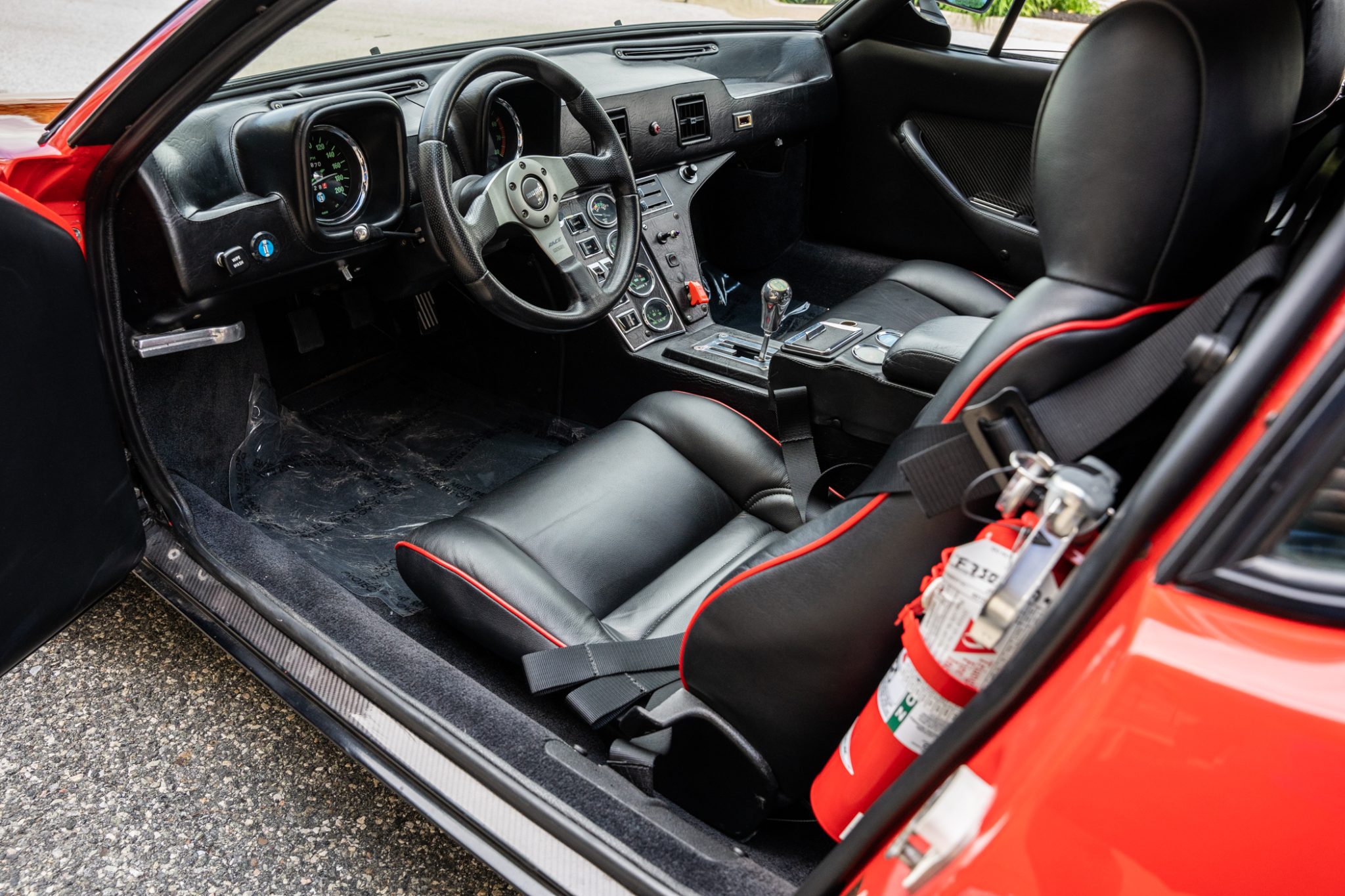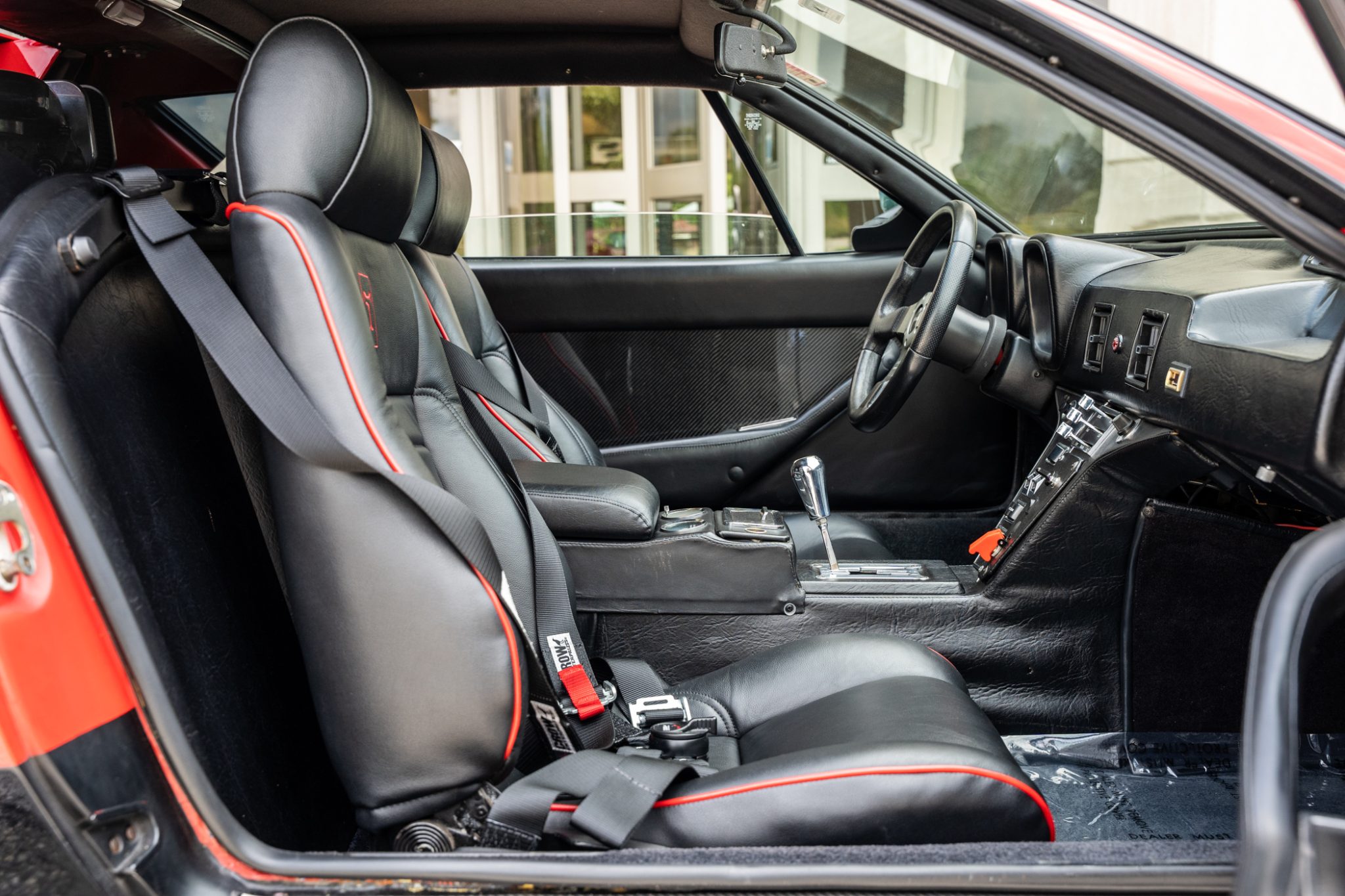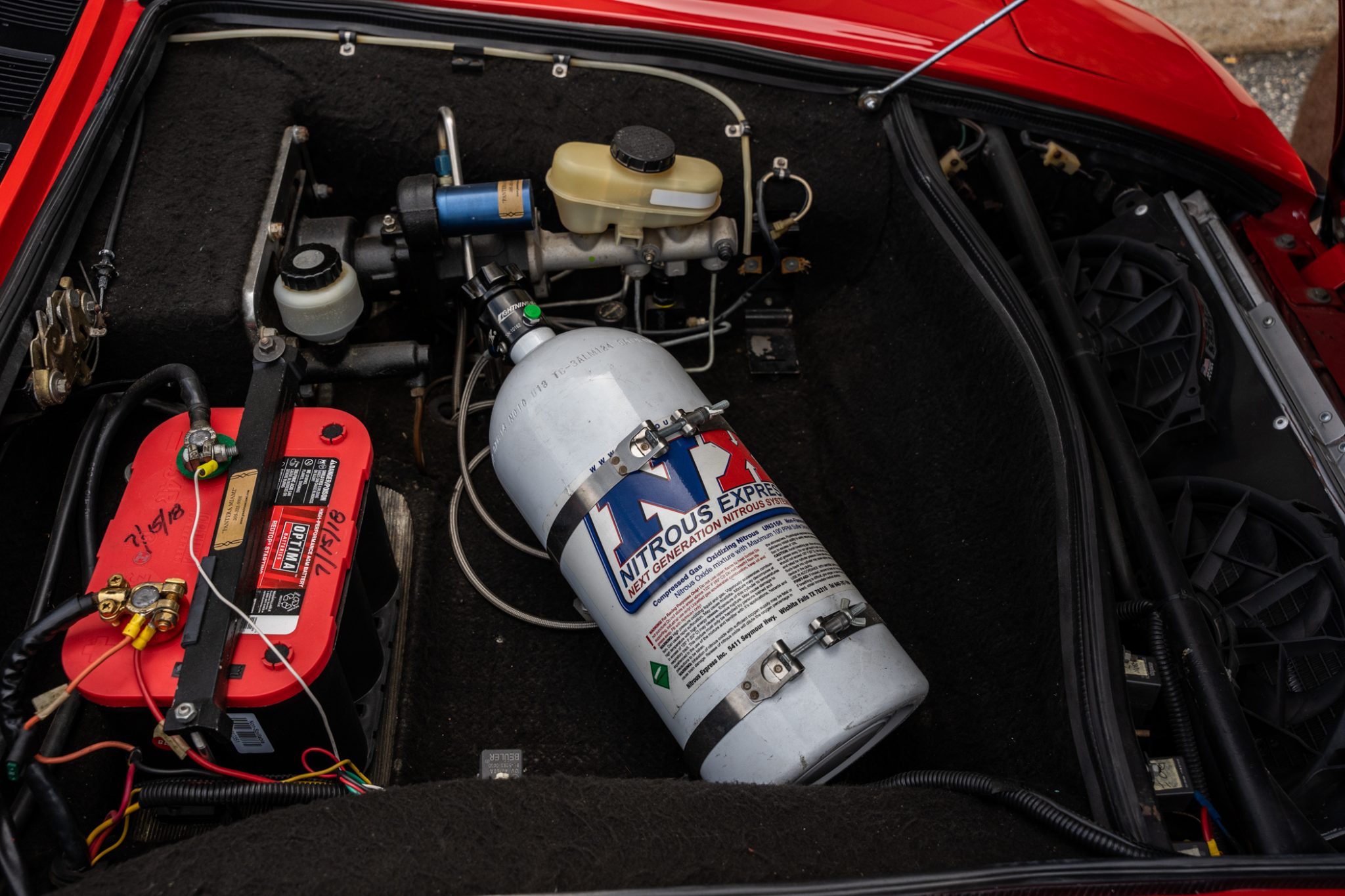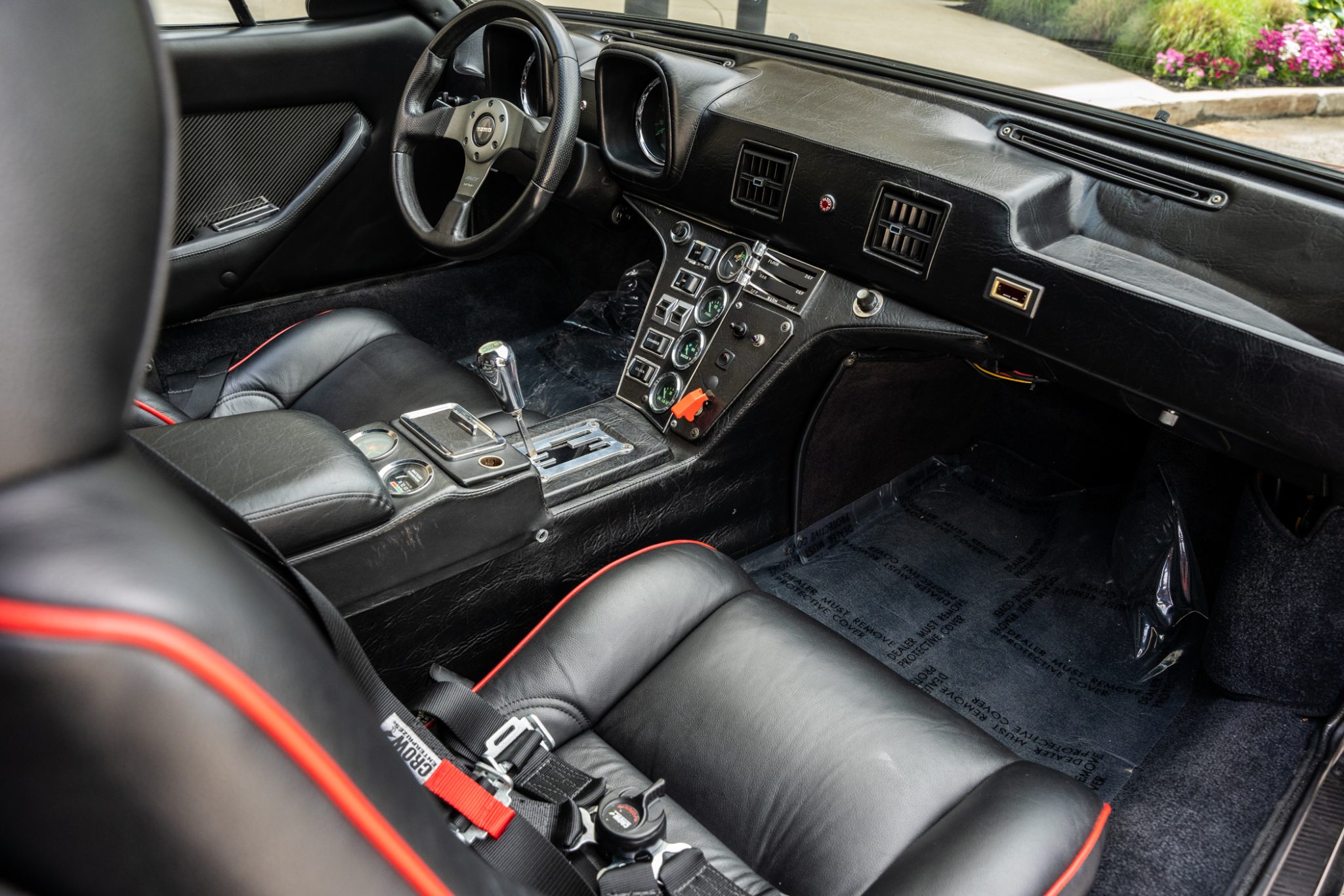 The car was refurbished and modified which included an exterior color change, an engine rebuild, an interior refresh, and installation of wheel-arch flares and staggered-diameter wheels. The 397ci V8 is paired with a five-speed manual transaxle, and additional features include a gated shifter, power-operated windows, a MOMO steering wheel, a disconnected nitrous-oxide injection system, and bucket seats with black leather upholstery.