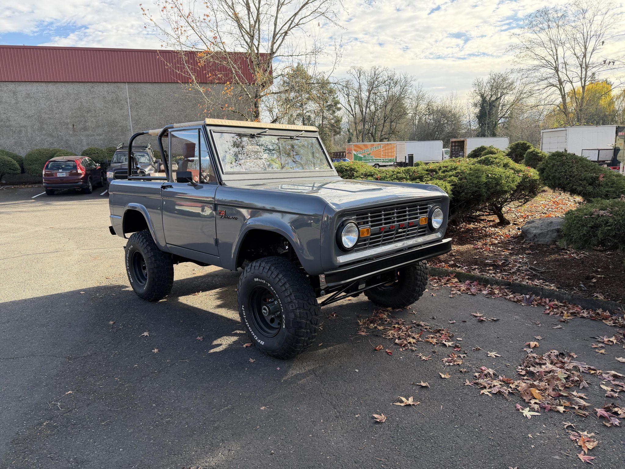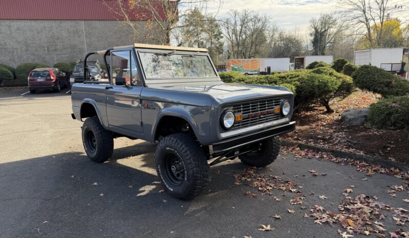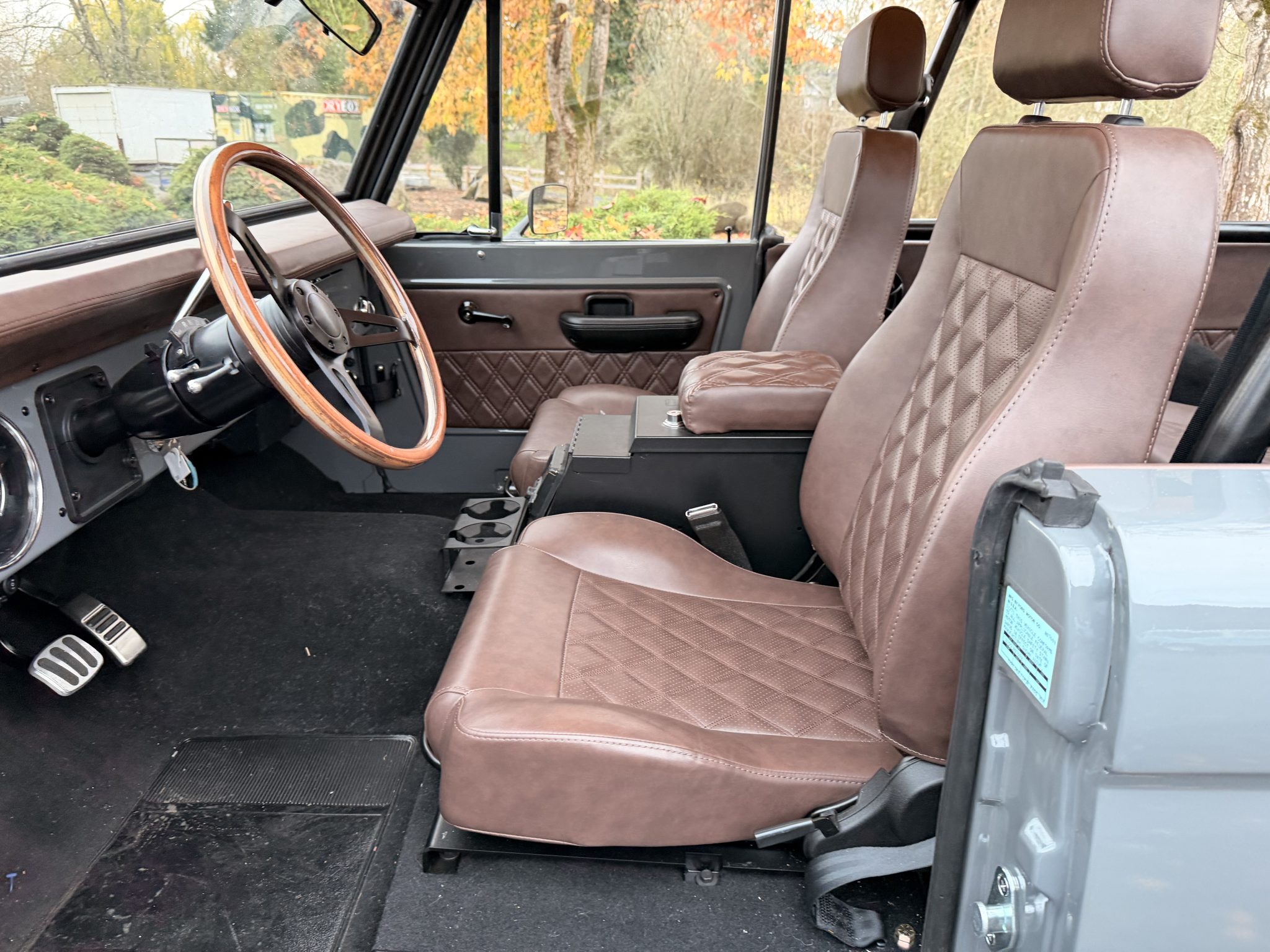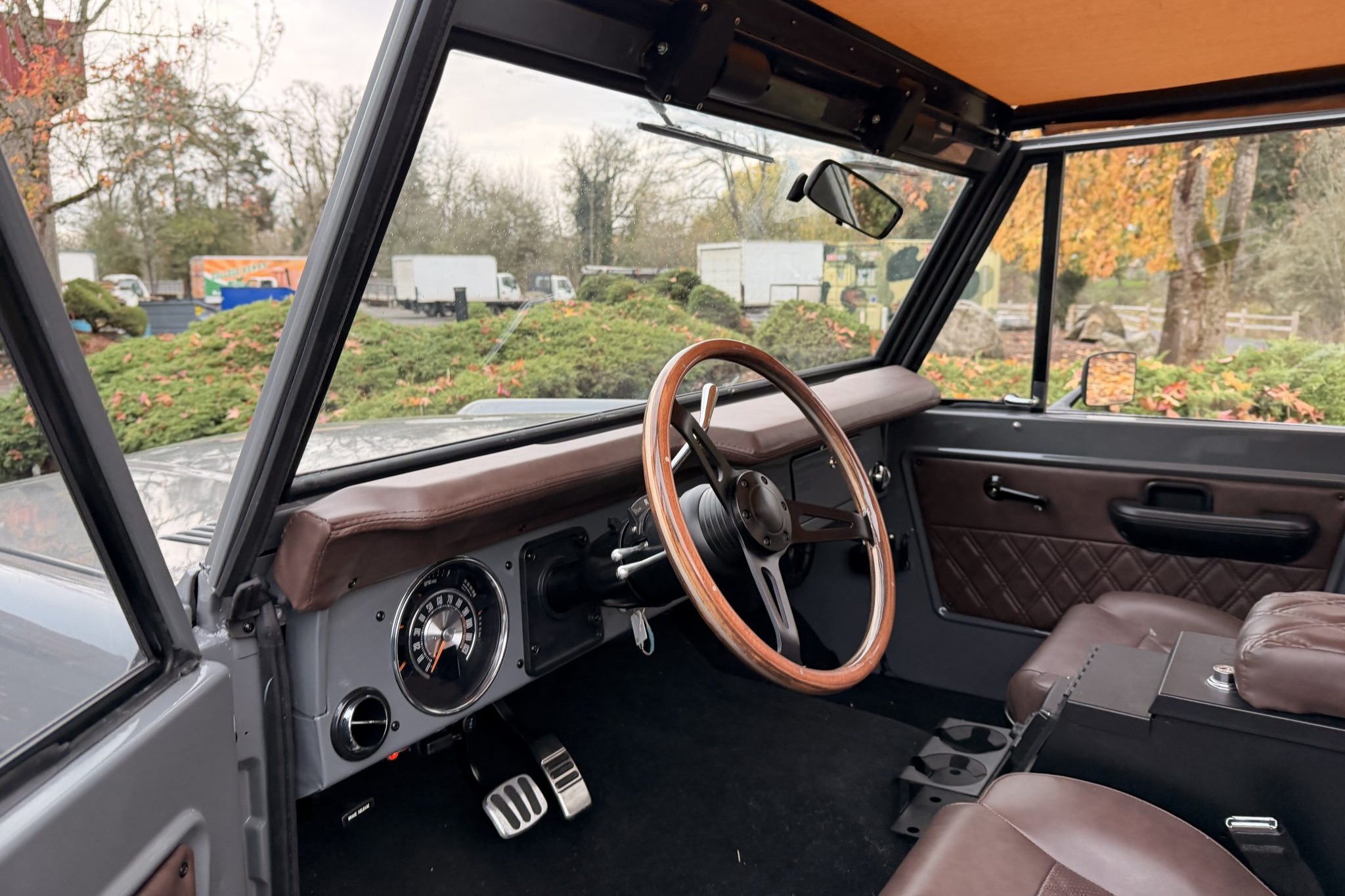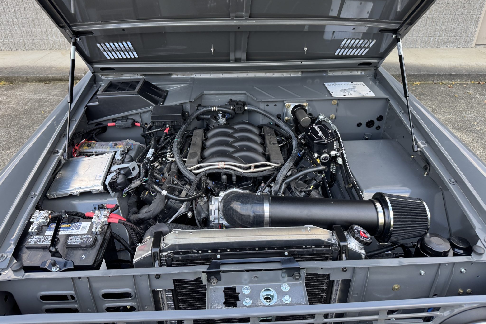 This 1972 Ford Bronco was rebuilt, included installing a 5.0-liter Gen 3 Coyote V8 and a 10R80 ten-speed automatic transmission. The replacement bodywork is finished in Arabian Gray with a black family-style roll cage and is mounted to a Throttle Down Kustoms frame. It rides on 15″ black alloy wheels with a suspension lift, Bilstein shocks, and four-wheel Wilwood disc brakes with hydroboost. The cabin is outfitted with air conditioning, aftermarket front bucket and rear bench seats with diamond-pattern stitching, a locking center console, a Wet Sounds stereo system, and an ididit tilt steering column.
