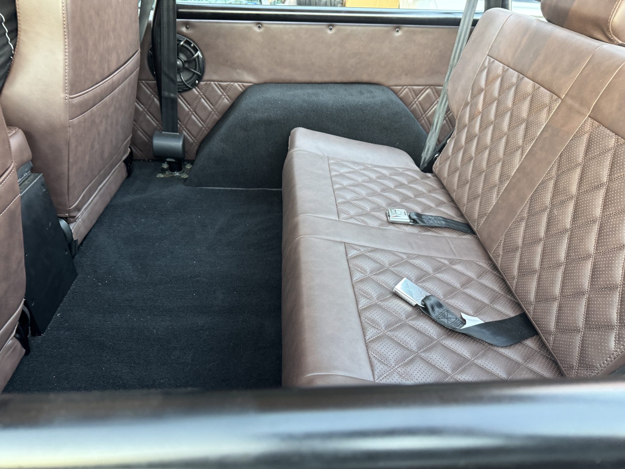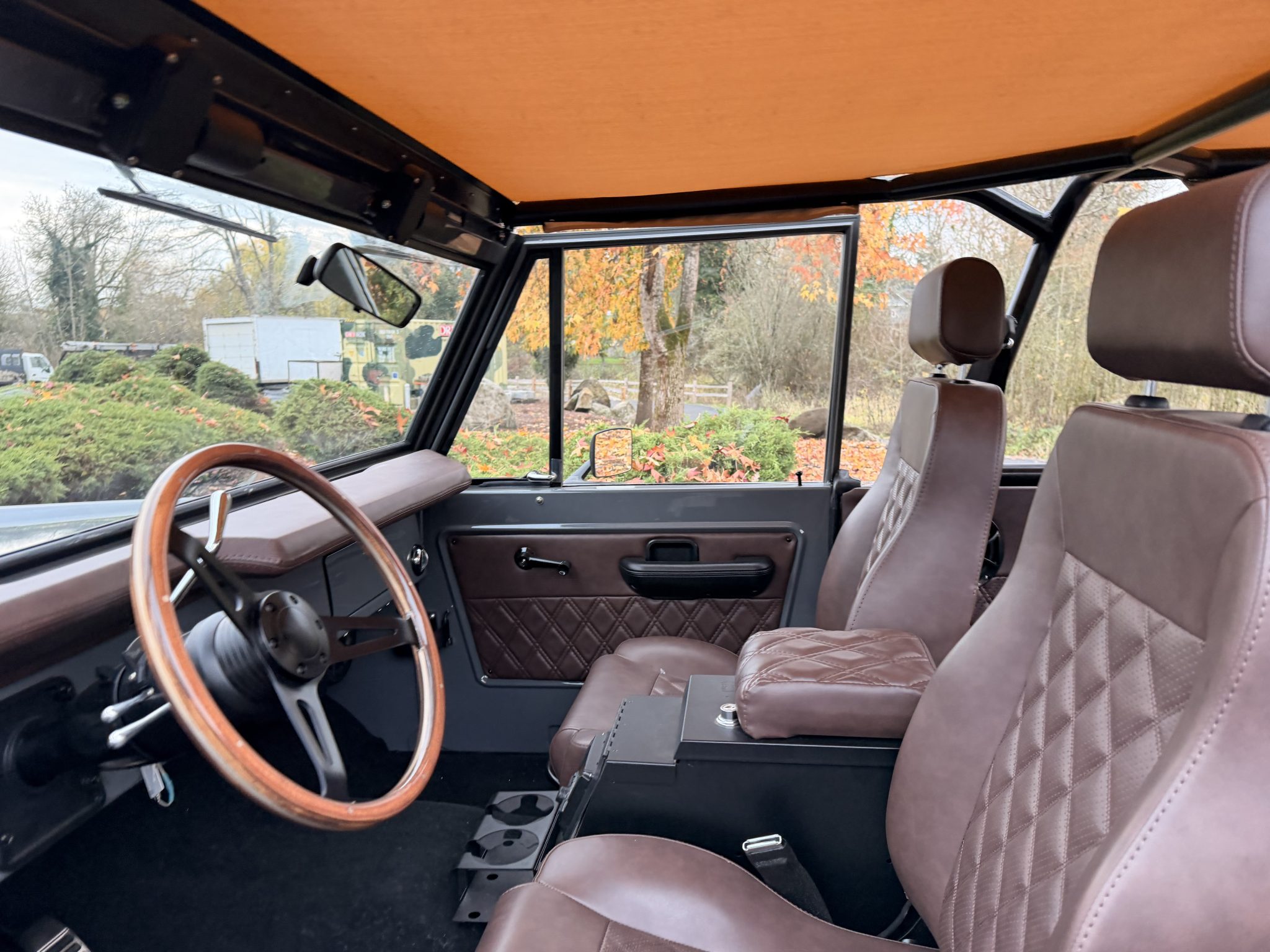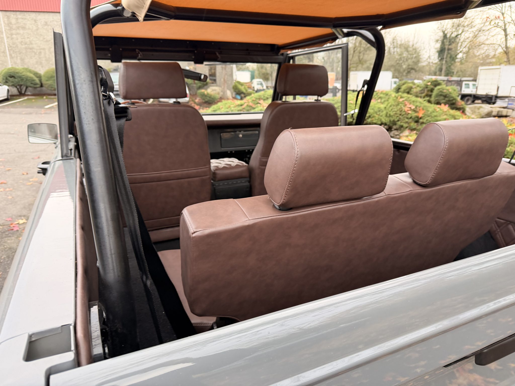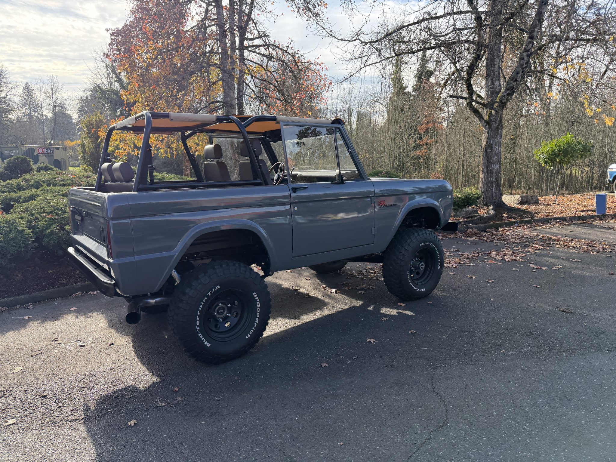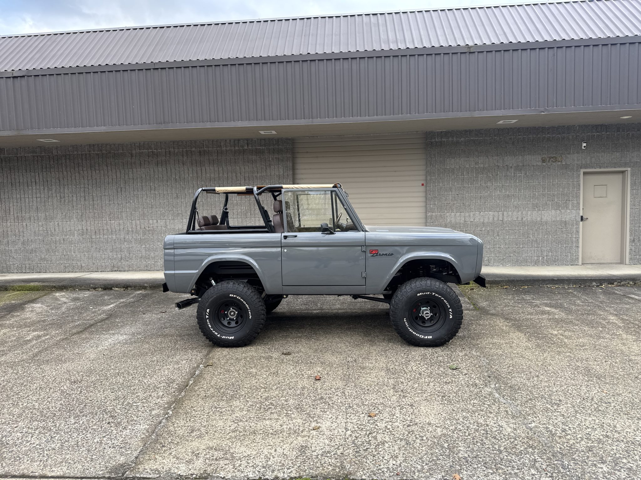 This 1972 Ford Bronco was rebuilt, included installing a 5.0-liter Gen 3 Coyote V8 and a 10R80 ten-speed automatic transmission. The replacement bodywork is finished in Arabian Gray with a black family-style roll cage and is mounted to a Throttle Down Kustoms frame. It rides on 15″ black alloy wheels with a suspension lift, Bilstein shocks, and four-wheel Wilwood disc brakes with hydroboost. The cabin is outfitted with air conditioning, aftermarket front bucket and rear bench seats with diamond-pattern stitching, a locking center console, a Wet Sounds stereo system, and an ididit tilt steering column.
