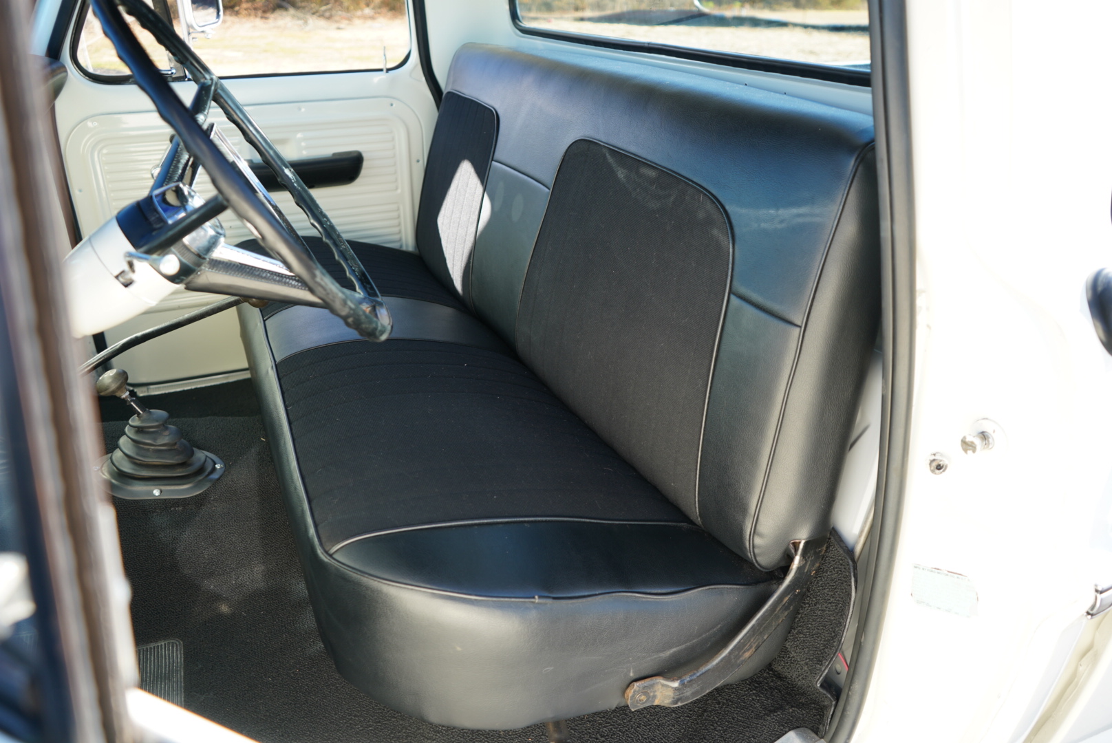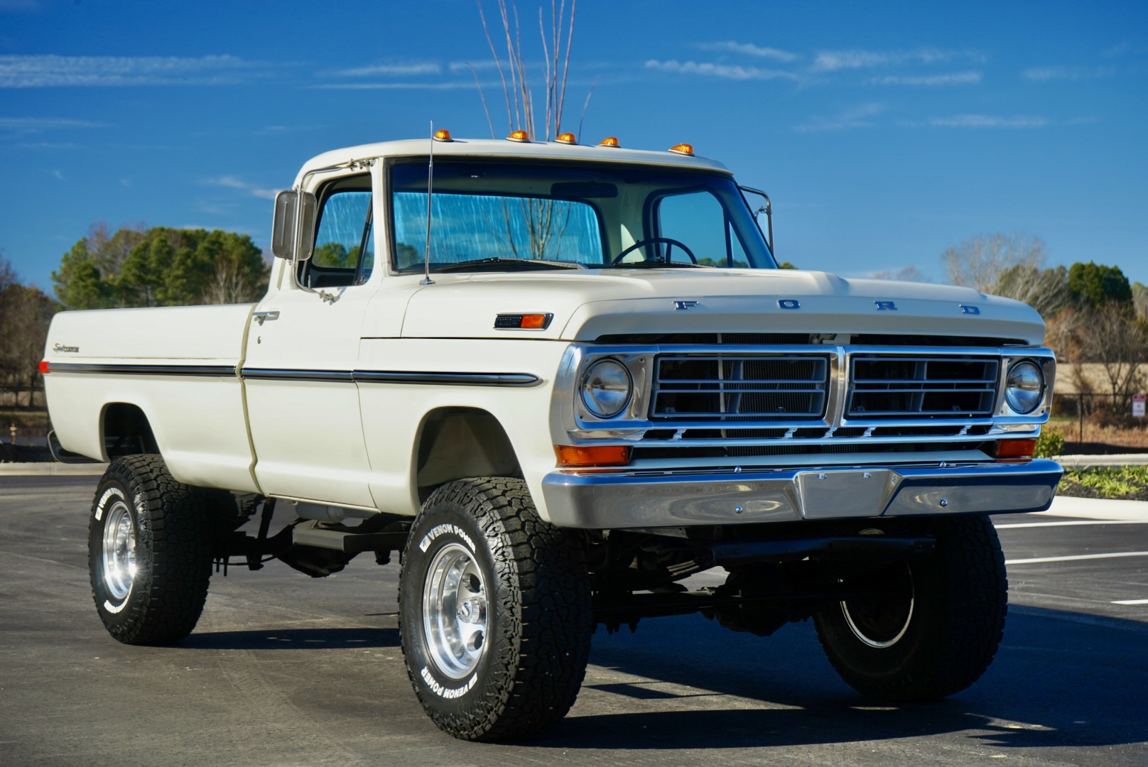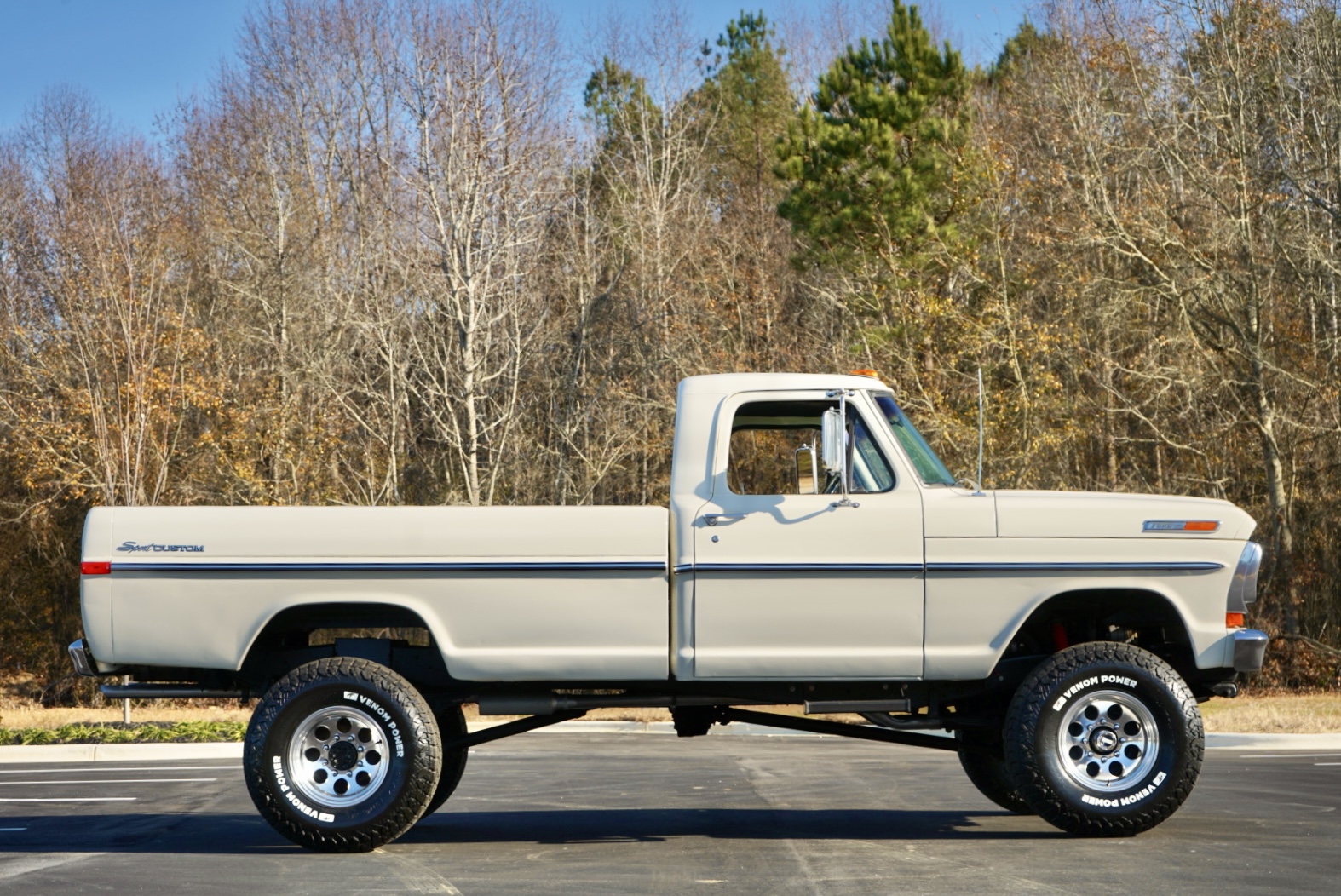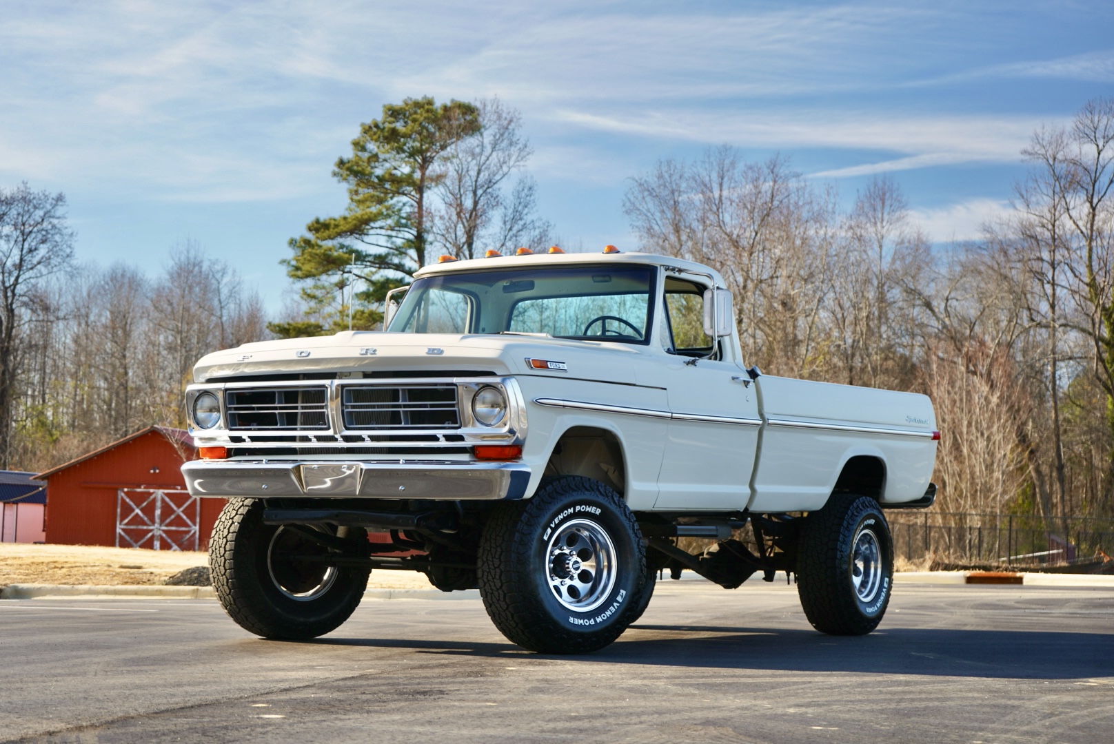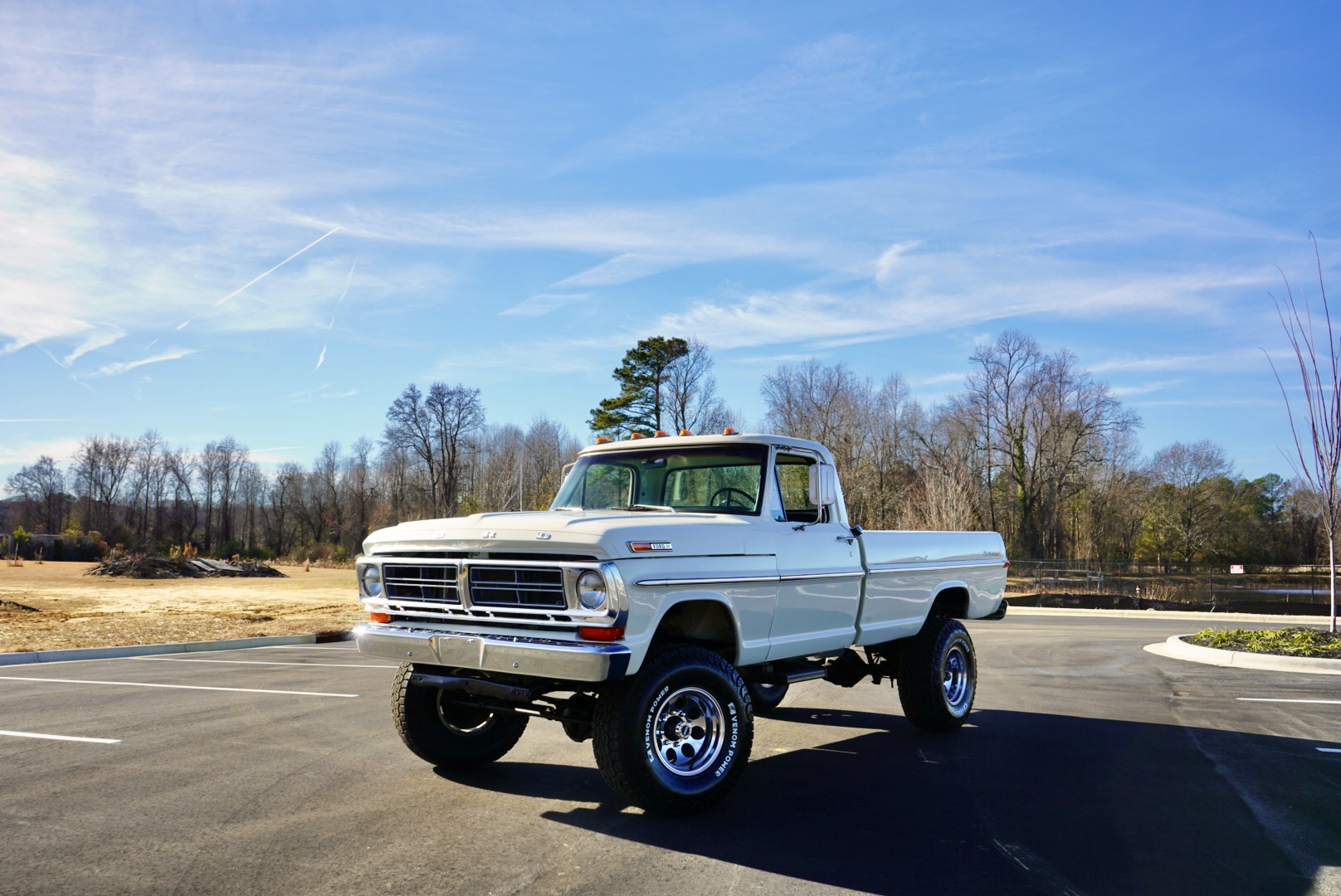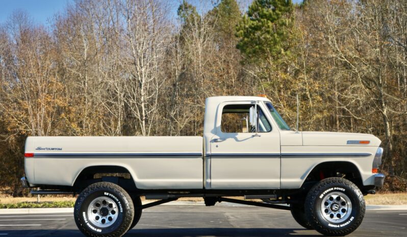 The body was refinished in Wimbledon White and mounted on a 2″ body lift kit, while the interior was re-trimmed with black vinyl and cloth seat upholstery. Power is provided by a replacement 360ci V8 that is topped with an Edelbrock intake manifold and carburetor and linked to a four-speed manual transmission and a divorced dual-range transfer case. Additional equipment includes a Dana 60 rear axle, aftermarket side steps, a spray-in bedliner, chrome bumpers and side moldings, and a dual exhaust system with long-tube headers and Flowmaster mufflers.
