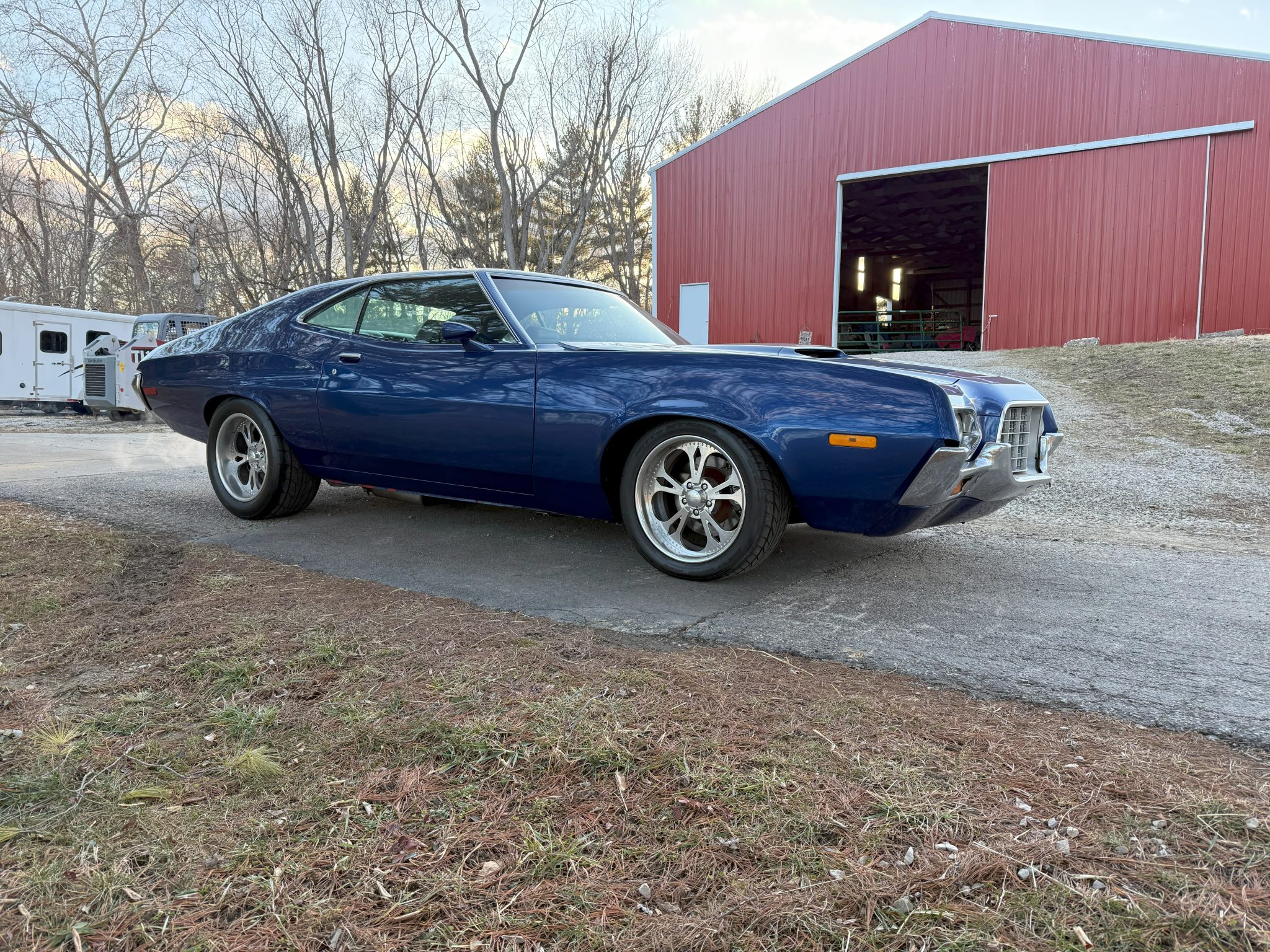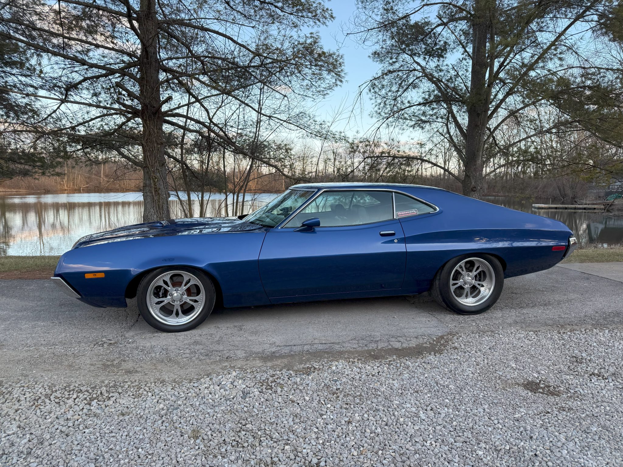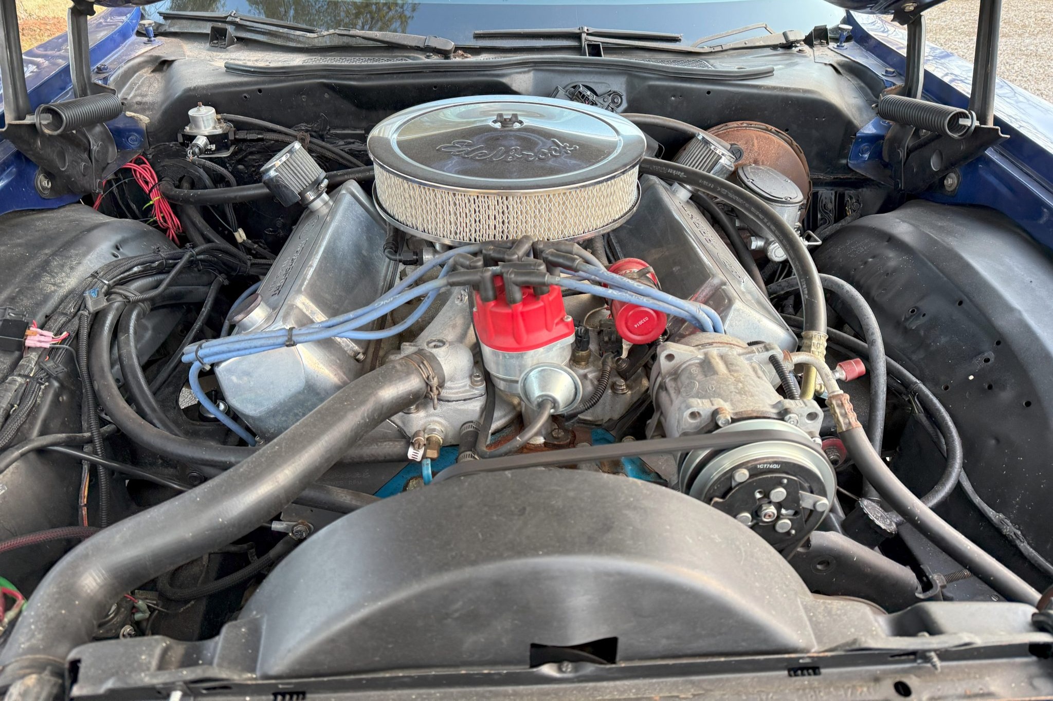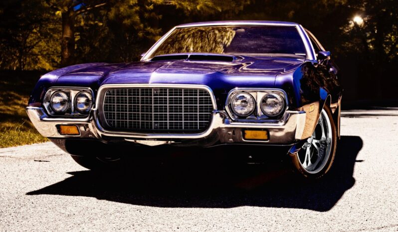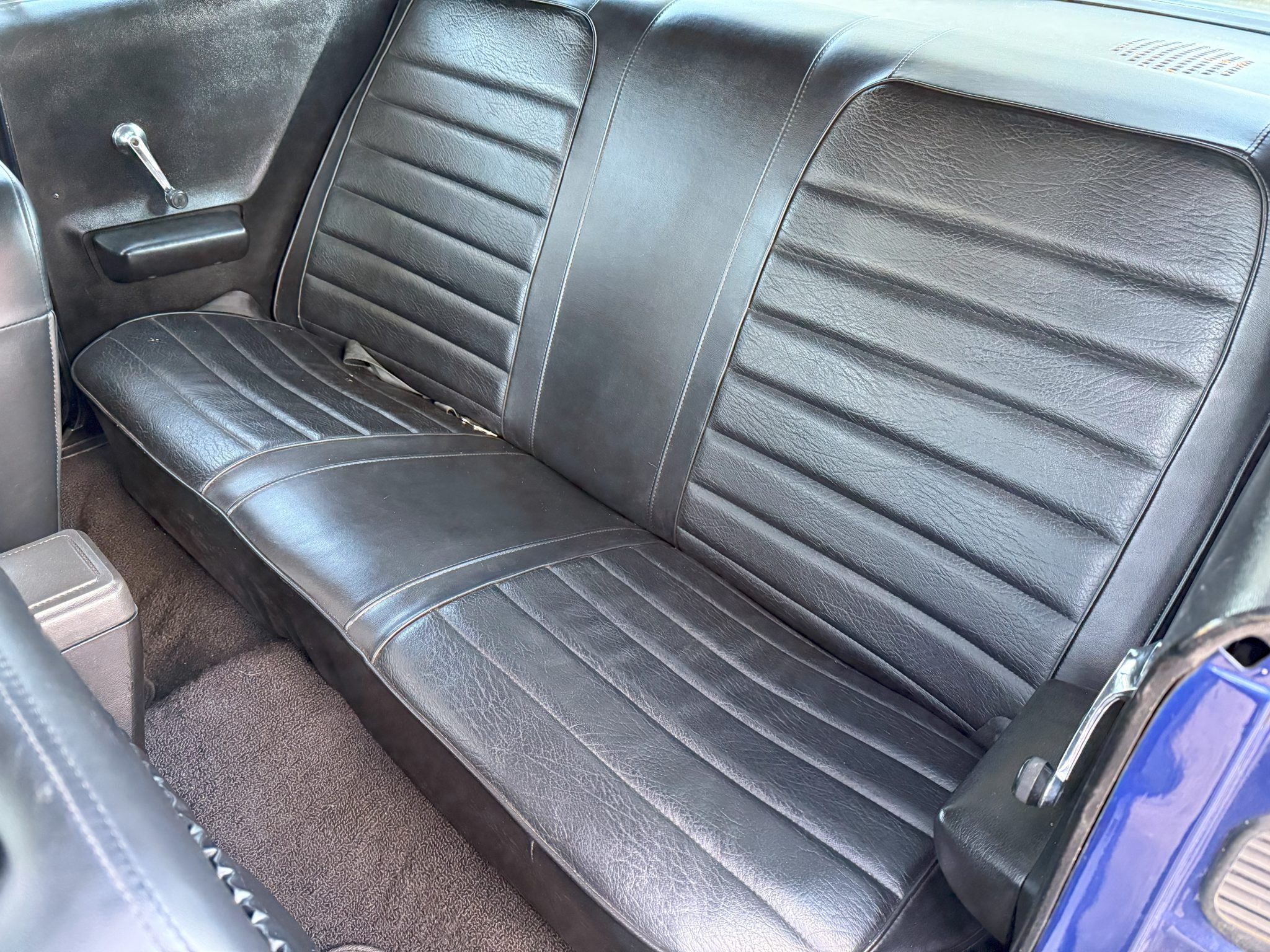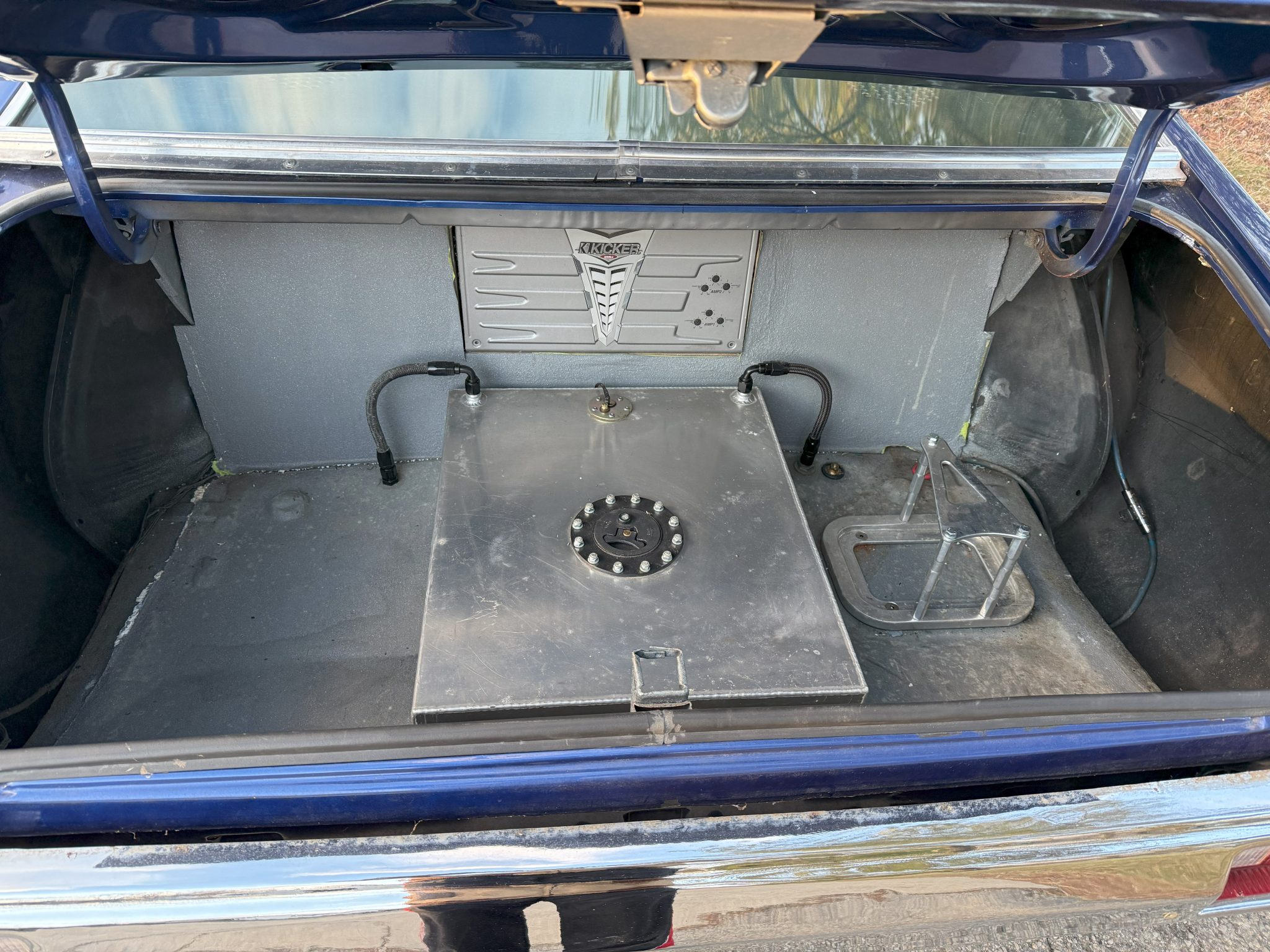 work since involved adding Holley electronic fuel injection and rebuilding the 502ci V8. The car was refinished in blue and is equipped with a three-speed automatic transmission, a 9″ rear end with a Detroit TrueTrac differential, 31-spline Moser axles, a trunk-housed fuel cell, 18″ Bonspeed Wild Thang wheels, Wilwood four-wheel disc brakes, power steering, and Flowmaster mufflers. The interior features aftermarket front bucket seats, a replacement rear bench, headliner, and carpeting, a center console, Vintage Air air conditioning, and an aftermarket stereo, speakers, and Kicker amplifier.