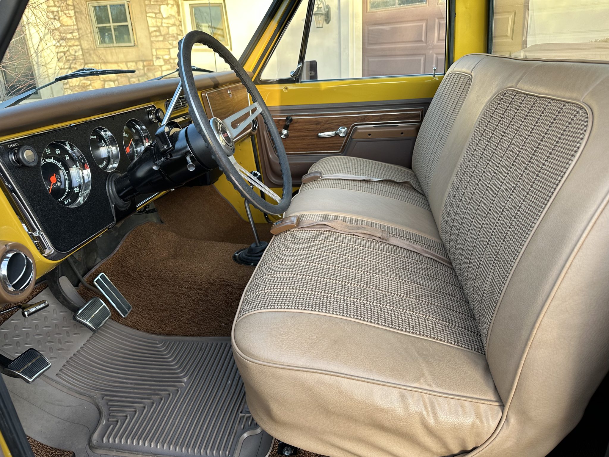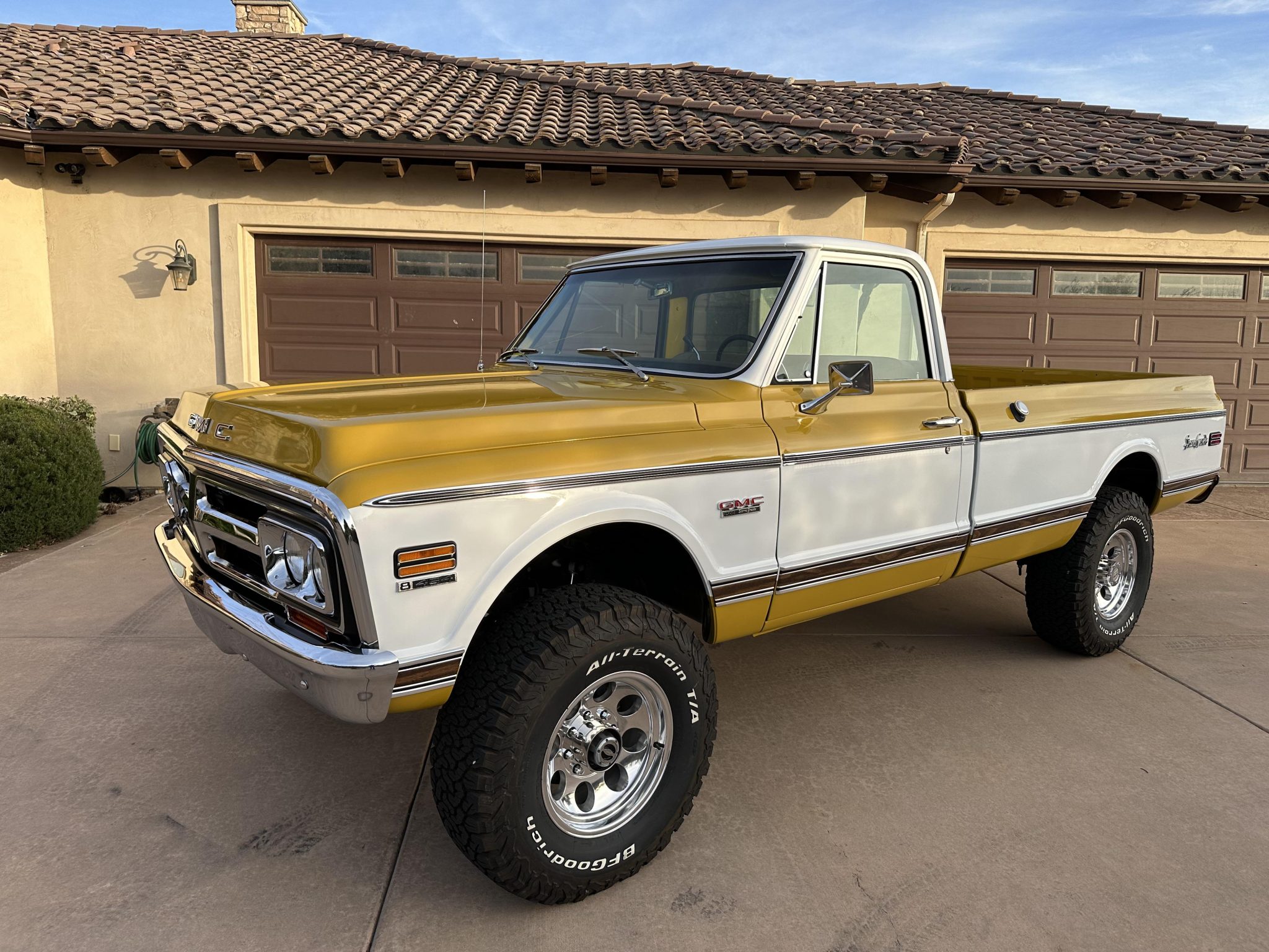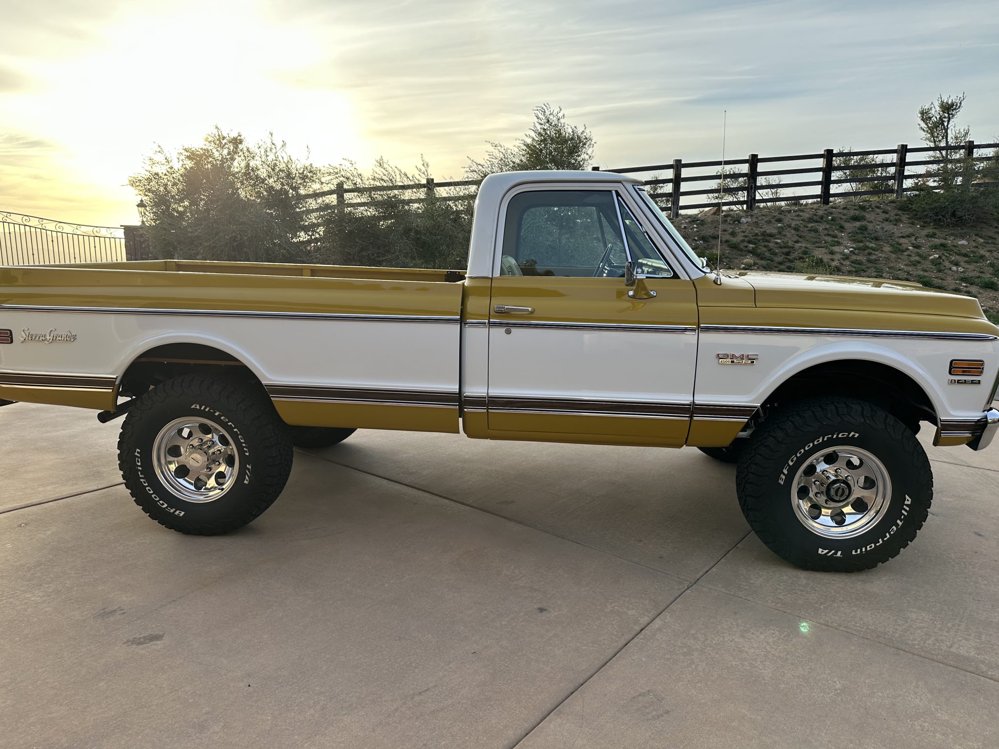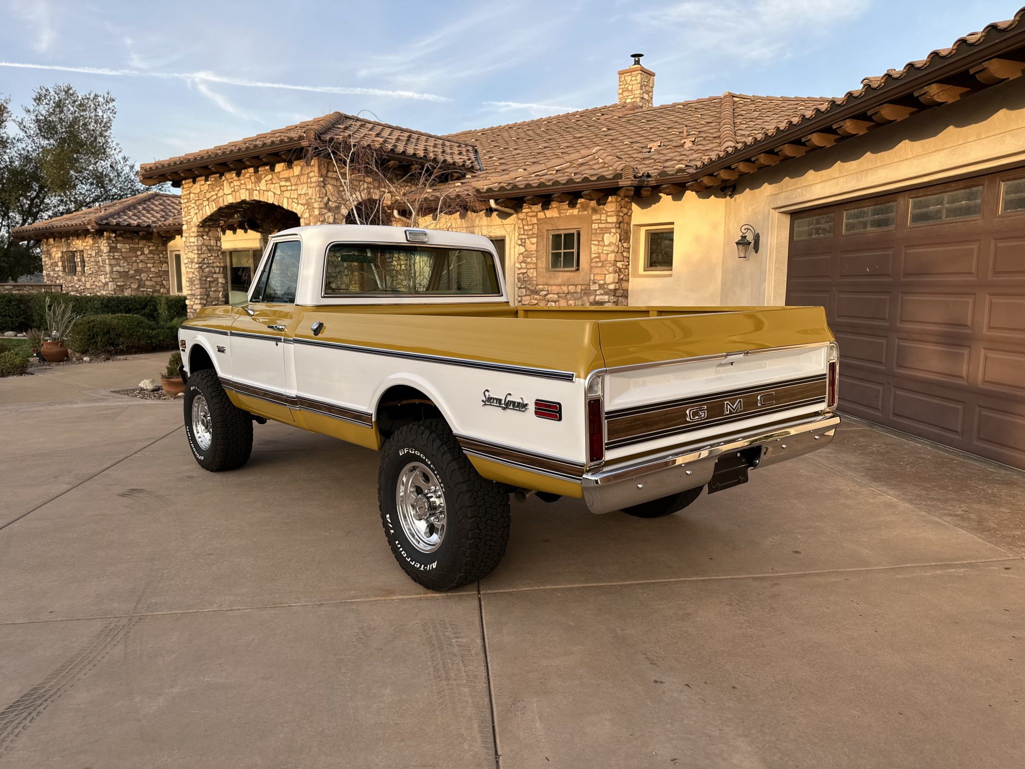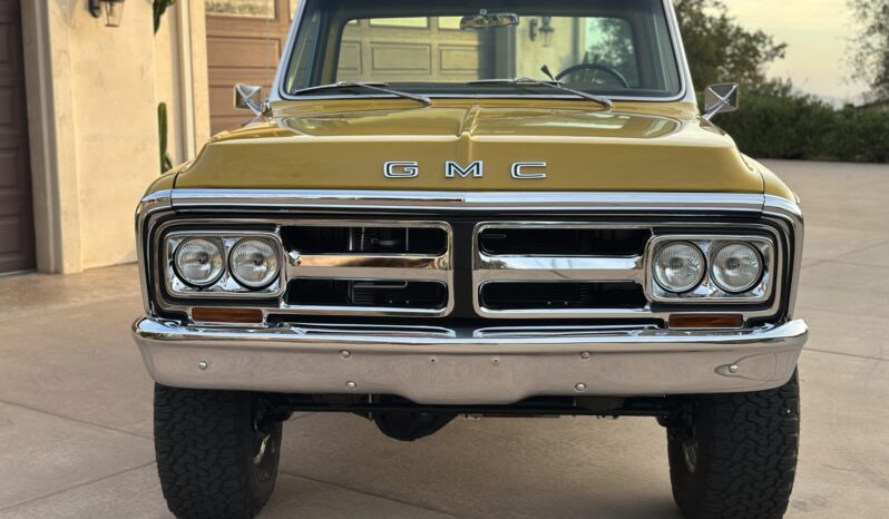 This 1972 GMC K2500 Sierra Grande was retrofitted in 2016 with a 454ci V8. A refurbishment that began in 2022 was completed in 2025, which involved a repaint and exterior refresh, overhauling the interior, and adding a dual exhaust system, a 4″ lift, 17″ Pro Comp wheels with 35″ KO2’s, and a red oak bed floor. The truck was finished at the factory in Ochre and white, and it also features a TH350 three-speed automatic, power steering, front disc brakes, Pioneer speakers, a Bluetooth-capable stereo, tan upholstery with houndstooth inserts, and Vintage Air climate control.
