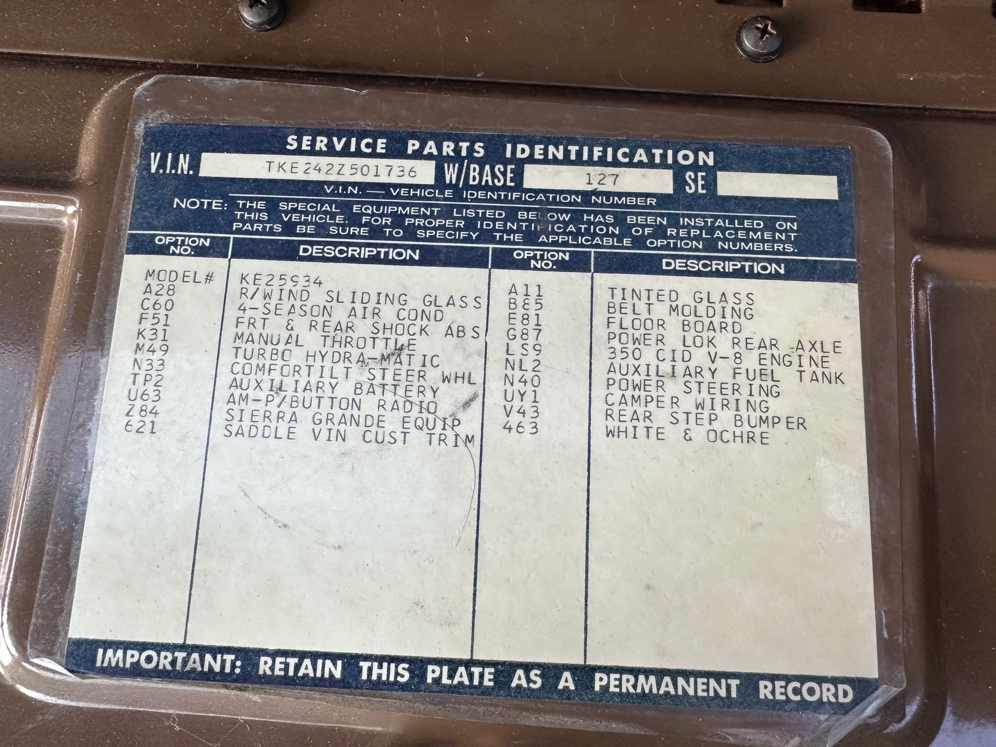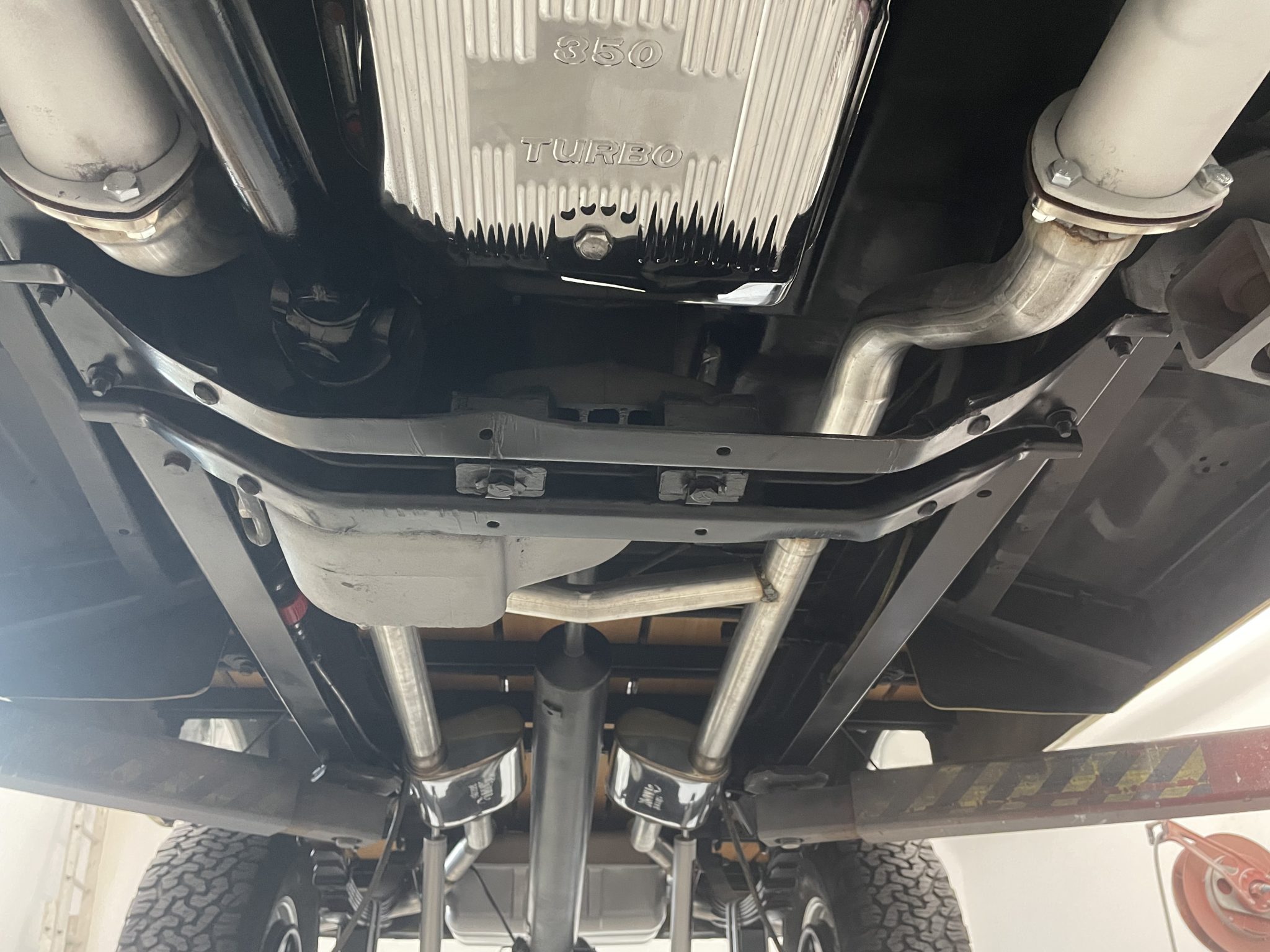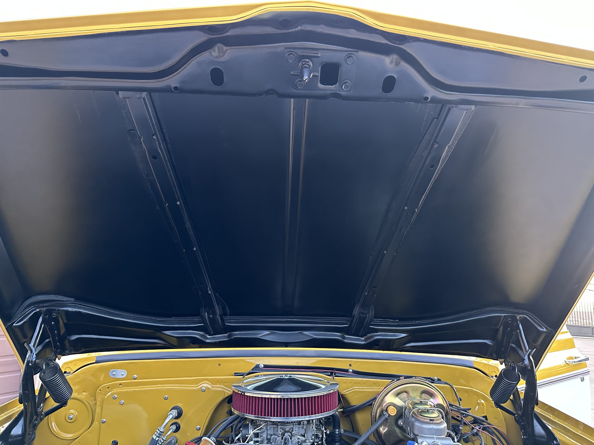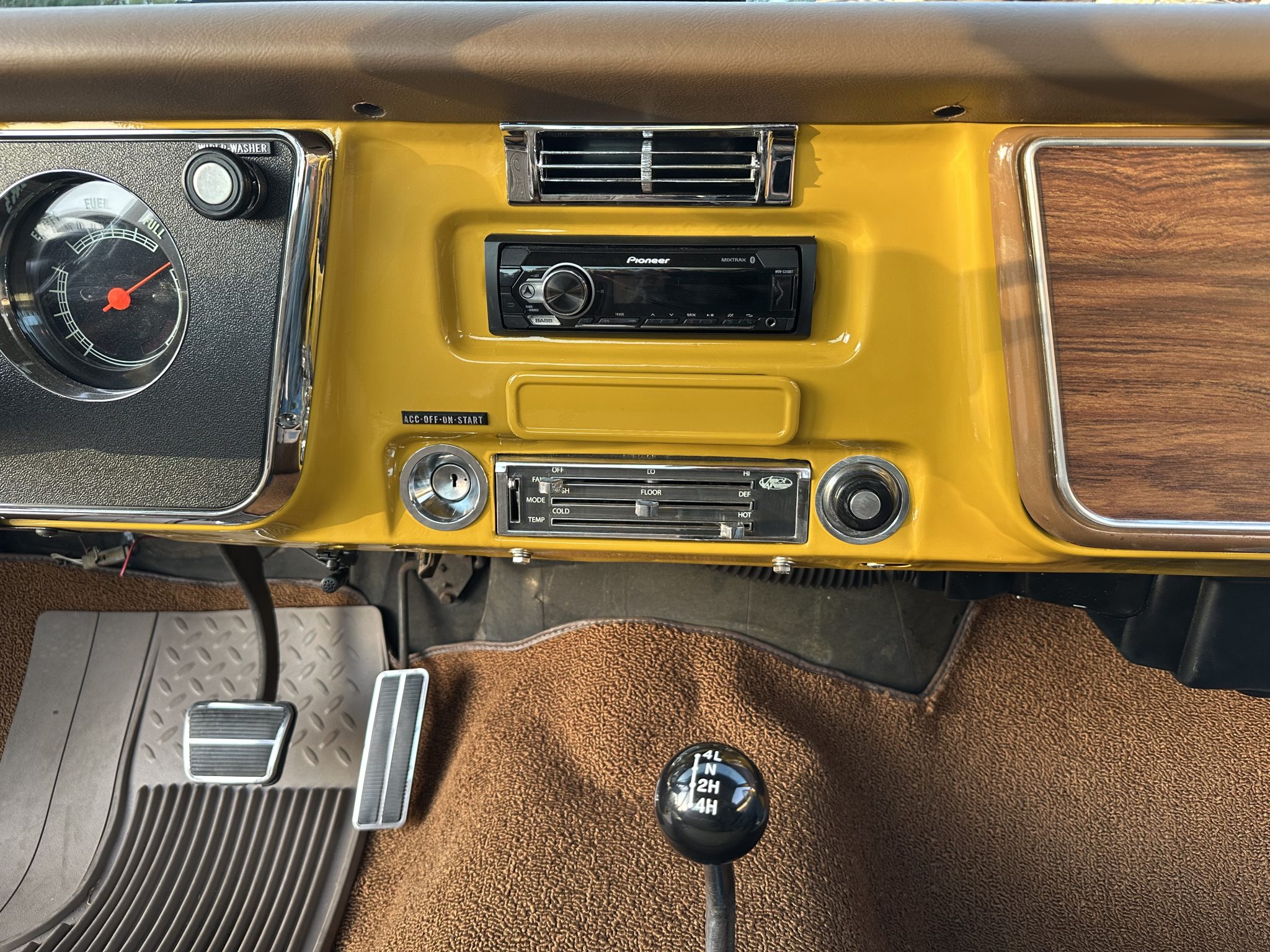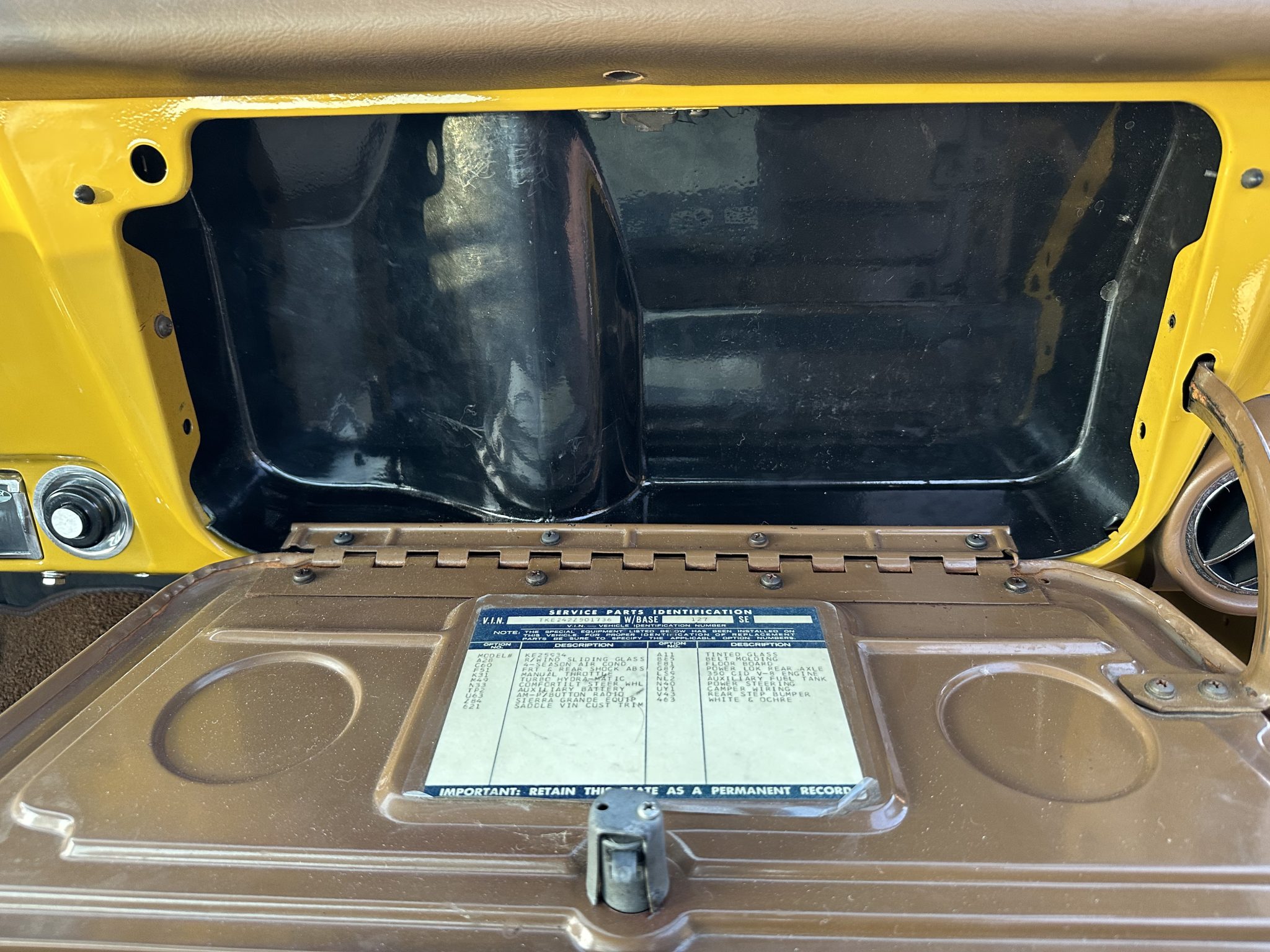 This 1972 GMC K2500 Sierra Grande was retrofitted in 2016 with a 454ci V8. A refurbishment that began in 2022 was completed in 2025, which involved a repaint and exterior refresh, overhauling the interior, and adding a dual exhaust system, a 4″ lift, 17″ Pro Comp wheels with 35″ KO2’s, and a red oak bed floor. The truck was finished at the factory in Ochre and white, and it also features a TH350 three-speed automatic, power steering, front disc brakes, Pioneer speakers, a Bluetooth-capable stereo, tan upholstery with houndstooth inserts, and Vintage Air climate control.