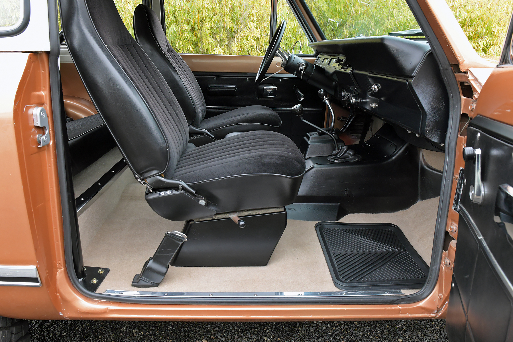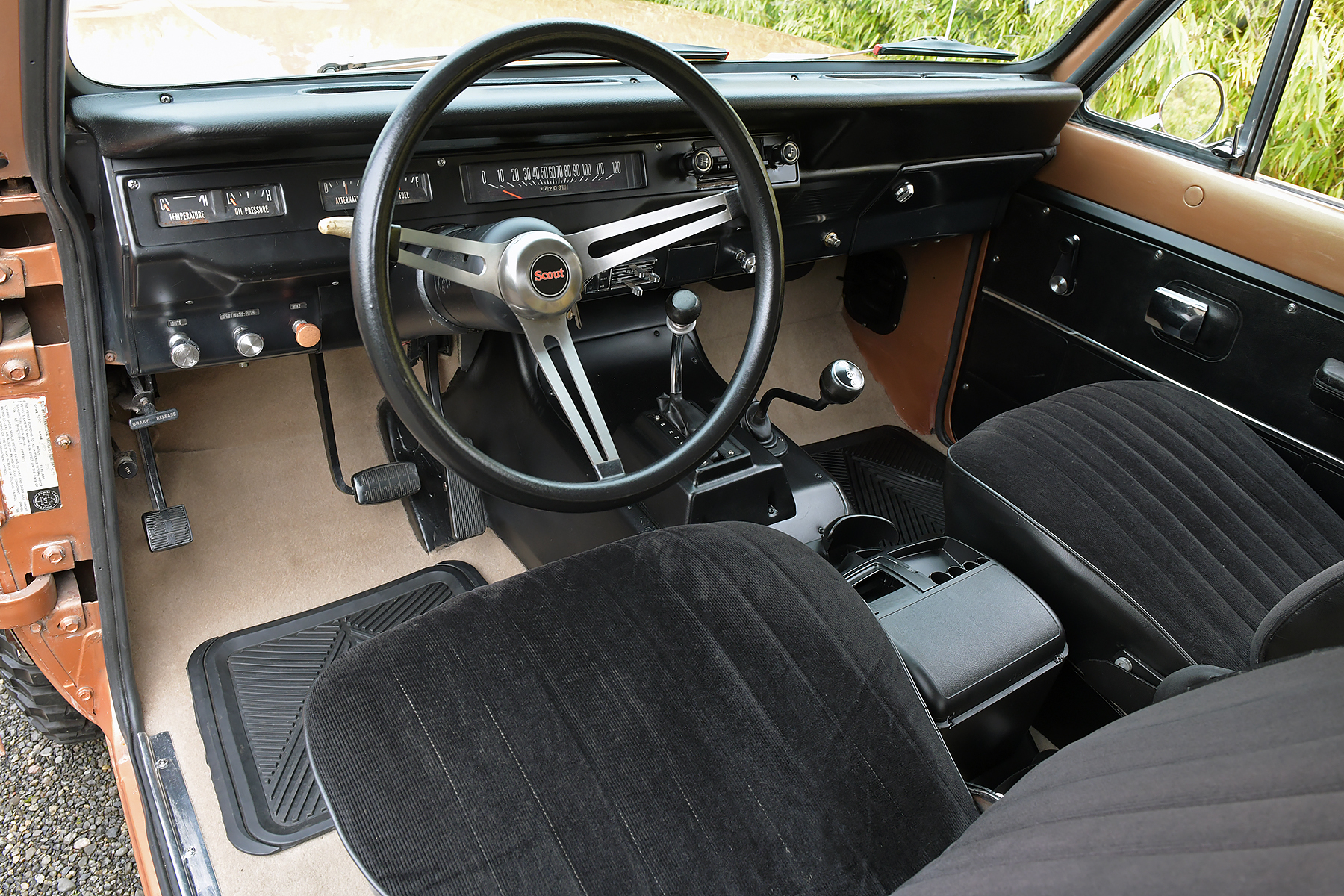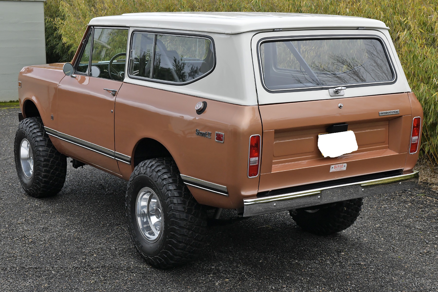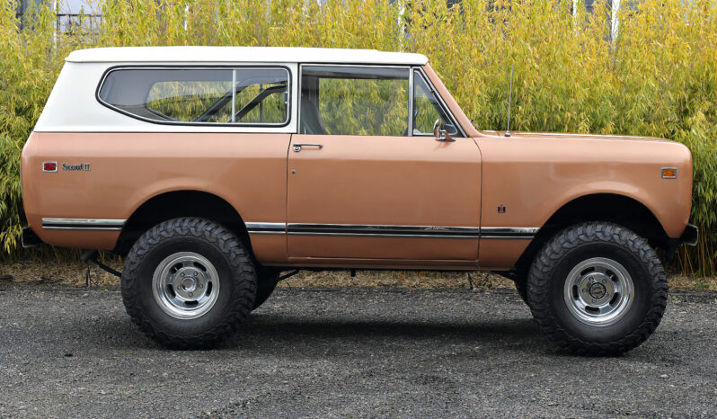 This 1972 International Harvester Scout II is powered by a 345ci V8 equipped with a Holley carburetor and linked to a three-speed automatic transmission and a dual-range transfer case. Finished in Rose Gold with a removable hardtop over black upholstery, the truck rides on a lifted suspension along with 15″ alloy wheels wrapped in 33″ BFGoodrich tires. Equipment includes Warn manually locking front hubs, power steering and brakes, a roll bar, front bucket seats, a folding rear bench, and a heater.