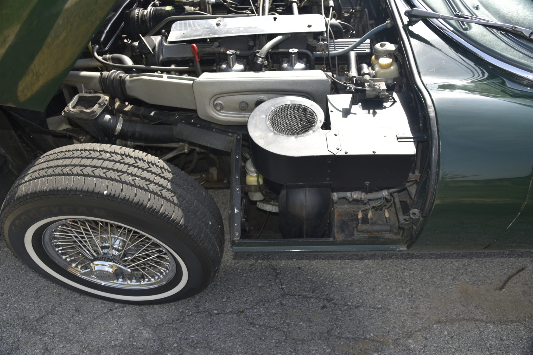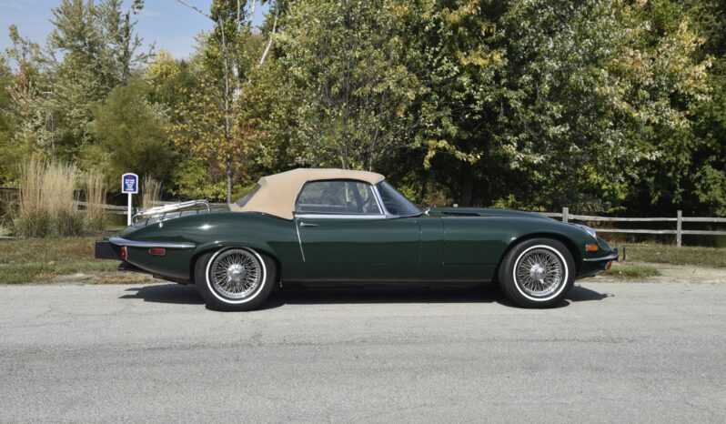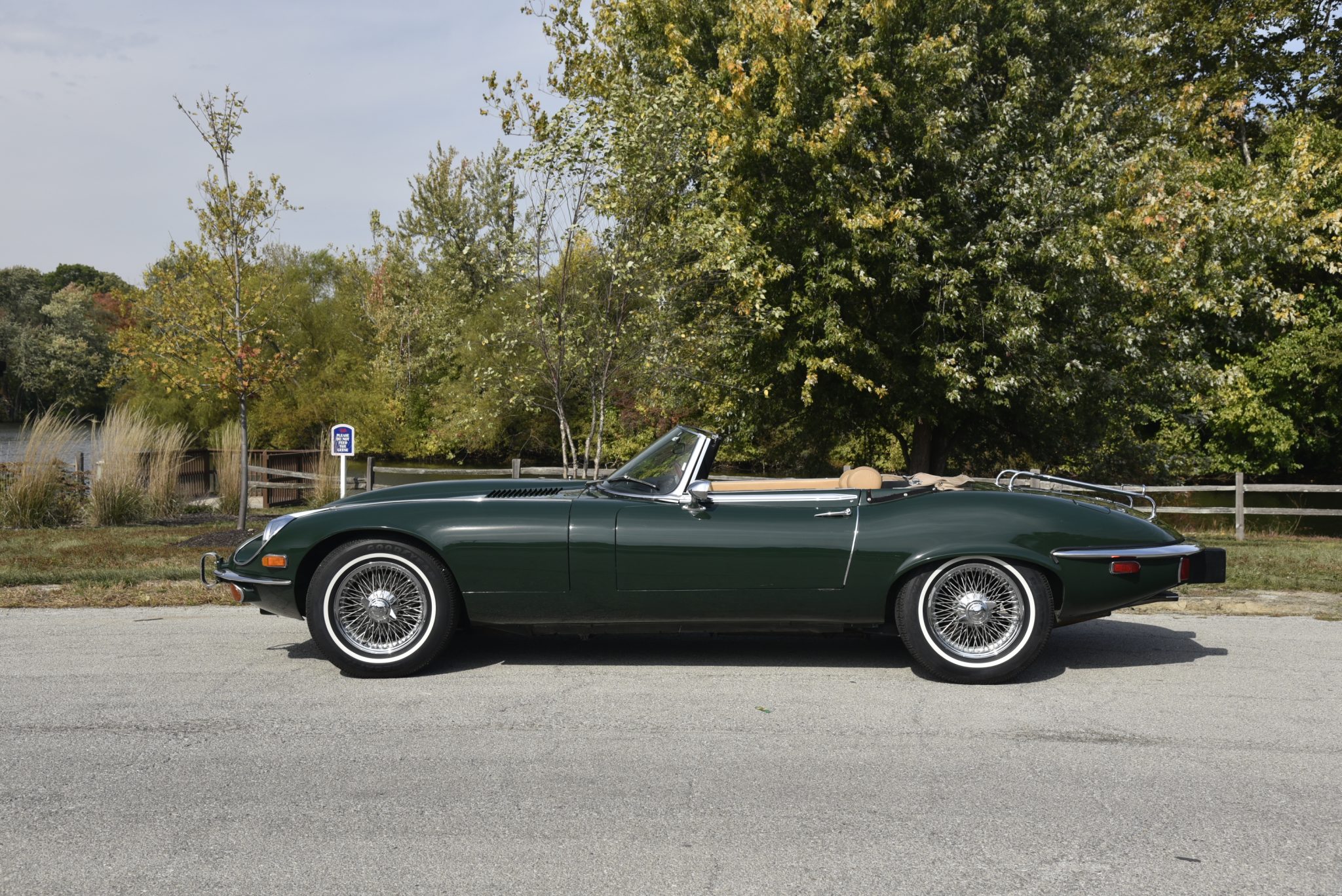 This 1972 Jaguar E-Type Series III roadster is powered by a 5.3-liter V12 linked with a four-speed manual transmission and a limited-slip differential. The car is finished in British Racing Green over tan leather, and features include a tan soft top, four-wheel disc brakes, power steering, 15” knock-off wire wheels, quadruple carburetors, a Nardi steering wheel, and a CD stereo.