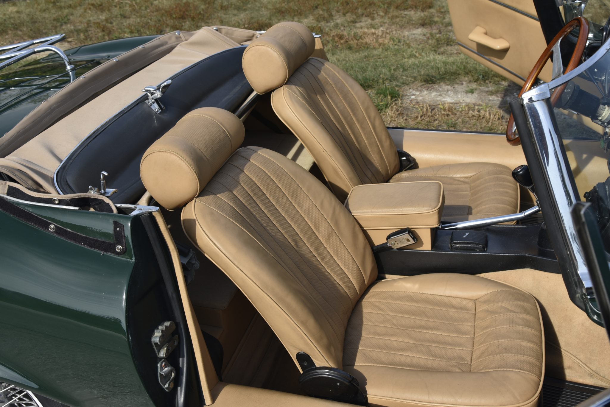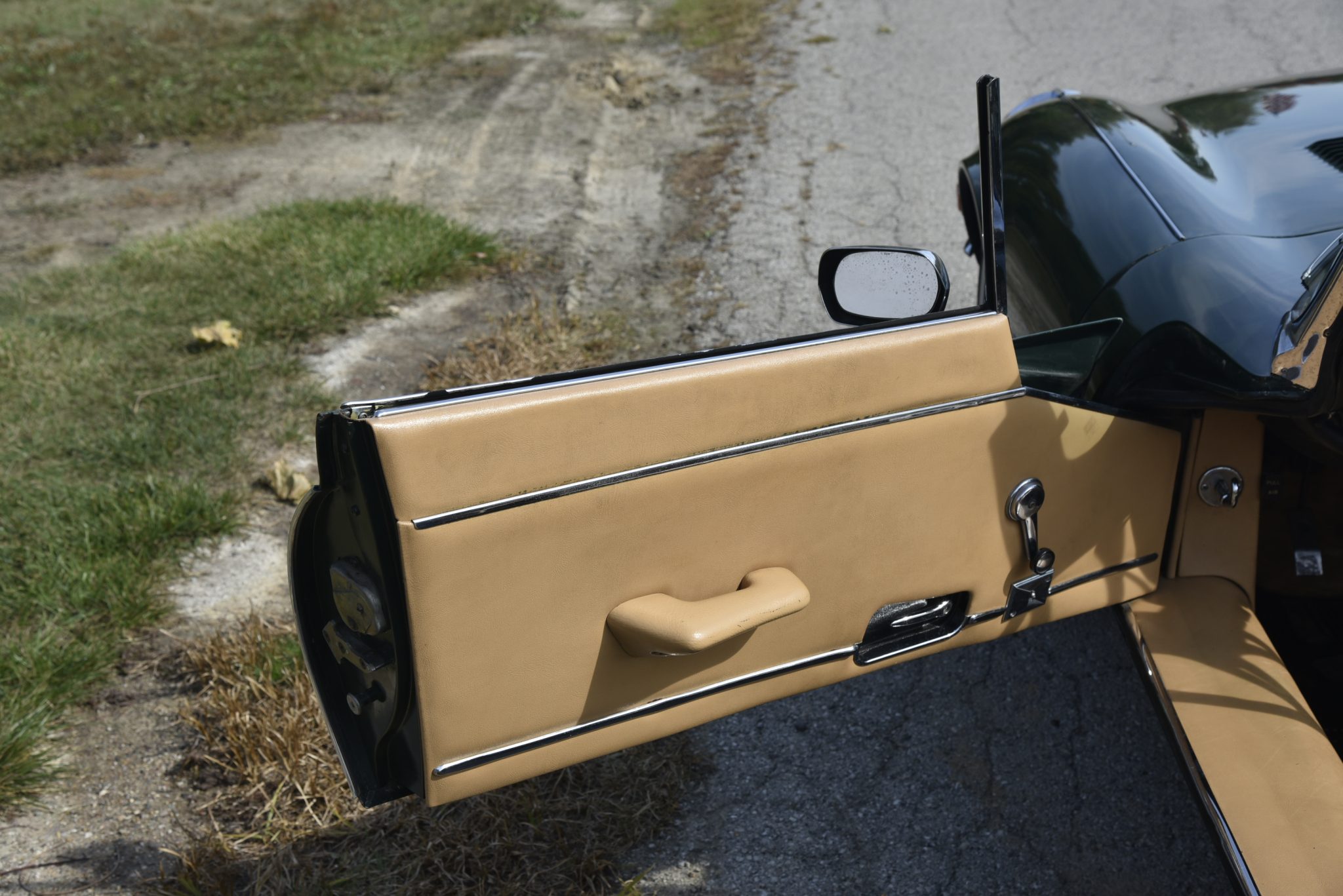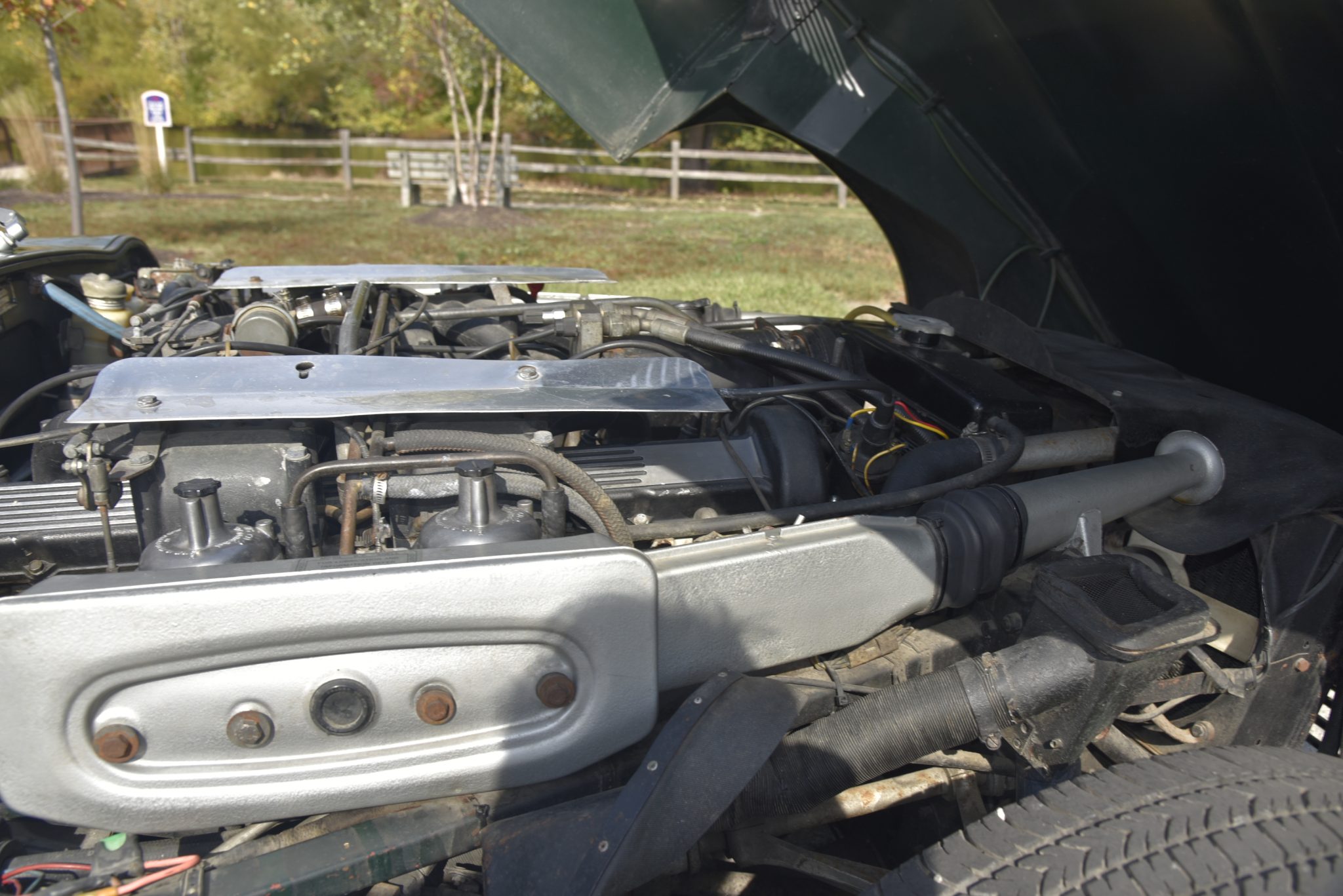 This 1972 Jaguar E-Type Series III roadster is powered by a 5.3-liter V12 linked with a four-speed manual transmission and a limited-slip differential. The car is finished in British Racing Green over tan leather, and features include a tan soft top, four-wheel disc brakes, power steering, 15” knock-off wire wheels, quadruple carburetors, a Nardi steering wheel, and a CD stereo.