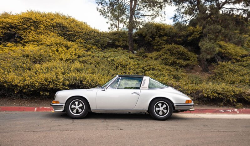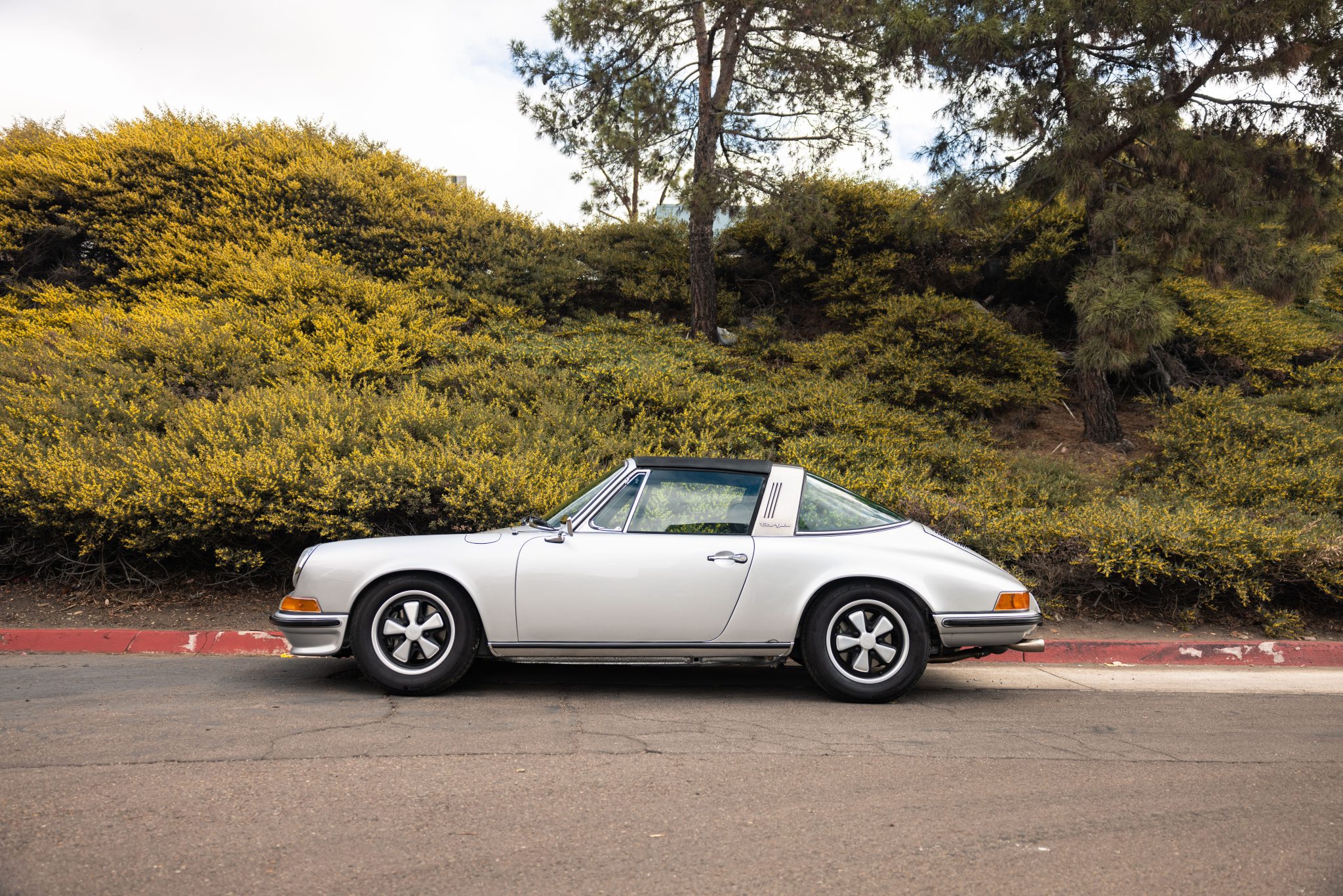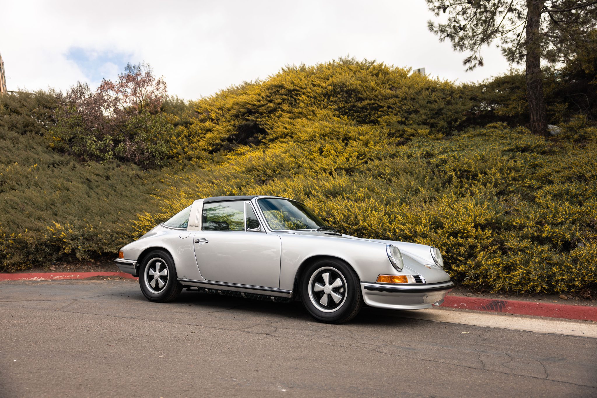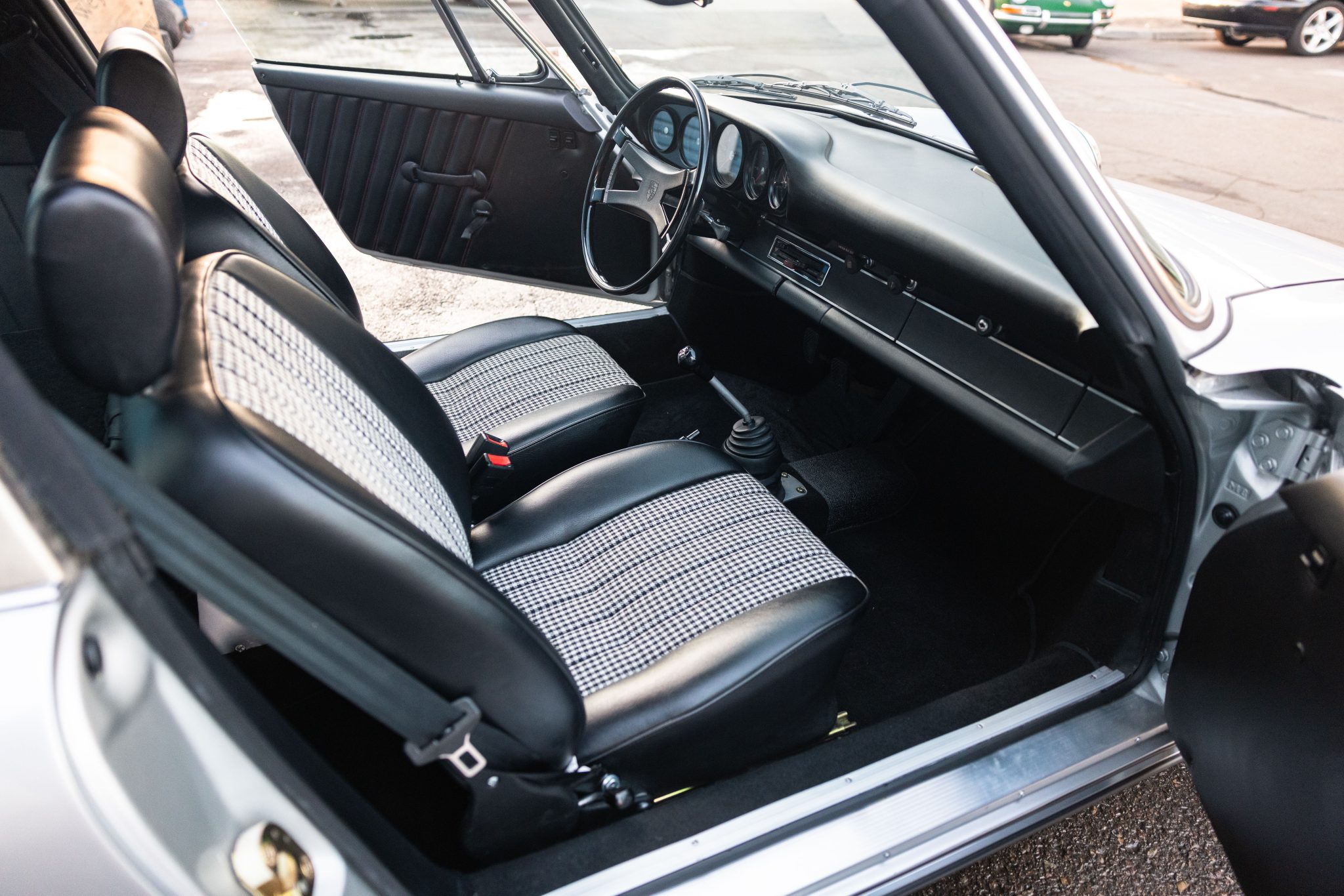 This 1972 Porsche 911S Targa was refurbished and modified in 2024, including a repaint and the installation of a twin-plug 3.2L flat-six and a 915 five-speed manual transaxle. The car is finished in silver metallic over black leatherette and houndstooth cloth, and equipment includes SSI heat exchangers, a removable roof panel, a stainless-steel Targa bar, H4 headlights, Euro-spec bumpers, a front spoiler, and 15″ Fuchs alloy wheels.