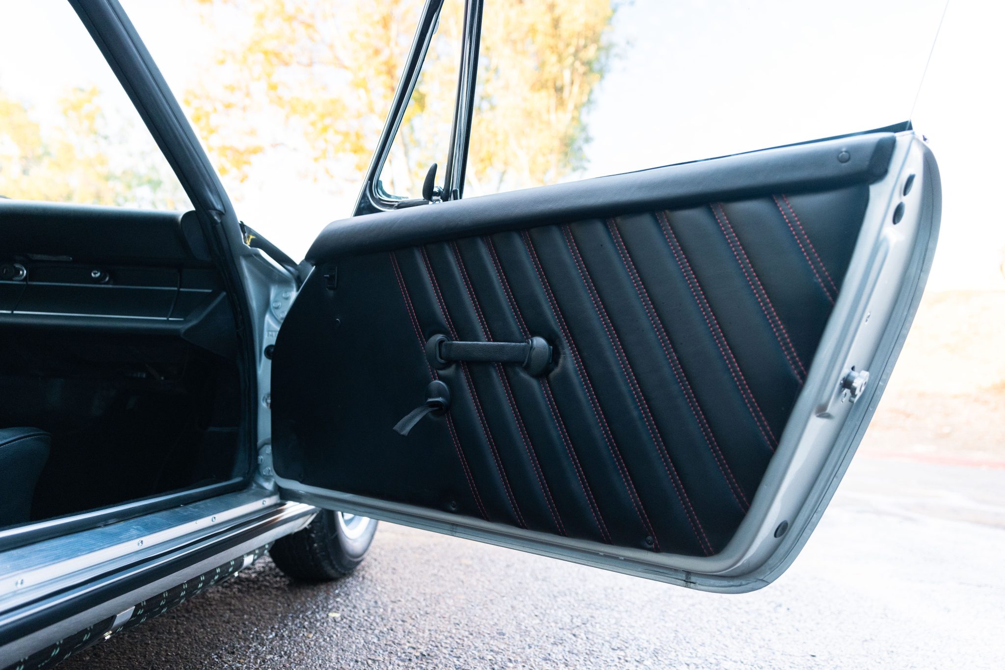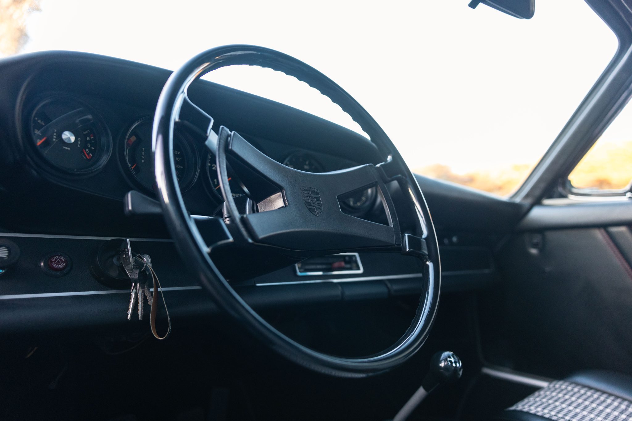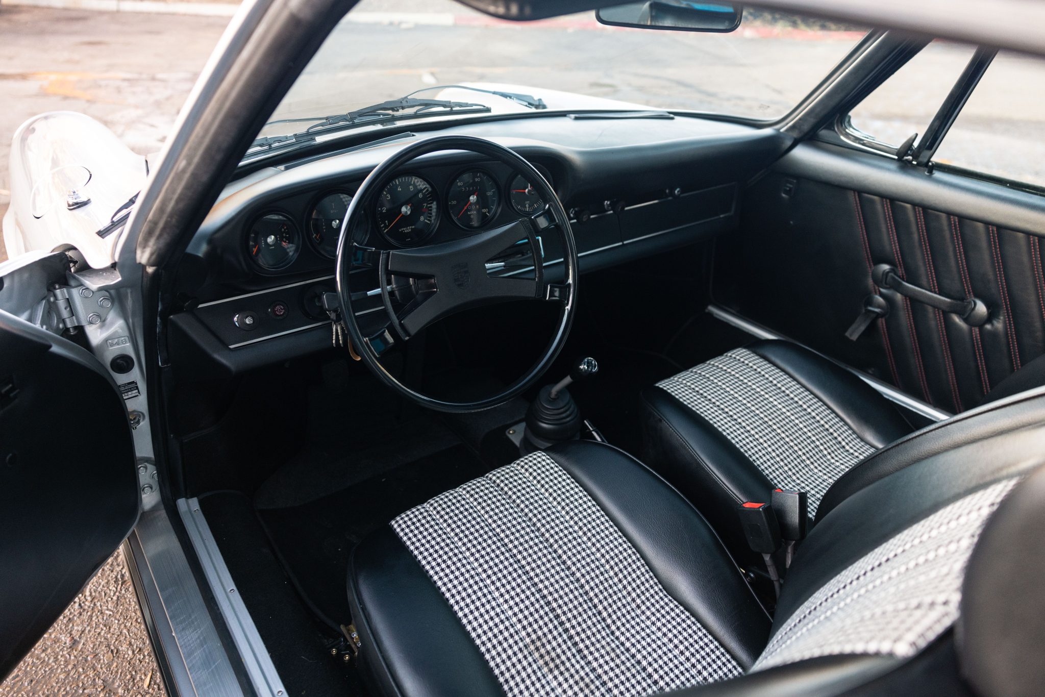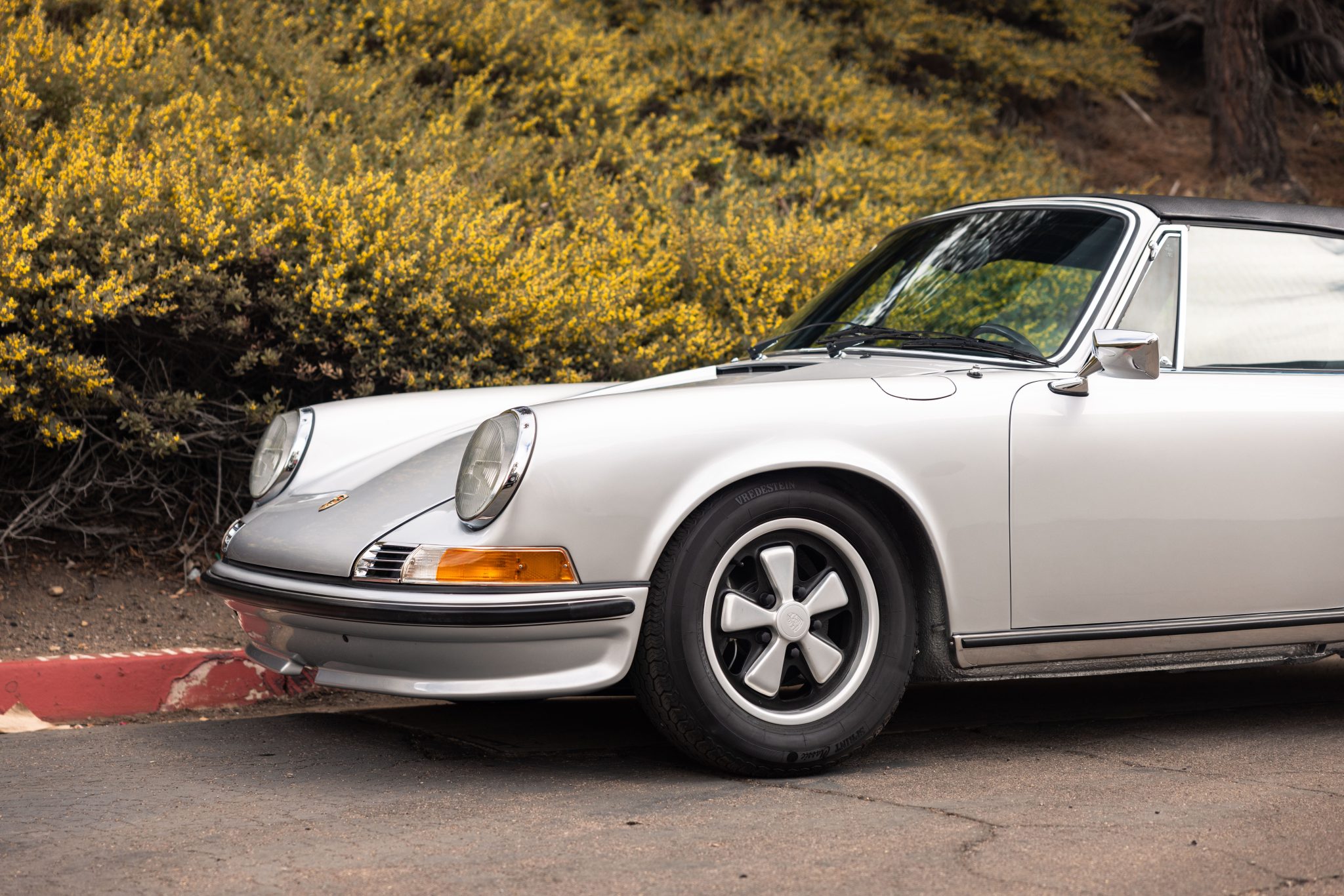 This 1972 Porsche 911S Targa was refurbished and modified in 2024, including a repaint and the installation of a twin-plug 3.2L flat-six and a 915 five-speed manual transaxle. The car is finished in silver metallic over black leatherette and houndstooth cloth, and equipment includes SSI heat exchangers, a removable roof panel, a stainless-steel Targa bar, H4 headlights, Euro-spec bumpers, a front spoiler, and 15″ Fuchs alloy wheels.