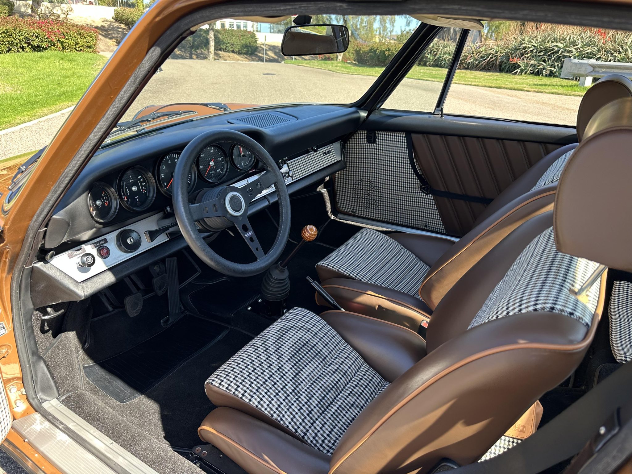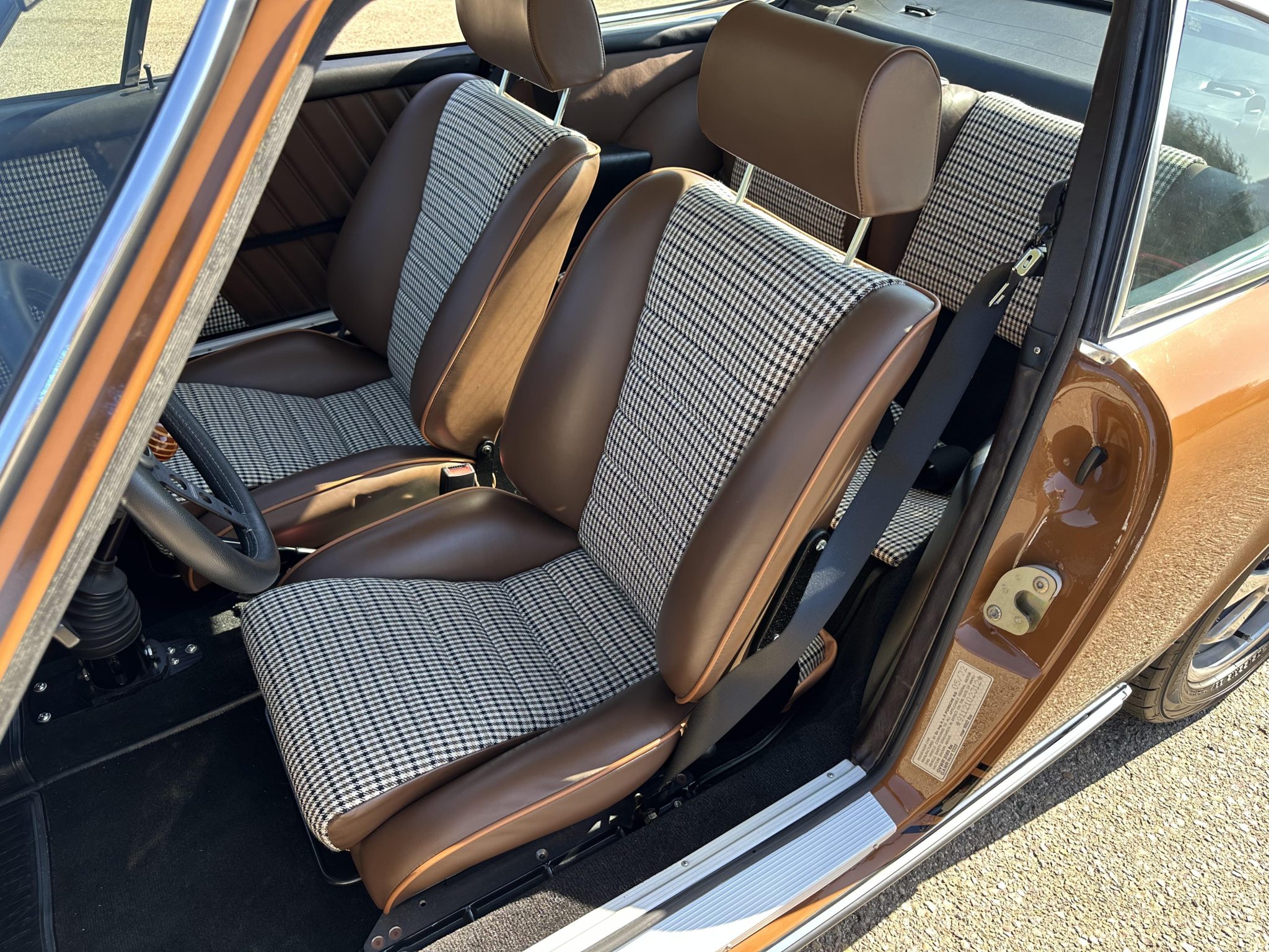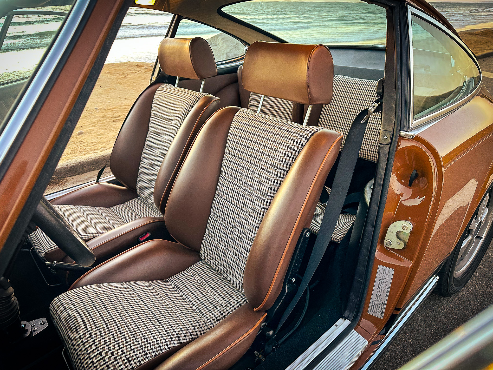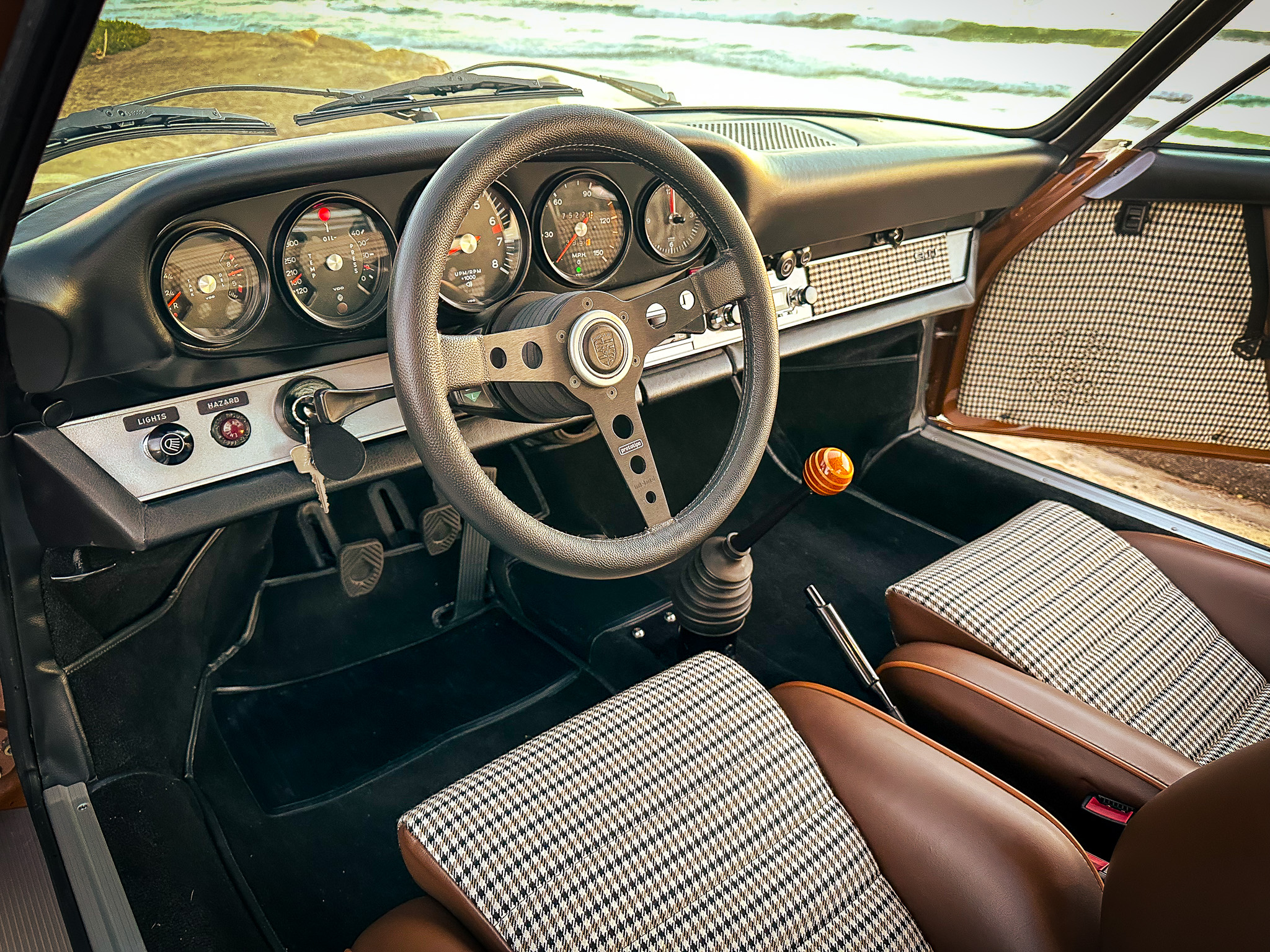 This 1972 Porsche 911T coupe was rebuilding the flat-six to displace 3.1 liters, replacing the 915 five-speed manual transaxle, installing a Wavetrac limited-slip differential, and replacing the SSI heat exchangers. Prior to the owner’s acquisition, PMO carburetors and Electromotive DFI ignition were installed, the exterior was refinished, and the interior was refreshed with brown leather upholstery with houndstooth inserts. Additional equipment includes 15″ Fuchs wheels, 911S-type front brake calipers, revised suspension, LED H4 headlights, a MOMO Prototipo steering wheel, and a Bluetooth stereo.