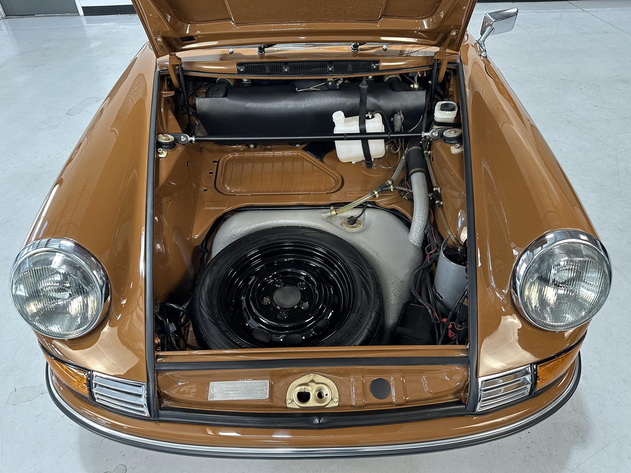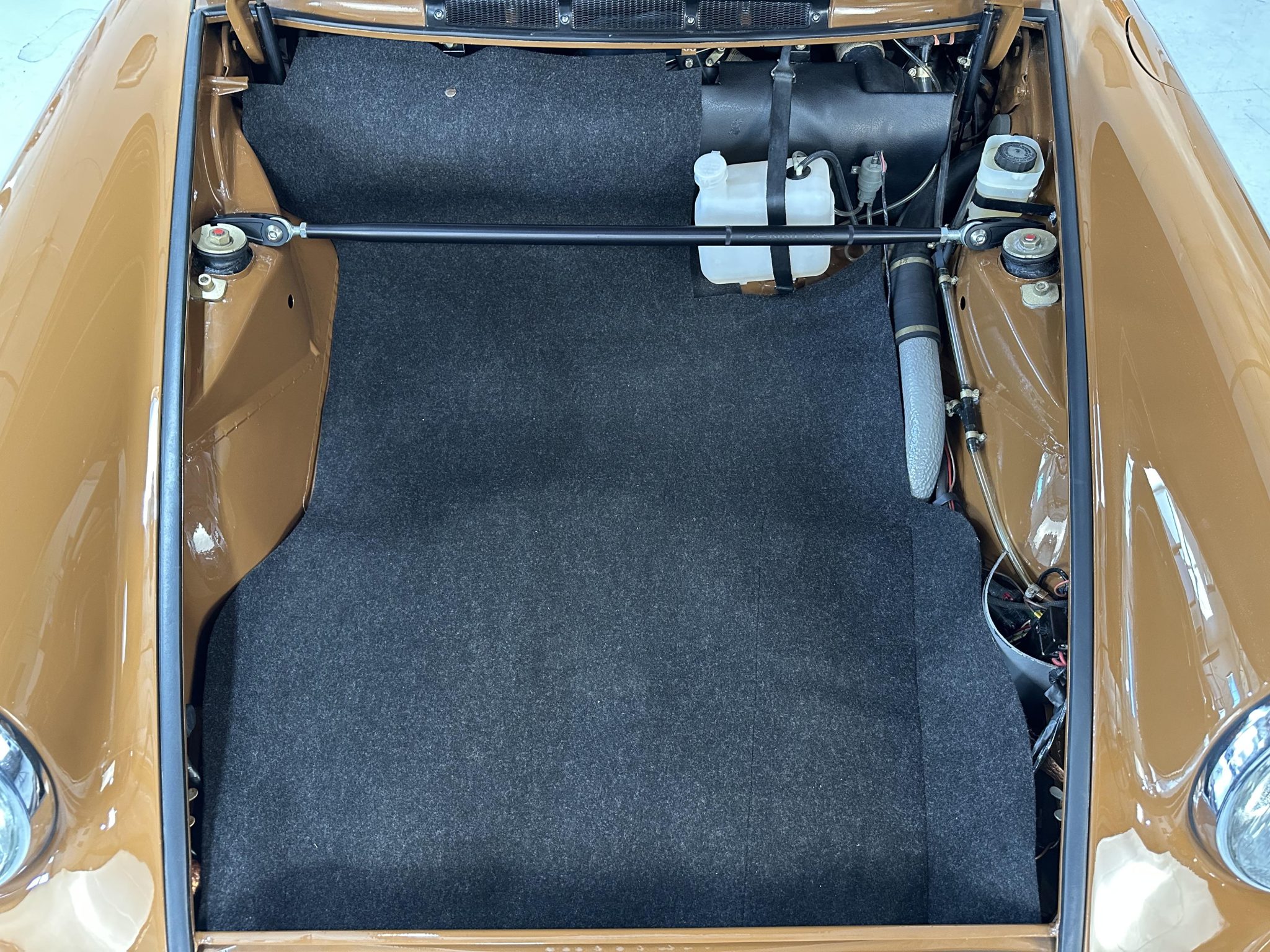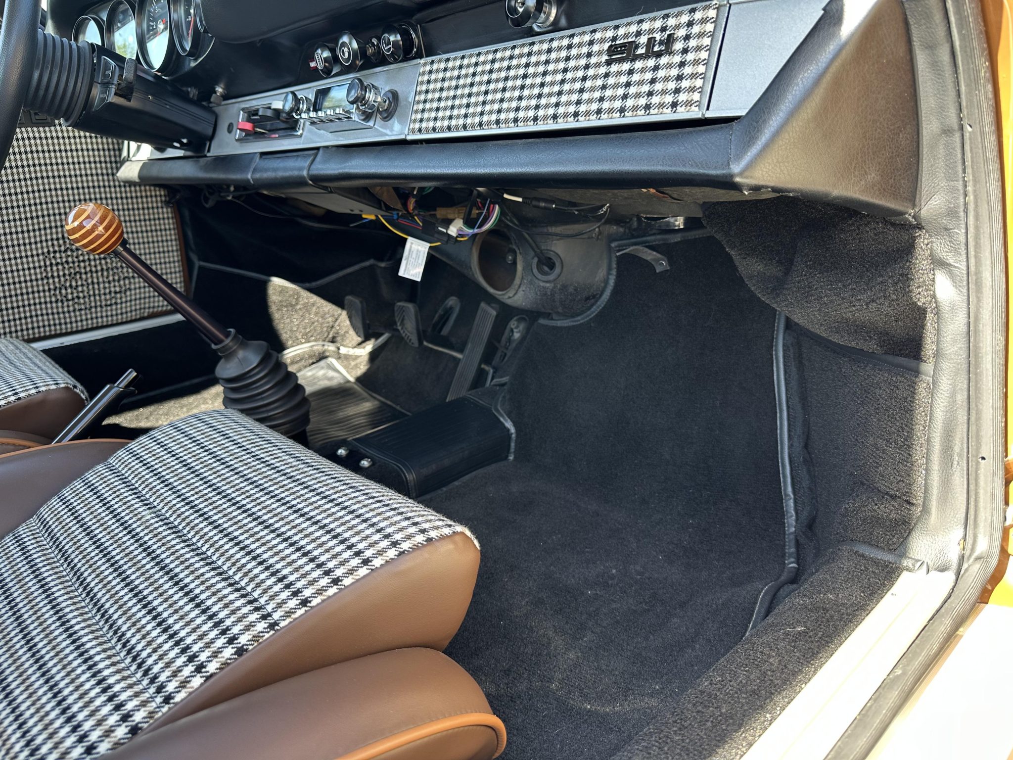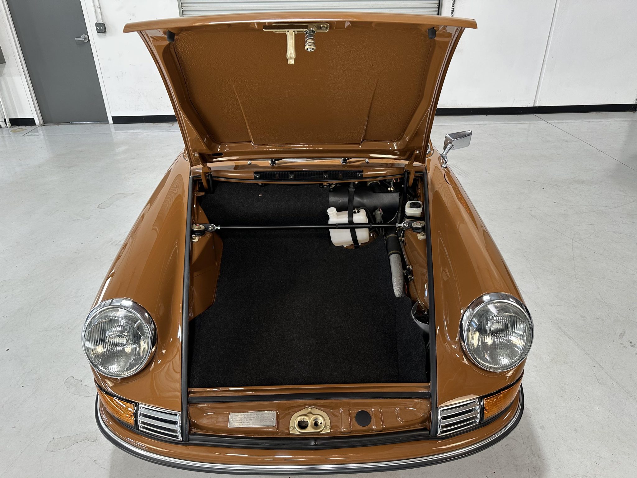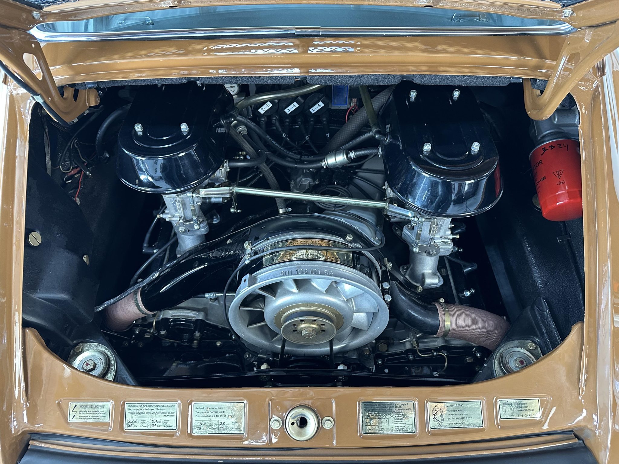 This 1972 Porsche 911T coupe was rebuilding the flat-six to displace 3.1 liters, replacing the 915 five-speed manual transaxle, installing a Wavetrac limited-slip differential, and replacing the SSI heat exchangers. Prior to the owner’s acquisition, PMO carburetors and Electromotive DFI ignition were installed, the exterior was refinished, and the interior was refreshed with brown leather upholstery with houndstooth inserts. Additional equipment includes 15″ Fuchs wheels, 911S-type front brake calipers, revised suspension, LED H4 headlights, a MOMO Prototipo steering wheel, and a Bluetooth stereo.