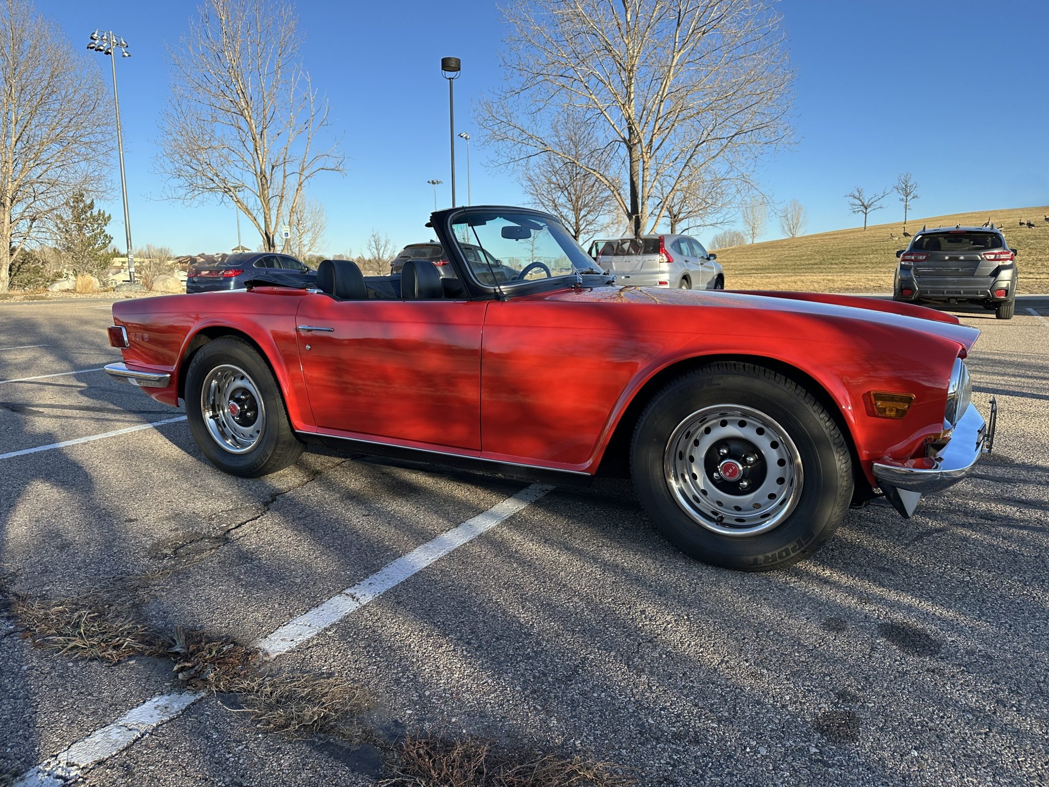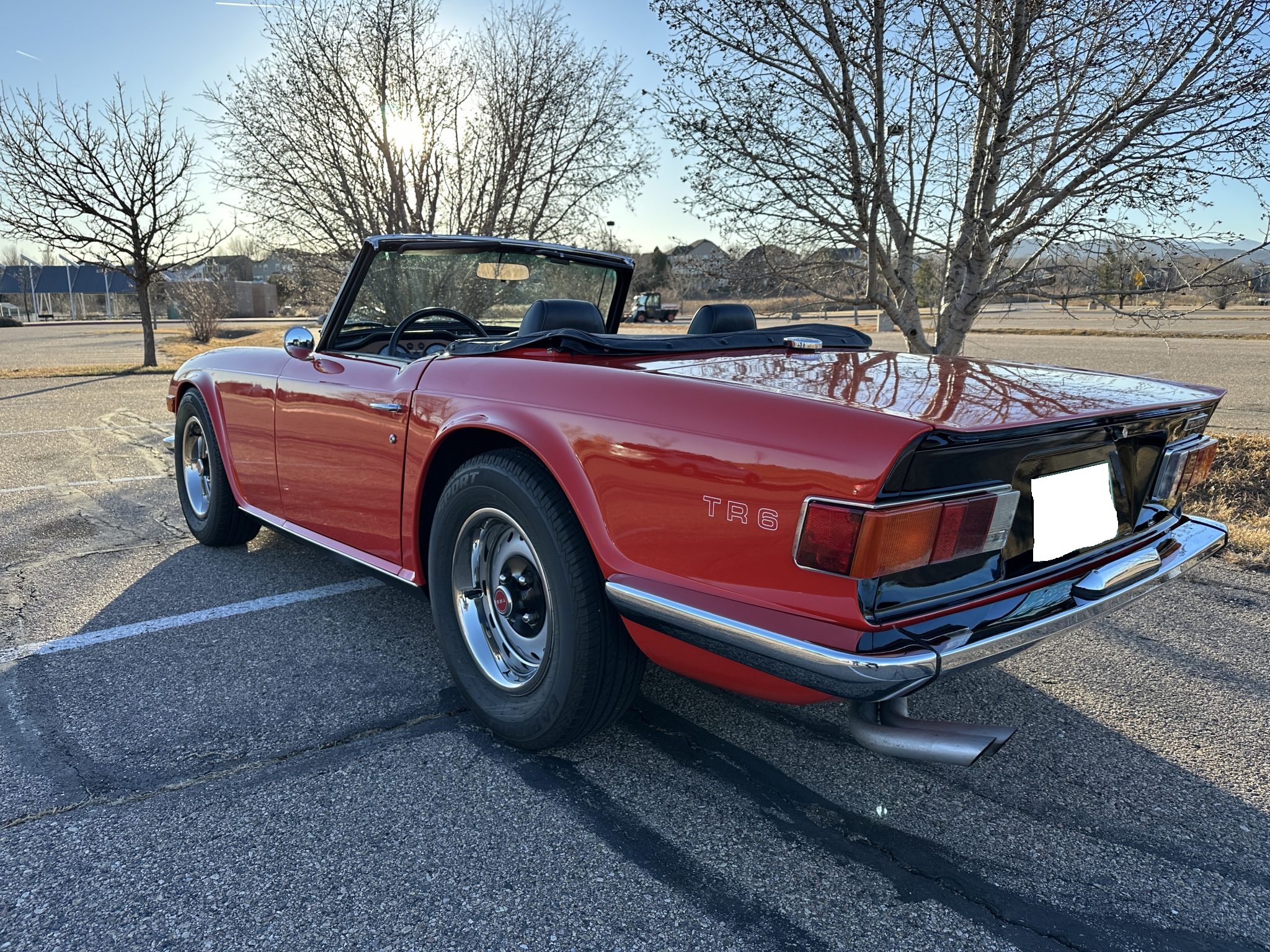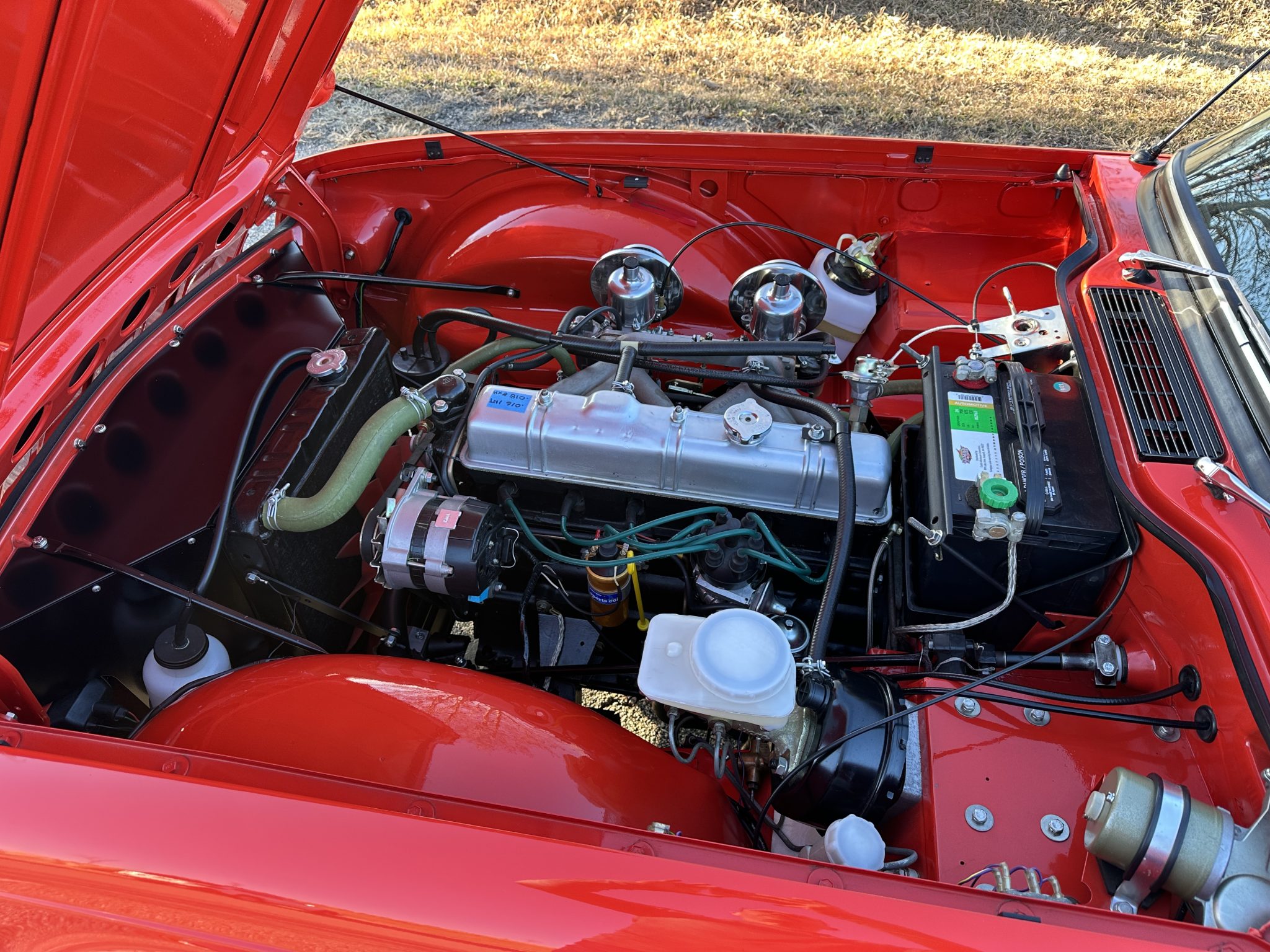 Finished in Pimento Red over black vinyl, the car is powered by a 2.5-liter inline-six paired with a four-speed manual transmission. Equipment includes a mild camshaft, Petronix electronic ignition, a spin-on oil filter conversion, K&N air cleaners, dual SU carburetors, a stainless-steel exhaust system, adjustable rear trailing arm brackets, a rear tube shock conversion, front disc brakes, 15″ steel wheels, a front chin spoiler, a black soft top, chrome bumpers, a cabin heater, and crank windows. The tires were replaced in preparation for the sale.